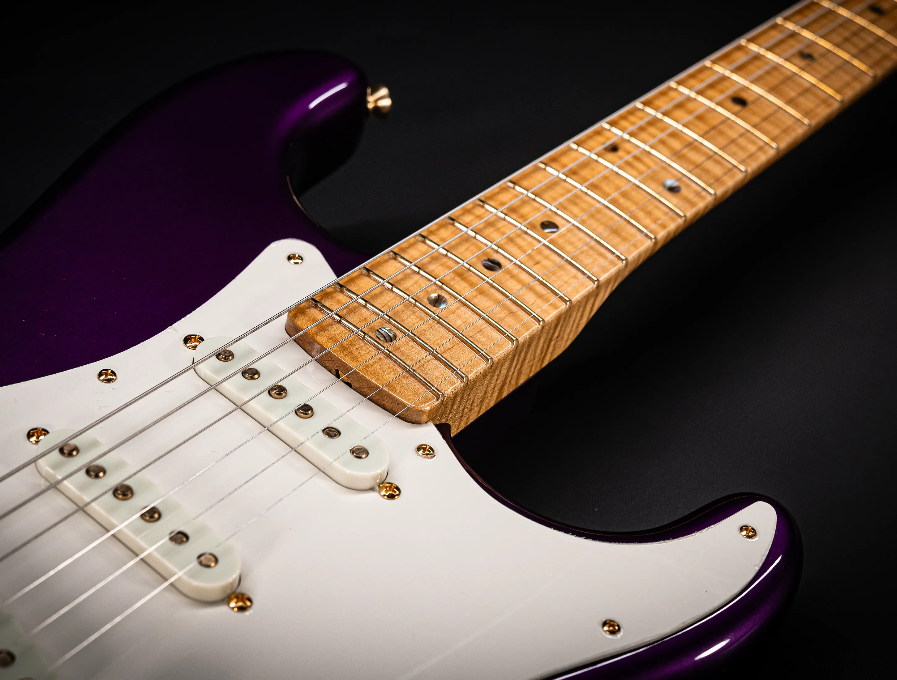 Der einteilige 4A-Flammenahornhals hat ein großes, komfortables 60s „C“-Profil, gekrönt von einem Griffbrett mit 9,5 Zoll Radius mit 21 Narrow Tall 6105 Bünden, Abalone-Punktmarkierungen und einem Knochensattel. Die pure klangliche Strat-Magie kommt von drei handgewickelten Fat ’50s Stratocaster®-Tonabnehmern aus dem Custom Shop mit goldenen Magneten, die knackige Höhen und ausgewogene Mitten und Tiefen liefern. Die Vintage Modified #2-Verkabelung umfasst einen Fünfwege-Tonabnehmerschalter und die Tone-Saver-Schaltung, die Klangverluste beim Herunterregeln der Lautstärke verhindert.