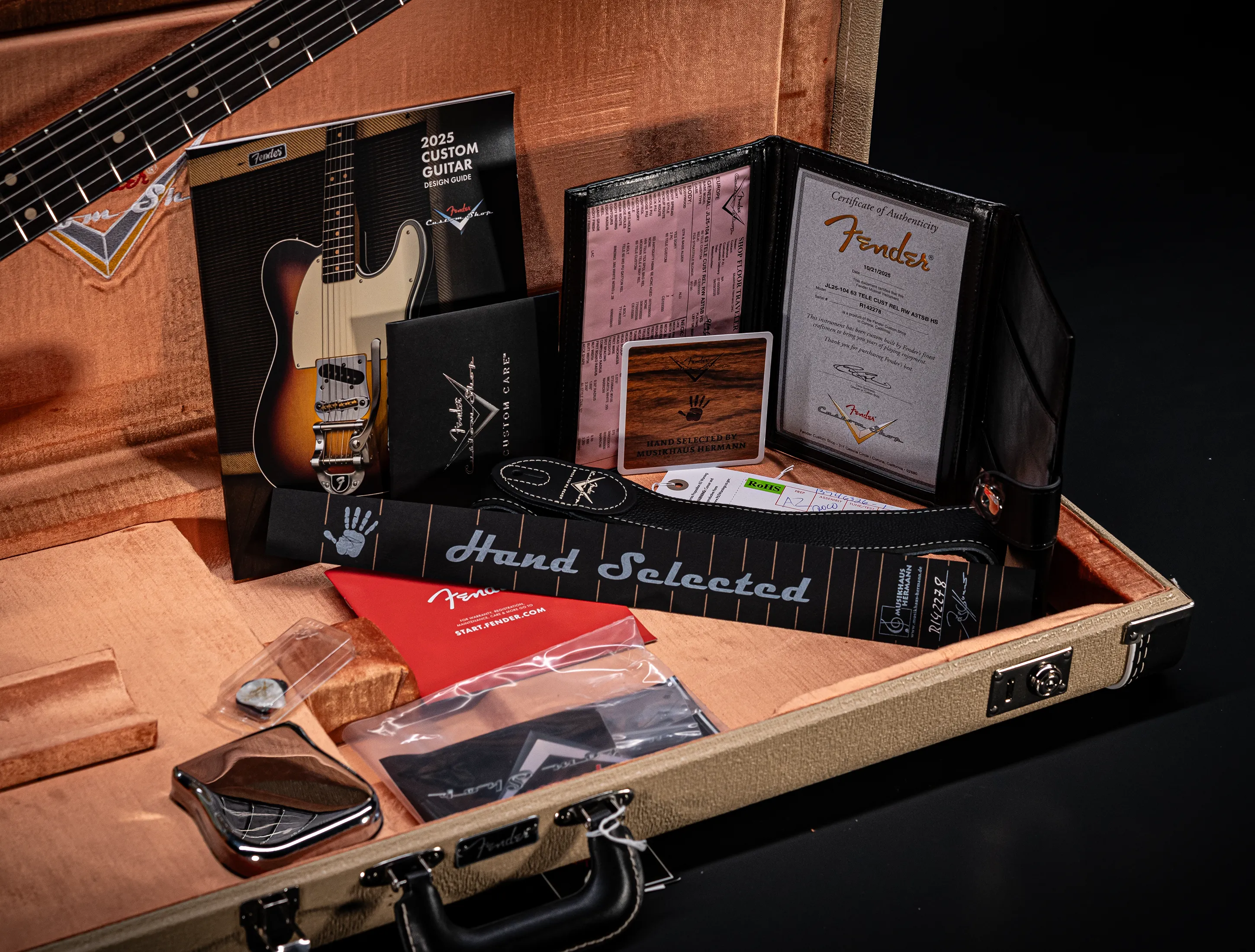 - Zubehör-Kit (Custom-Shop Gitarrengurt, Brückenabdeckung "Ashtray", Pflegehinweise & Plectren)