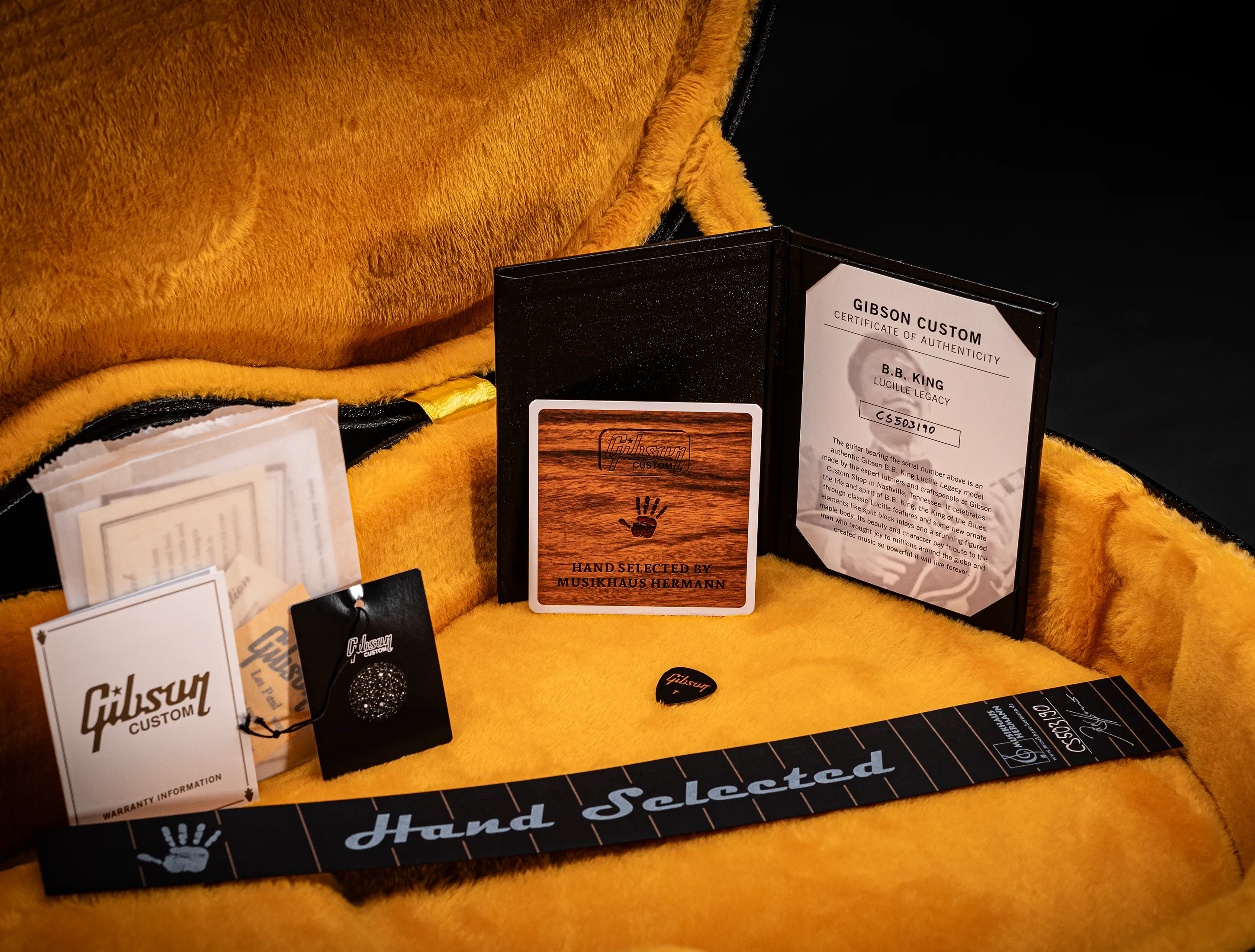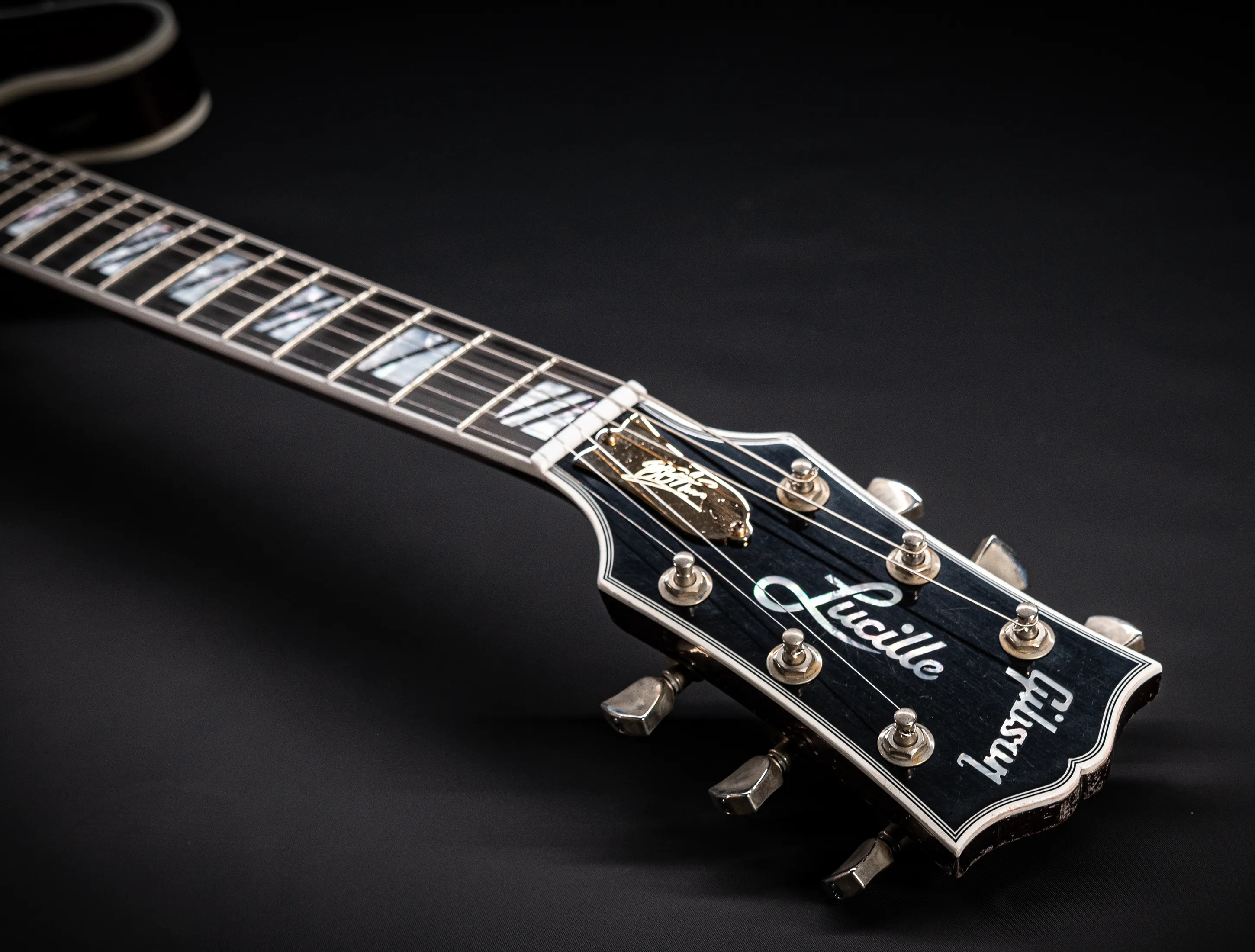 Die legendäre Gibson B.B. King Lucille Legacy kehrt als Factory Special in die Custom Shop zurück. Die "Lucille" ist mit sämtlichen High-End-Features, die für einen "König würdig" sind ausgestattet. Zu den Highlights gehört eine goldene BB.King Halsstababdeckung und ein TP-6-Saitenhalter mit Feinstimmern. Die "Lucille"-Perlmutteinlage ziert die Kopfplatte, und das Griffbrett aus Ebenholz ist mit geteilten Perlmuttblockeinlagen versehen.