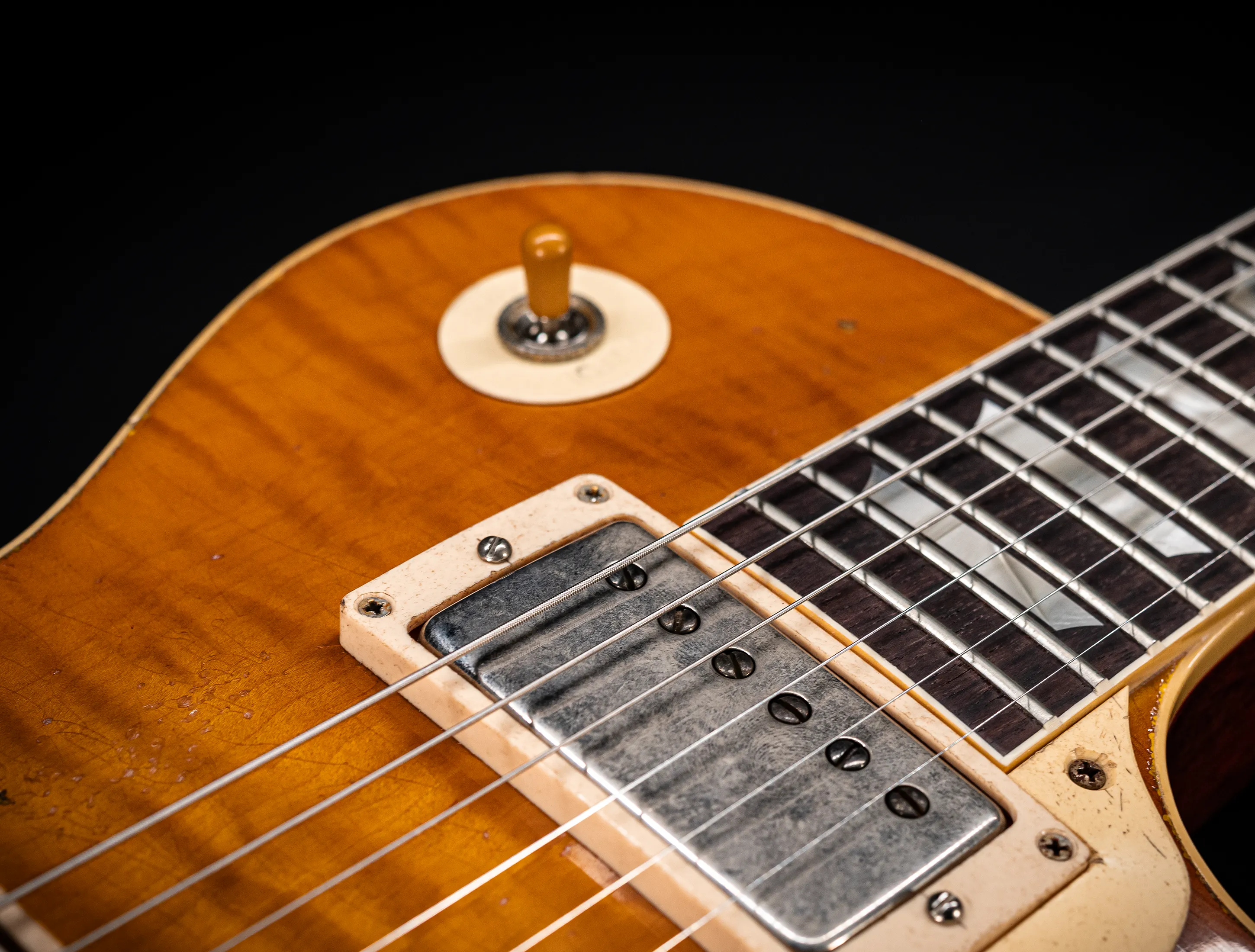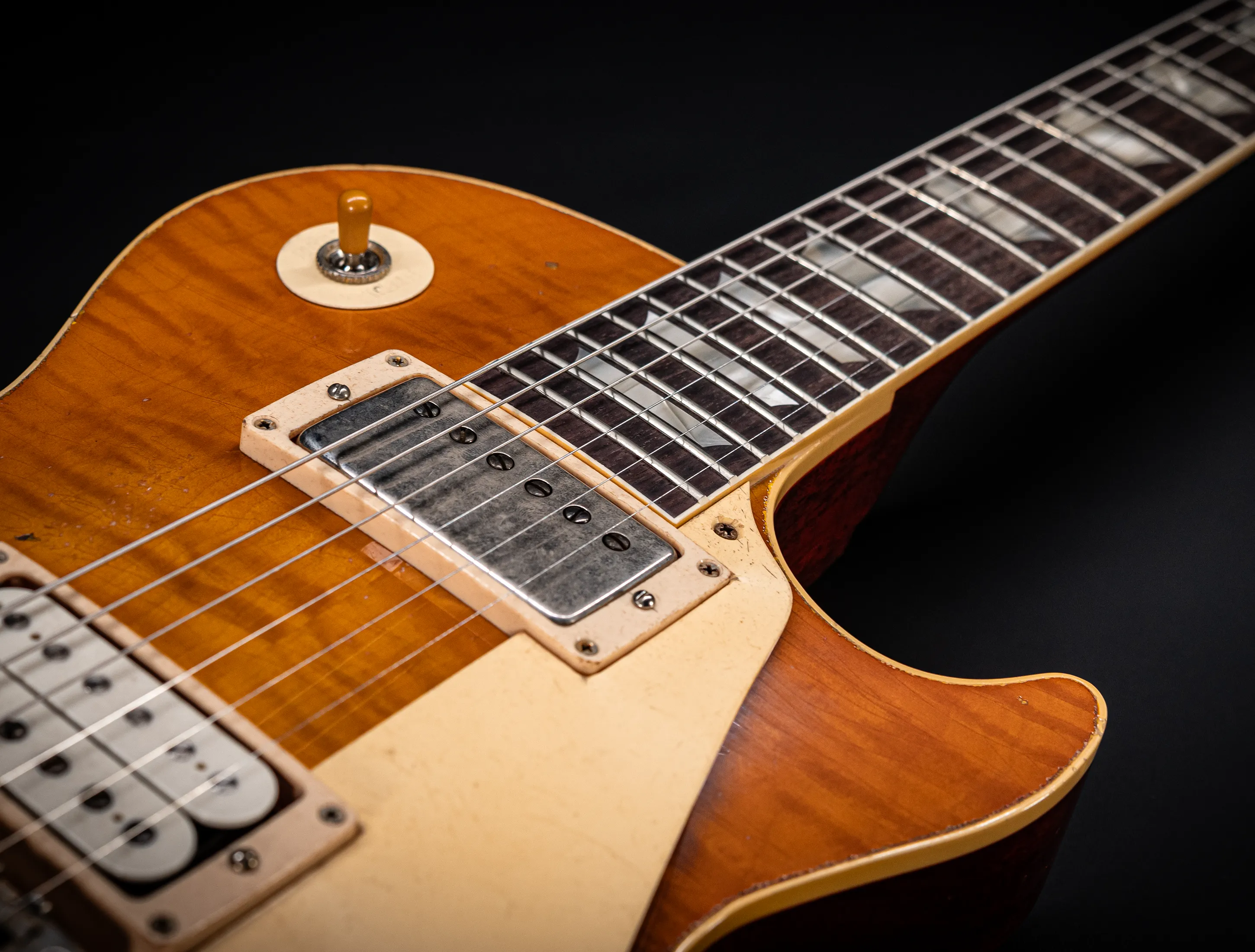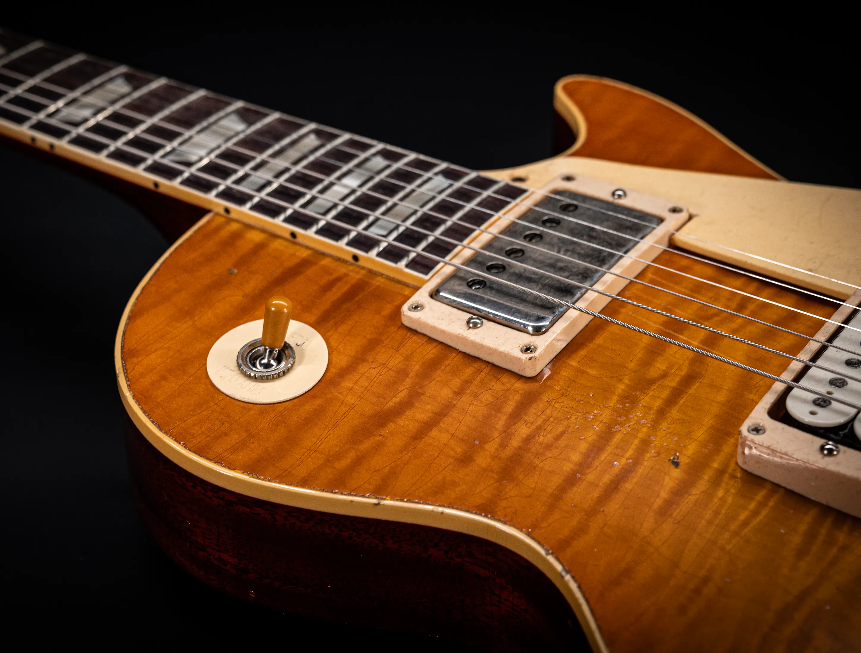 Die Sonderfarbe "RUSTY LEMON DROP with red shadow, die dazu passende, handselektierte R9 Premium Flame Decke sowie die passende Murphy LAB Heavy Aged Behandlung lassen diese Les Paul zu einem ganz besonderen Highlight werden. Auch die besonderen Tonabnehmer dürfen nicht fehlen, darum wurden für diese Gitarre die original Custom Shop - CustomBucker Aged AL3 15.5" unpotted Alnico 3 verbaut bei denen der Bridge PickUp in Double aged White ab Werk montiert ist!!!