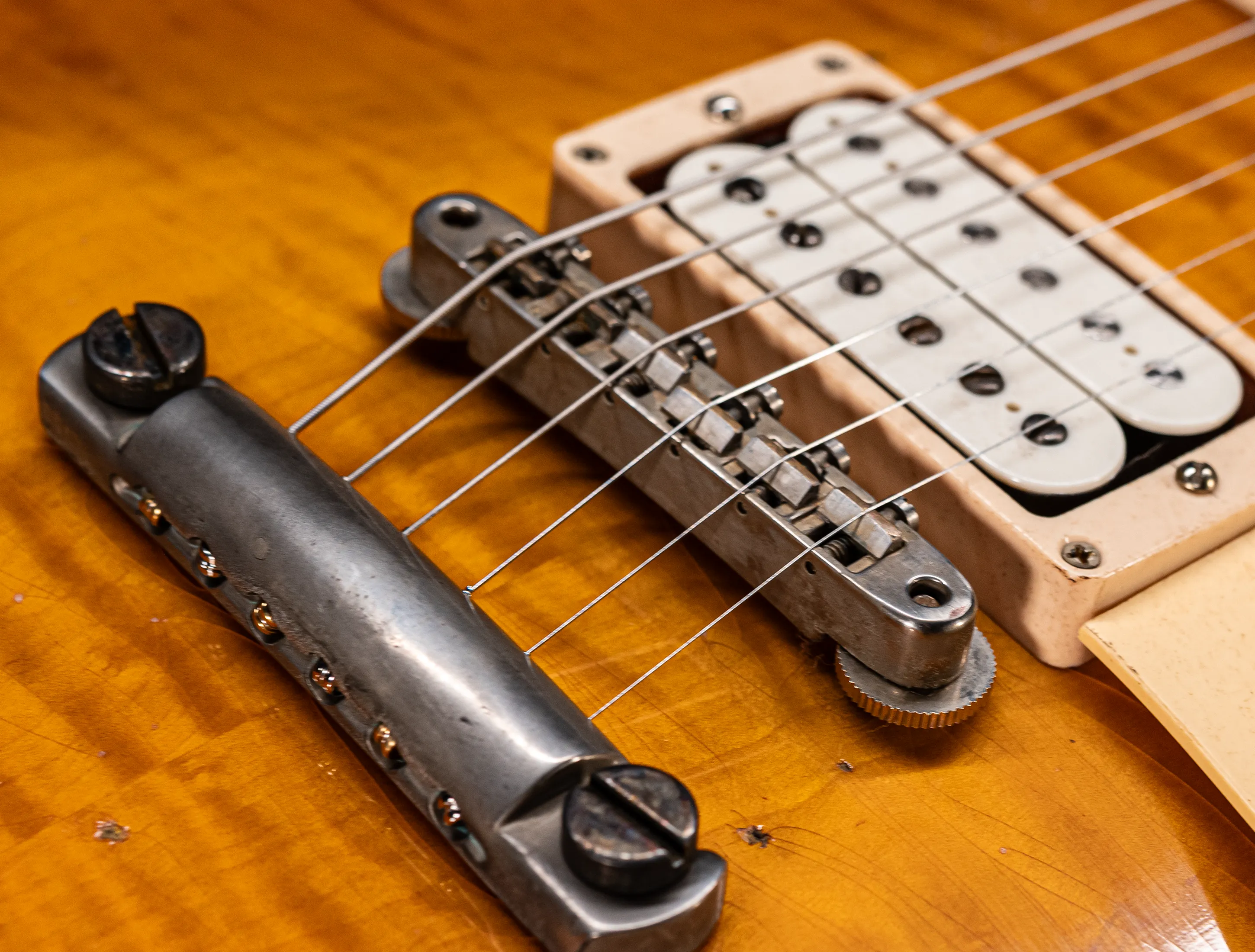 Bereits ohne Verstärker angespielt spürt man sofort den trockenen, holzigen Charakter einer sehr guten, lange gespielten Vintage-Gitarre. Schnelle Ansprache, großartige Resonanz, fantastisches Sustain - knurrige Bässe, drahtige Mitten, strahlende Höhen. Am Verstärker zeigt sich das wahre Potenzial der Gitarre – die Pickups sind alten PAFs nachempfunden und bilden die Komplexität der Originale perfekt ab! Der Halspickup, ist bei cleanen Ampeinstellungen warm, transparent, dreidimensional und in den Bässen nie undifferenziert oder matschig. Mit höheren Gain-Einstellungen am Amp lassen sich alle klassischen Sounds von Jeff Beck, Jimmy Page, Paul Bloomfield über Billy Gibbons bis zu Gary Moore und Eric Clapton abdecken. Der Stegpickup bietet clean den "Tele on stereoids" Sound alter Bursts – Fette, knallige Bässe und bissige, aber nie schrille Höhen. Die Mitten sind je nach Anschlagintensität und Gaineinstellung am Verstärker von zurückhaltend bis plakativ darstellbar! Herauszuheben ist auch die perfekte Balance beider Pickups zueinander, und die Mittelstellung mit beiden Pickups aktiviert bietet je nach Volume- und Toneeinstellungen eine unglaubliche Palette an Soundfarben, ein Instrument mit Charakter und Vokalität! Wow!