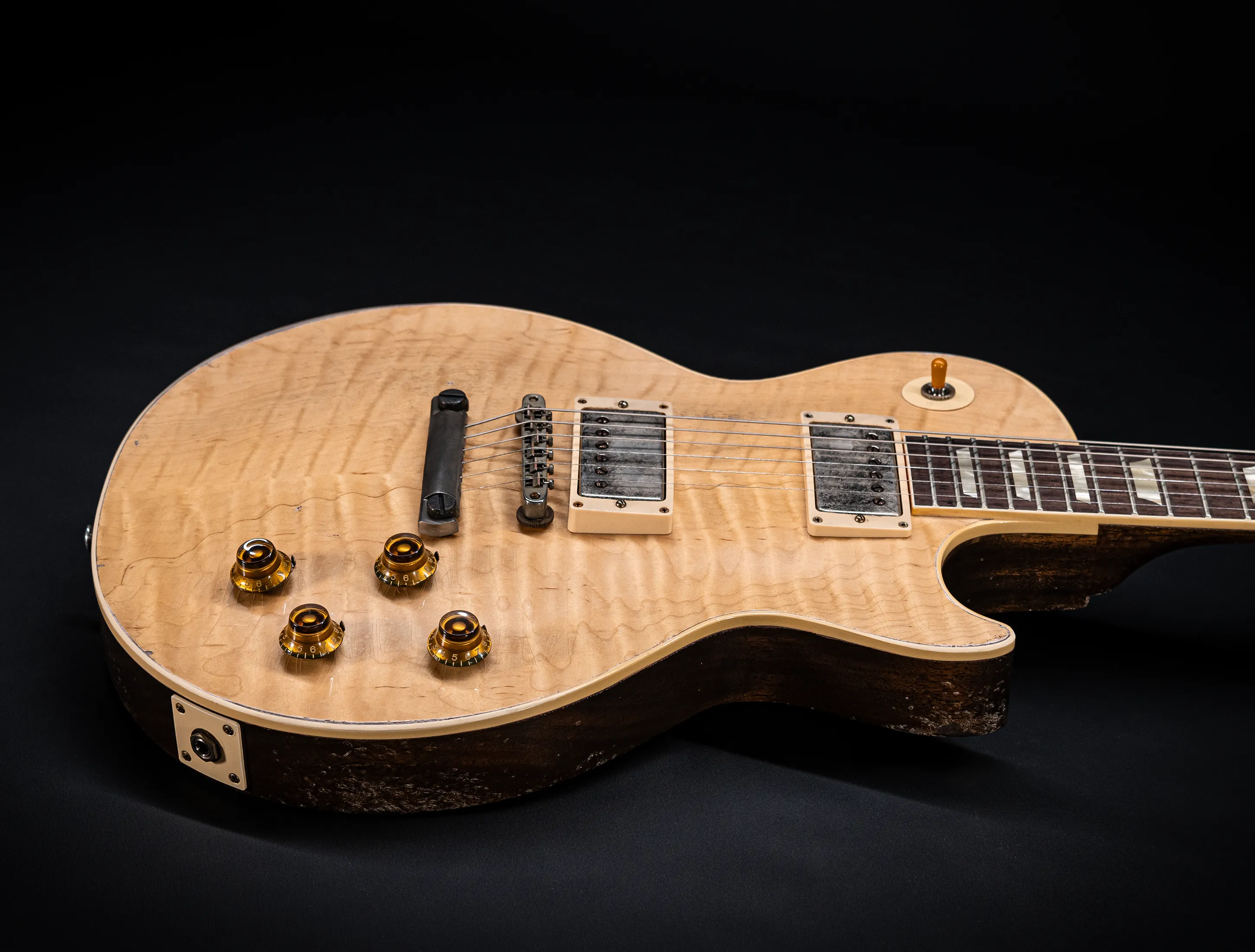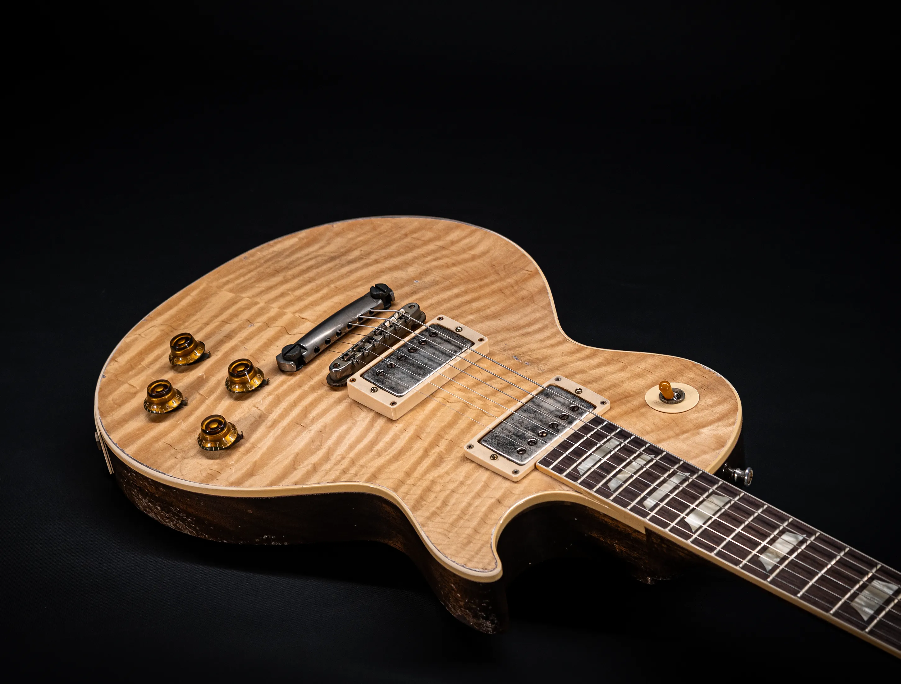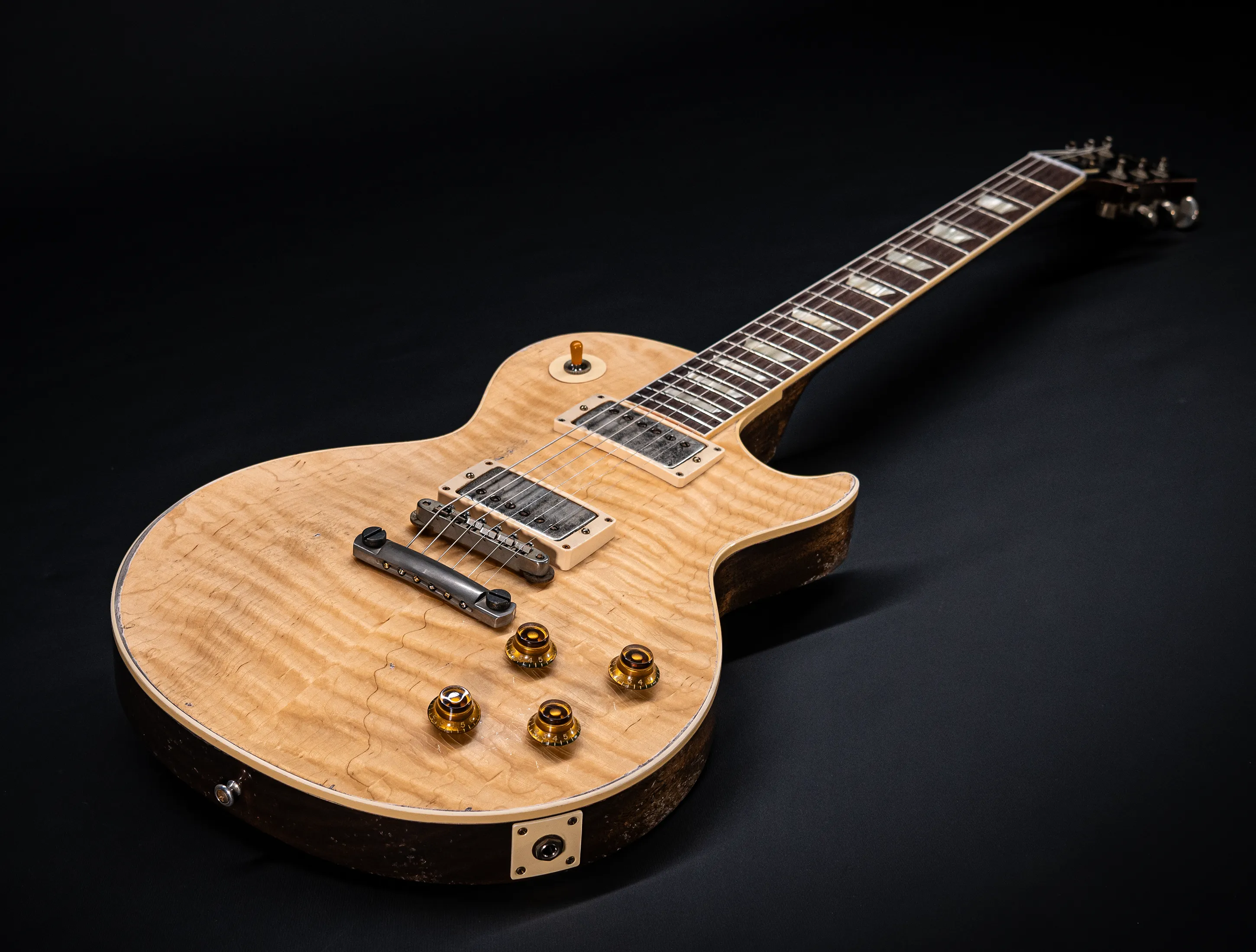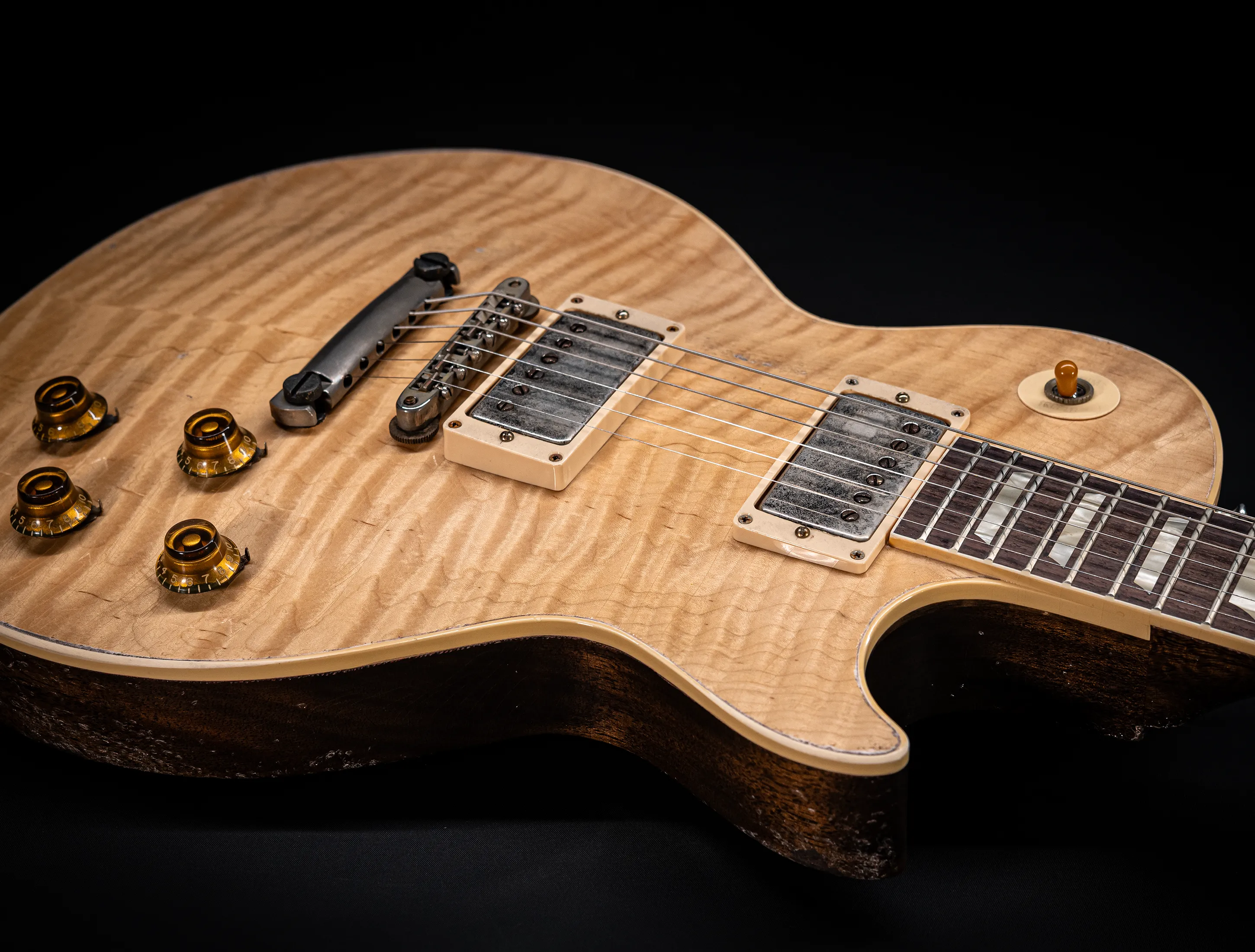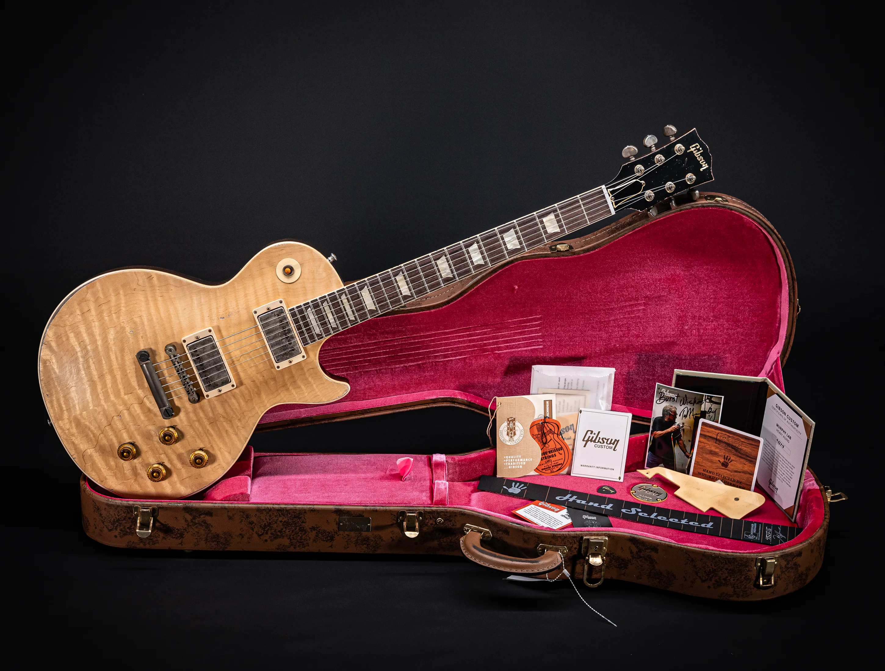 Die Sonderfarbe "Antique Enhance Natural Stripped", die dazu passende, von Jörg Hermann und Tom Murphy handselektierte 59er Flame-Maple Decke sowie die passende Murphy LAB Authentic Heavy Aged Behandlung lassen diese Les Paul zu einem einzigartigen Highlight werden. Und natürlich dürfen hier die passenden Tonabnehmer nicht fehlen, darum wurden für diese Gitarre selbstverständlich die Collectors Edition Cover, CustomBucker Aged AL3 15.5" UNPOTTED Murphy Spec underwound Neck verbaut - was für eine Ansage !!!