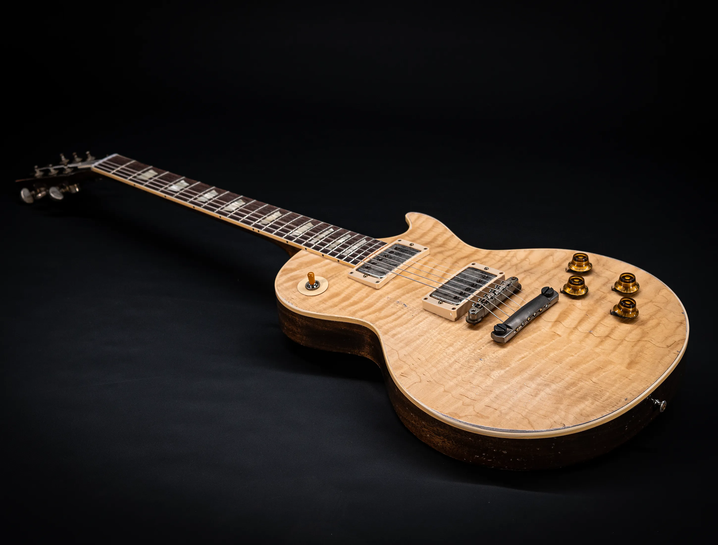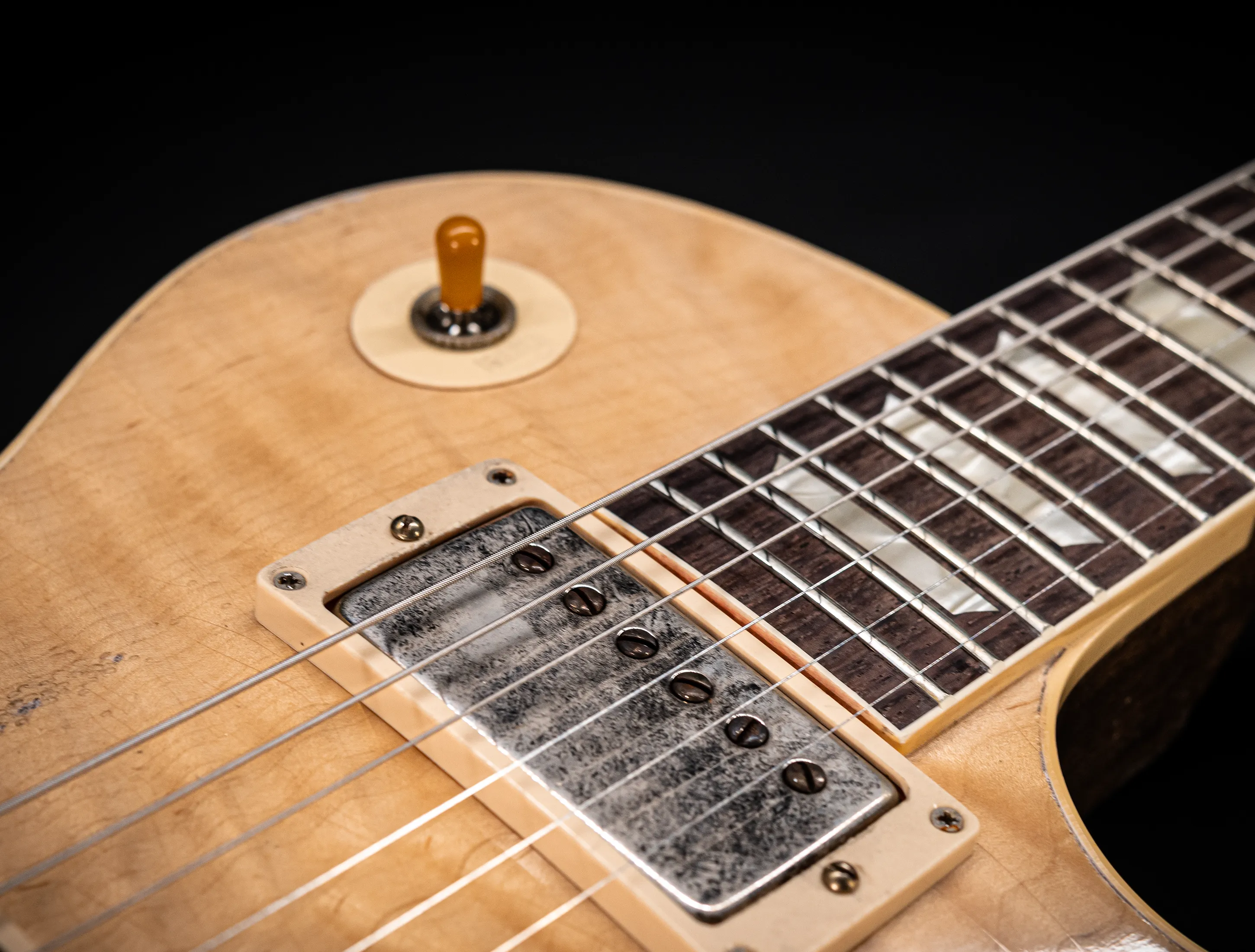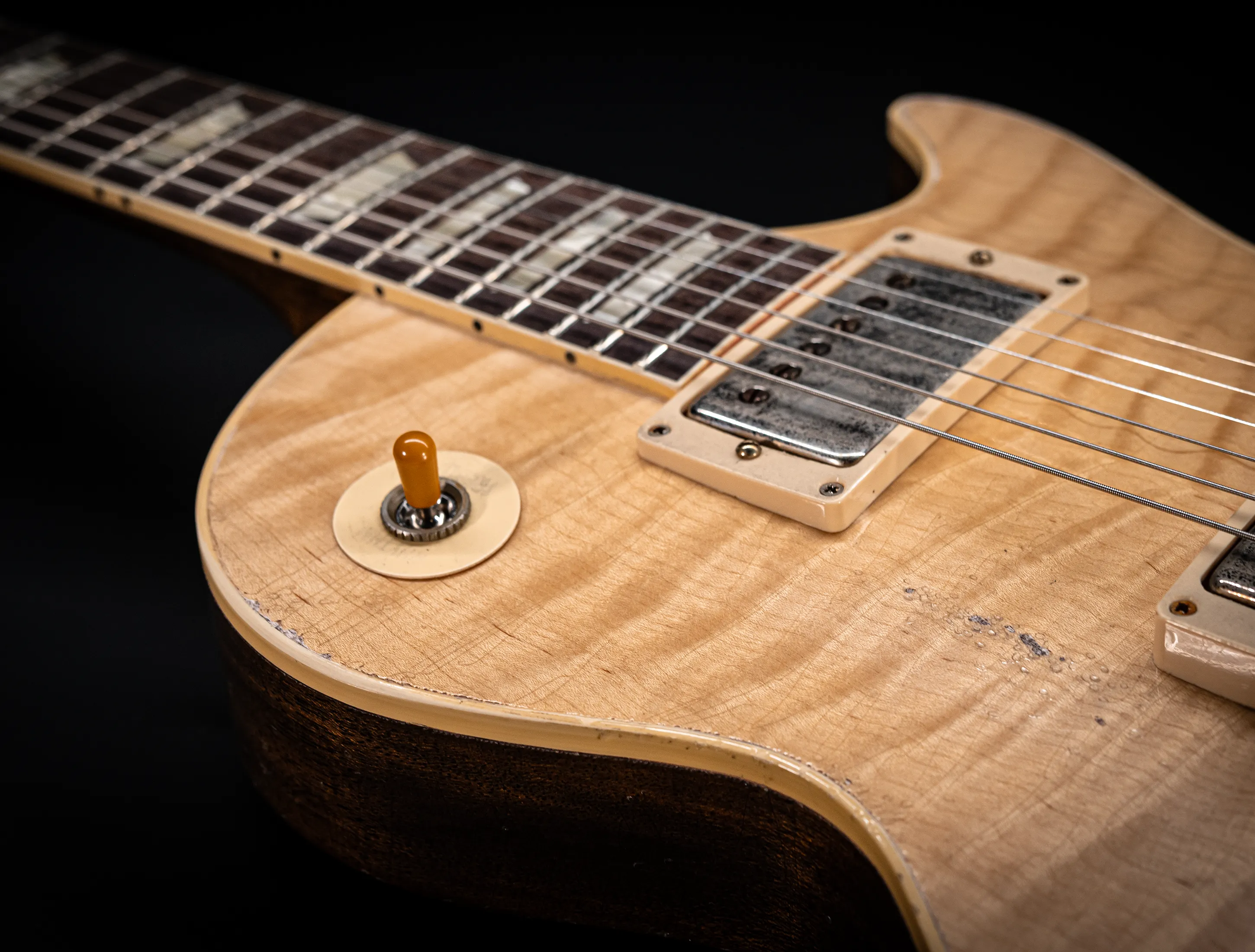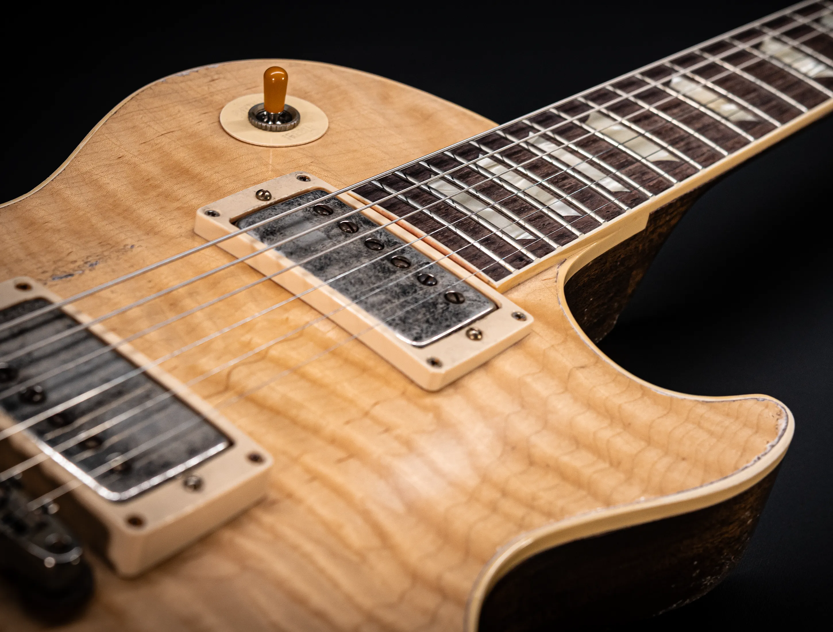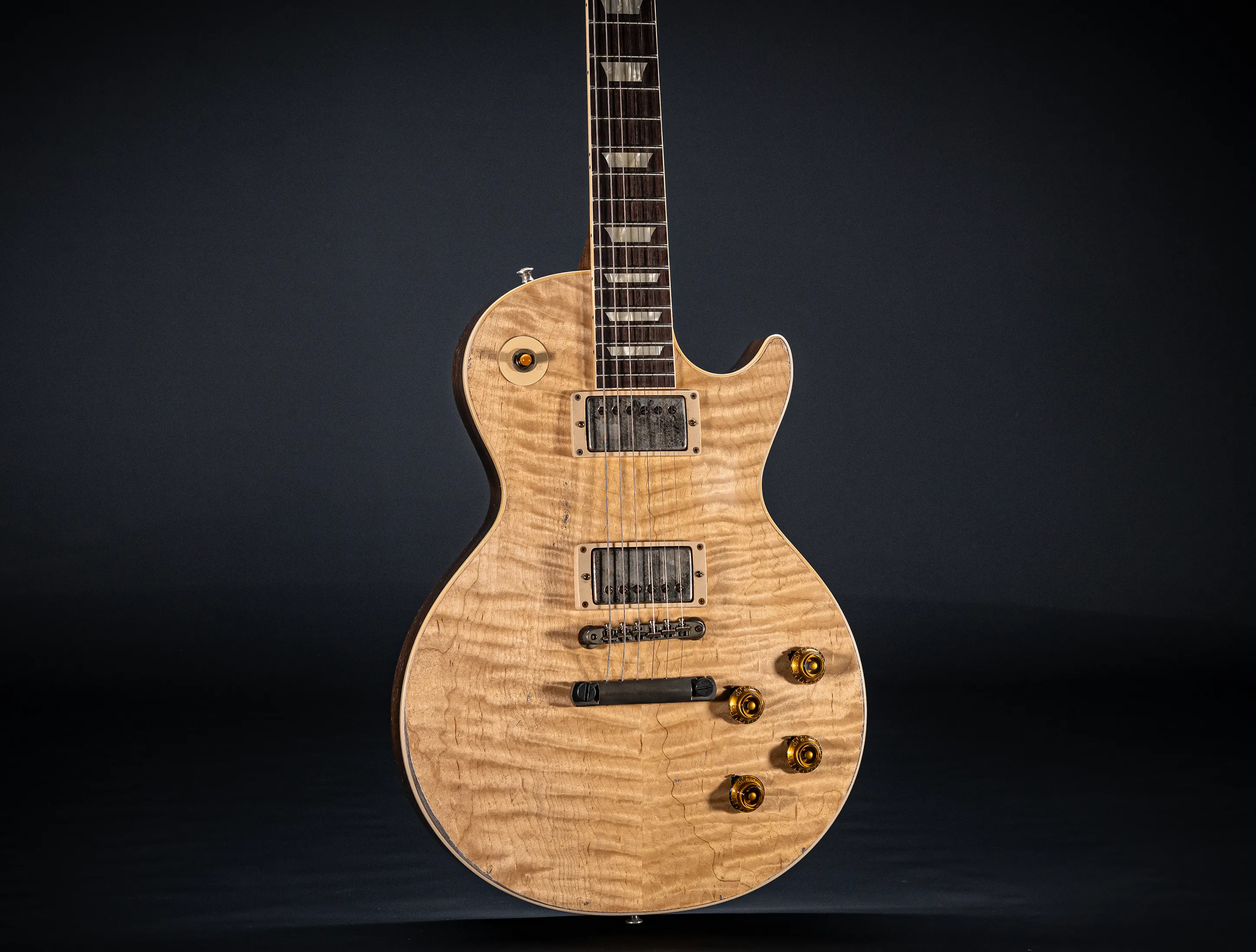 Die Sonderfarbe "Antique Enhance Natural Stripped", die dazu passende, von Jörg Hermann und Tom Murphy handselektierte 59er Flame-Maple Decke sowie die passende Murphy LAB Authentic Heavy Aged Behandlung lassen diese Les Paul zu einem einzigartigen Highlight werden. Und natürlich dürfen hier die passenden Tonabnehmer nicht fehlen, darum wurden für diese Gitarre selbstverständlich die Collectors Edition Cover, CustomBucker Aged AL3 15.5" UNPOTTED Murphy Spec underwound Neck verbaut - was für eine Ansage !!!