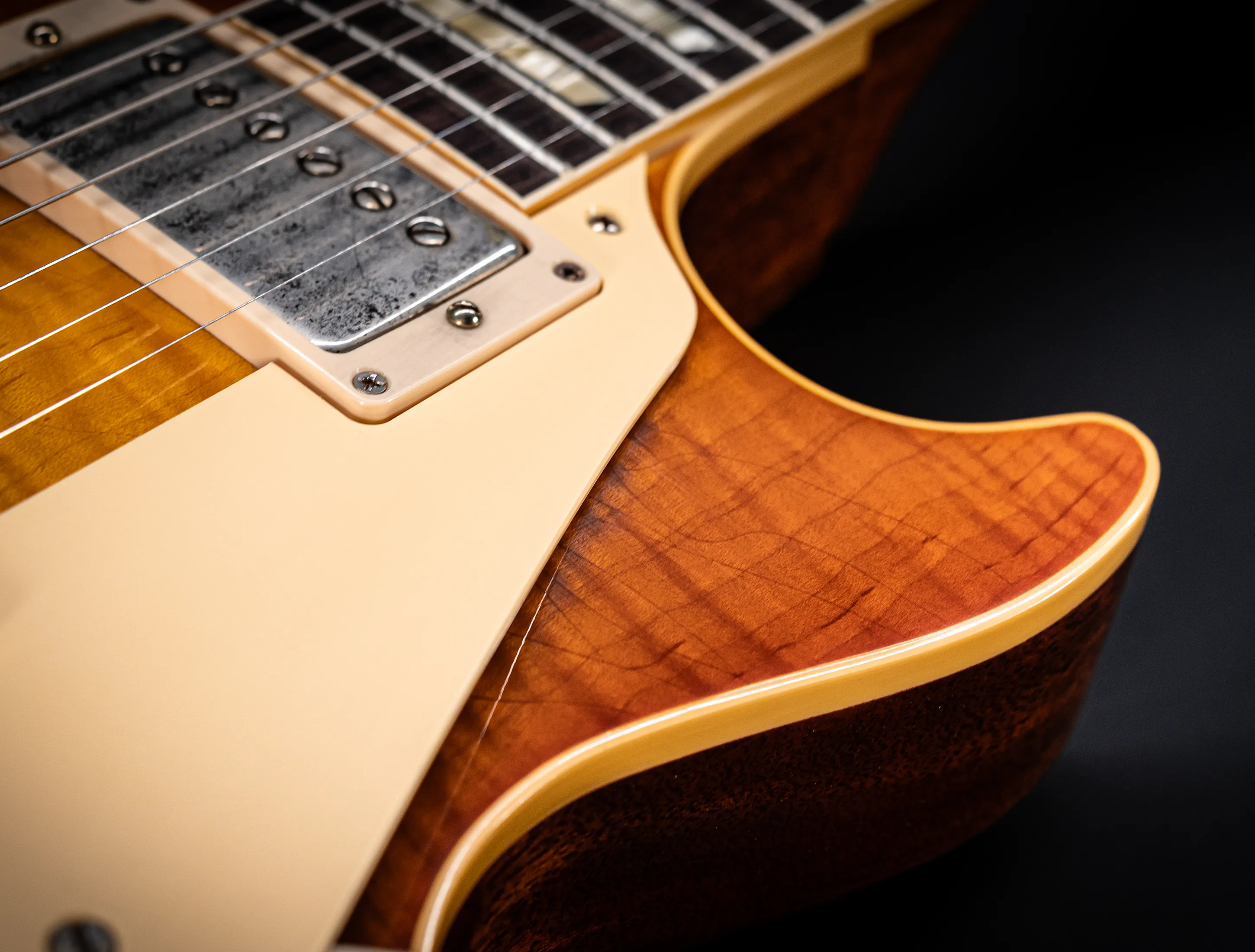 - Decke: handselektierter, geflammte 2tlg. Ahorn im 1960er Style (personal Selektion im USA Werk auf Gewicht und Schwingung)