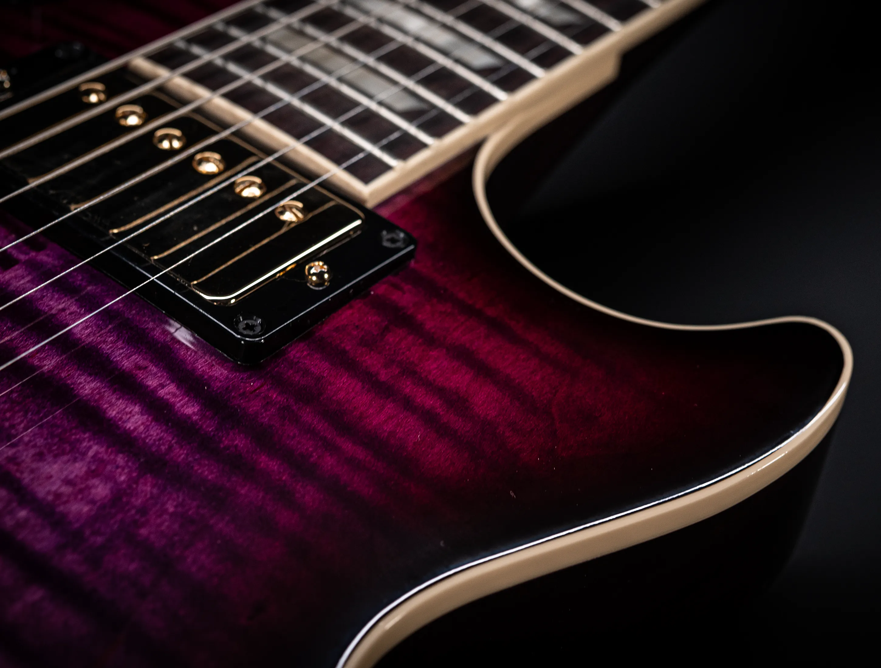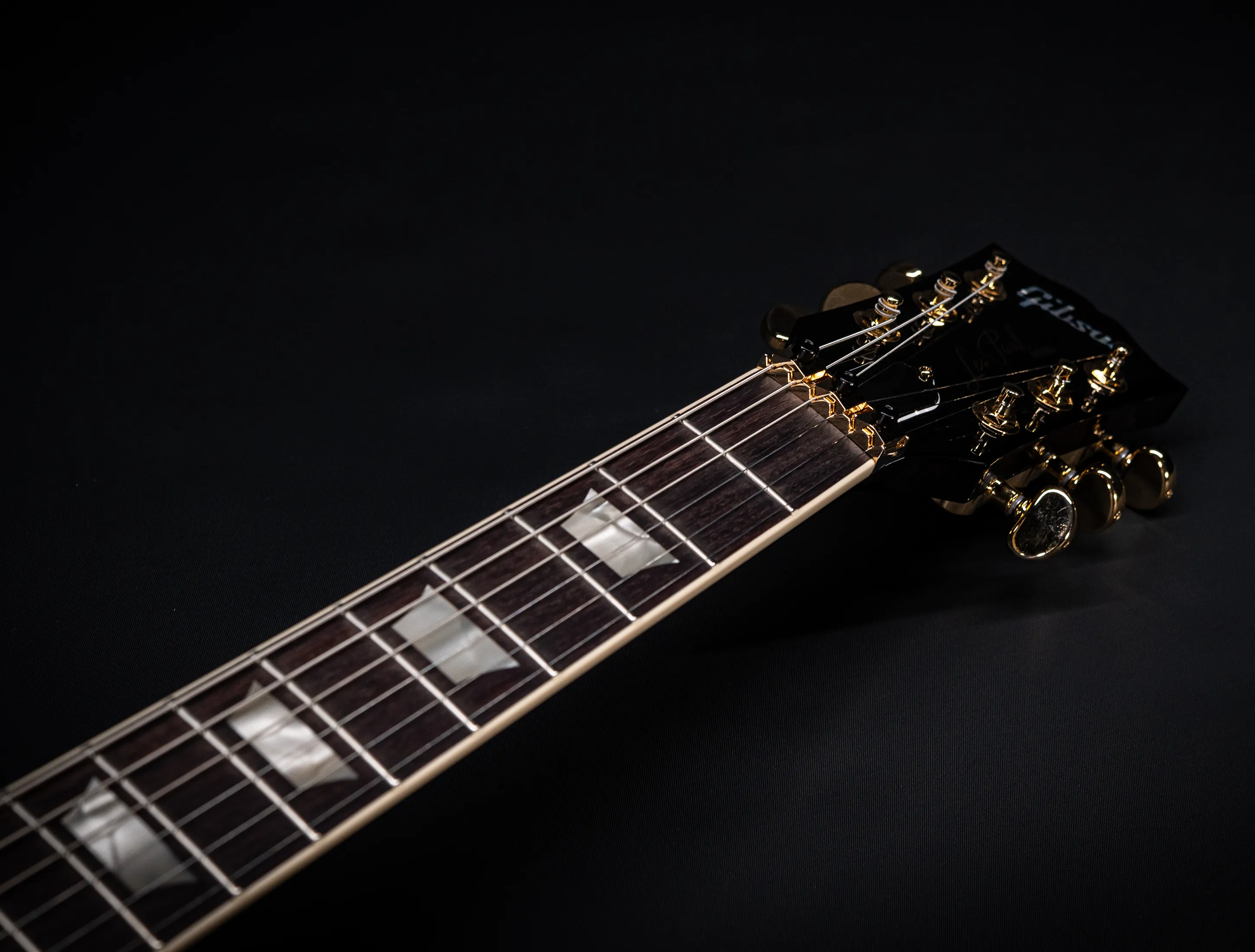 - Griffbrettmaterial: einteiliger, dunkler indischer Palisander (extra dunkel selektiert)