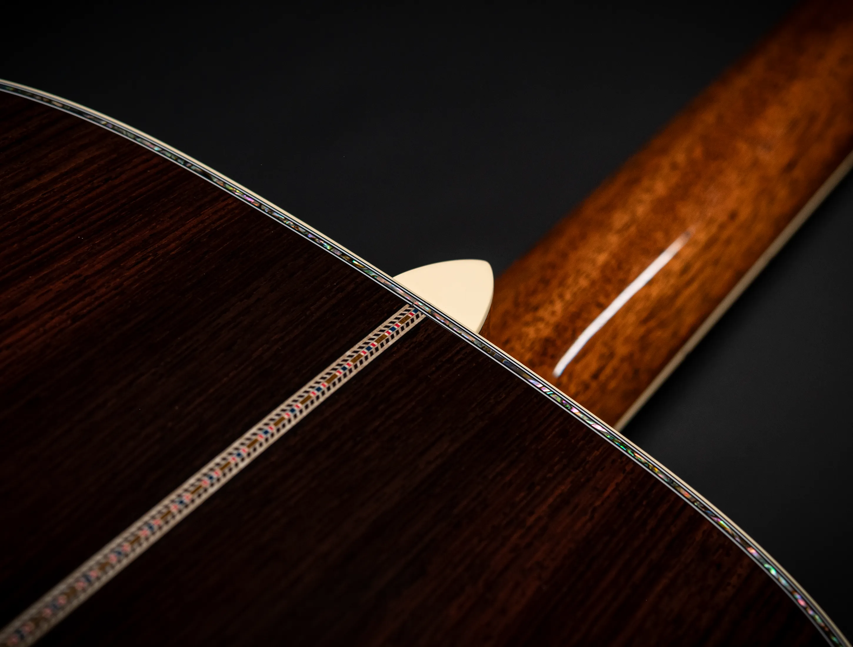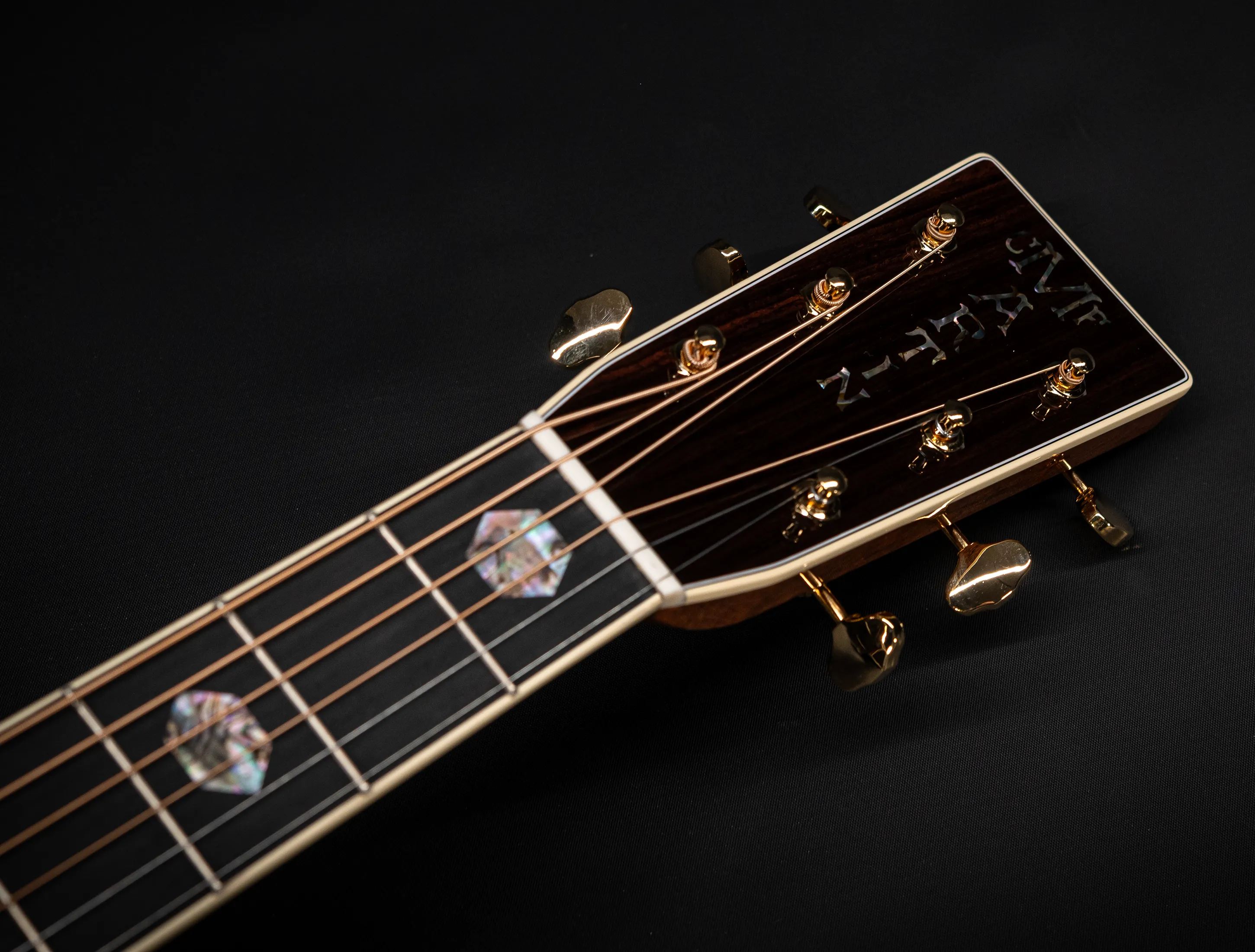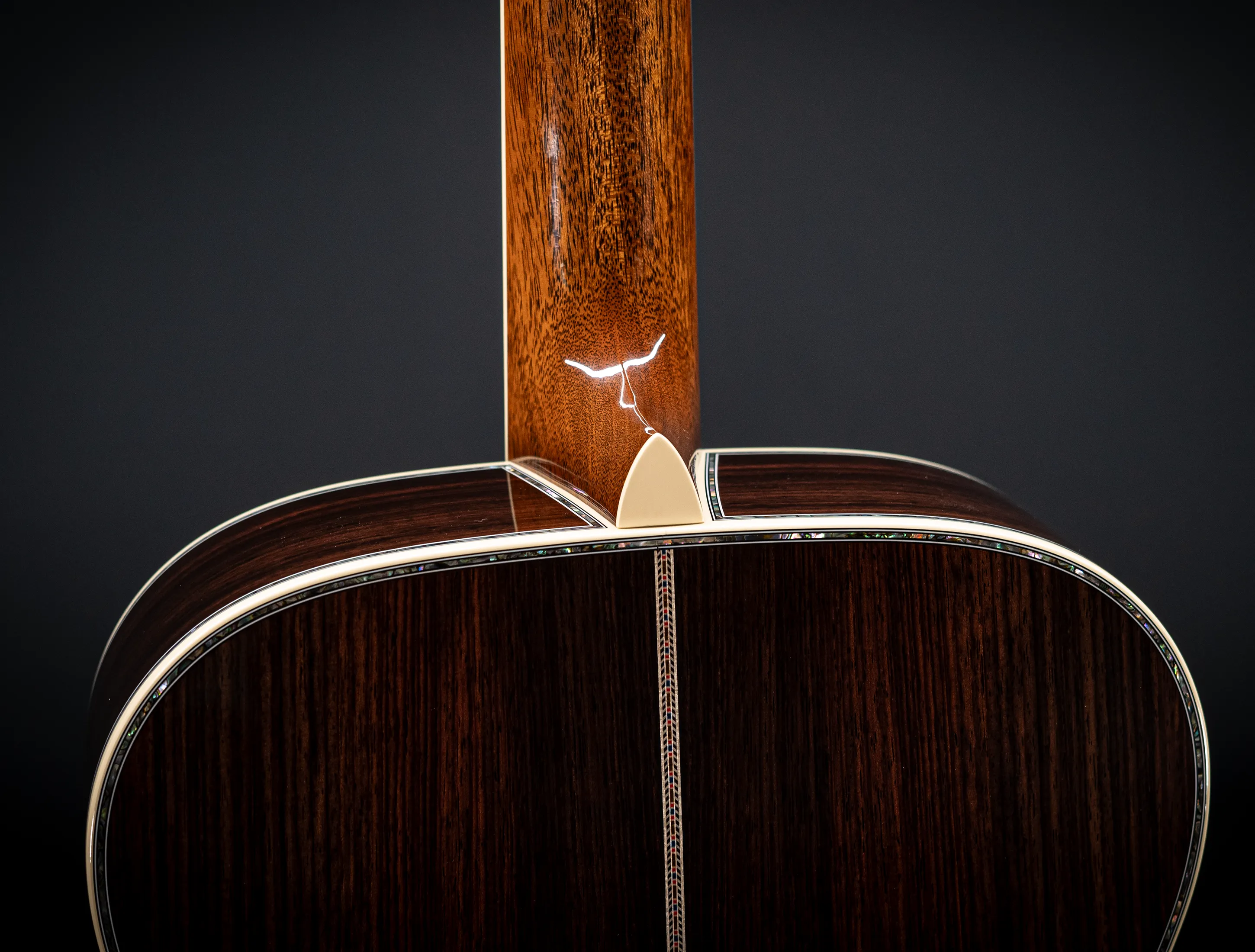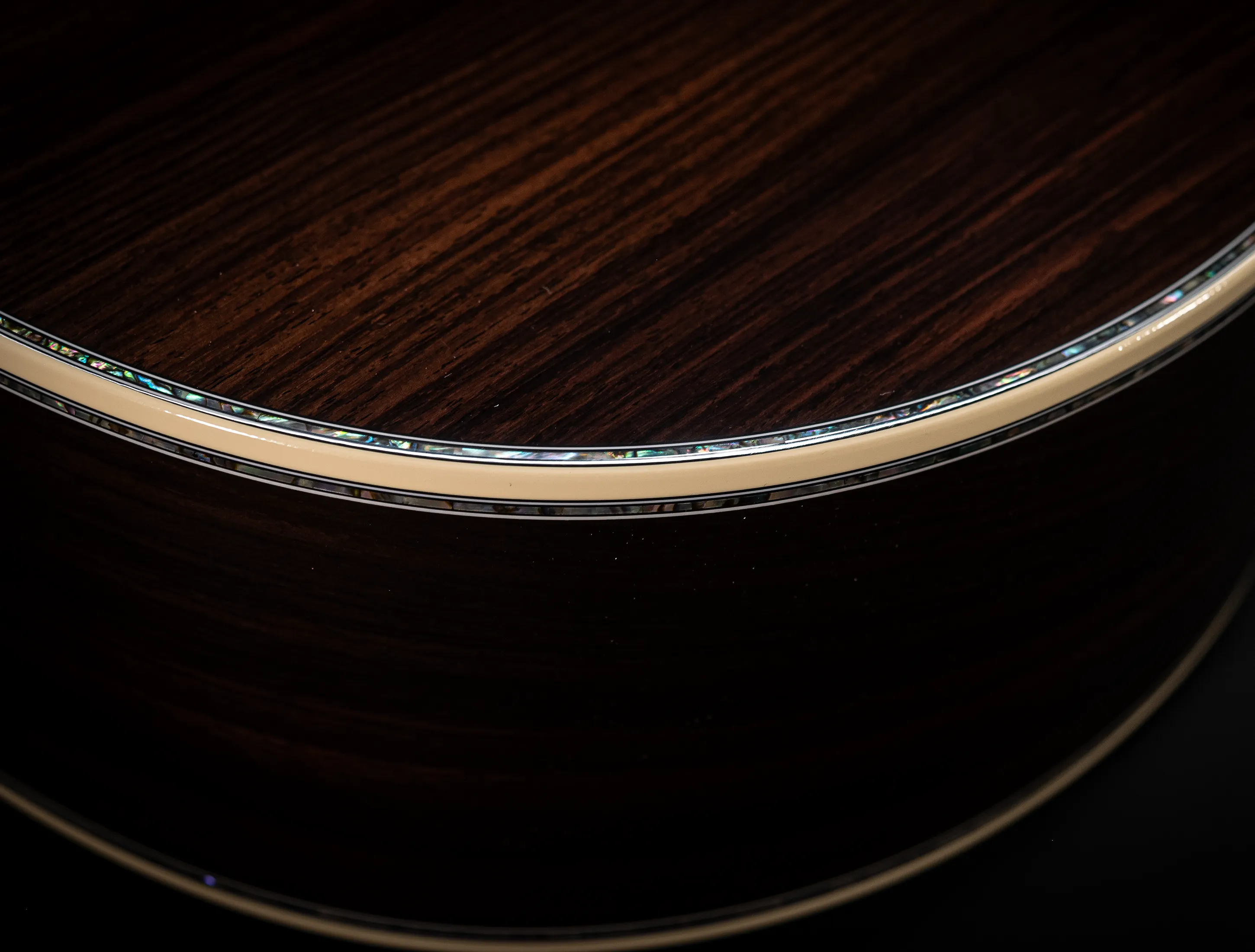 Nicht nur alleine das Tonholz ist hier eine Besonderheit. Bei diesem Meisterstück sind alle Komponenten aufeinander in perfekter Harmonie abgestimmt. Die Perlmutt-Details, die Einlagen, die Mechaniken und natürlich letztendlich auch das Finish überzeugt in allen Belangen. Klanglich einmal angespielt eröffnen sich hier ganz neue Welten: Eine Dynamik, eine Ausgeprägtheit der allerfeinsten Güte - ein Schmaus für die Ohren.