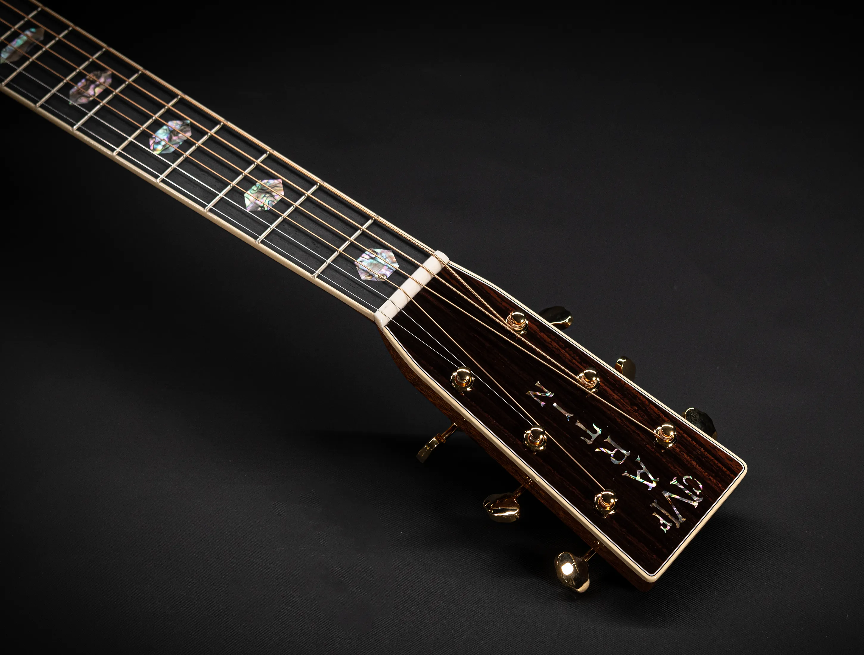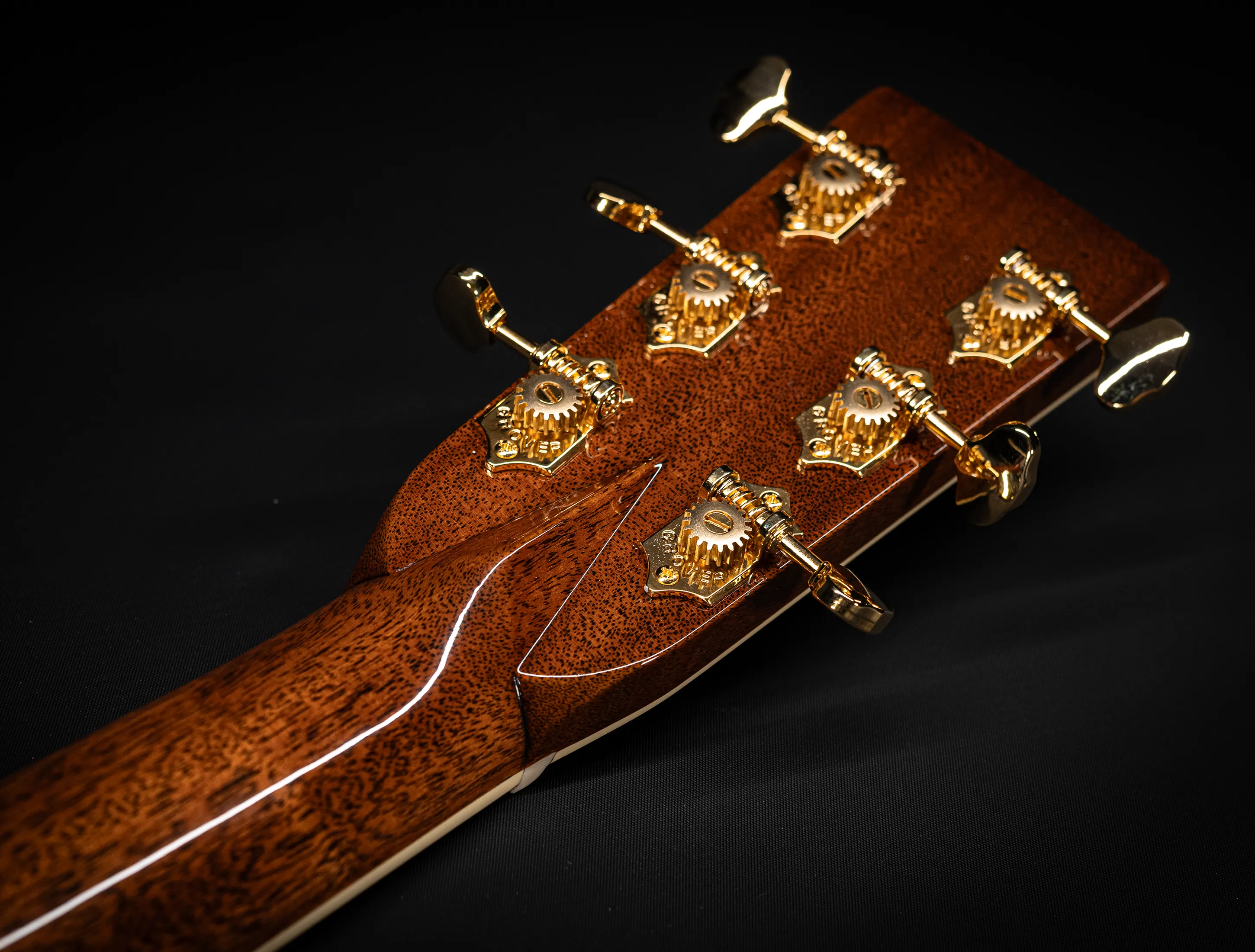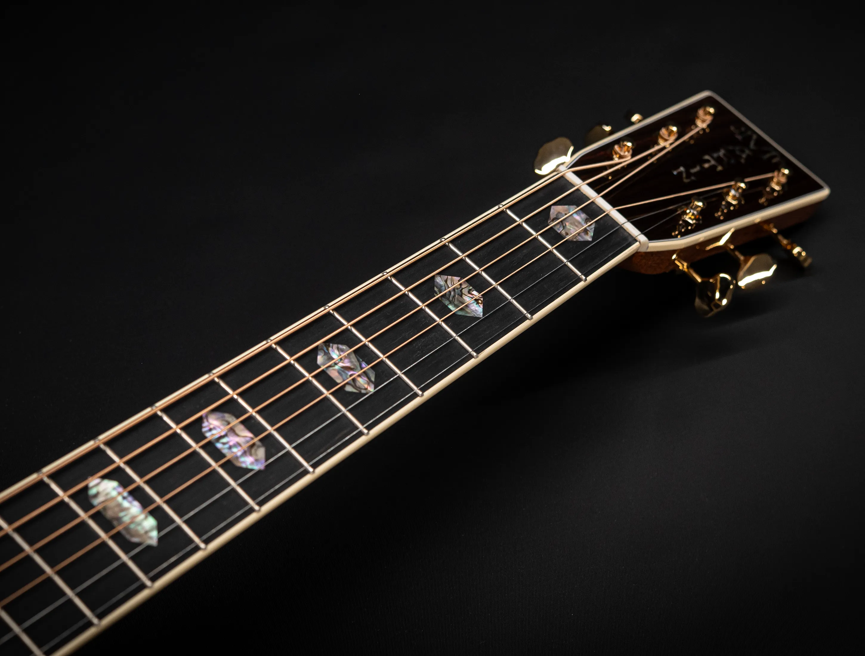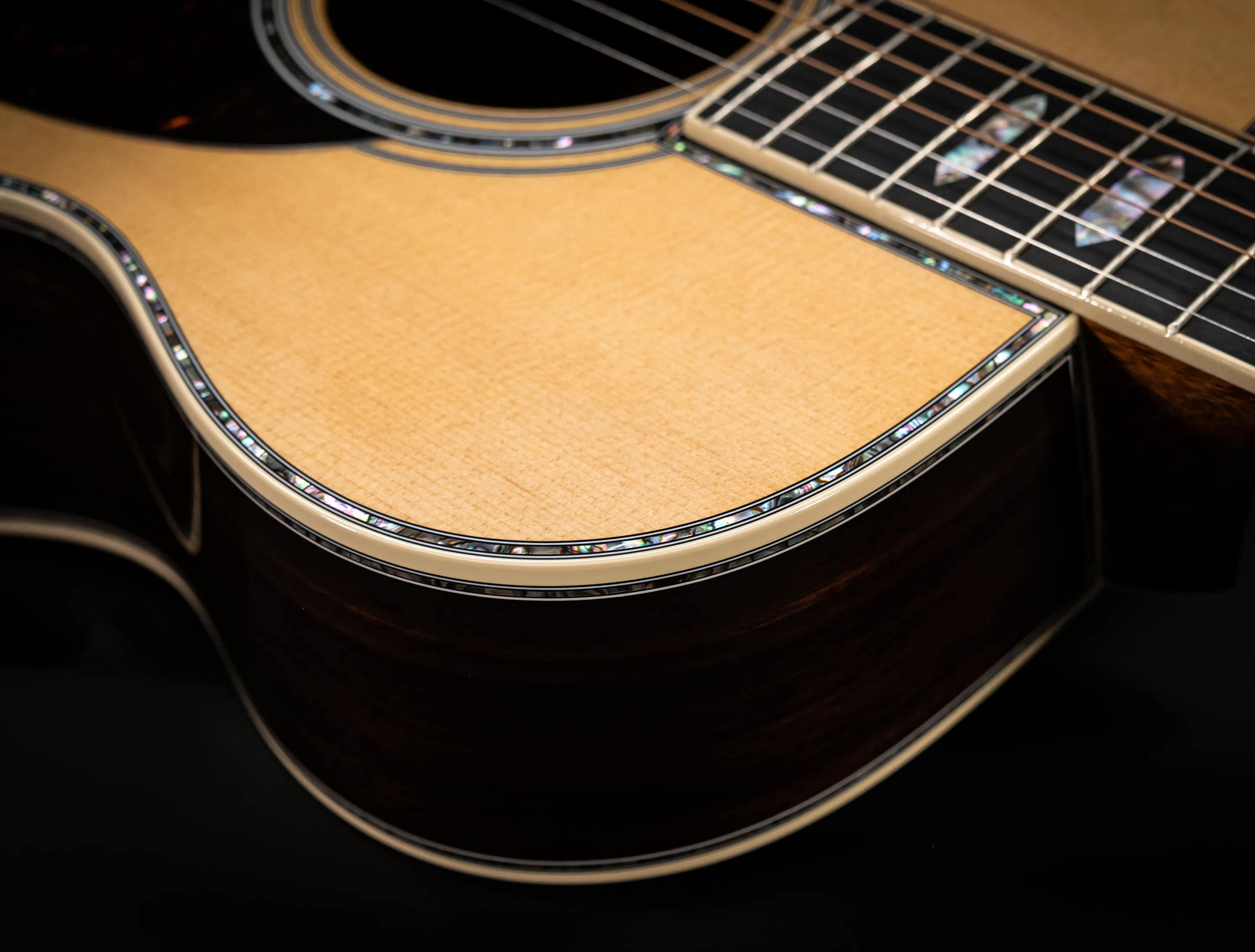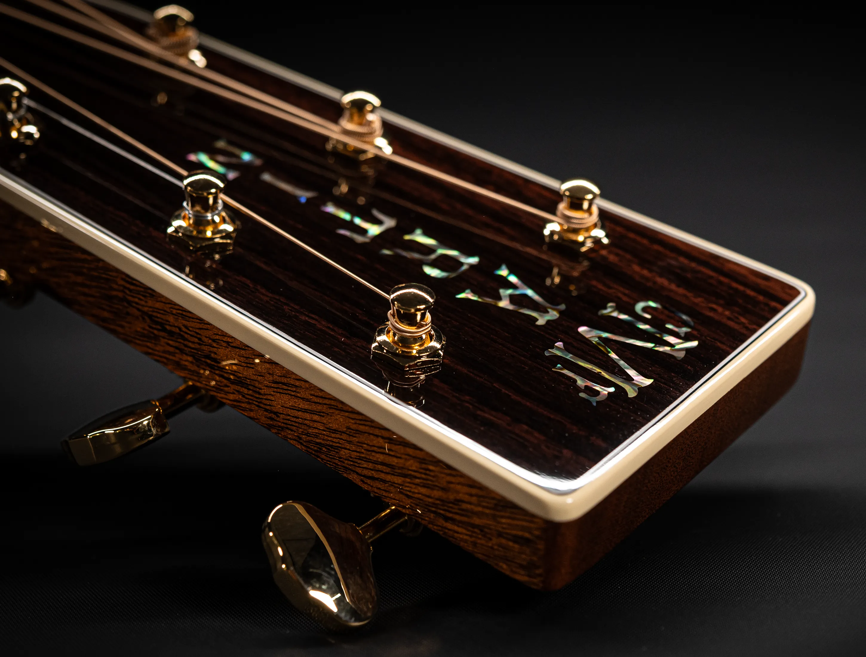 Nicht nur alleine das Tonholz ist hier eine Besonderheit. Bei diesem Meisterstück sind alle Komponenten aufeinander in perfekter Harmonie abgestimmt. Die Perlmutt-Details, die Einlagen, die Mechaniken und natürlich letztendlich auch das Finish überzeugt in allen Belangen. Klanglich einmal angespielt eröffnen sich hier ganz neue Welten: Eine Dynamik, eine Ausgeprägtheit der allerfeinsten Güte - ein Schmaus für die Ohren.