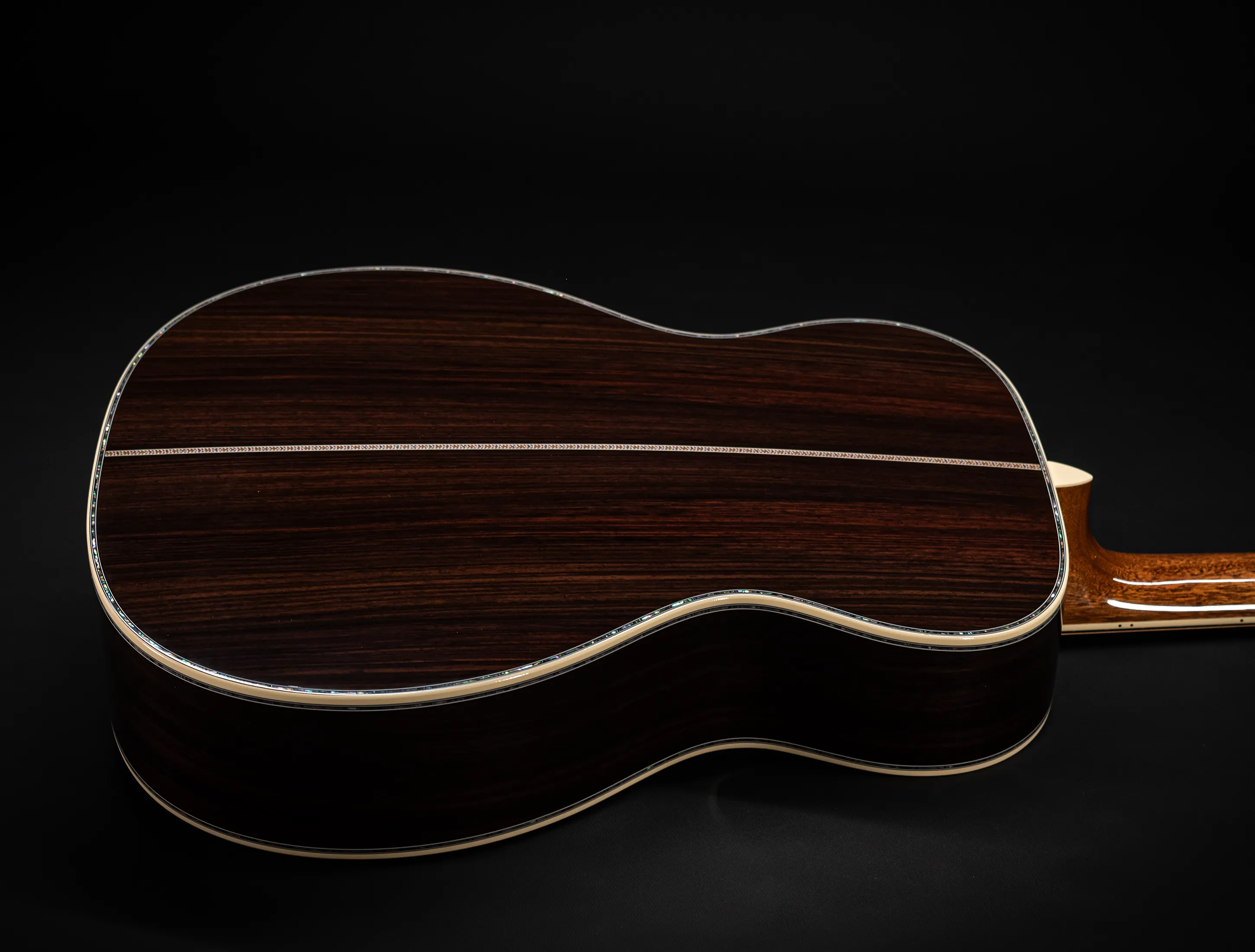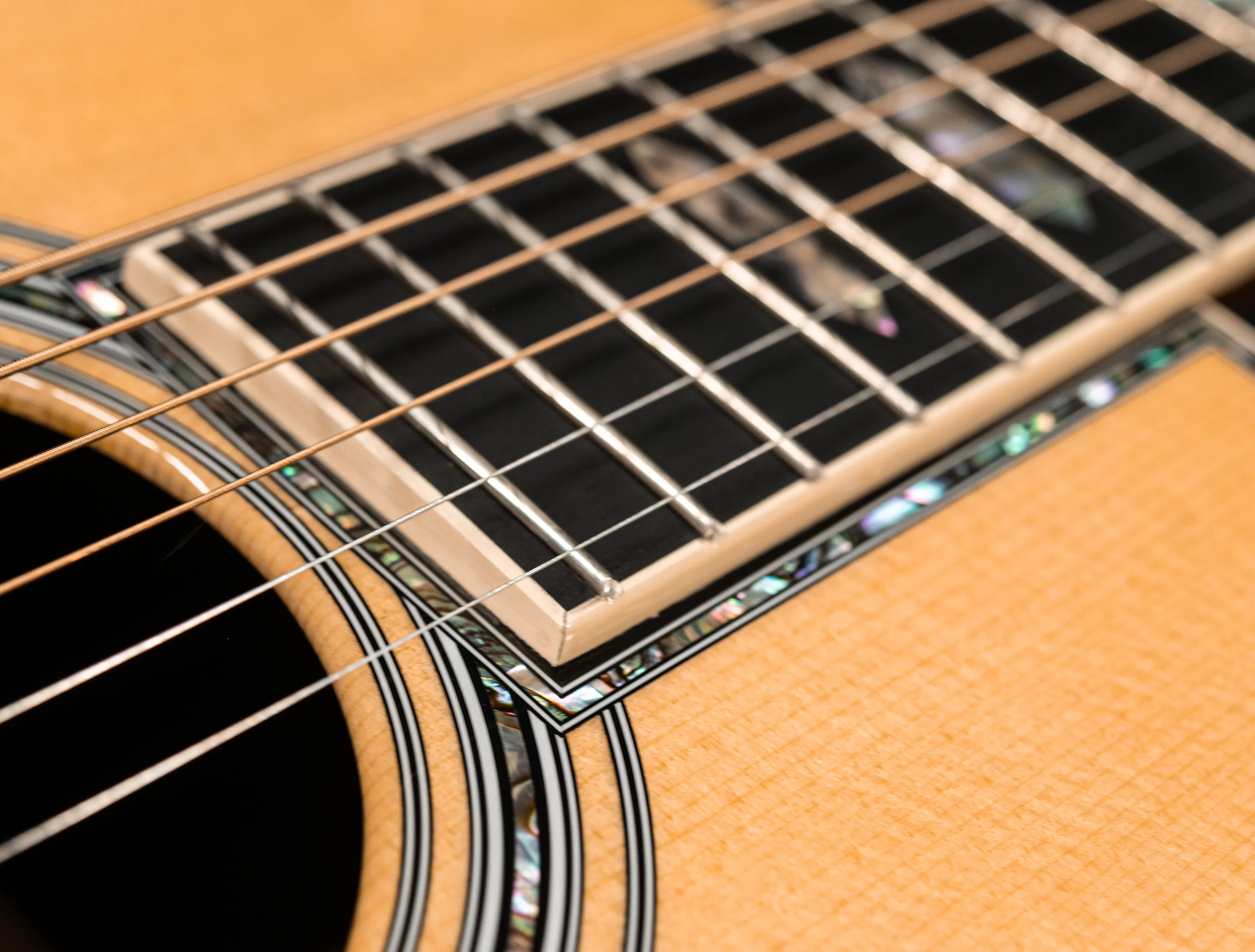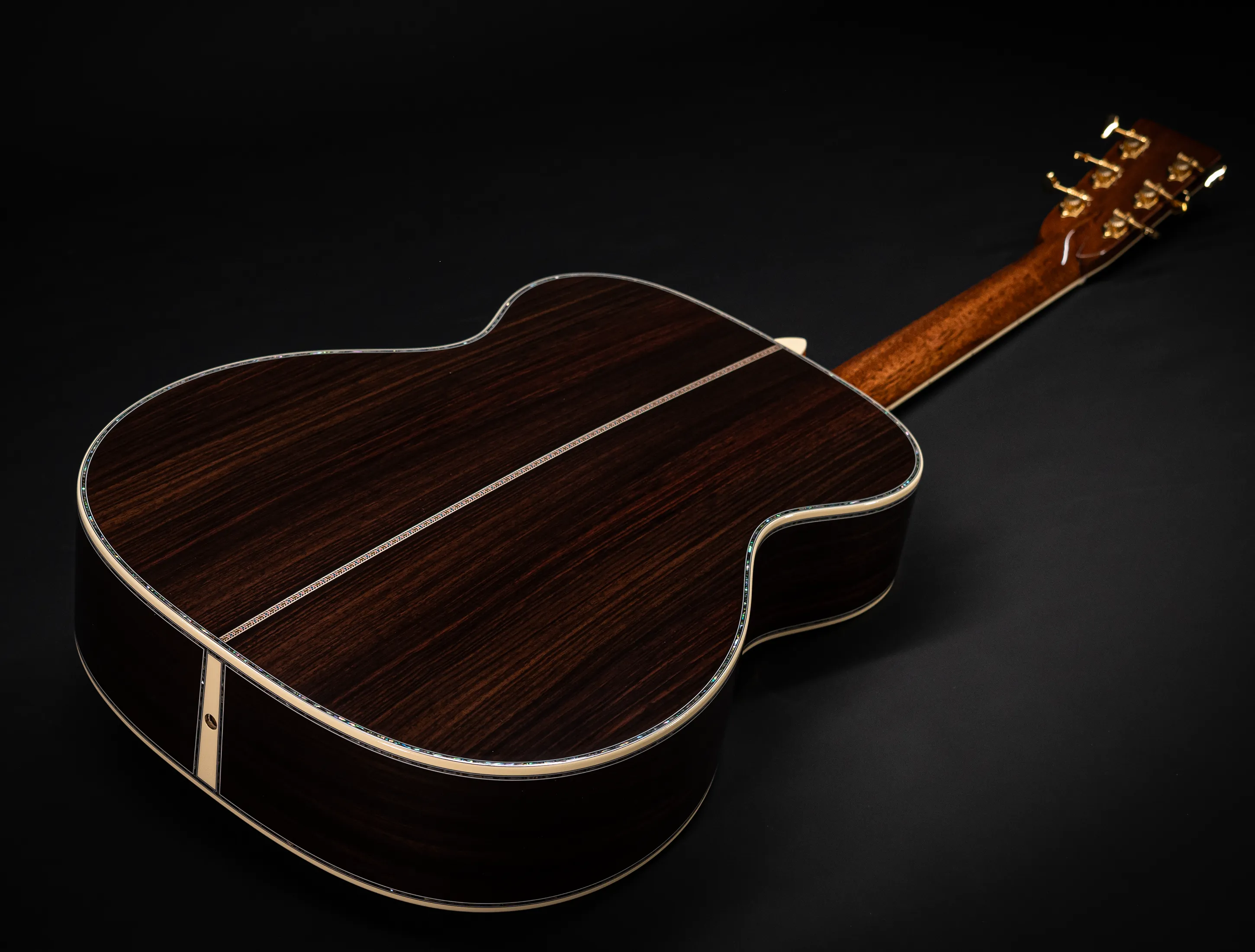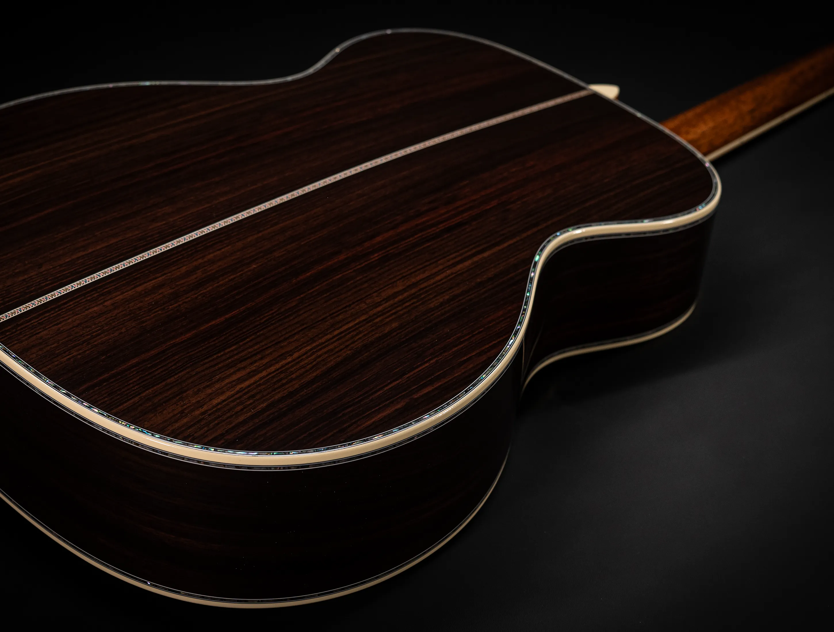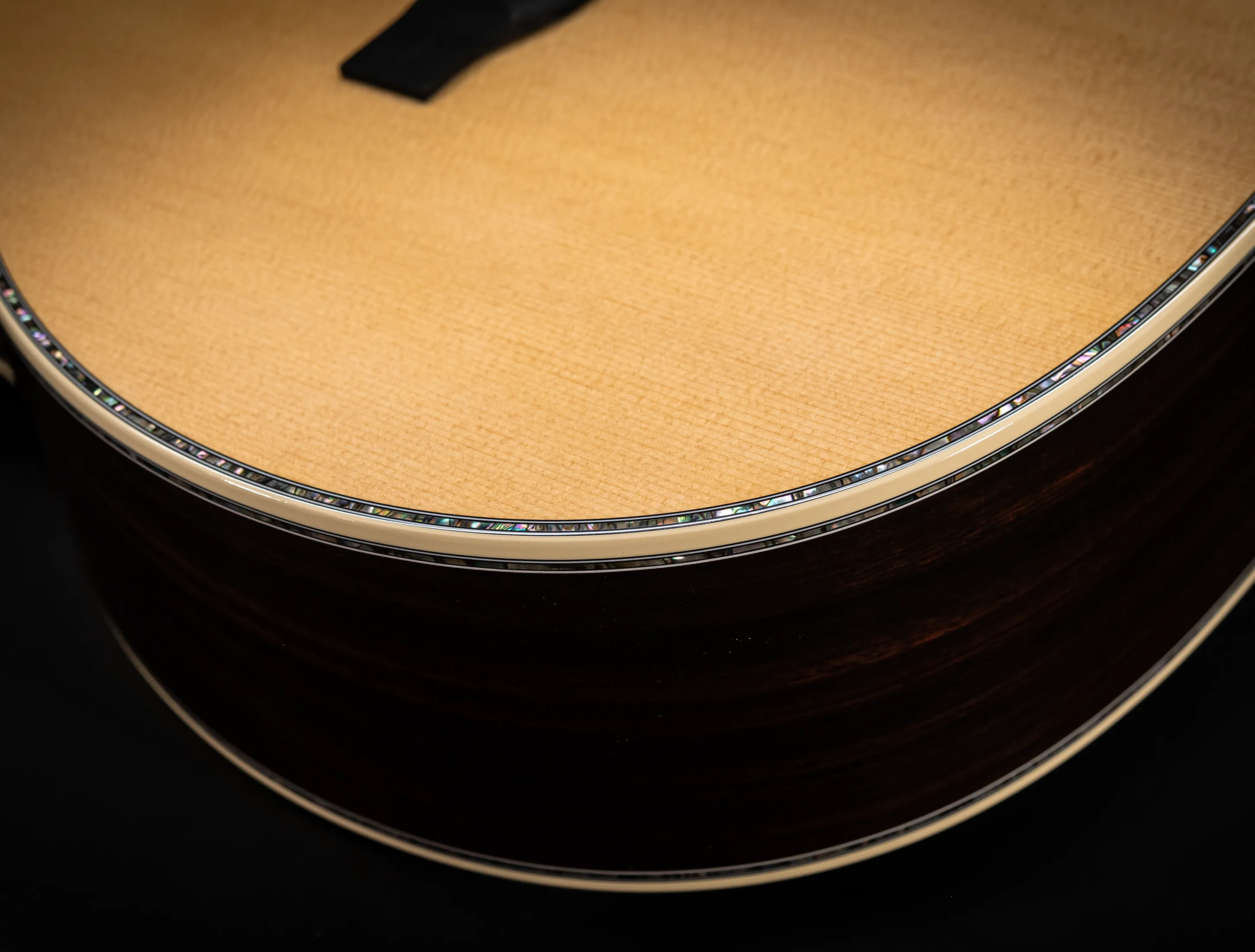 Nicht nur alleine das Tonholz ist hier eine Besonderheit. Bei diesem Meisterstück sind alle Komponenten aufeinander in perfekter Harmonie abgestimmt. Die Perlmutt-Details, die Einlagen, die Mechaniken und natürlich letztendlich auch das Finish überzeugt in allen Belangen. Klanglich einmal angespielt eröffnen sich hier ganz neue Welten: Eine Dynamik, eine Ausgeprägtheit der allerfeinsten Güte - ein Schmaus für die Ohren.