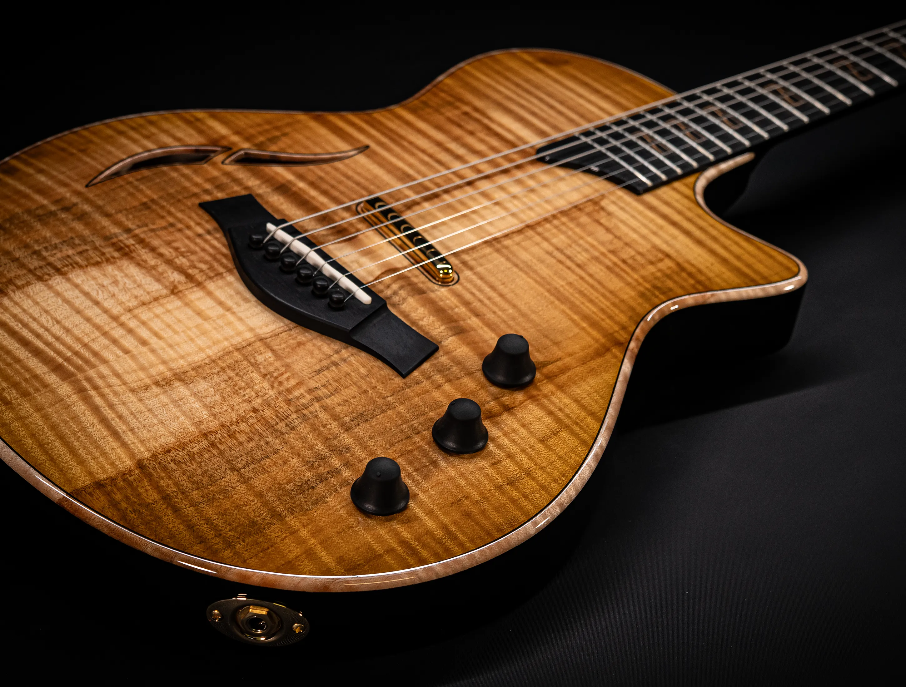 Die weiteren Features: Die Taylor Hollowbody Custom T5z Boxwood ist die Vereinigung von E- und Akustik-Gitarre. Ausgestattet mit einem Akustik-Body-Sensor und zwei E-Gitarren-Tonabnehmer (Humbucker - einer sichtbar, einer versteckt) lassen sie die Signale miteinander mischen oder komplett ein- und ausschalten ( Akustik-Sound / E-Gitarren Sound ). Somit ist sie das perfekte Allroundmodell für Musiker. Die Gitarre klingt mit einen Akustik-Verstärker ebenso wie mit einem E-Gitarren Verstärker oder direkt über die P.A..