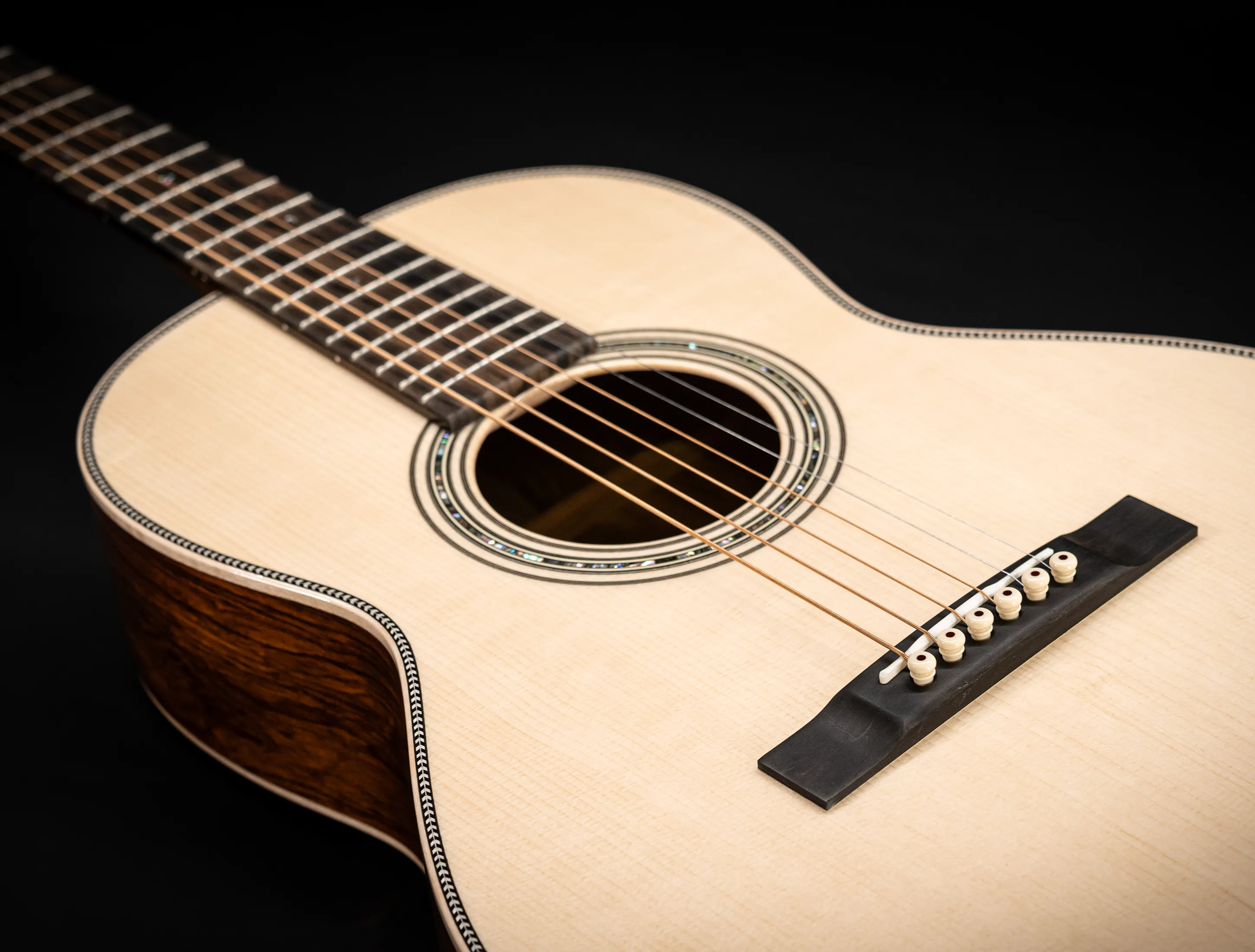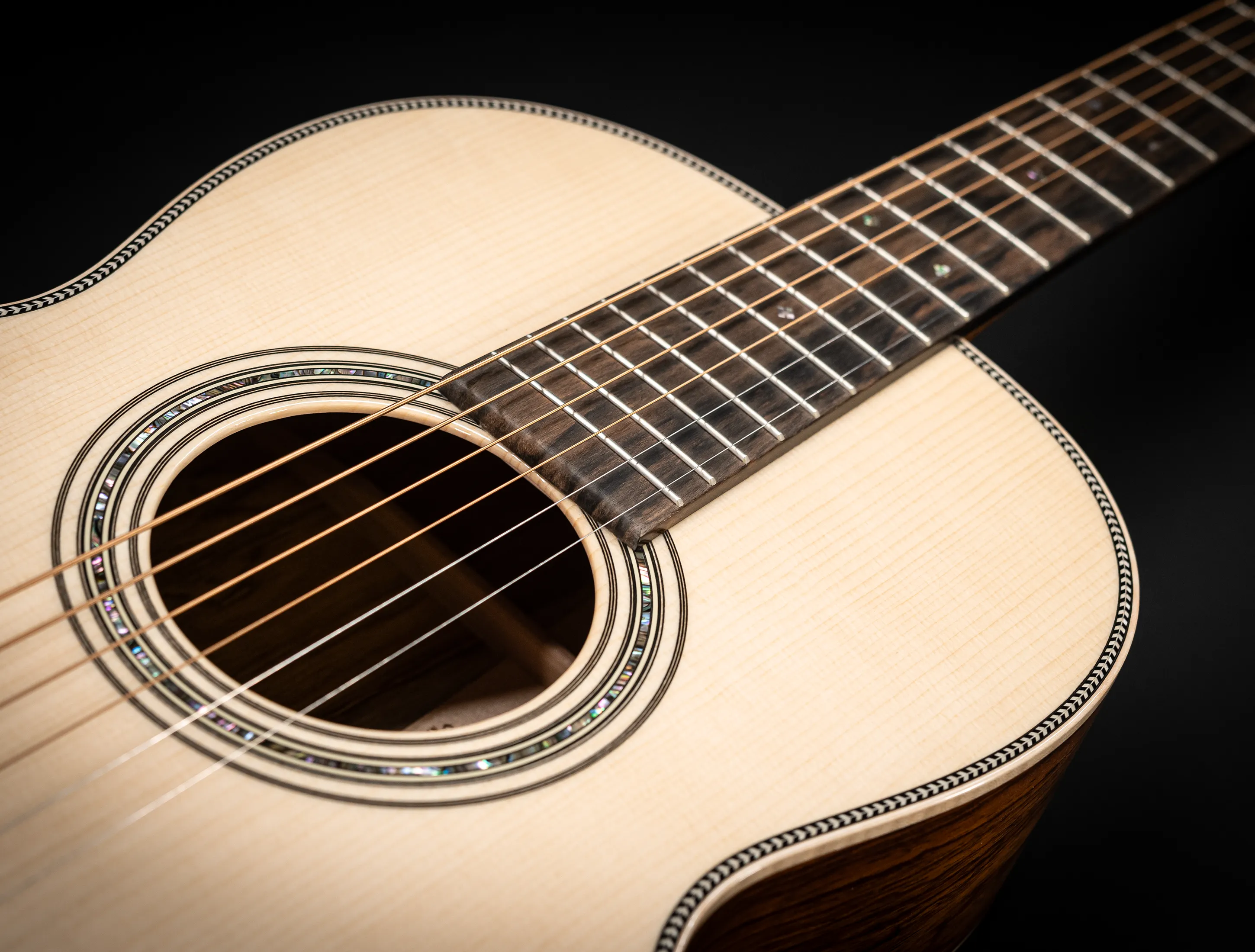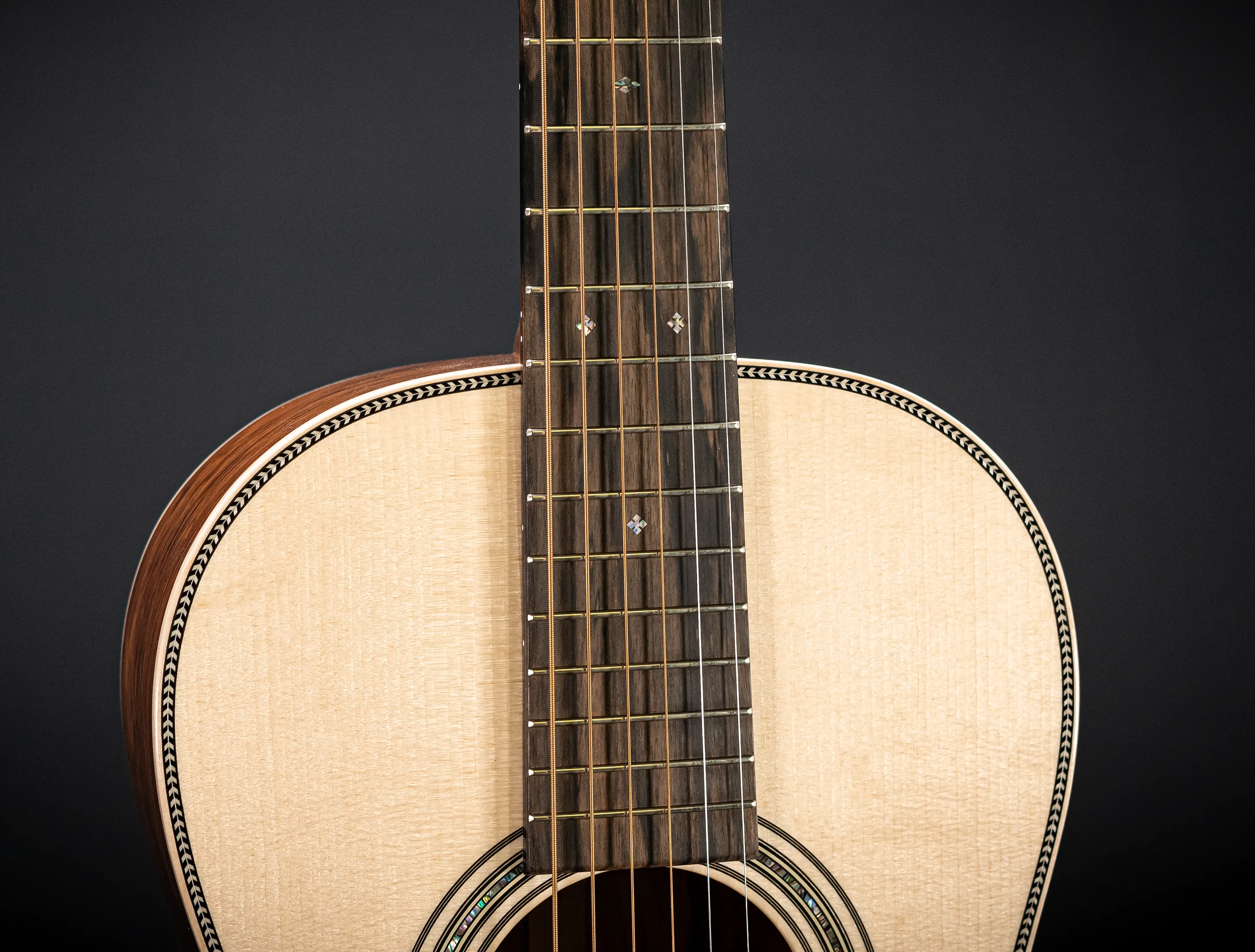 Das vorhandene scalloped 1/4" X Bracing (die Deckenverbalkung) sorgt für perfekte Ausgewogenheit und Nuancen über das gesamte Klangspektrum, welches mit satten Bässen, gedämpften Mitten und glasklaren Höhen ein Traum von einem Klang darstellt, da die Decke somit noch freier schwingen kann. Die besondere Holzkombination aus Engelmann-Fichte und selektiertem, premium Guatemalan Palisander (selbstverständlich in vollmassiver Bauweise) zeugen von der Besonderheit dieses Instrumentes. Kraftvoll und allzeit Durchsetzungsfähig ist sie, bietet aber dennoch viel Raum, um feine Artikulationen wiederzugeben. Schlichtweg so, wie man sich eine "besondere" Martin vorstellt.