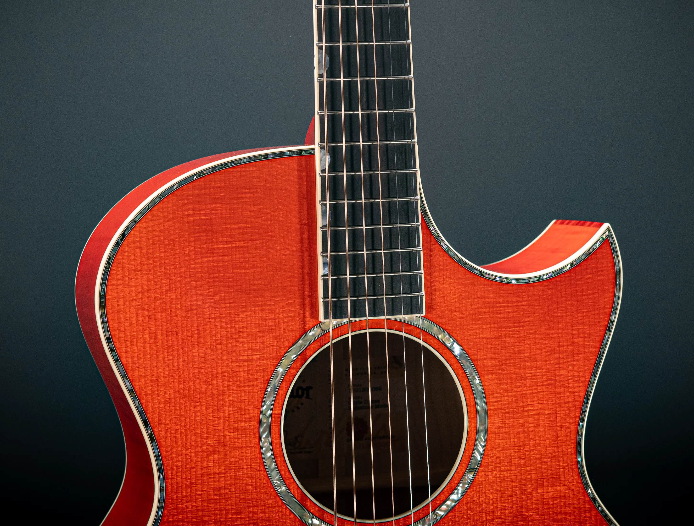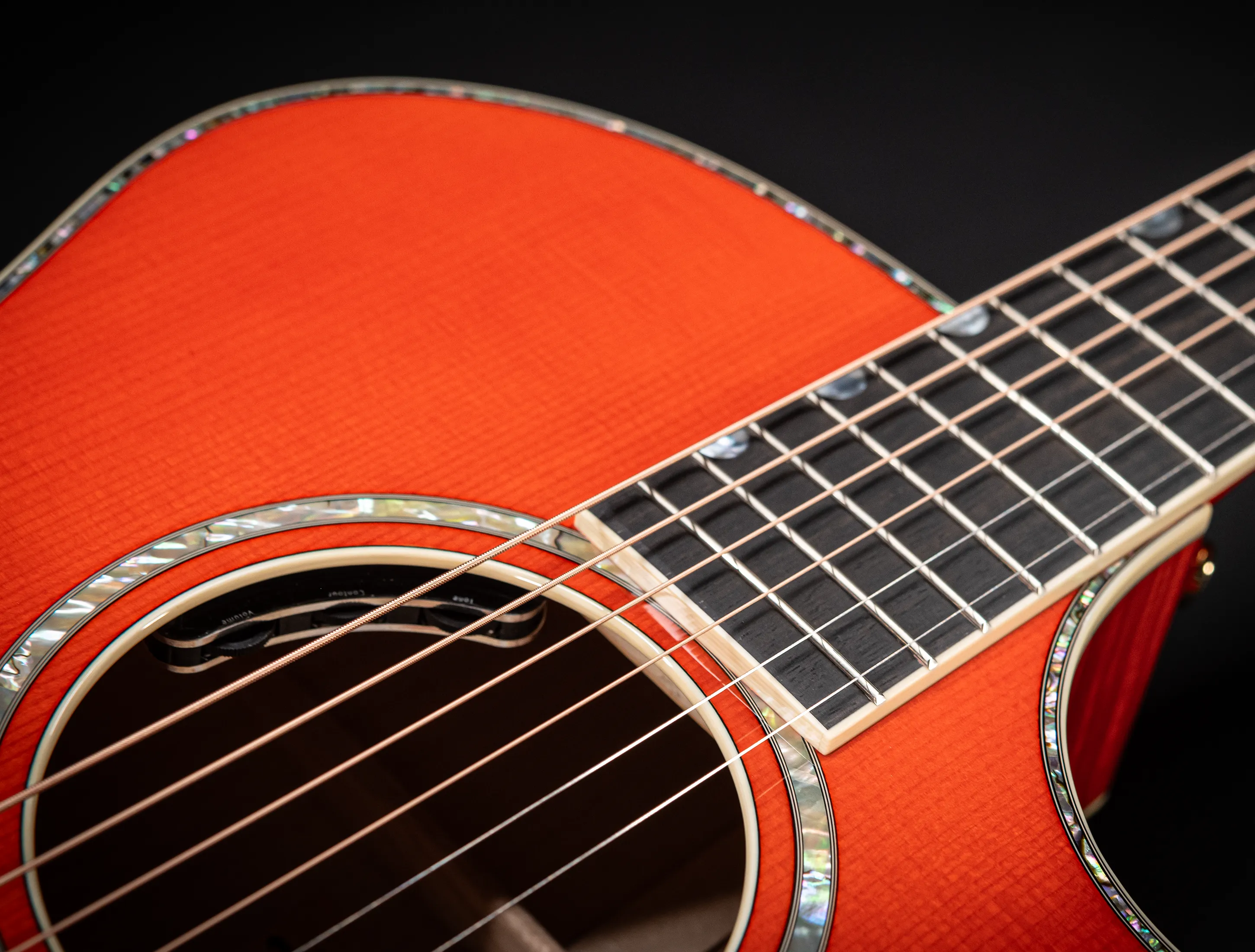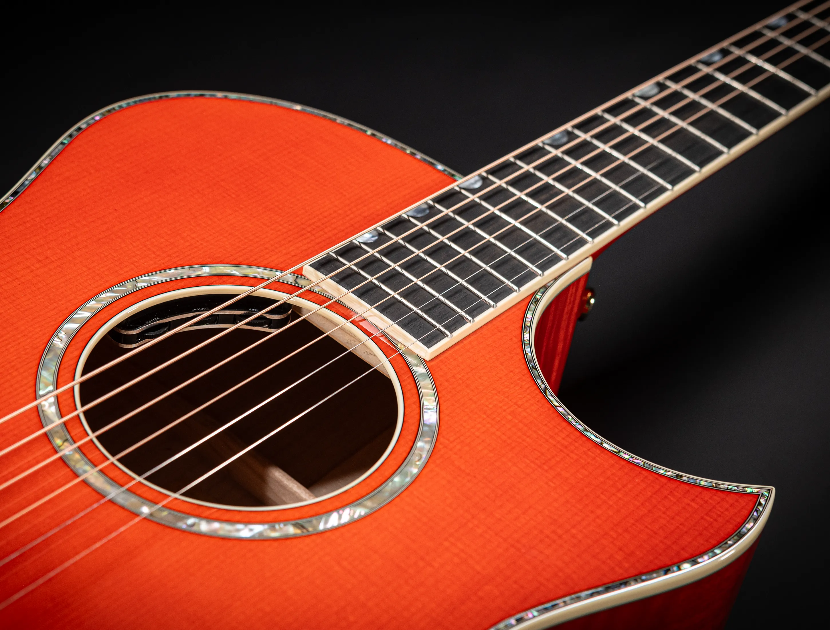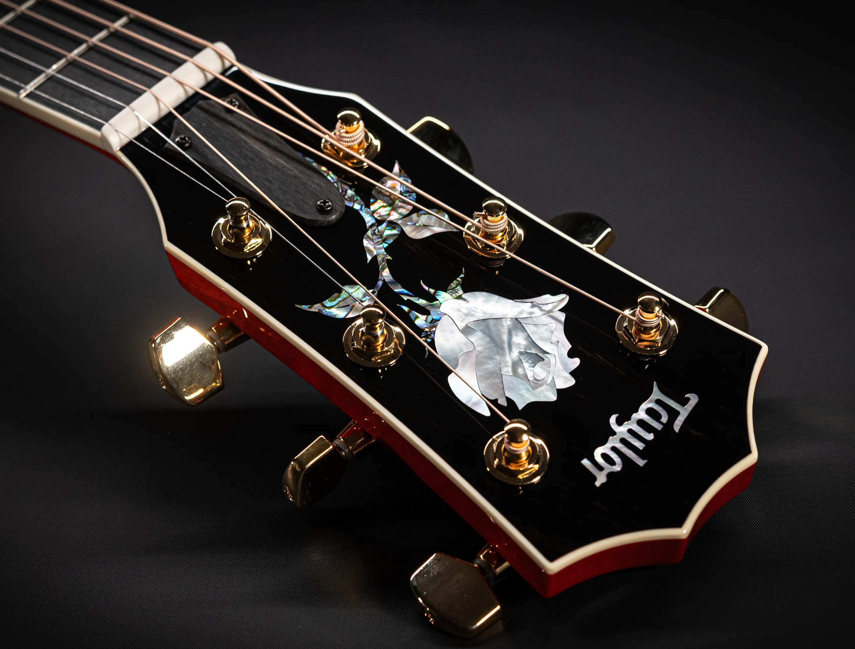 Auch optisch überzeugt dieses Modell auf ganzer Linie: Die transparente, orangefarbene Hochglanzlackierung, edle Abalone- und Perlmutt-Details sowie liebevolle Verzierungen machen diese Gitarre zu einem echten Kunstwerk – eine Hommage an Doyles Persönlichkeit und sein musikalisches Erbe.