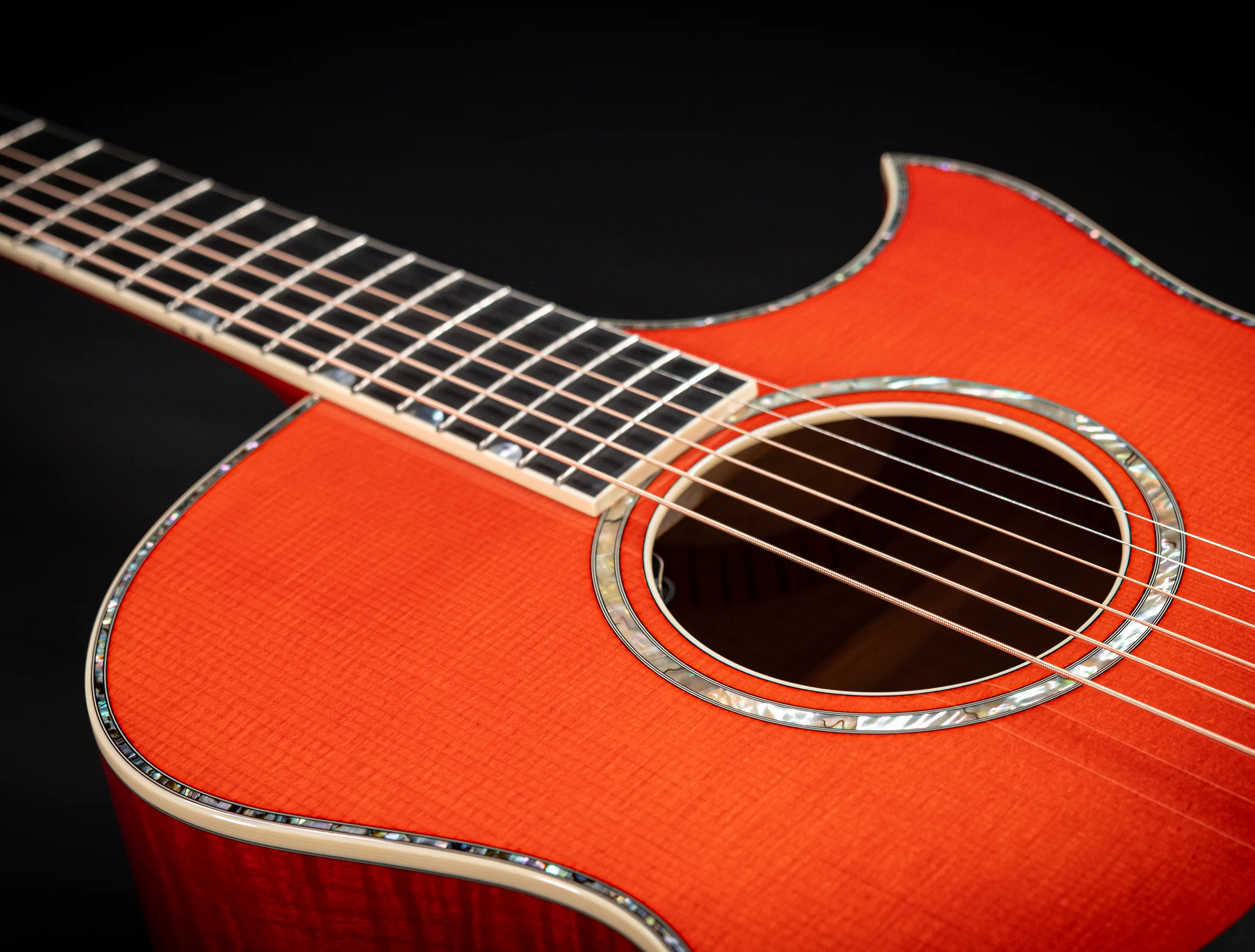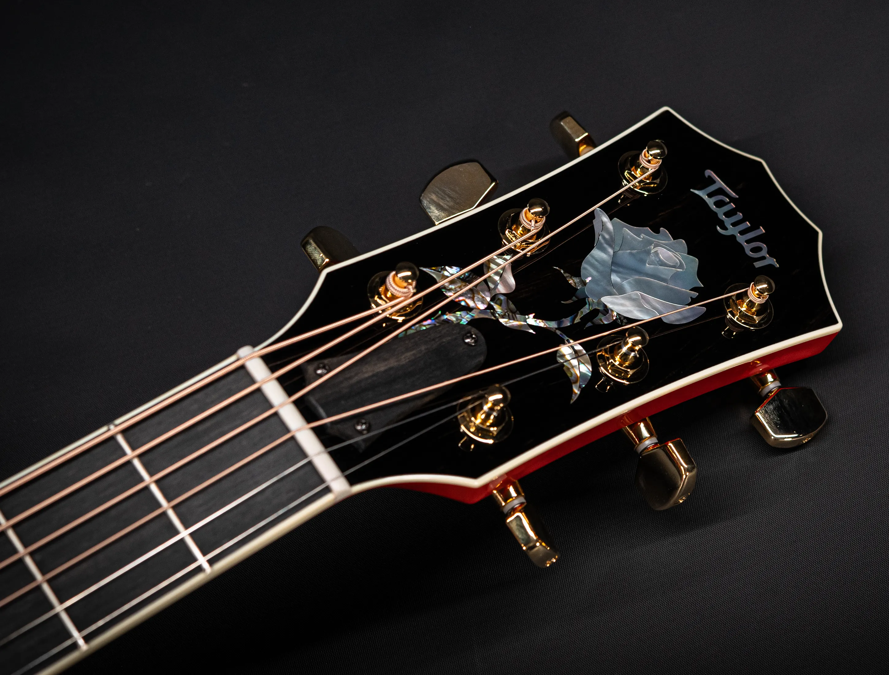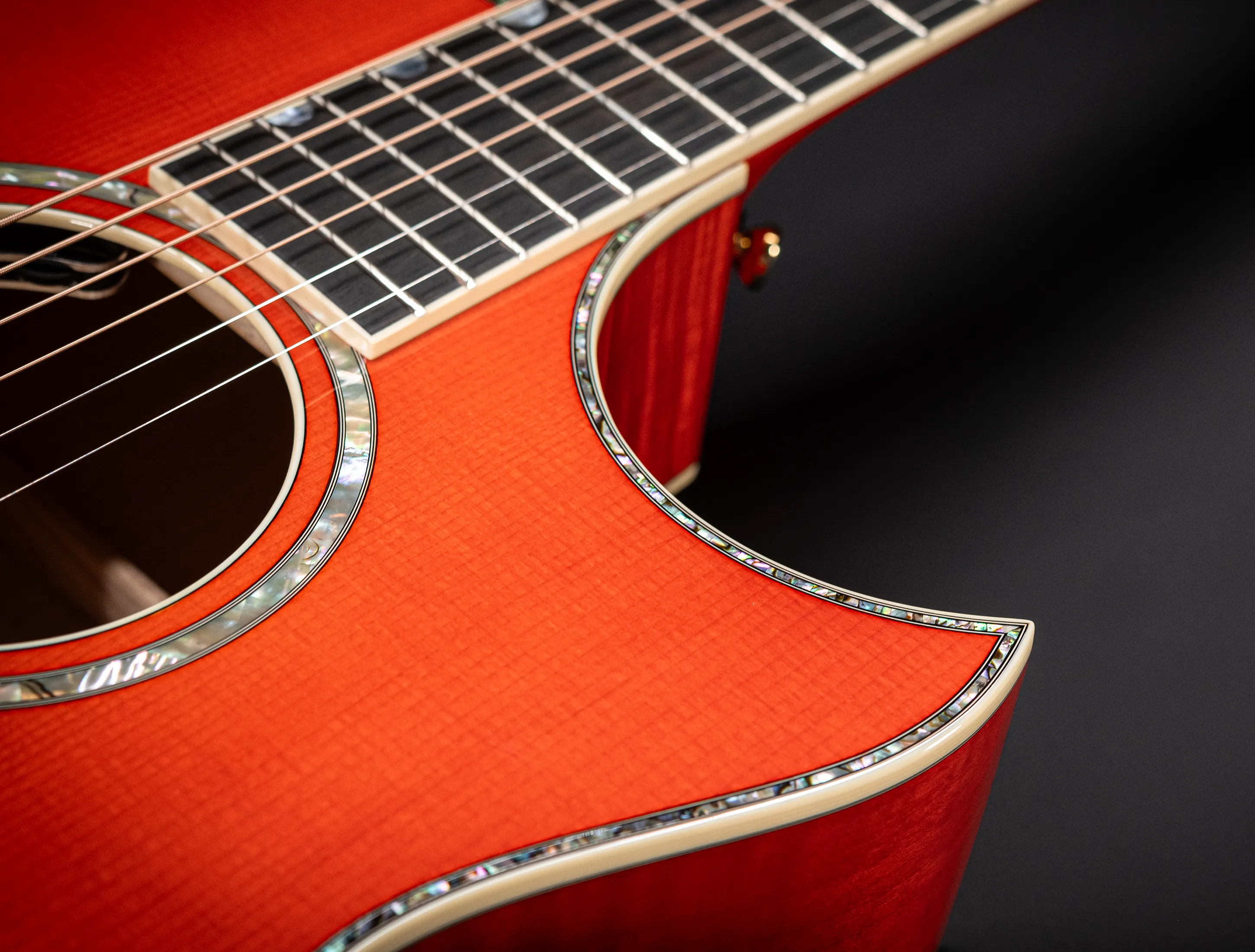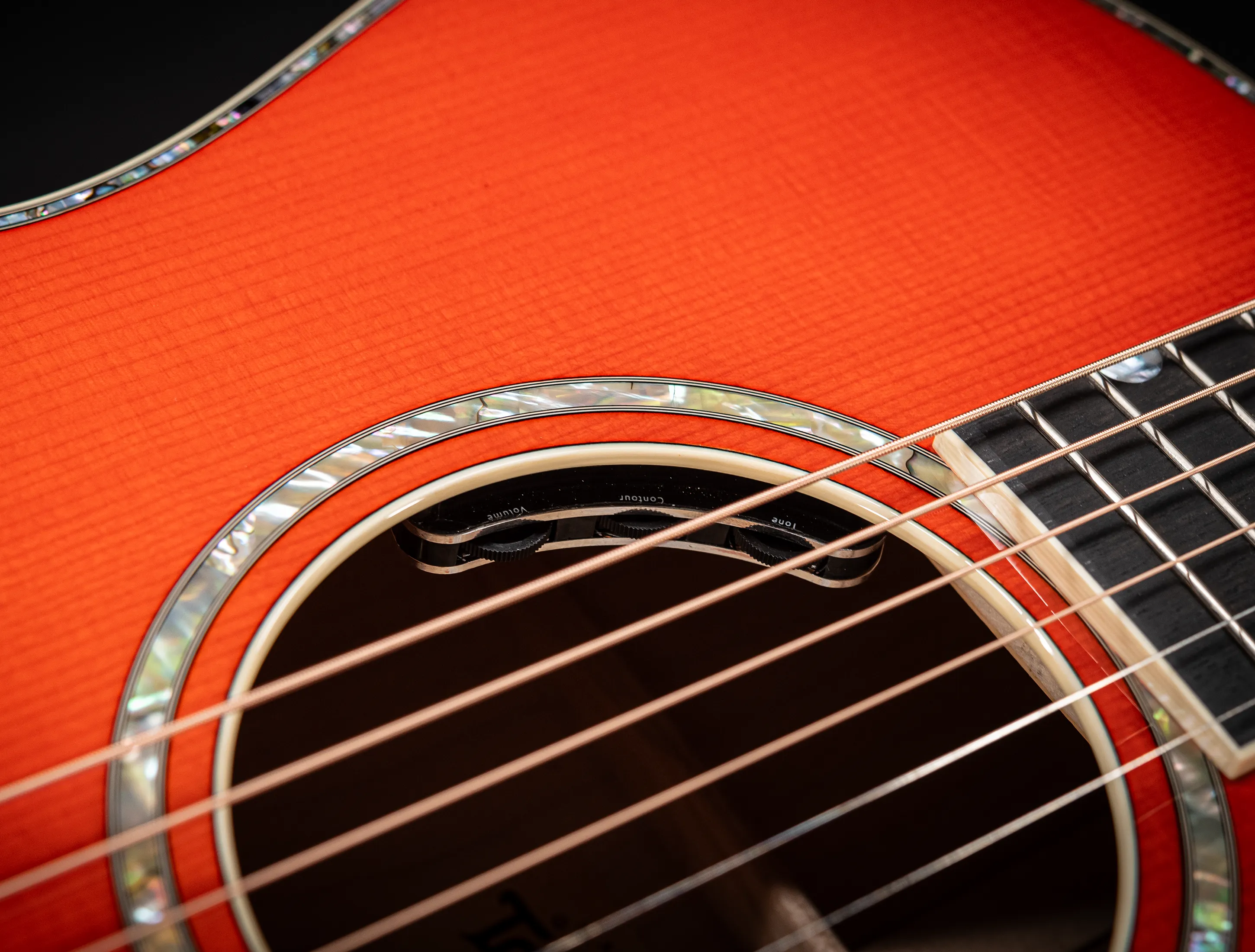 Auch optisch überzeugt dieses Modell auf ganzer Linie: Die transparente, orangefarbene Hochglanzlackierung, edle Abalone- und Perlmutt-Details sowie liebevolle Verzierungen machen diese Gitarre zu einem echten Kunstwerk – eine Hommage an Doyles Persönlichkeit und sein musikalisches Erbe.
