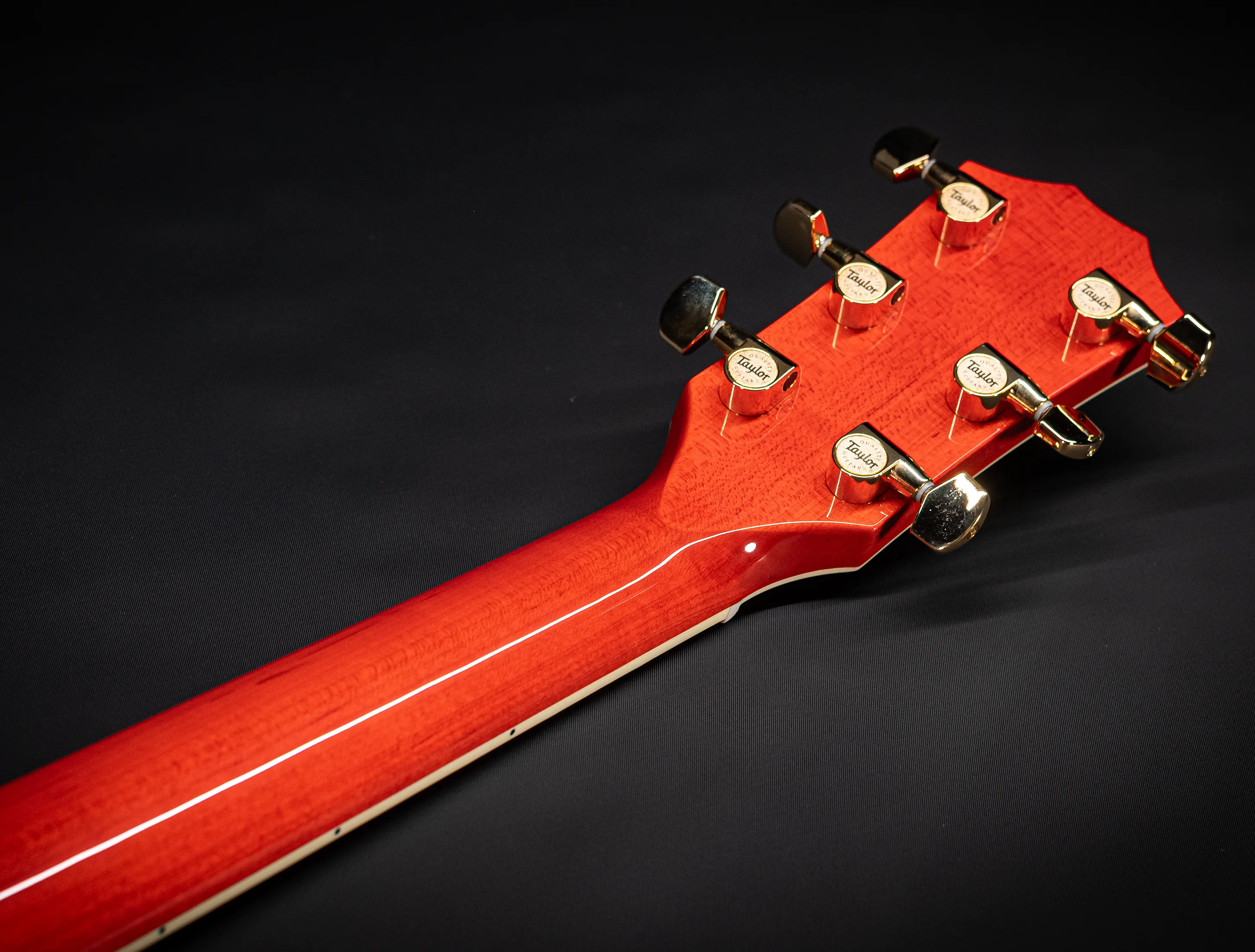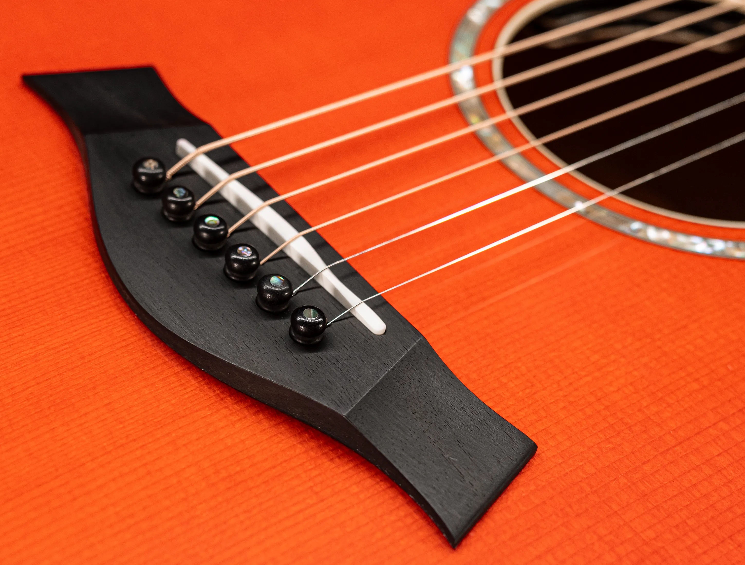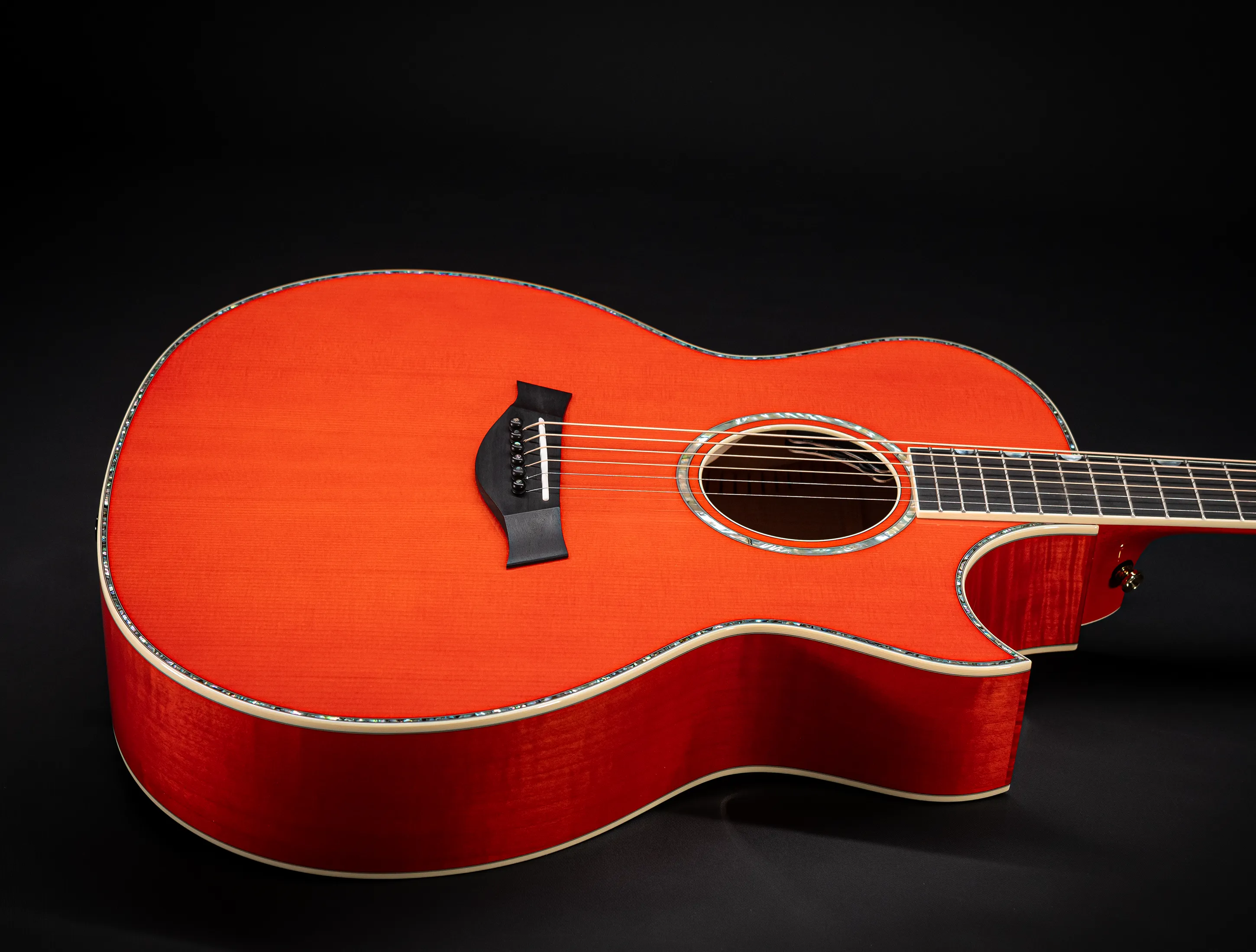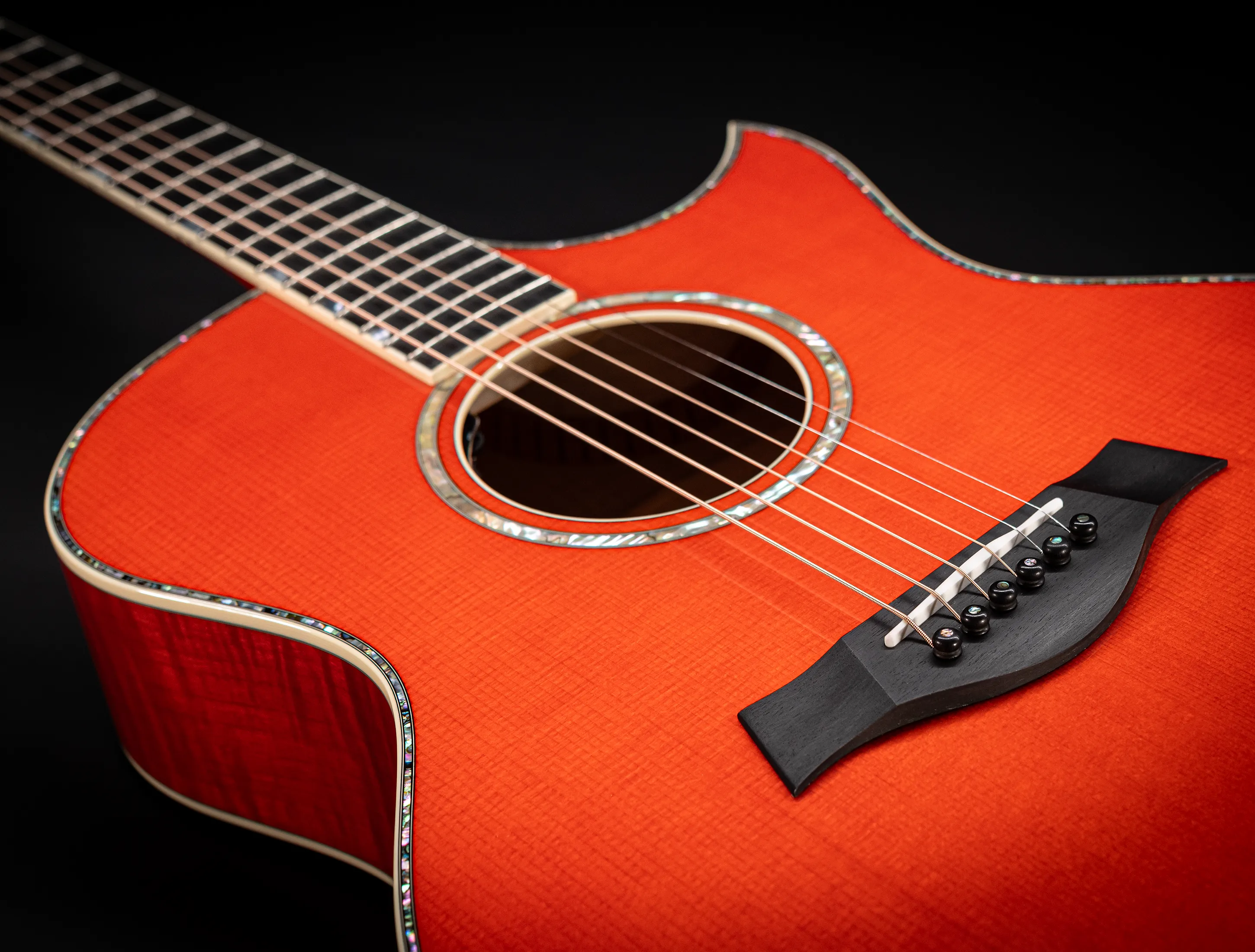 Auch optisch überzeugt dieses Modell auf ganzer Linie: Die transparente, orangefarbene Hochglanzlackierung, edle Abalone- und Perlmutt-Details sowie liebevolle Verzierungen machen diese Gitarre zu einem echten Kunstwerk – eine Hommage an Doyles Persönlichkeit und sein musikalisches Erbe.