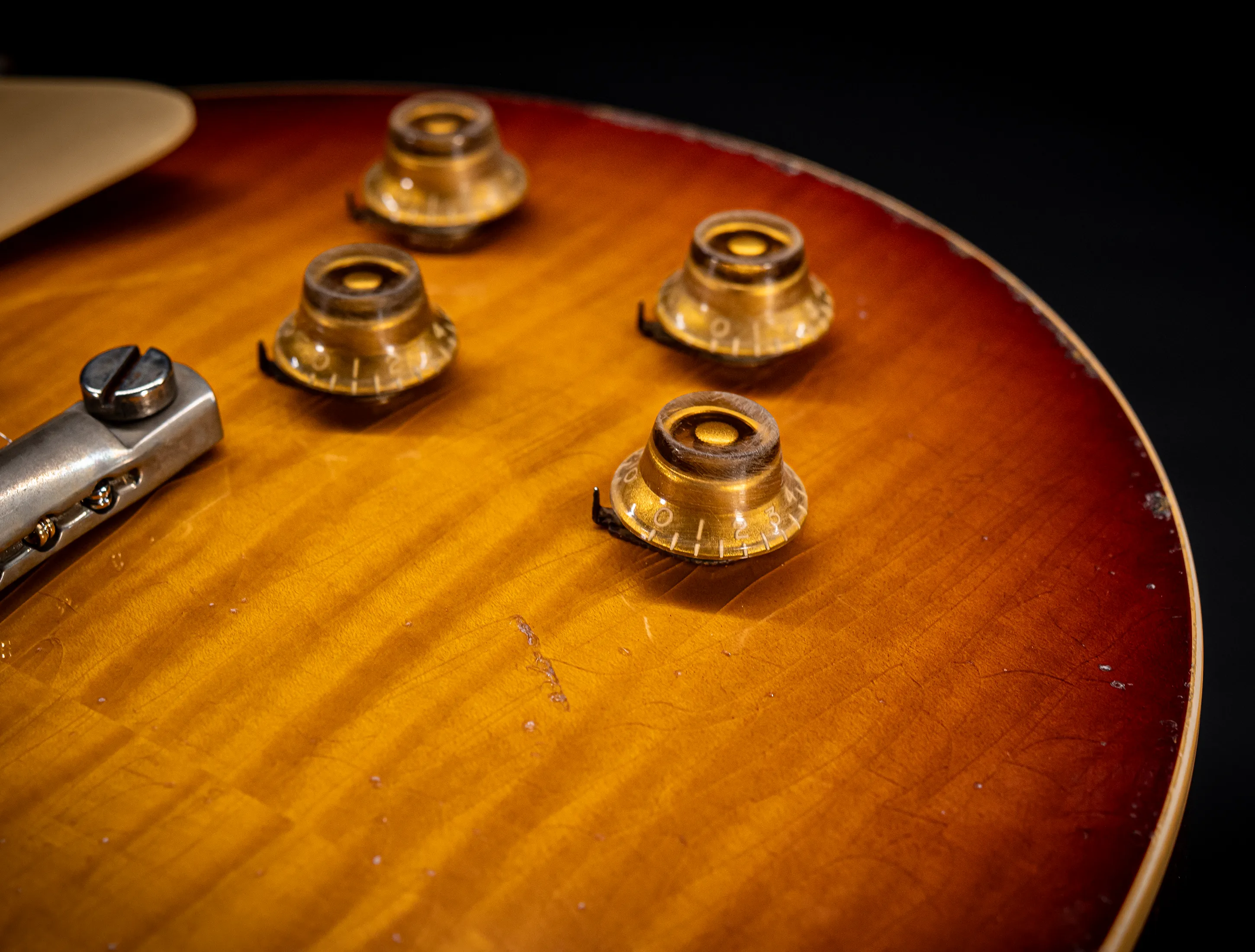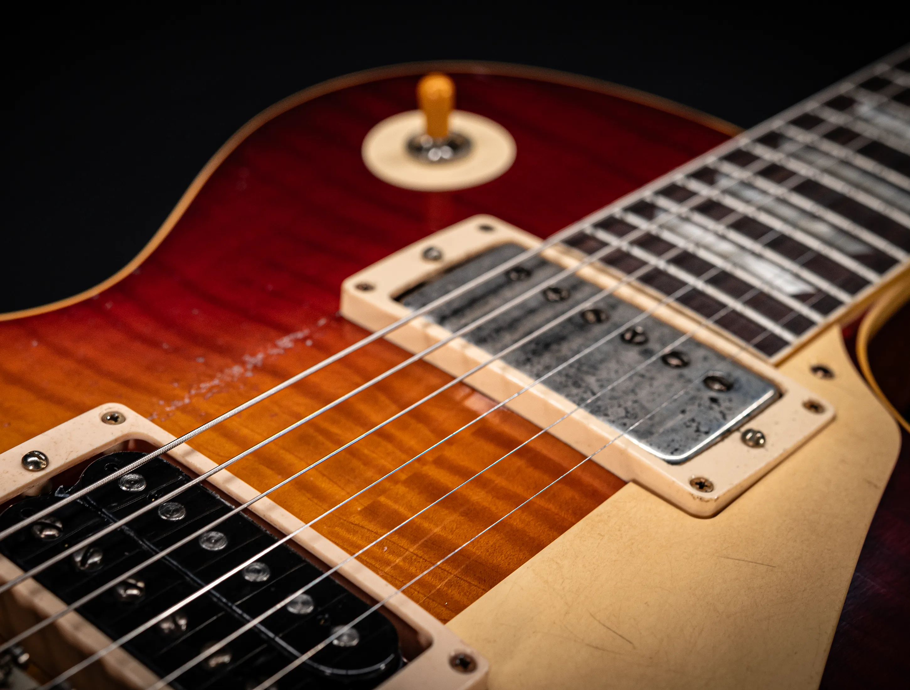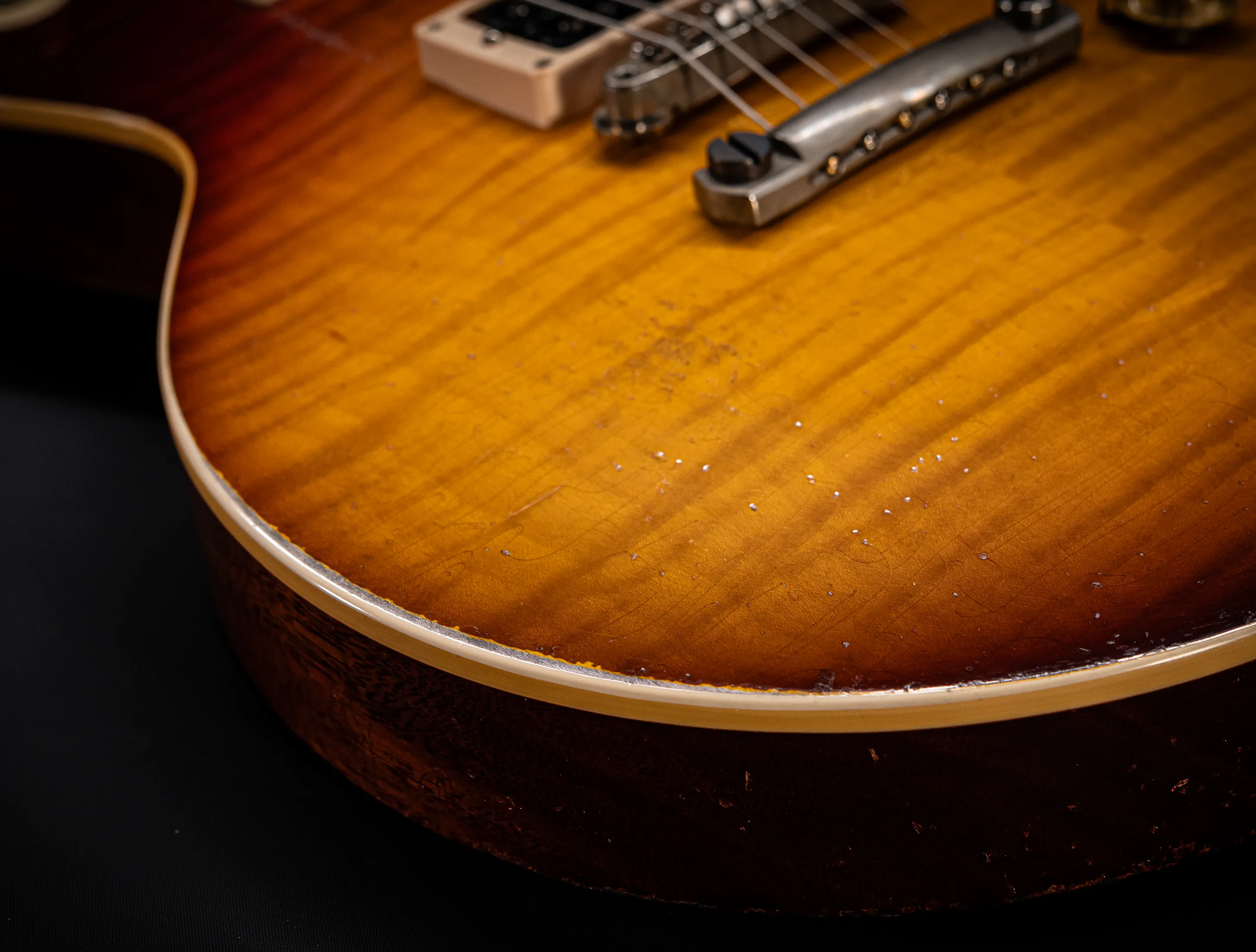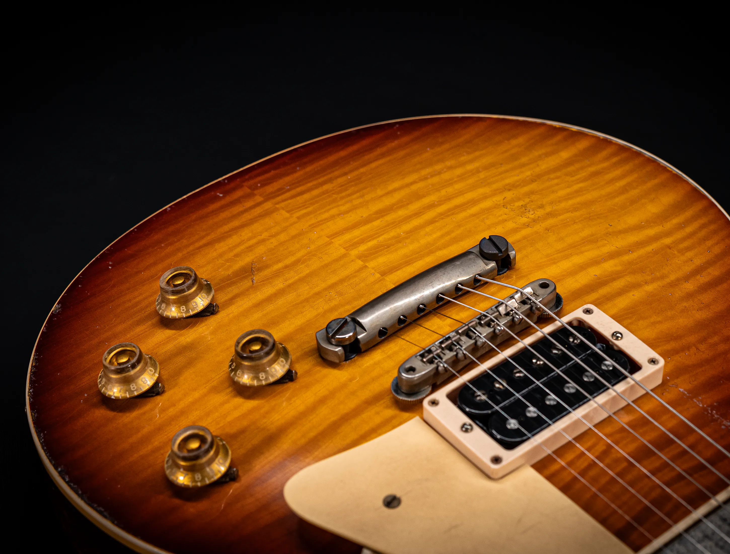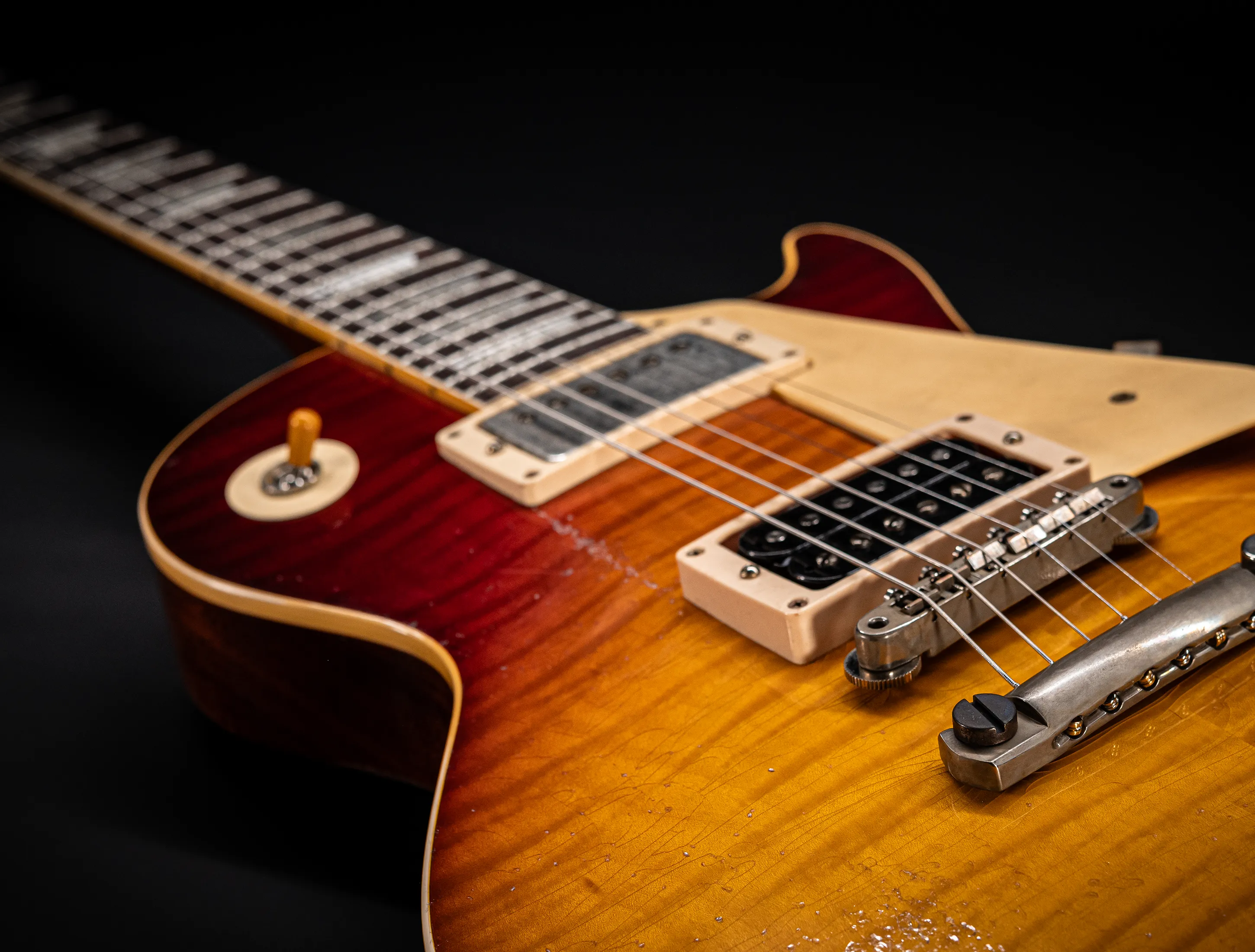 Die Sonderfarbe "Antique Enhance Orange Sunset Fade", die dazu passende, von Jörg Hermann und Tom Murphy handselektierte 59er Flame-Maple Decke sowie die passende Murphy LAB Authentic Heavy Aged Behandlung lassen diese Les Paul zu einem einzigartigen Highlight werden. Und natürlich dürfen hier die passenden Tonabnehmer nicht fehlen, darum wurden für diese Gitarre selbstverständlich die Custombuckers Unpotted "Exposed" PickUps 4-conductor - to Series/Parallel wiring verbaut - was für eine Ansage !!!