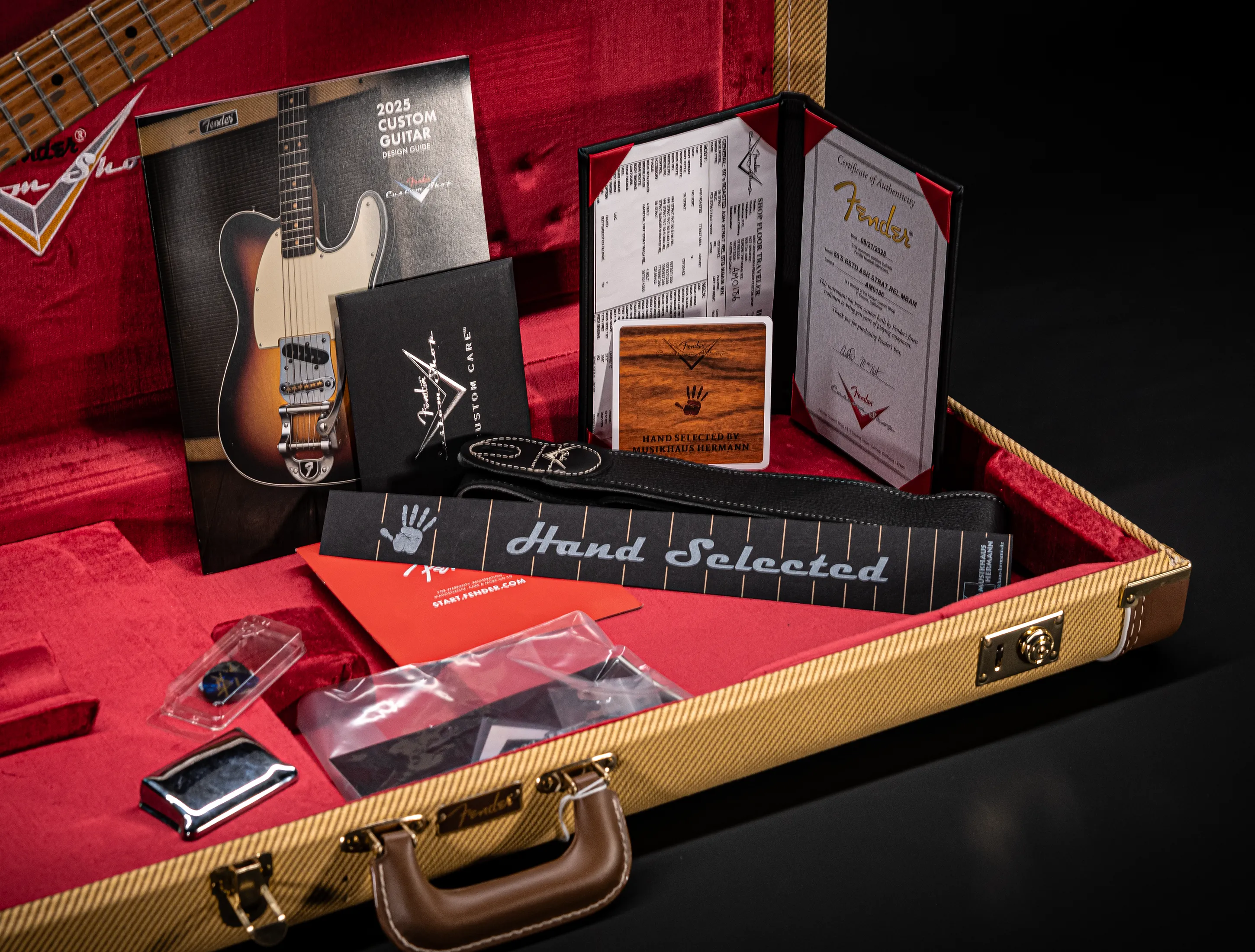 - Zubehör-Kit (Custom-Shop Gitarrengurt, Brückenabdeckung "Ashtray", Pflegehinweise & Plectren)