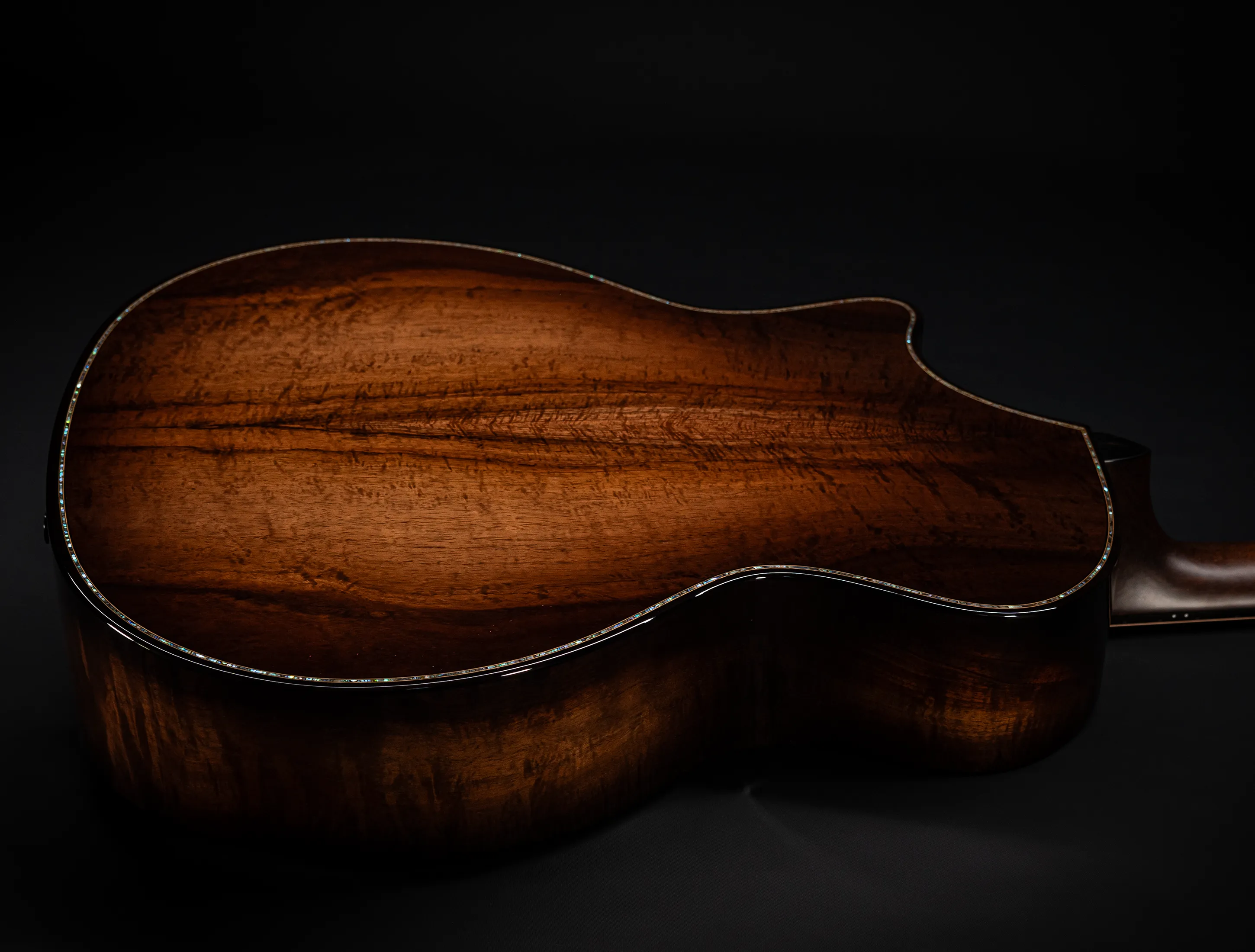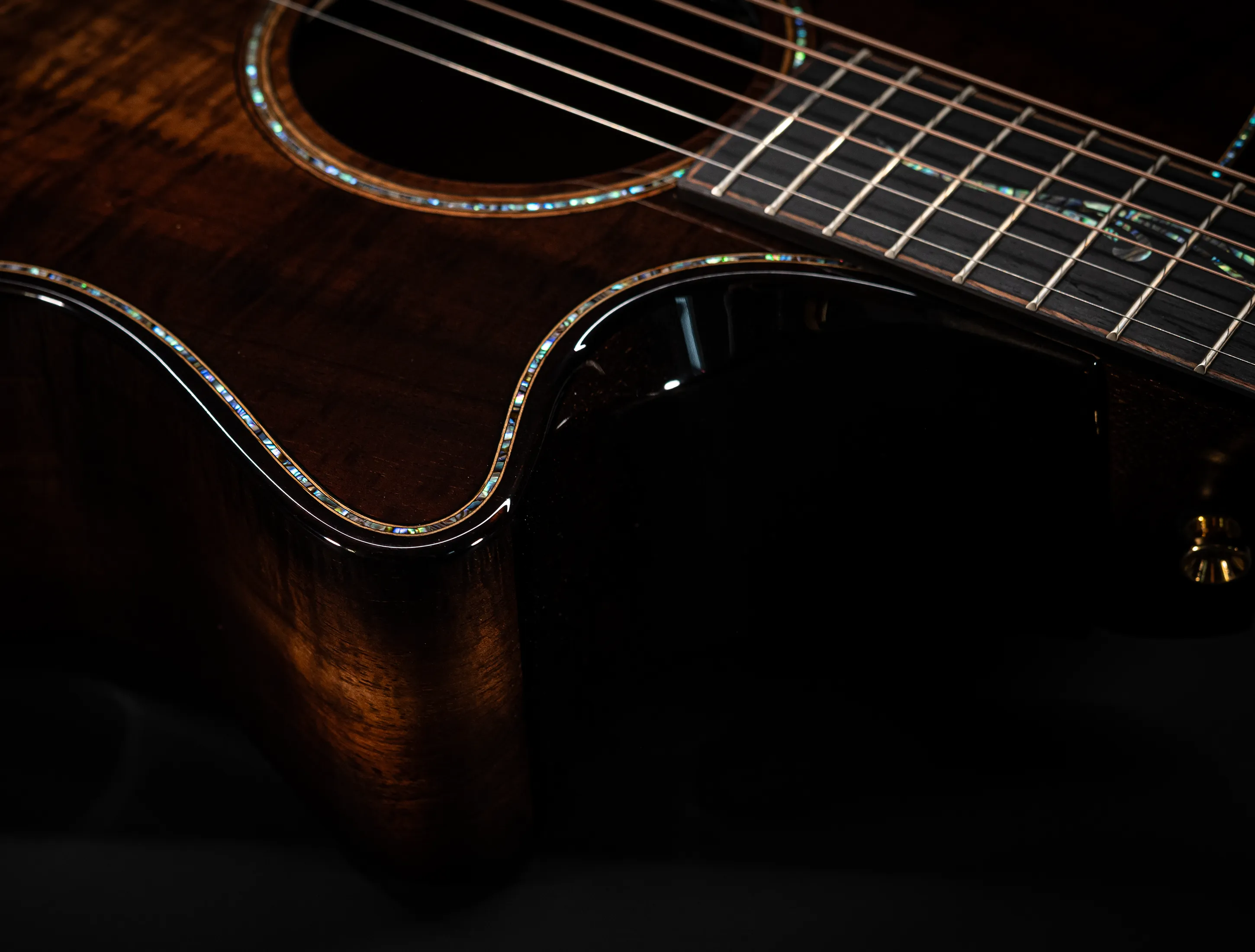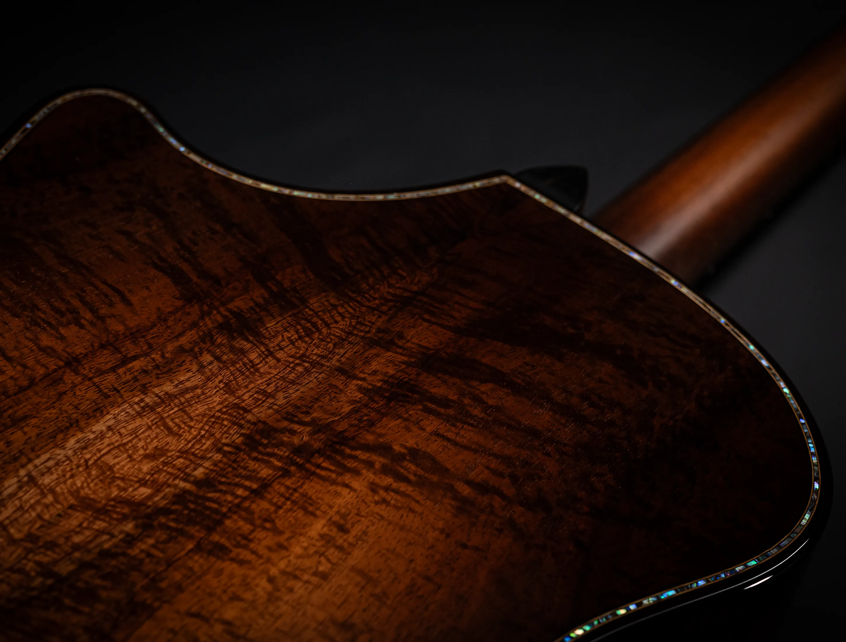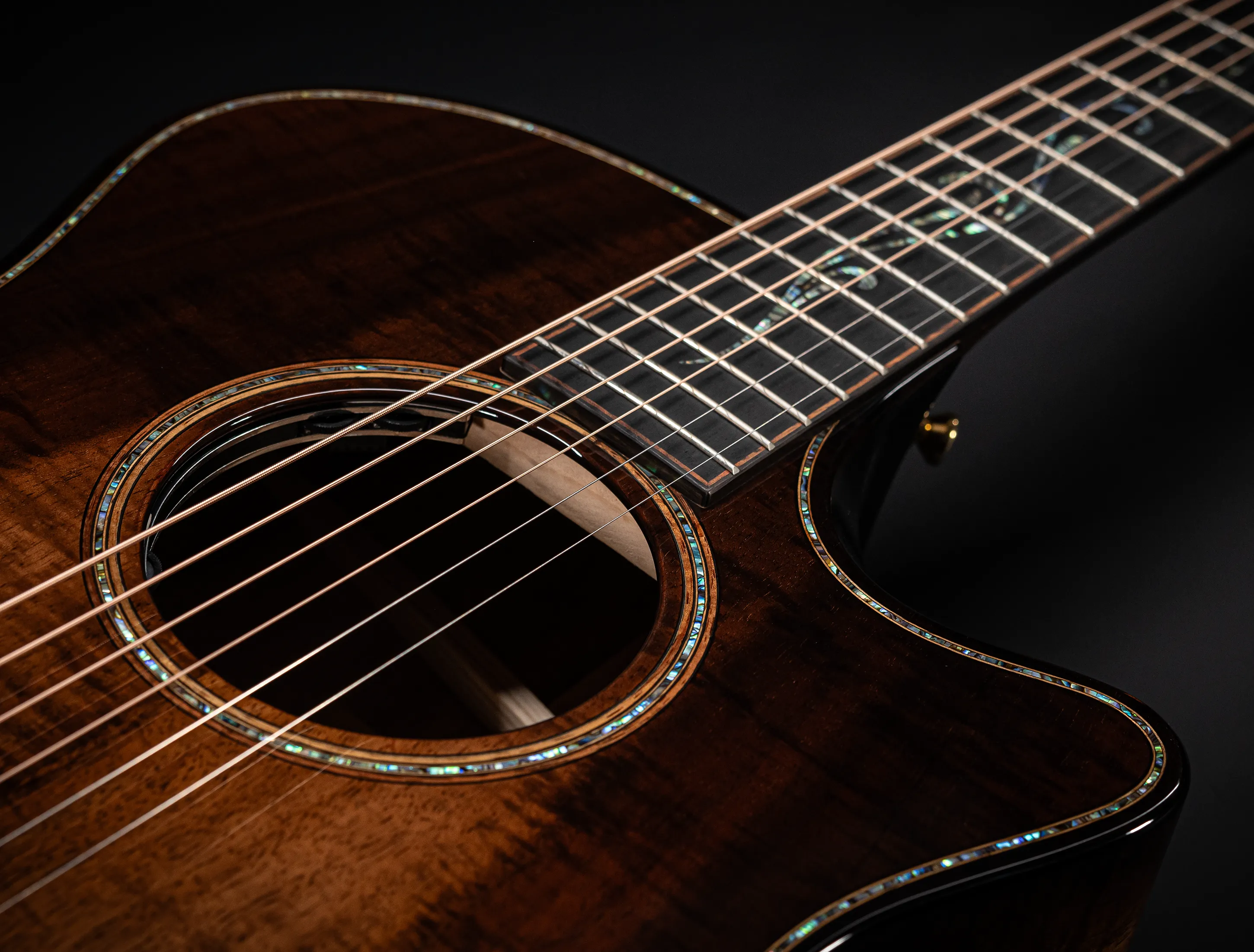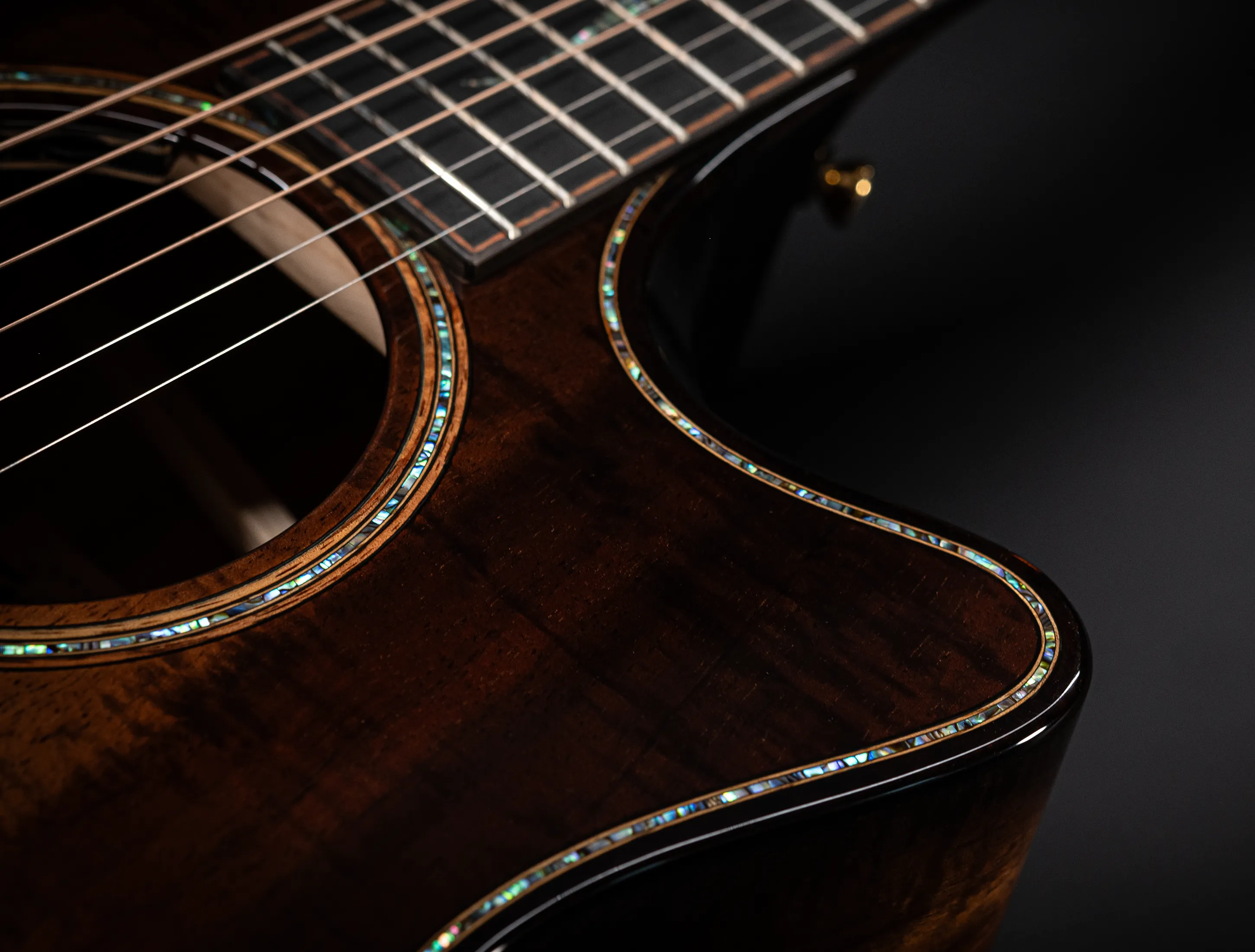 Bereits bei den ersten Blicken über das Instrument sticht sofort die extrem gelungene "optische Ansprache" ins Auge. Hier als erstes der Armrest, welchen Sie nicht mehr missen möchten. Ihr Arm liegt dadurch deutlich ergonomischer auf der Gitarre auf und es ist schlichtweg super angenehm. Lassen Sie dann Ihren Blick weiter schweifen über die Einlagen aus edlem Paua, eingefasst mit dünnen Koa-Streifen, welche perfekt harmonieren und das Instrument optisch "weich und angenehm" machen. Die Koa-Streifen ziehen sich dann weiter über das gesamte Griffbrett und fassen dieses optisch elegant ein - bis hin zur Kopfplatte. Eleganz pur in einem jetzt hochglanz poliertem Finish.