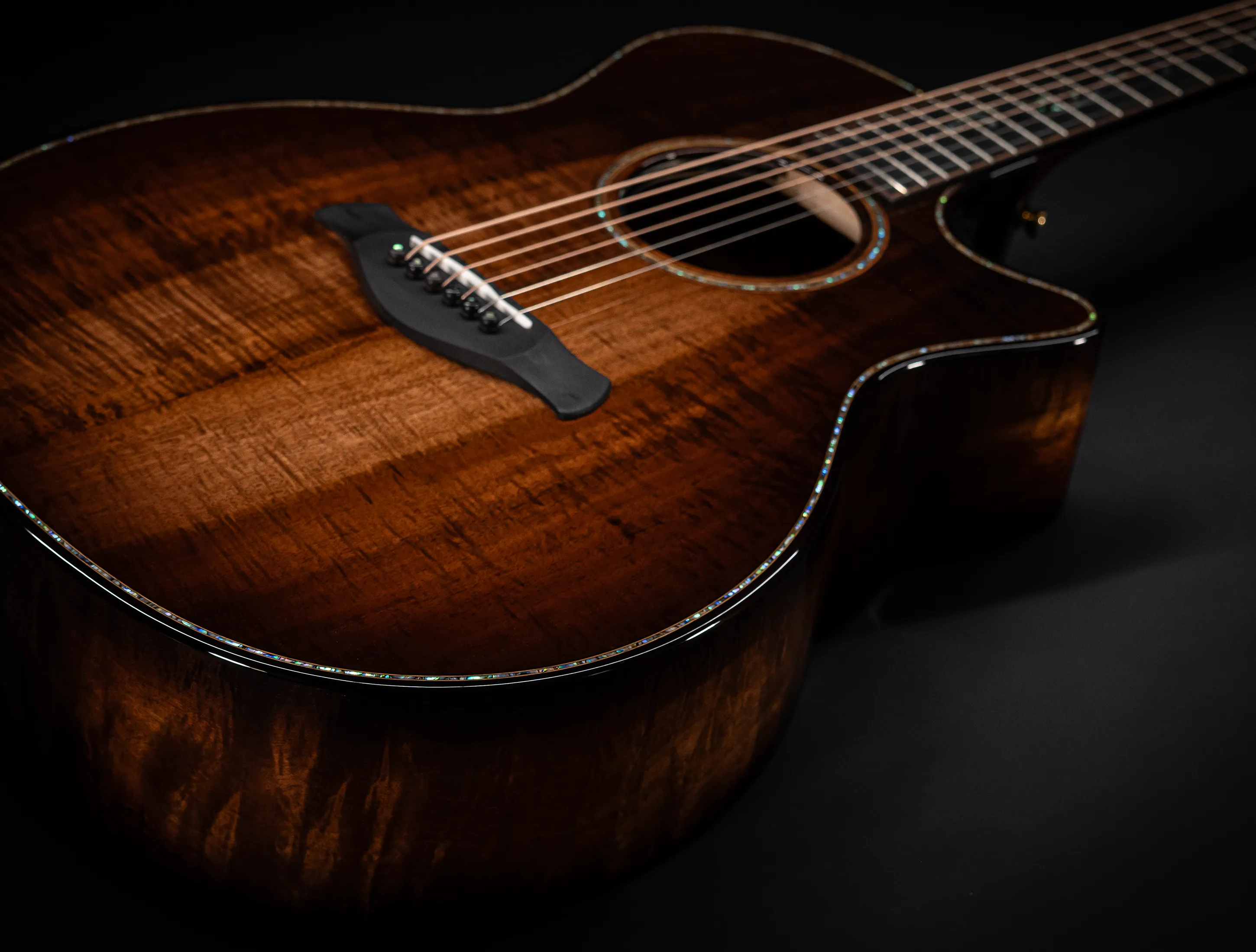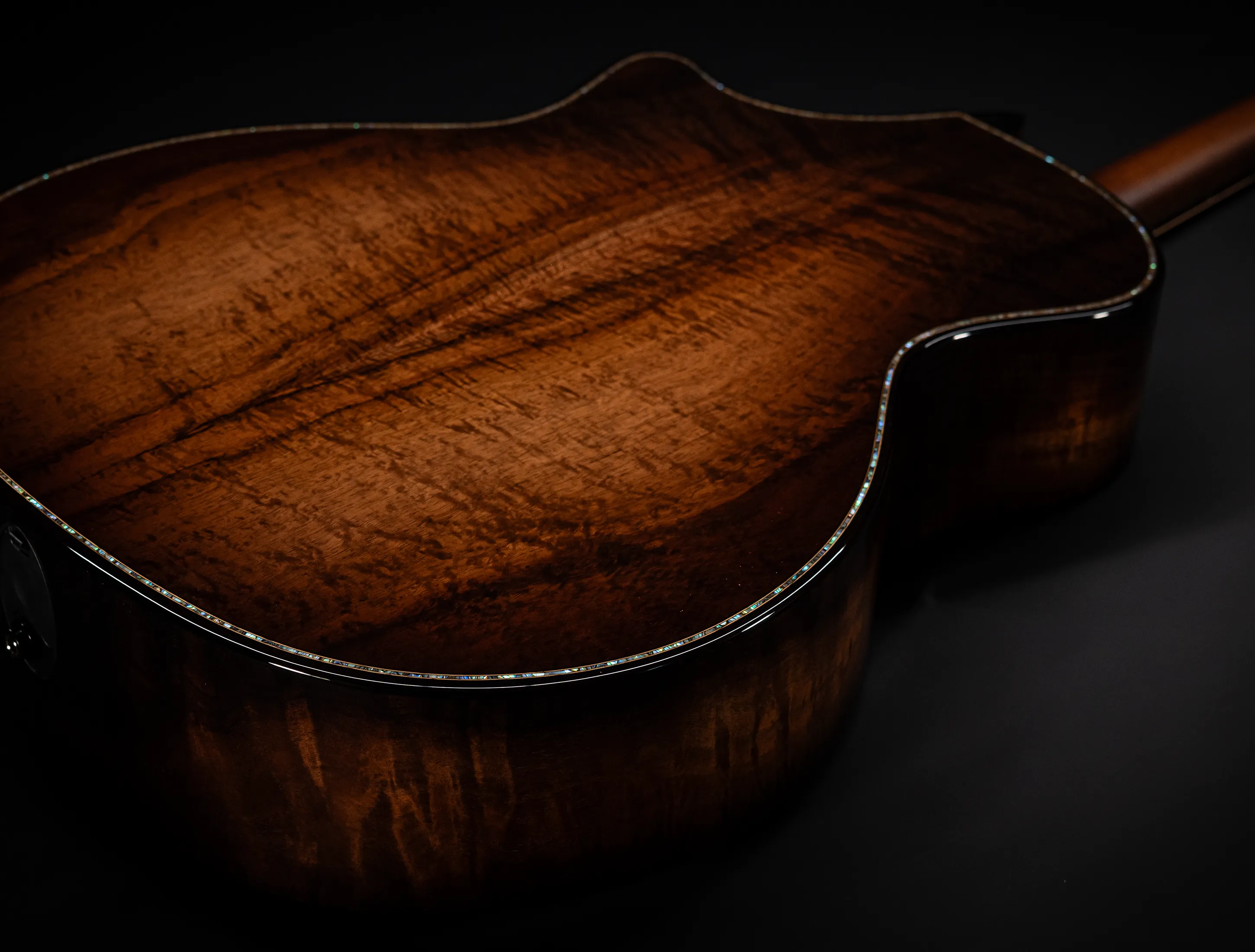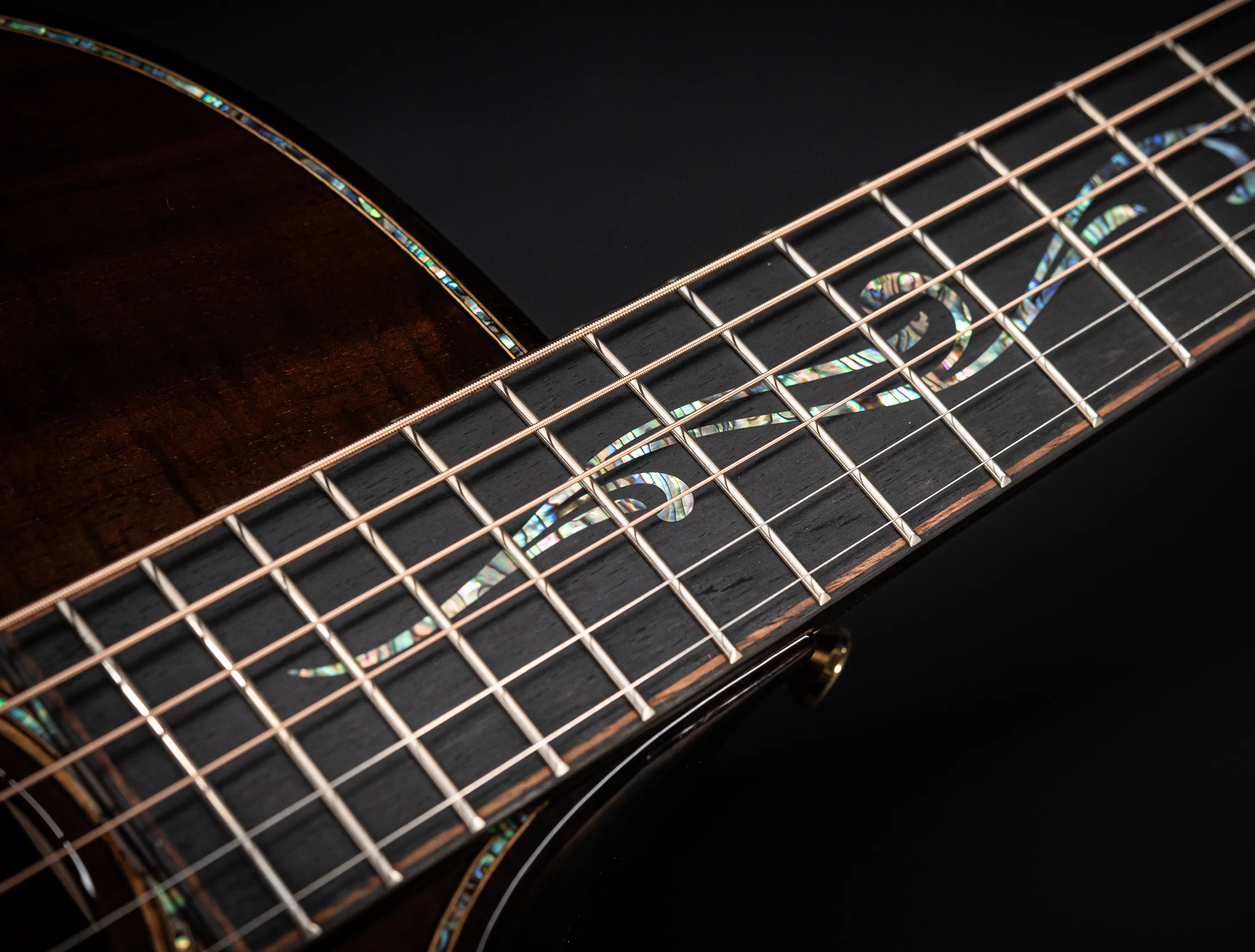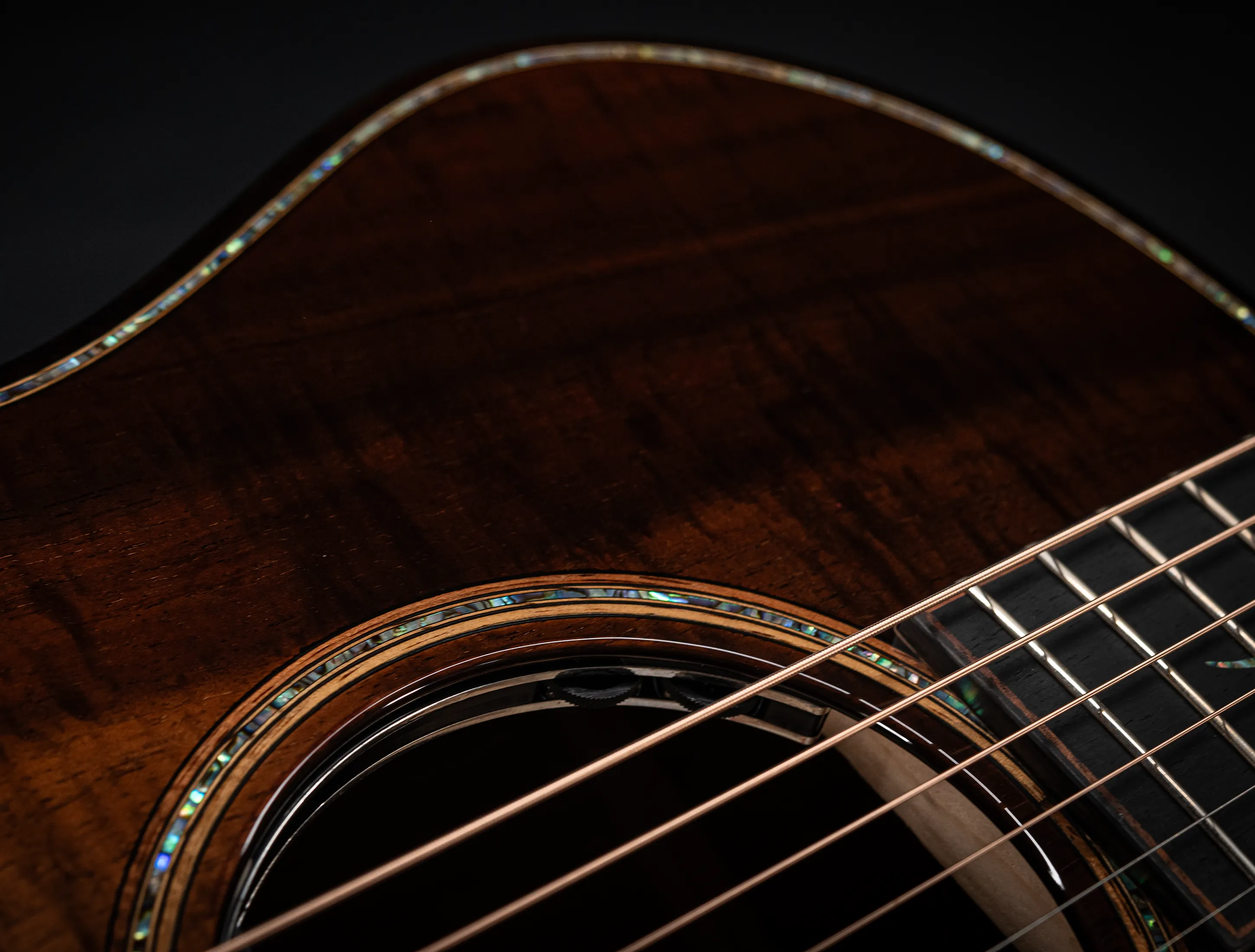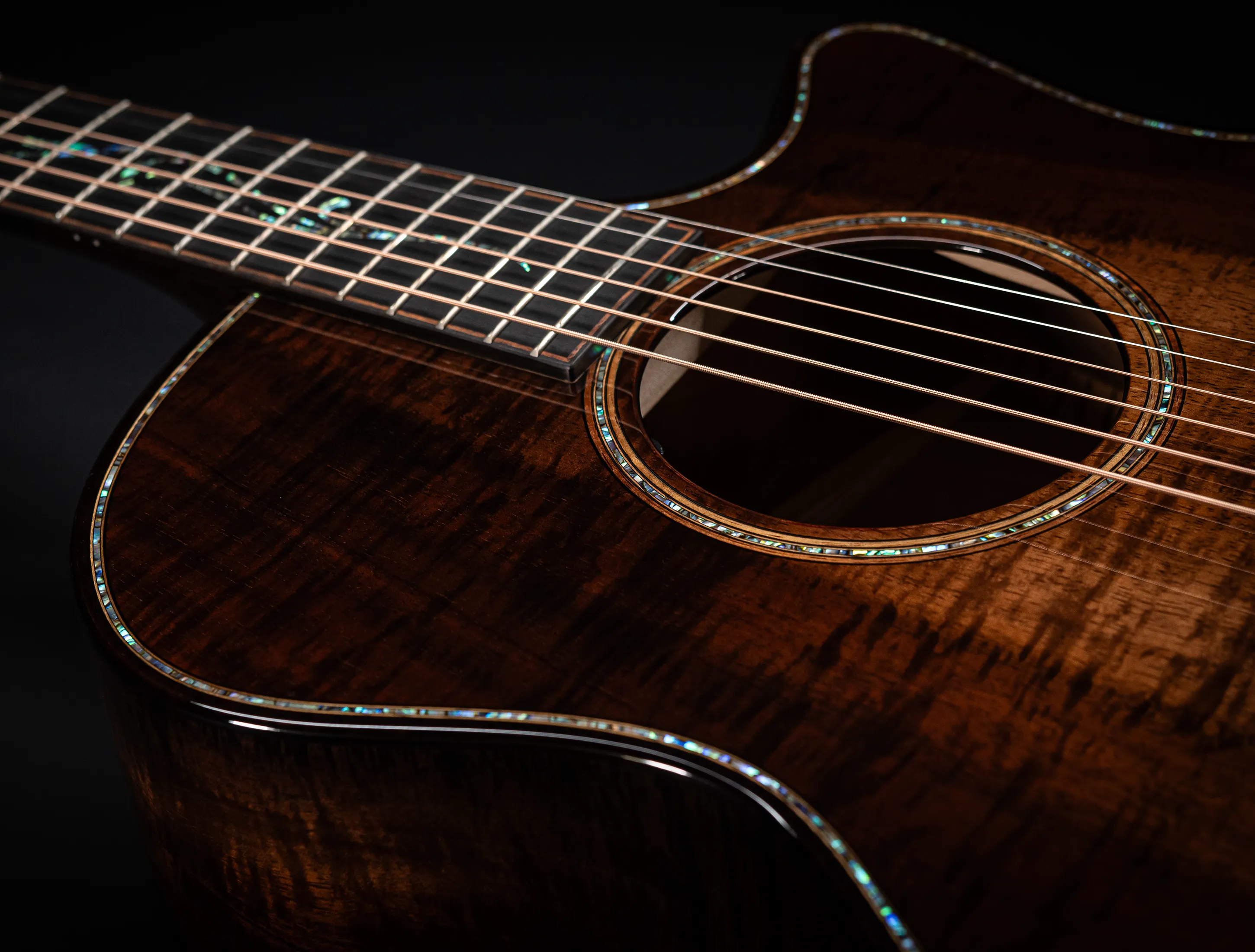Bereits bei den ersten Blicken über das Instrument sticht sofort die extrem gelungene "optische Ansprache" ins Auge. Hier als erstes der Armrest, welchen Sie nicht mehr missen möchten. Ihr Arm liegt dadurch deutlich ergonomischer auf der Gitarre auf und es ist schlichtweg super angenehm. Lassen Sie dann Ihren Blick weiter schweifen über die Einlagen aus edlem Paua, eingefasst mit dünnen Koa-Streifen, welche perfekt harmonieren und das Instrument optisch "weich und angenehm" machen. Die Koa-Streifen ziehen sich dann weiter über das gesamte Griffbrett und fassen dieses optisch elegant ein - bis hin zur Kopfplatte. Eleganz pur in einem jetzt hochglanz poliertem Finish.