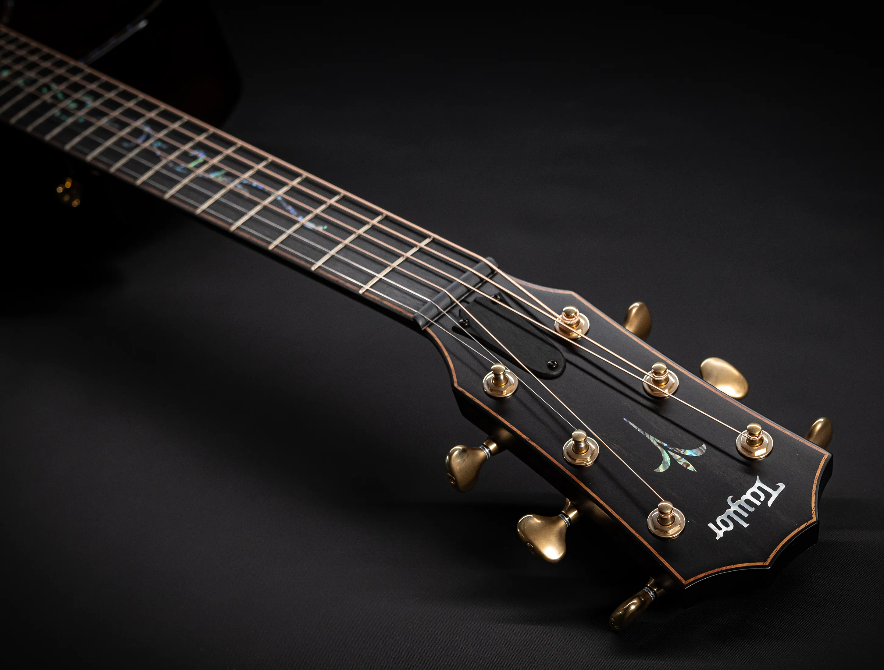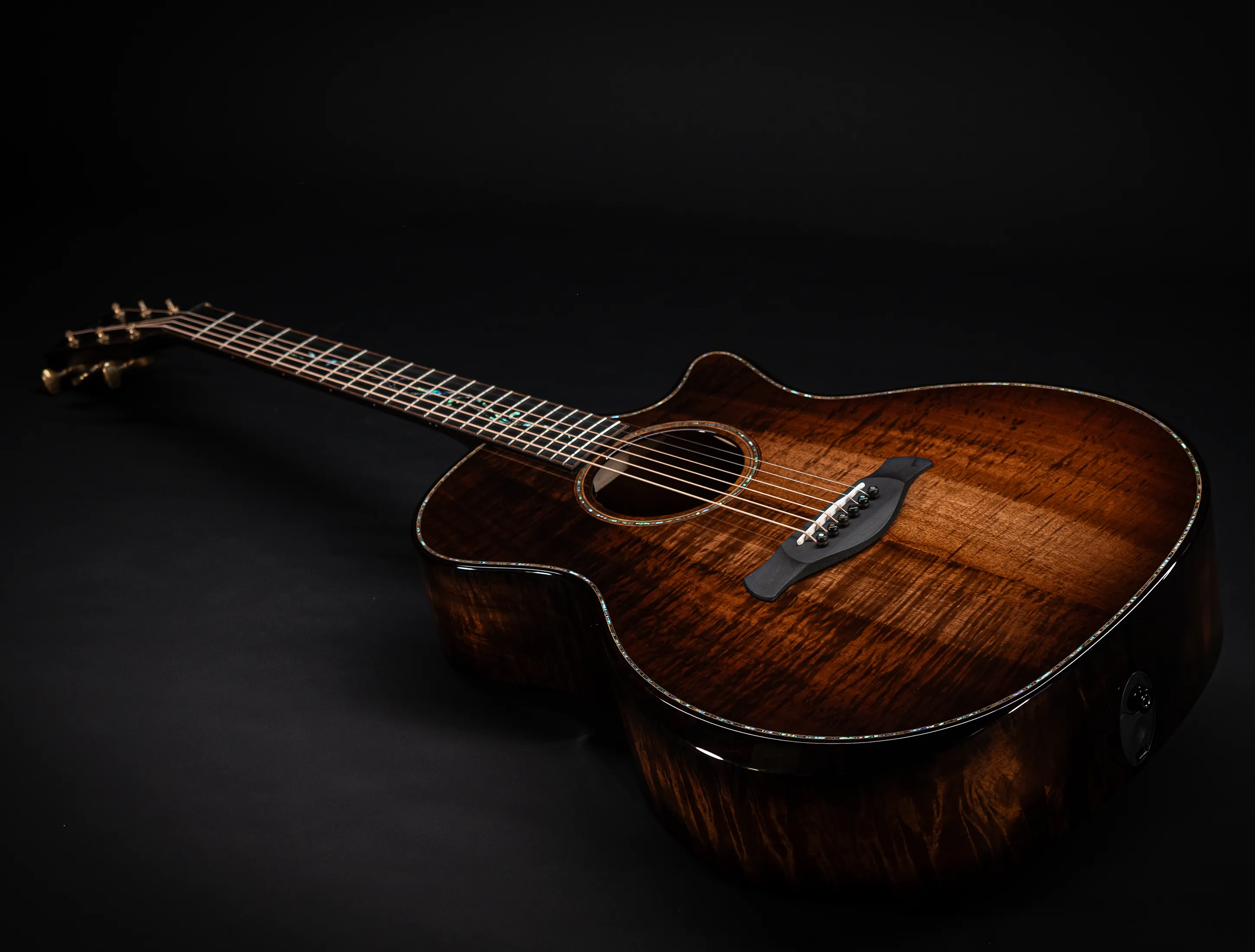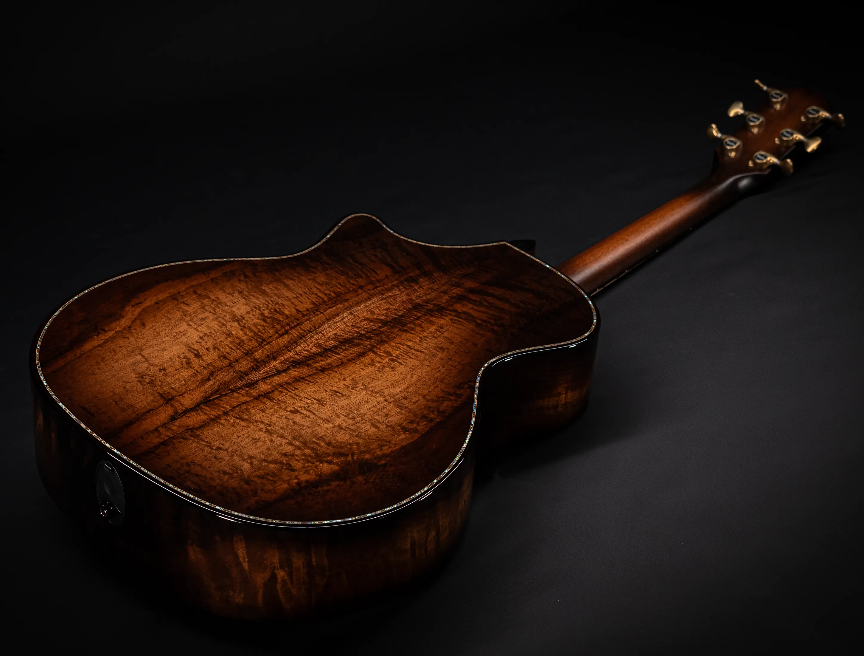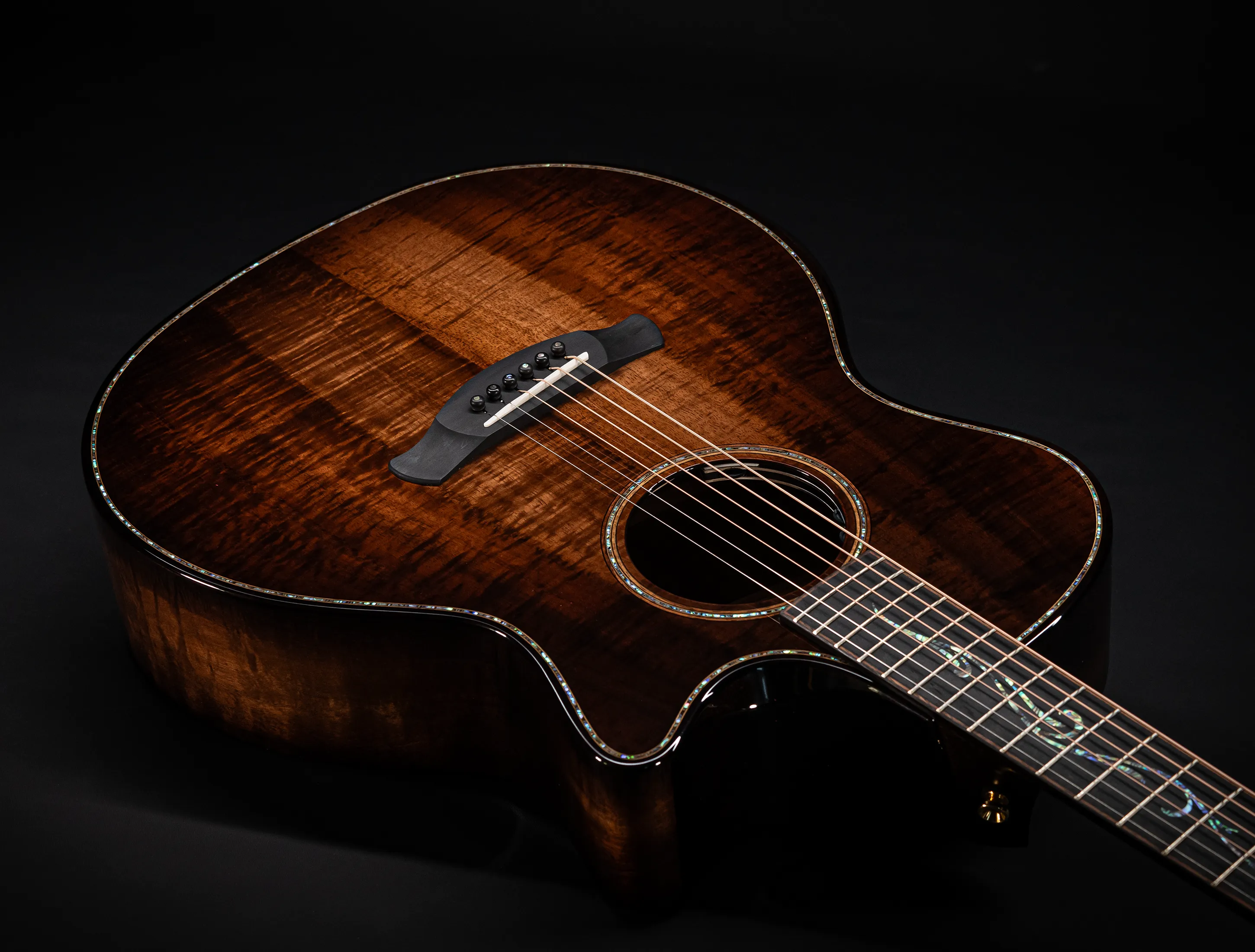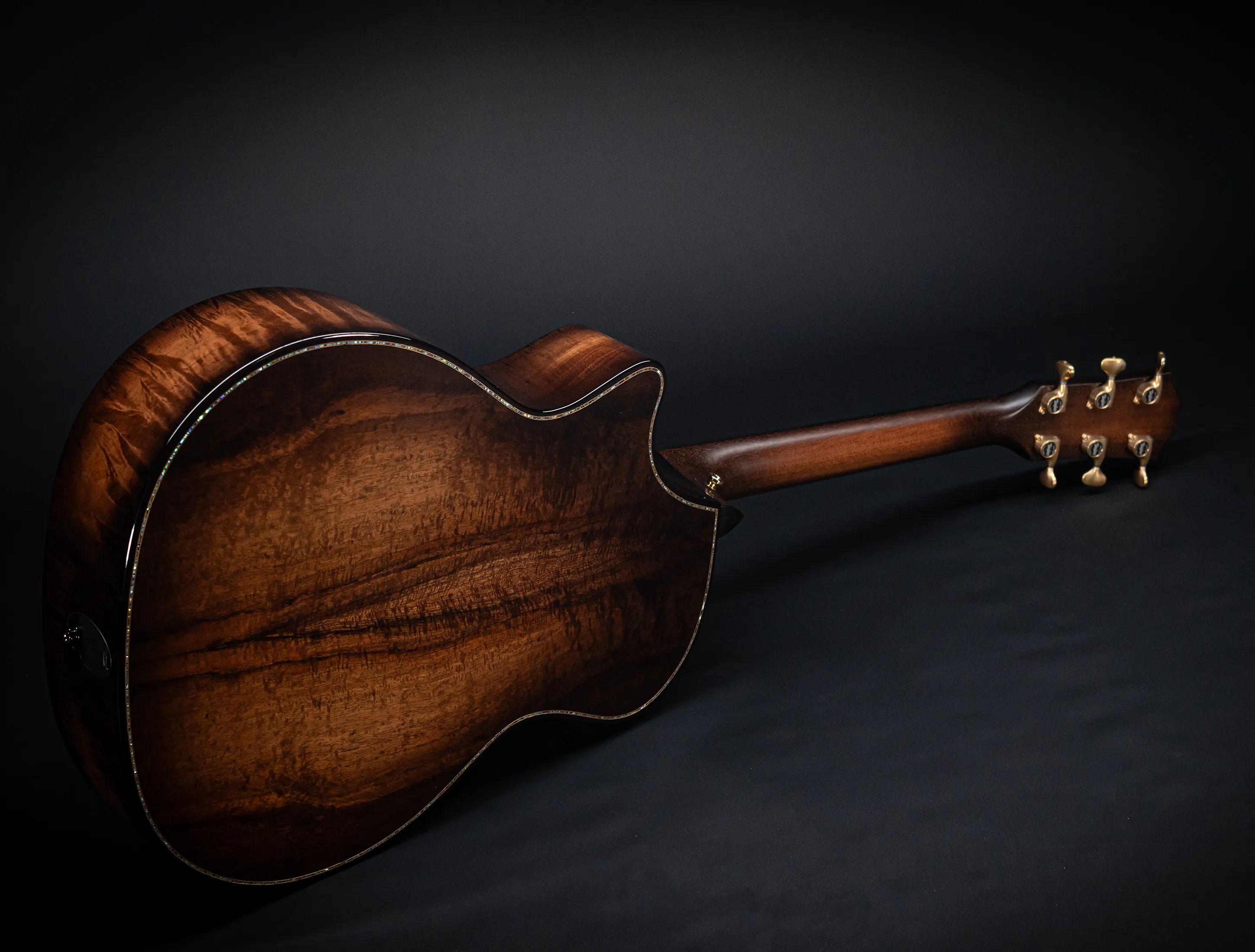 Bereits bei den ersten Blicken über das Instrument sticht sofort die extrem gelungene "optische Ansprache" ins Auge. Hier als erstes der Armrest, welchen Sie nicht mehr missen möchten. Ihr Arm liegt dadurch deutlich ergonomischer auf der Gitarre auf und es ist schlichtweg super angenehm. Lassen Sie dann Ihren Blick weiter schweifen über die Einlagen aus edlem Paua, eingefasst mit dünnen Koa-Streifen, welche perfekt harmonieren und das Instrument optisch "weich und angenehm" machen. Die Koa-Streifen ziehen sich dann weiter über das gesamte Griffbrett und fassen dieses optisch elegant ein - bis hin zur Kopfplatte. Eleganz pur in einem jetzt hochglanz poliertem Finish.