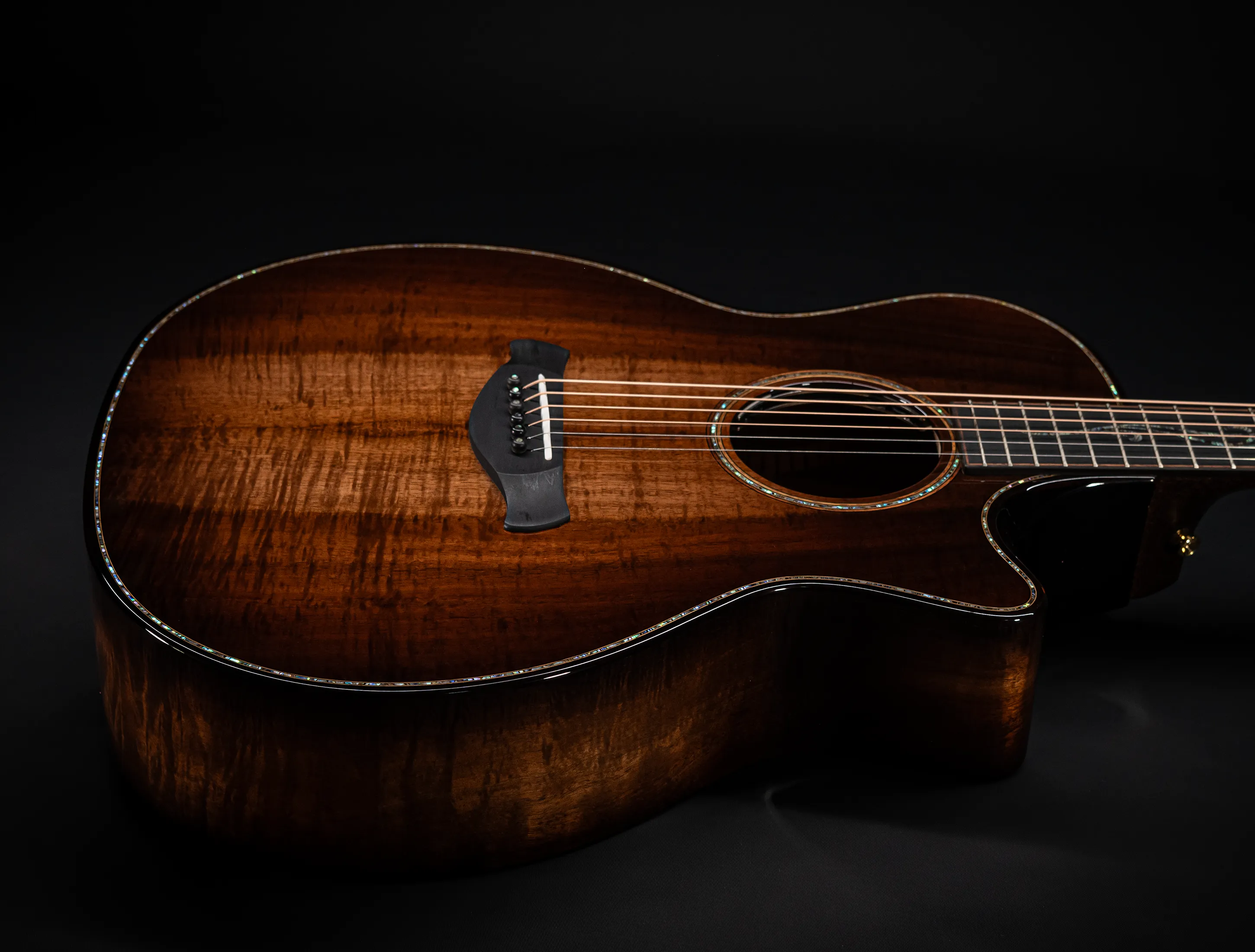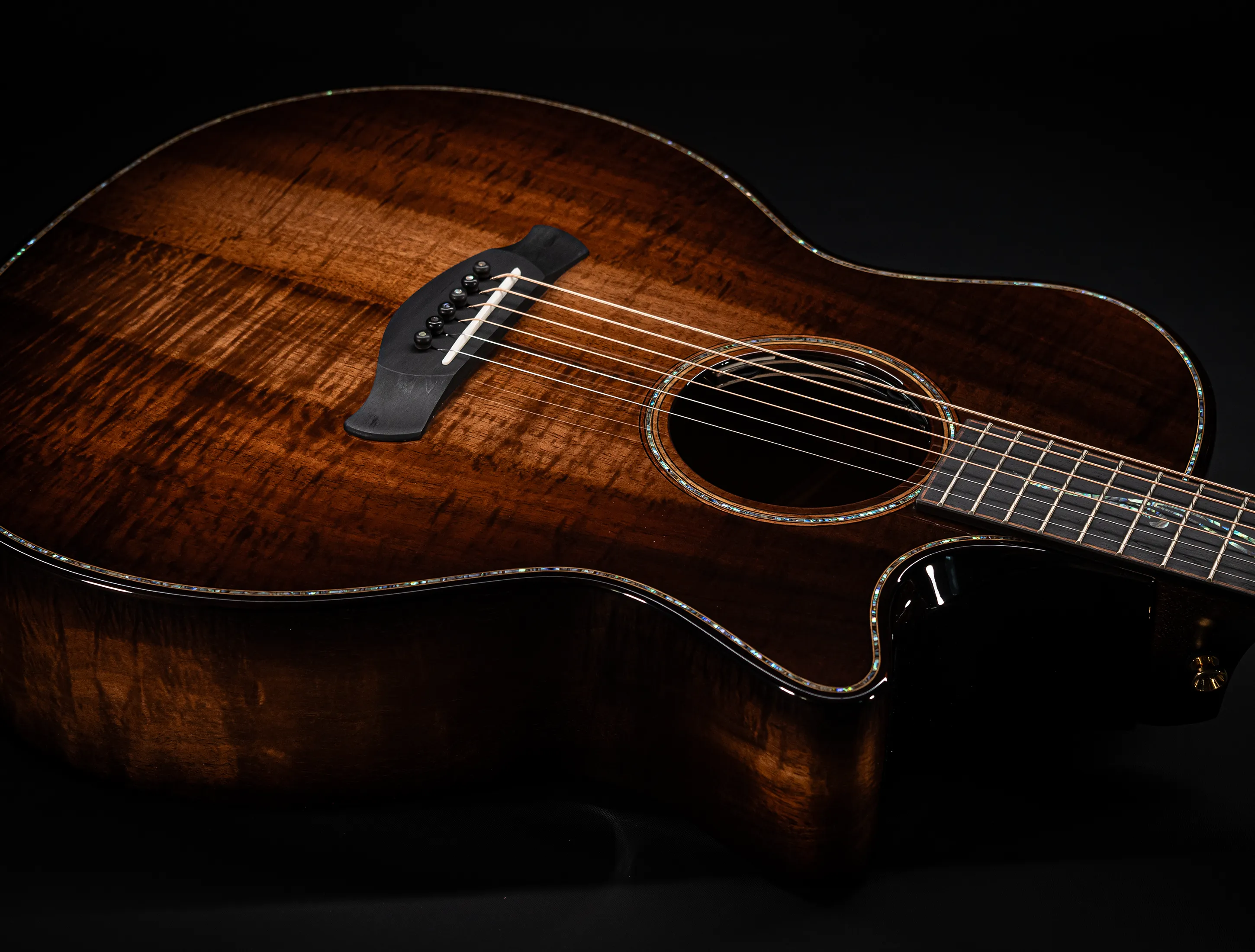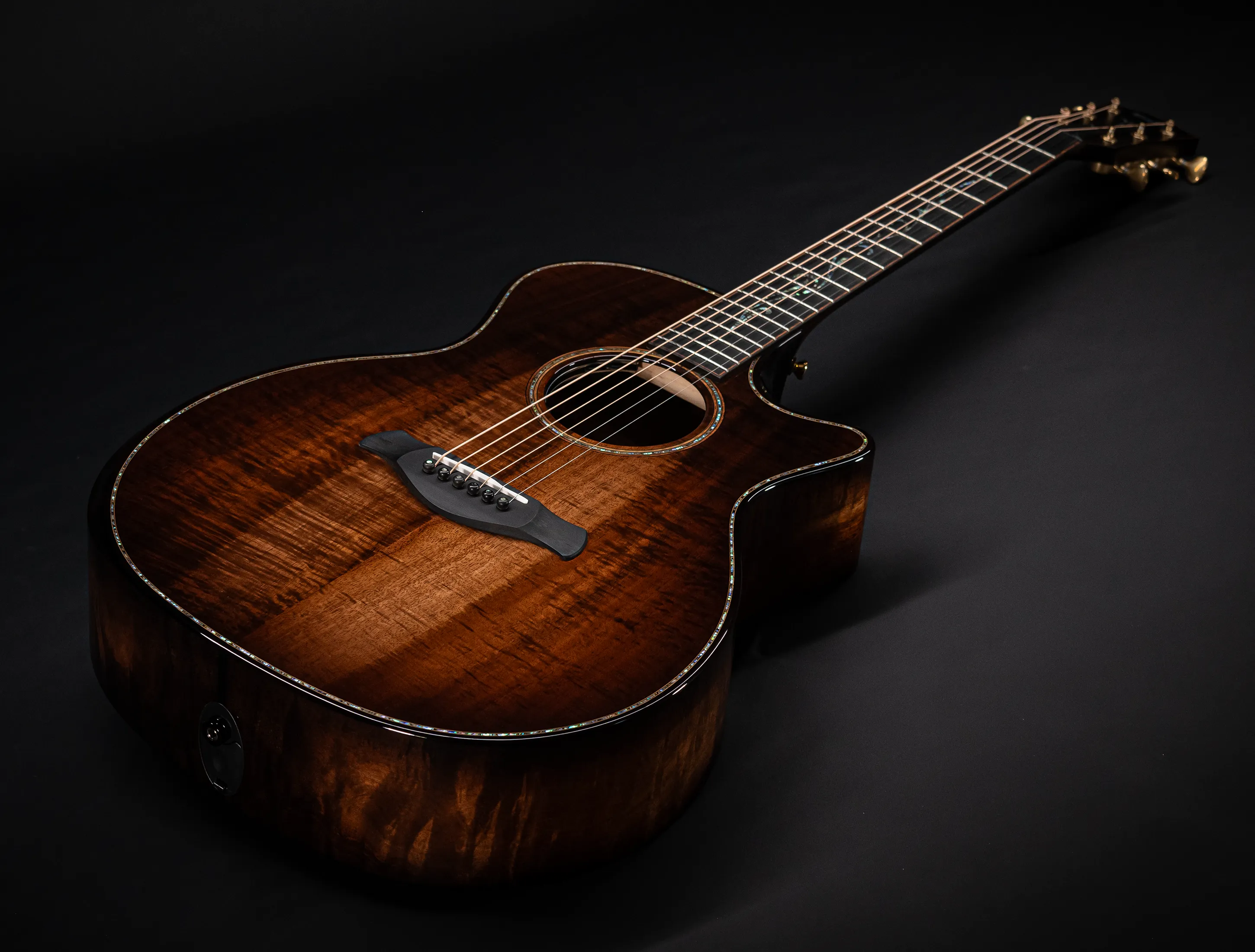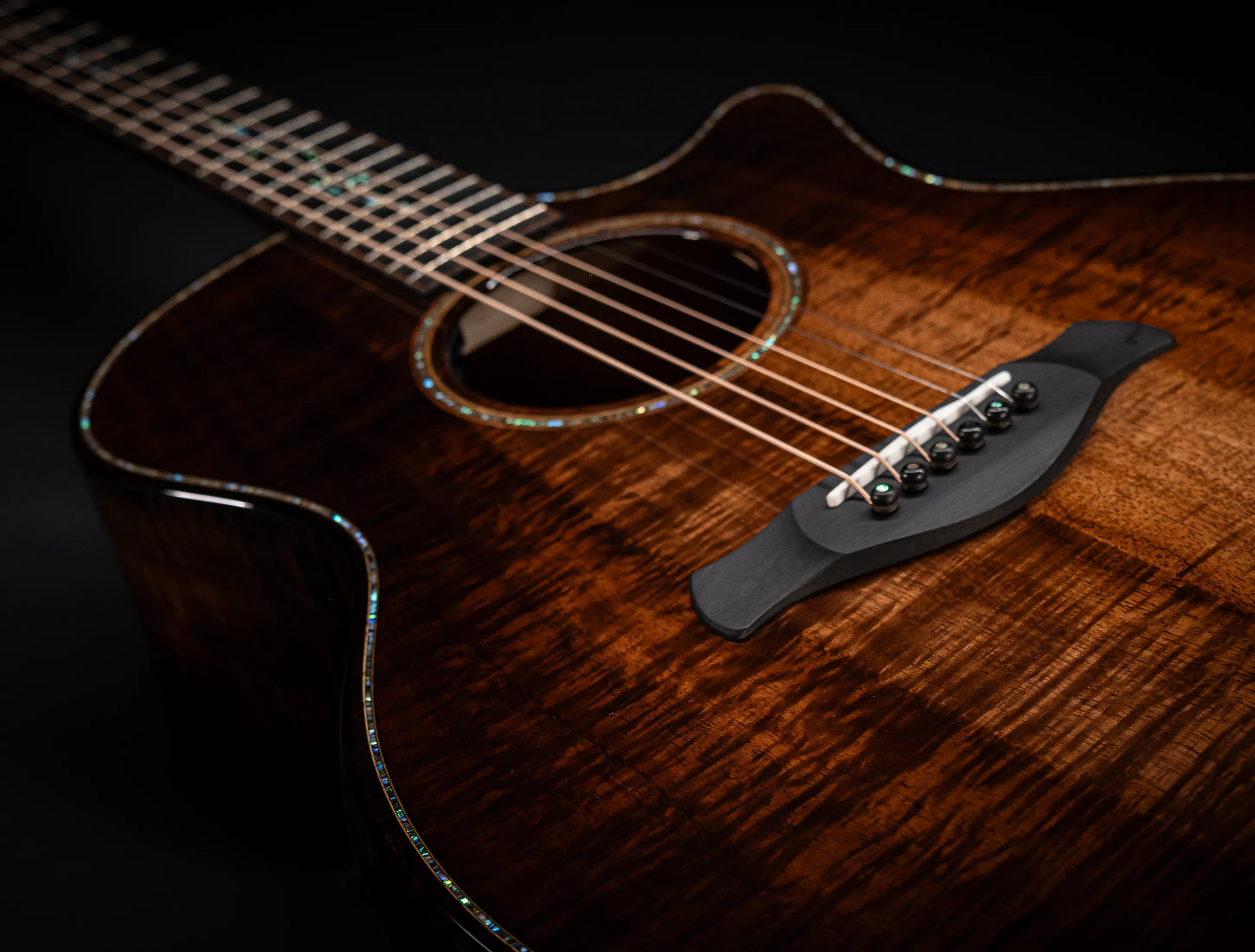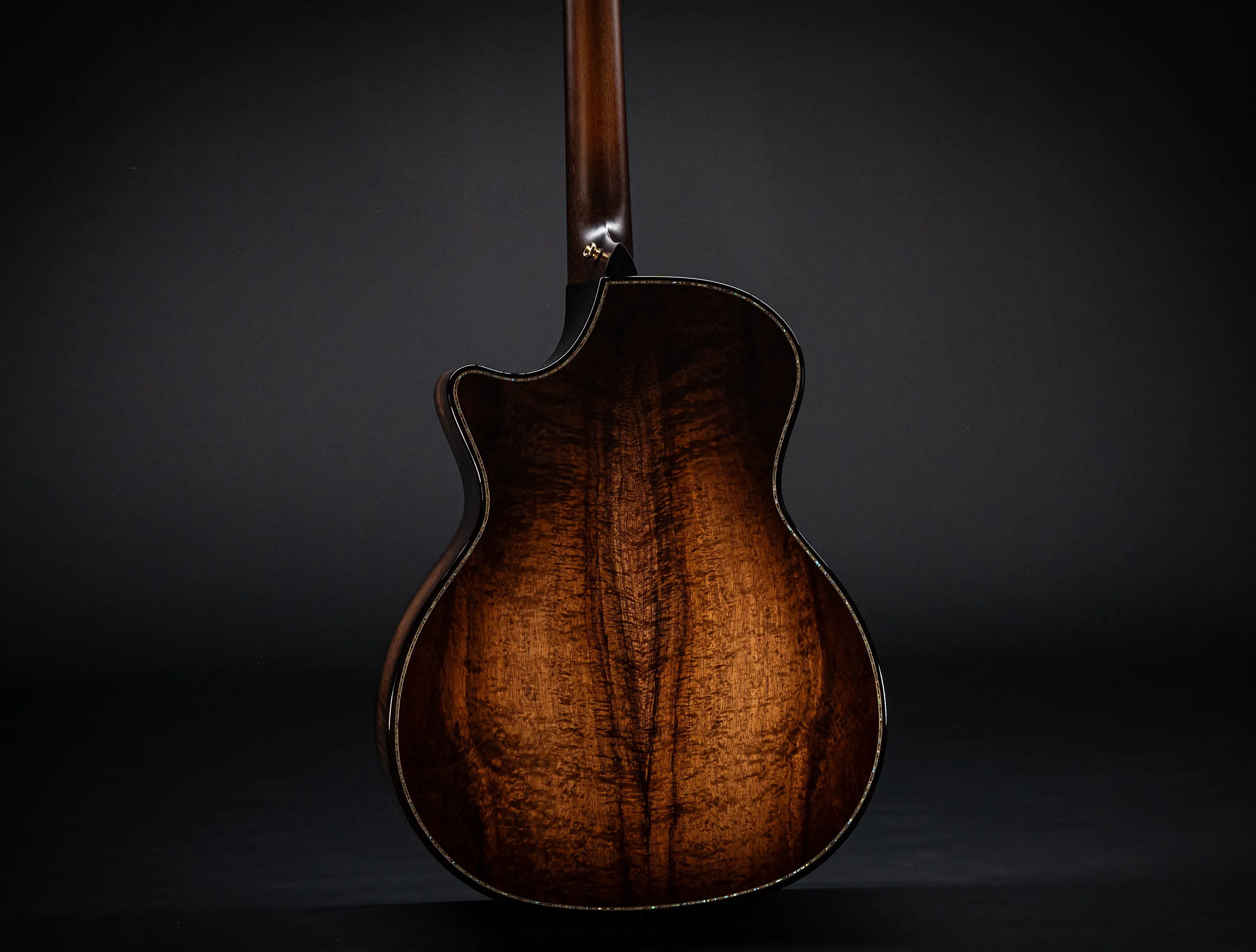 Bereits bei den ersten Blicken über das Instrument sticht sofort die extrem gelungene "optische Ansprache" ins Auge. Hier als erstes der Armrest, welchen Sie nicht mehr missen möchten. Ihr Arm liegt dadurch deutlich ergonomischer auf der Gitarre auf und es ist schlichtweg super angenehm. Lassen Sie dann Ihren Blick weiter schweifen über die Einlagen aus edlem Paua, eingefasst mit dünnen Koa-Streifen, welche perfekt harmonieren und das Instrument optisch "weich und angenehm" machen. Die Koa-Streifen ziehen sich dann weiter über das gesamte Griffbrett und fassen dieses optisch elegant ein - bis hin zur Kopfplatte. Eleganz pur in einem jetzt hochglanz poliertem Finish.