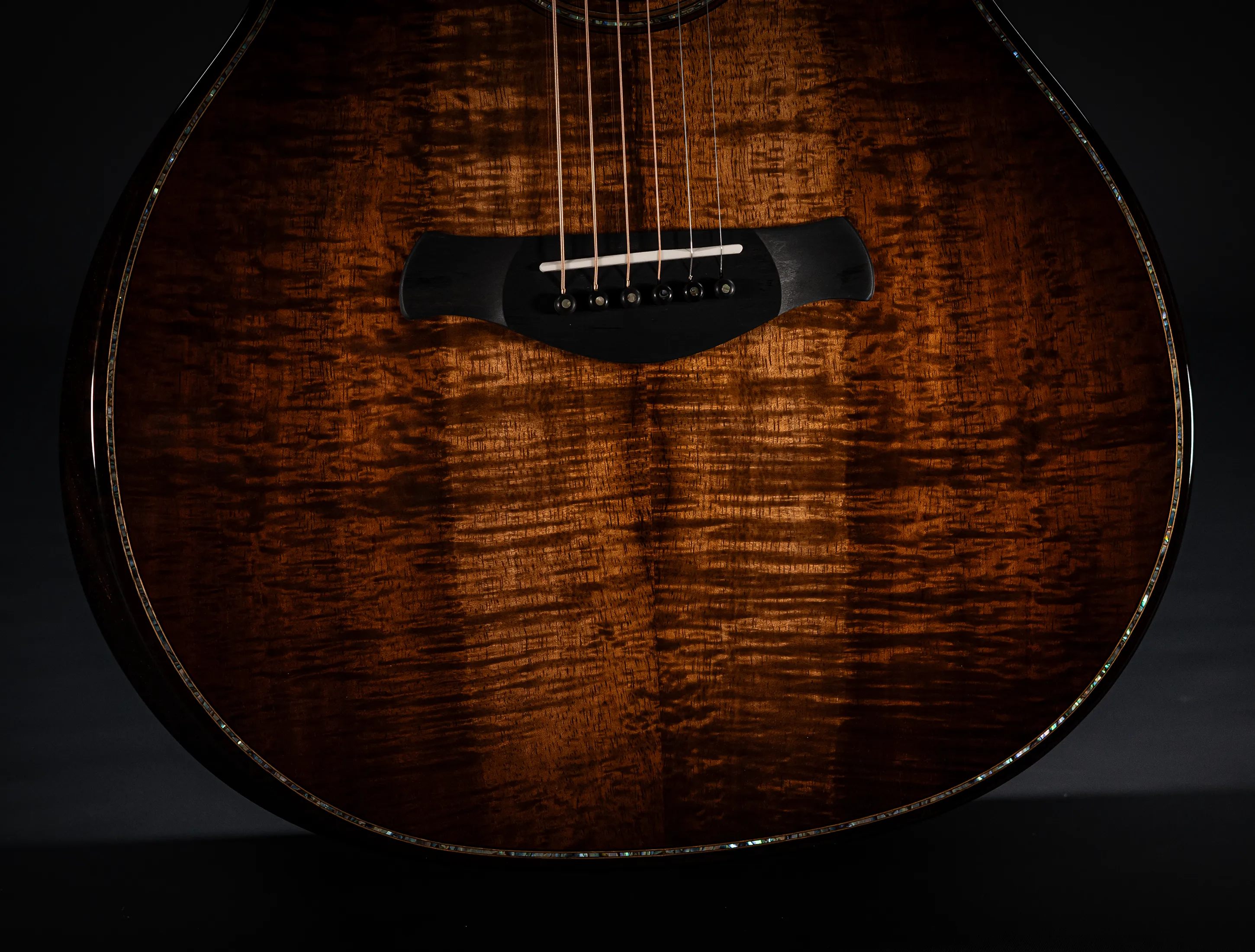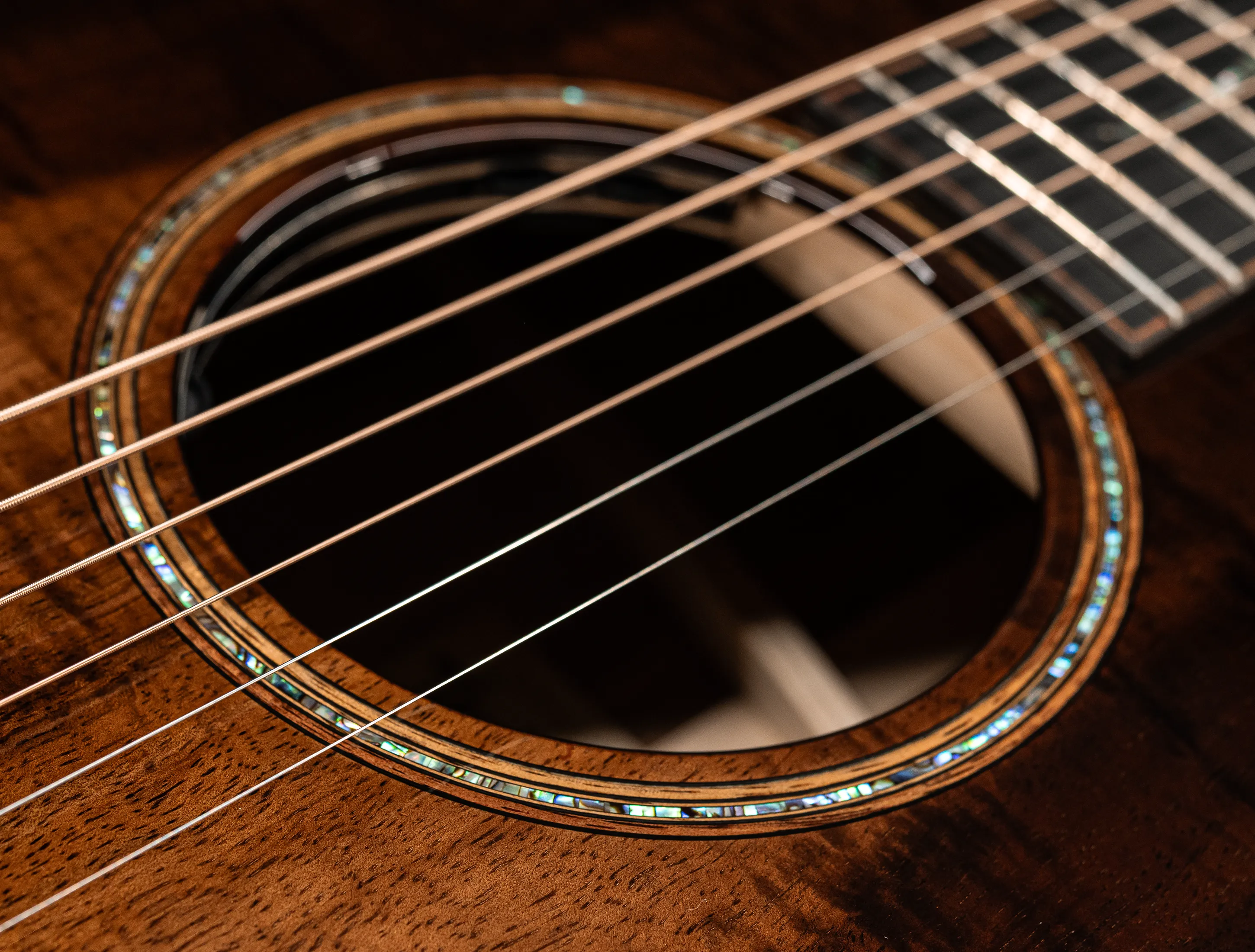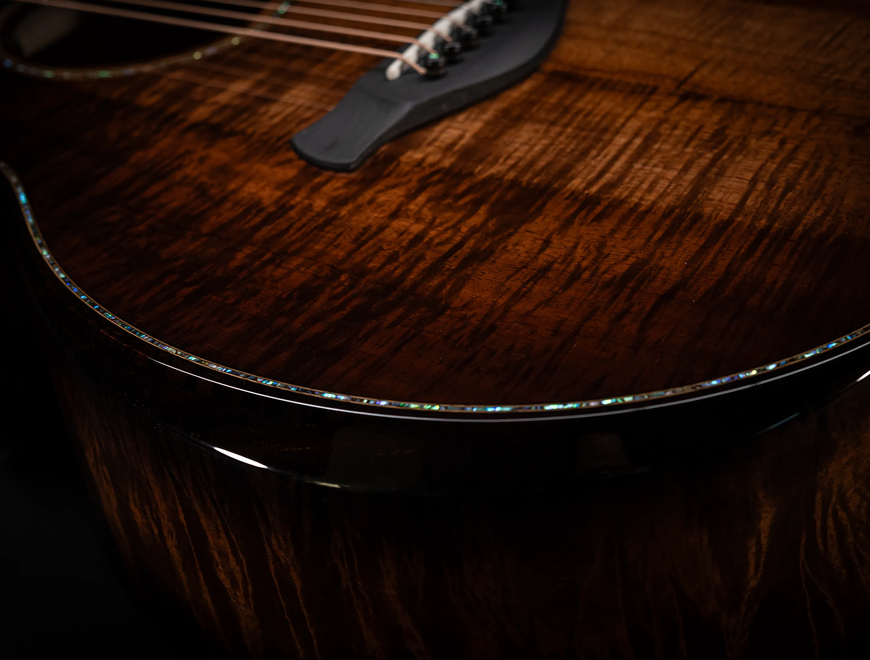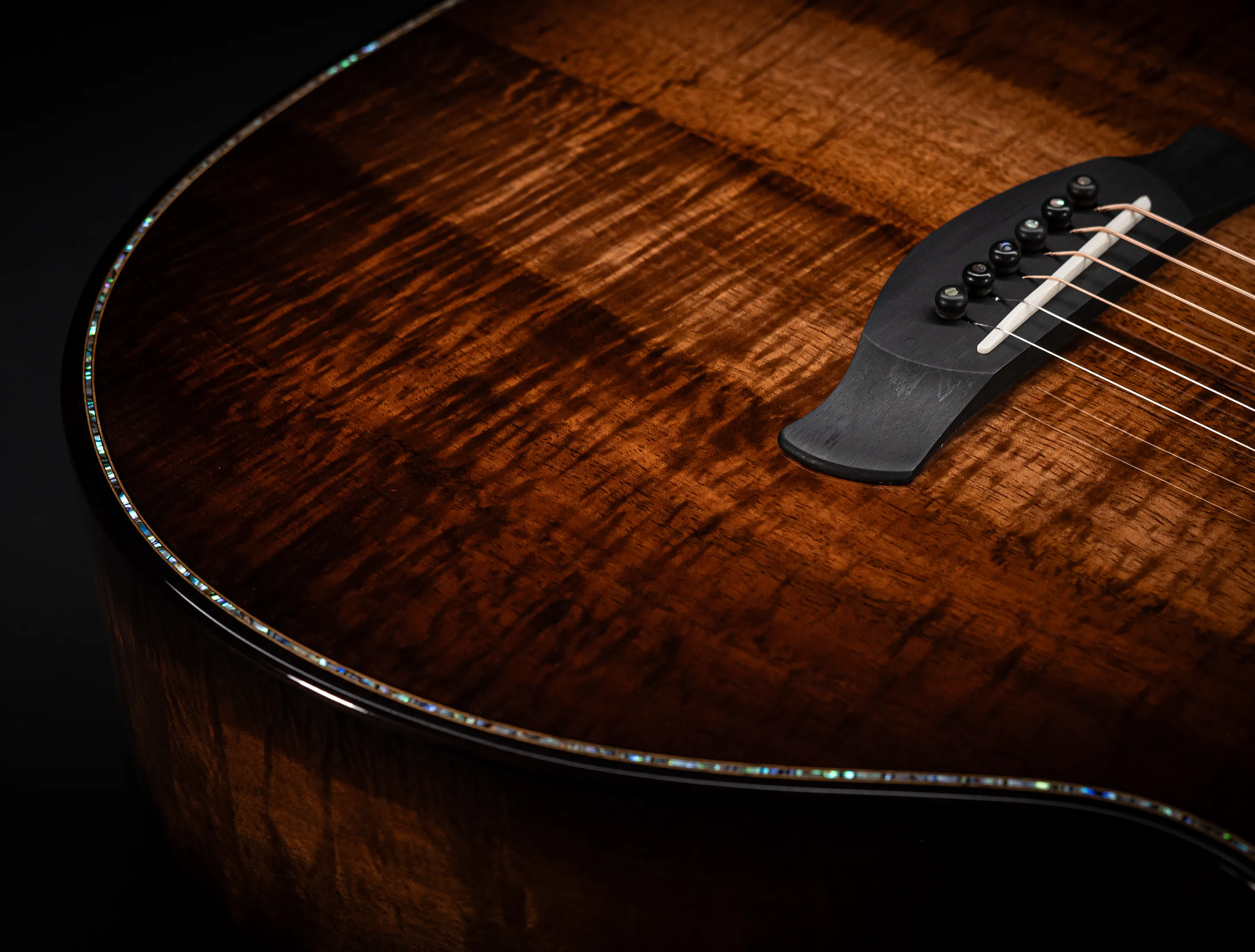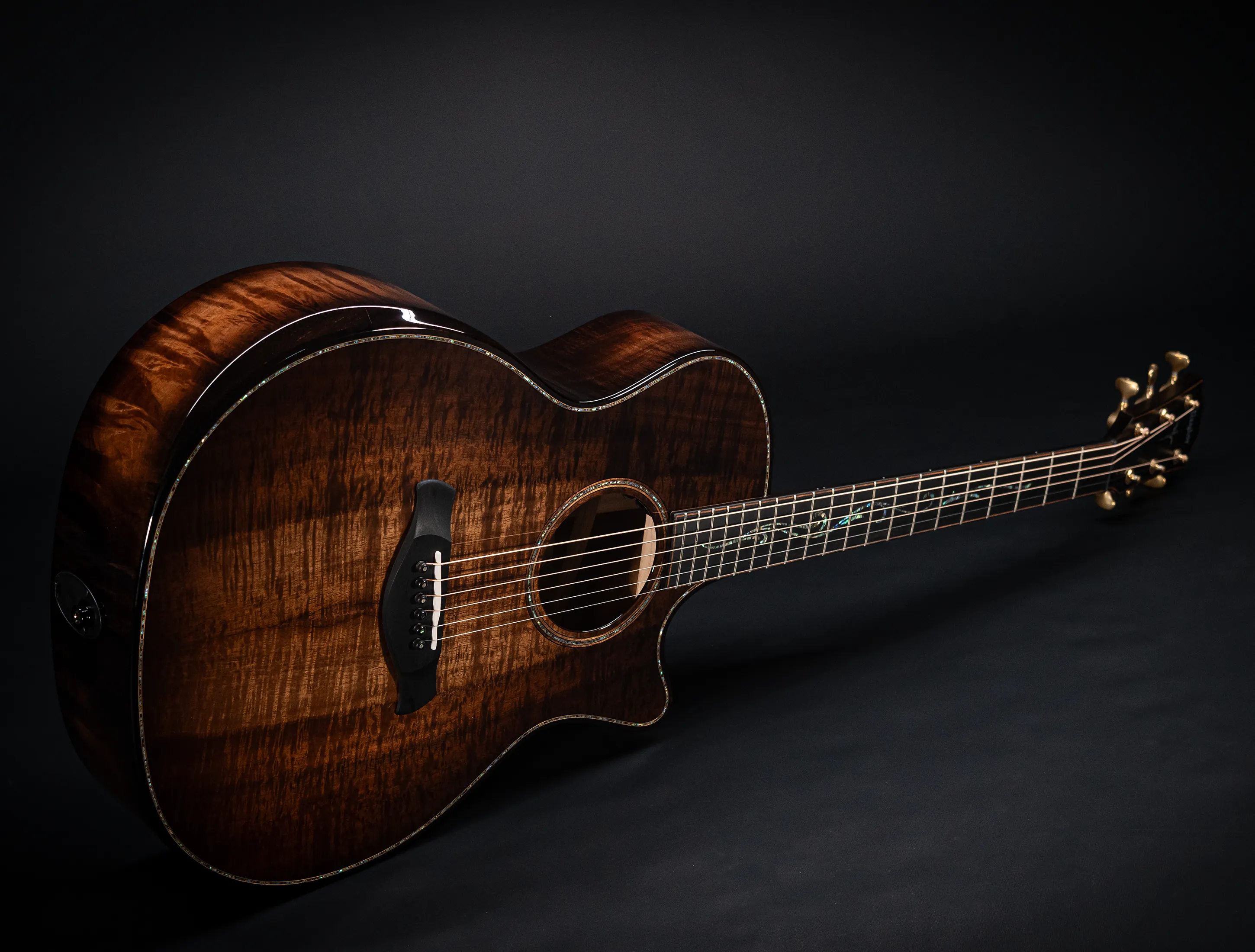 Bereits bei den ersten Blicken über das Instrument sticht sofort die extrem gelungene "optische Ansprache" ins Auge. Hier als erstes der Armrest, welchen Sie nicht mehr missen möchten. Ihr Arm liegt dadurch deutlich ergonomischer auf der Gitarre auf und es ist schlichtweg super angenehm. Lassen Sie dann Ihren Blick weiter schweifen über die Einlagen aus edlem Paua, eingefasst mit dünnen Koa-Streifen, welche perfekt harmonieren und das Instrument optisch "weich und angenehm" machen. Die Koa-Streifen ziehen sich dann weiter über das gesamte Griffbrett und fassen dieses optisch elegant ein - bis hin zur Kopfplatte. Eleganz pur in einem jetzt hochglanz poliertem Finish.