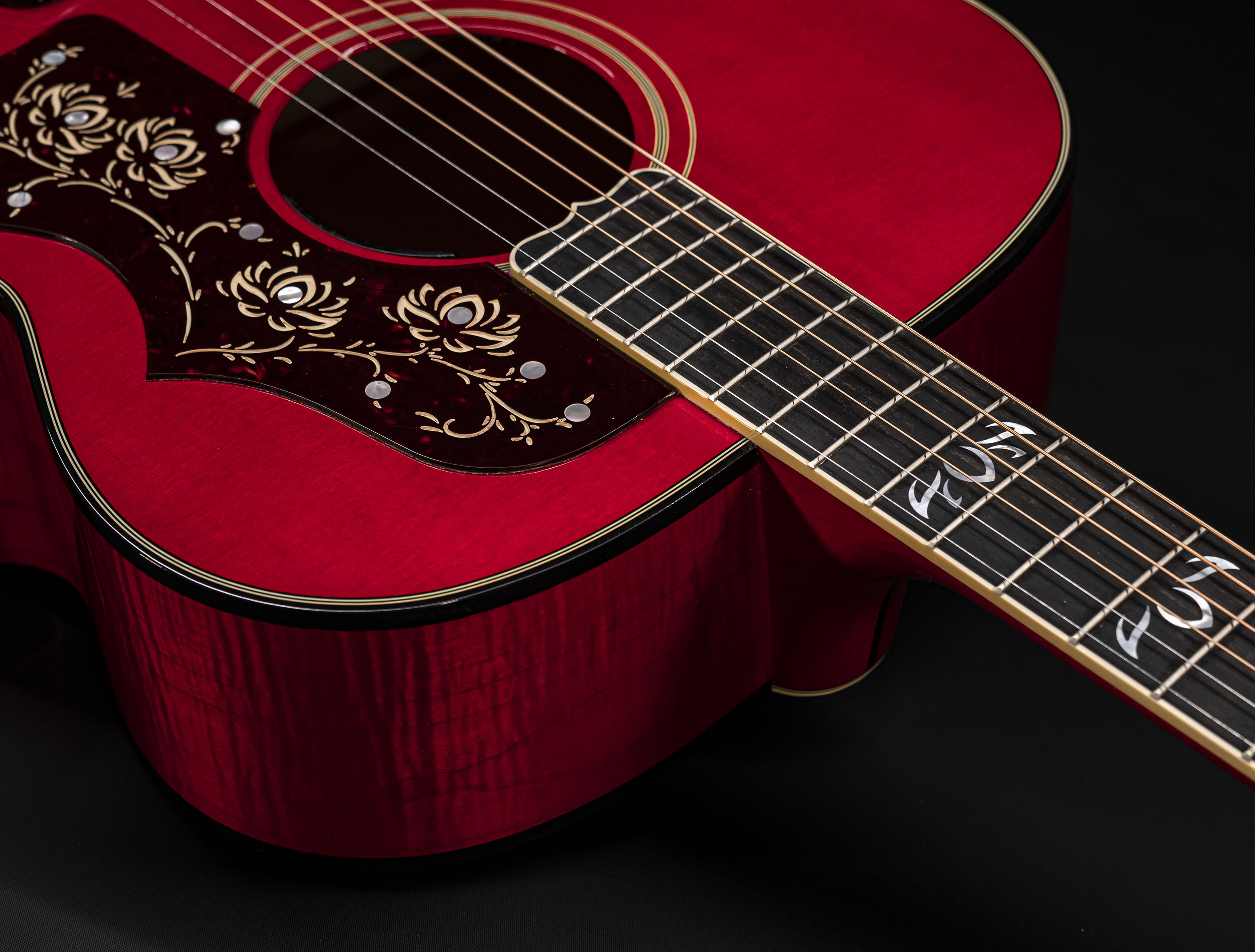 Mit einem SJ-200-Korpus, einer selektierten AAA-Sitka-Fichtendecke und einem edlen extra geflammten Ahornboden gepaart als Highlight mit einem ES-345-Hals ist sie definitiv ein bisschen anders als eine Standard-SJ-200. Zu den weiteren persönlichen Orianthi Details gehören ein Ebenholzgriffbrett mit Lotushals-Inlays und ein perlmuttfarbenes Orianthi O-Symbol auf der Kopfplatte, goldene Grover Keystone-Mechaniken, eine unverwechselbare Cherry-Nitro-Lackierung und ein LR Baggs Orianthi-Pickup-System, das speziell abgestimmt wurde für Orianthi. Es verfügt über einstellbare Sättigung und am Schallloch montierte Regler.