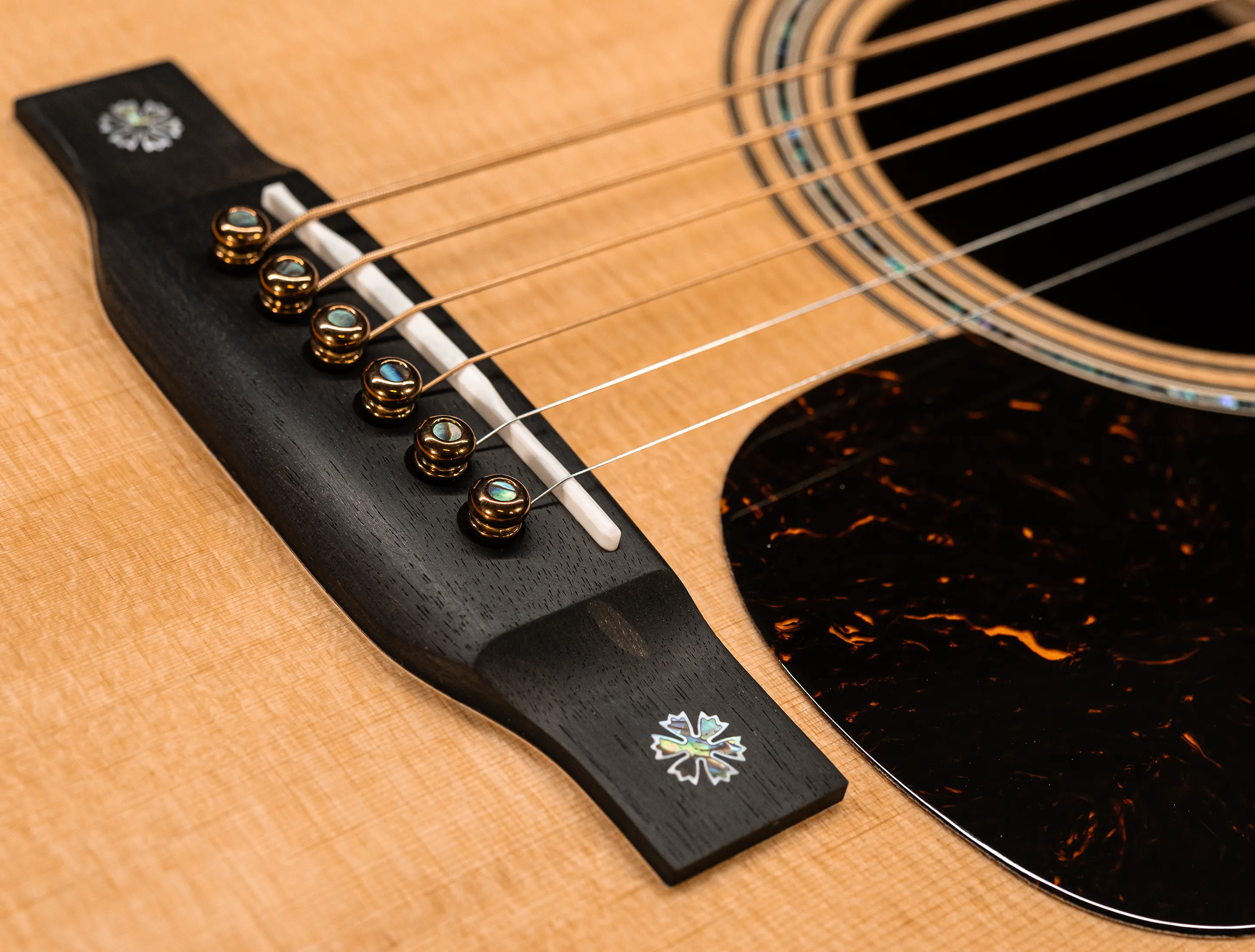 Die Brückenpins sind aus Liquidmetal, einer Titaniumlegierung. Super leicht, extrem stabil und für die Optik bei der D42-MD mit einem Abalone Dot versehen.