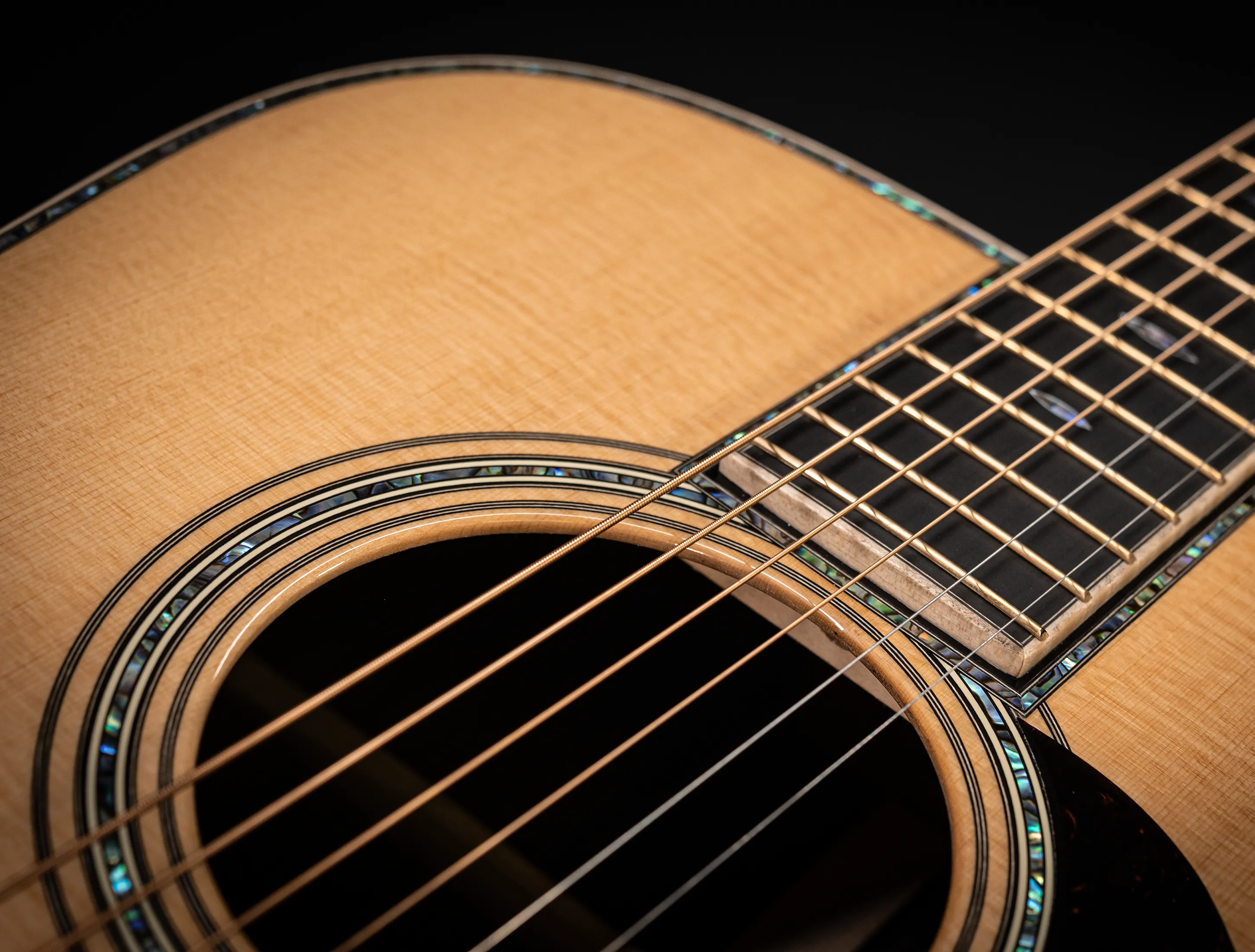 Um die Optik zu steigern, wurde die D-42 Modern Deluxe mit einer Randeinlage aus geflammten Ahorn gefertigt. Sieht einfach wunderbar aus.