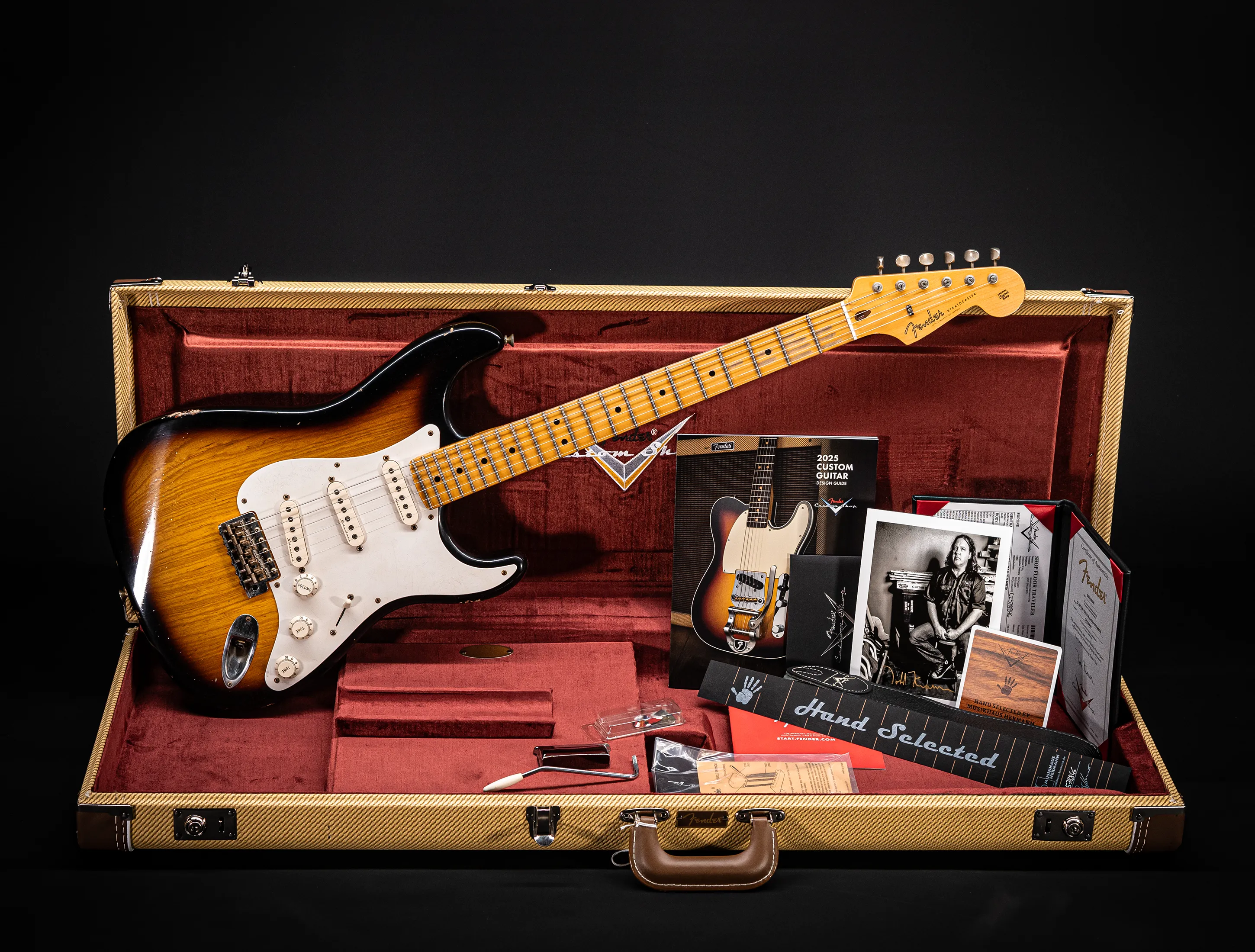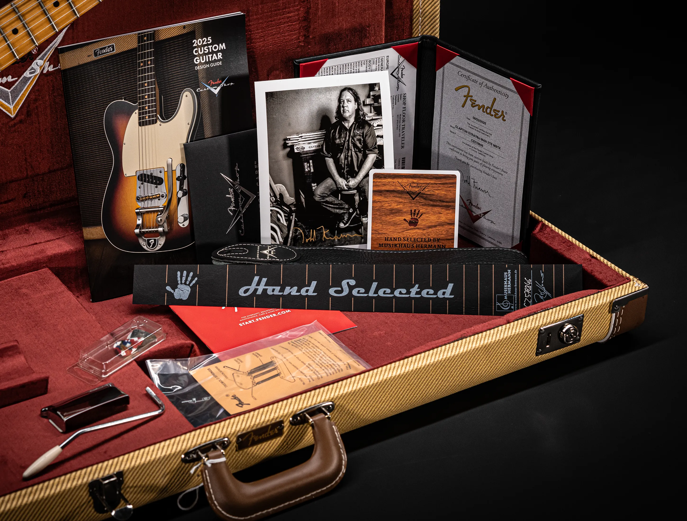 - Zubehör-Kit (Custom-Shop Gitarrengurt, Tremolo-Arm, Brückenabdeckung "Ashtray", Pflegehinweise & Plectren)