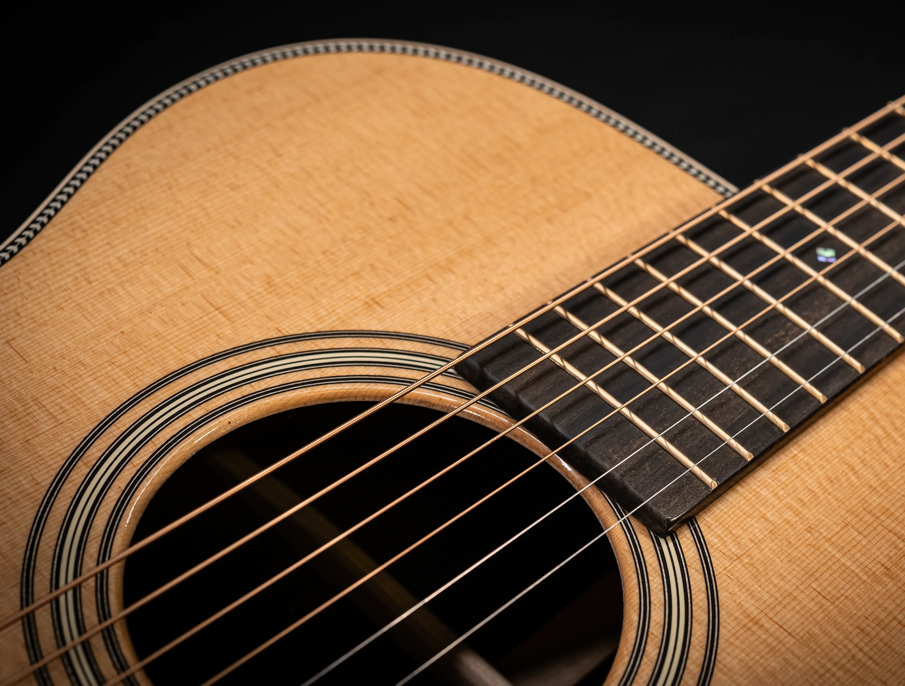 Um die Optik zu steigern, wurde die OM-28 mit einer Randeinlage aus geflammten Ahorn gefertigt. Sieht einfach wunderbar aus.