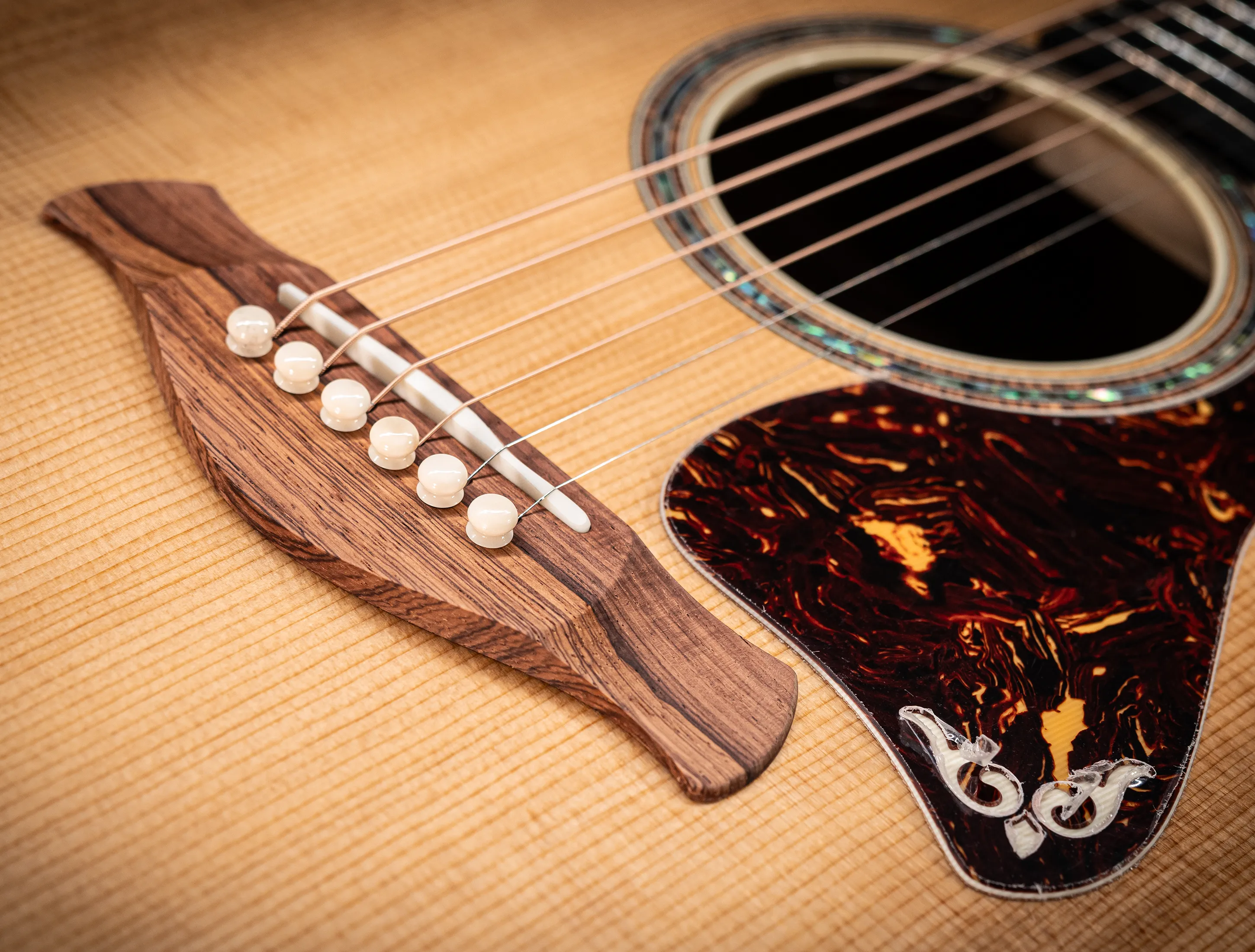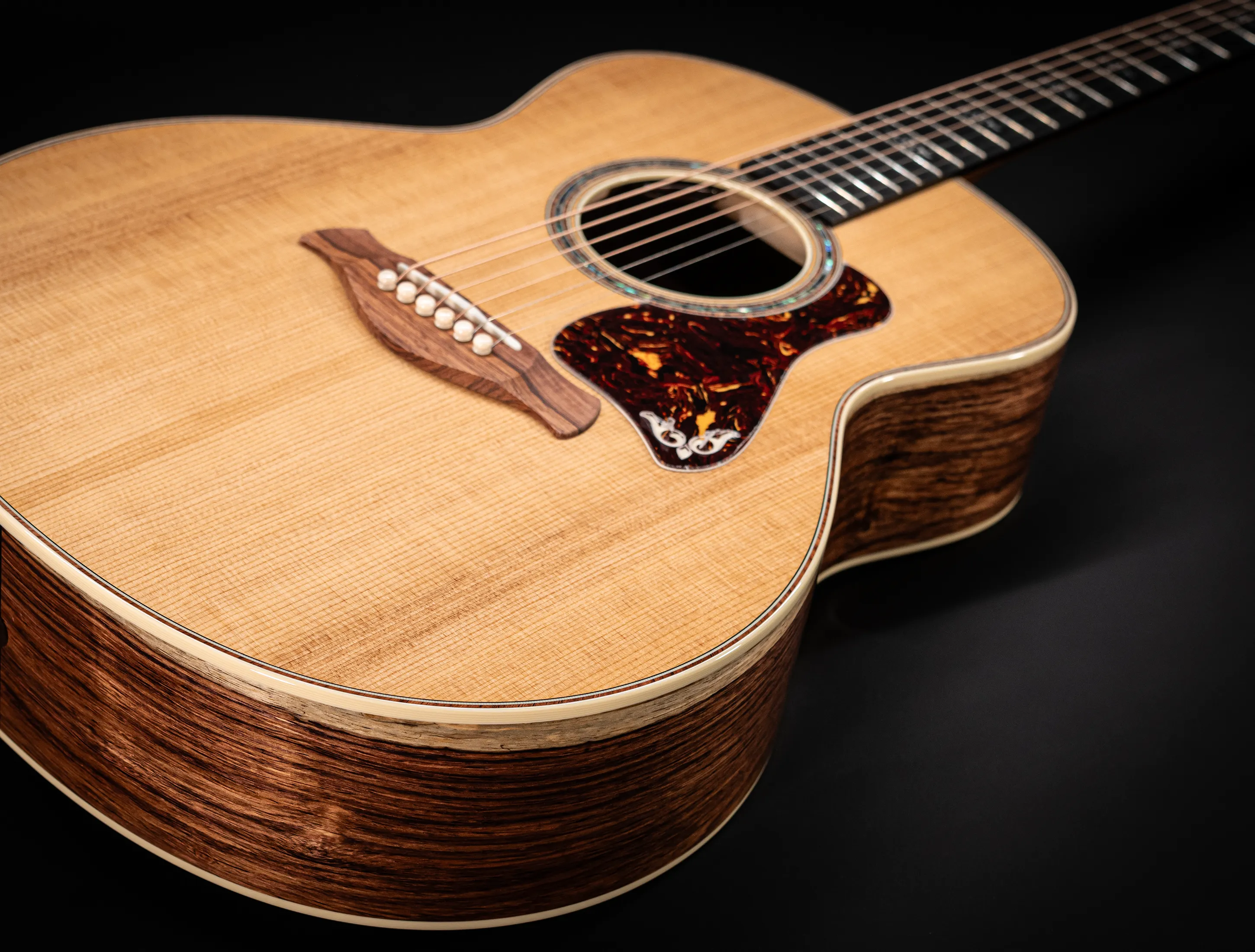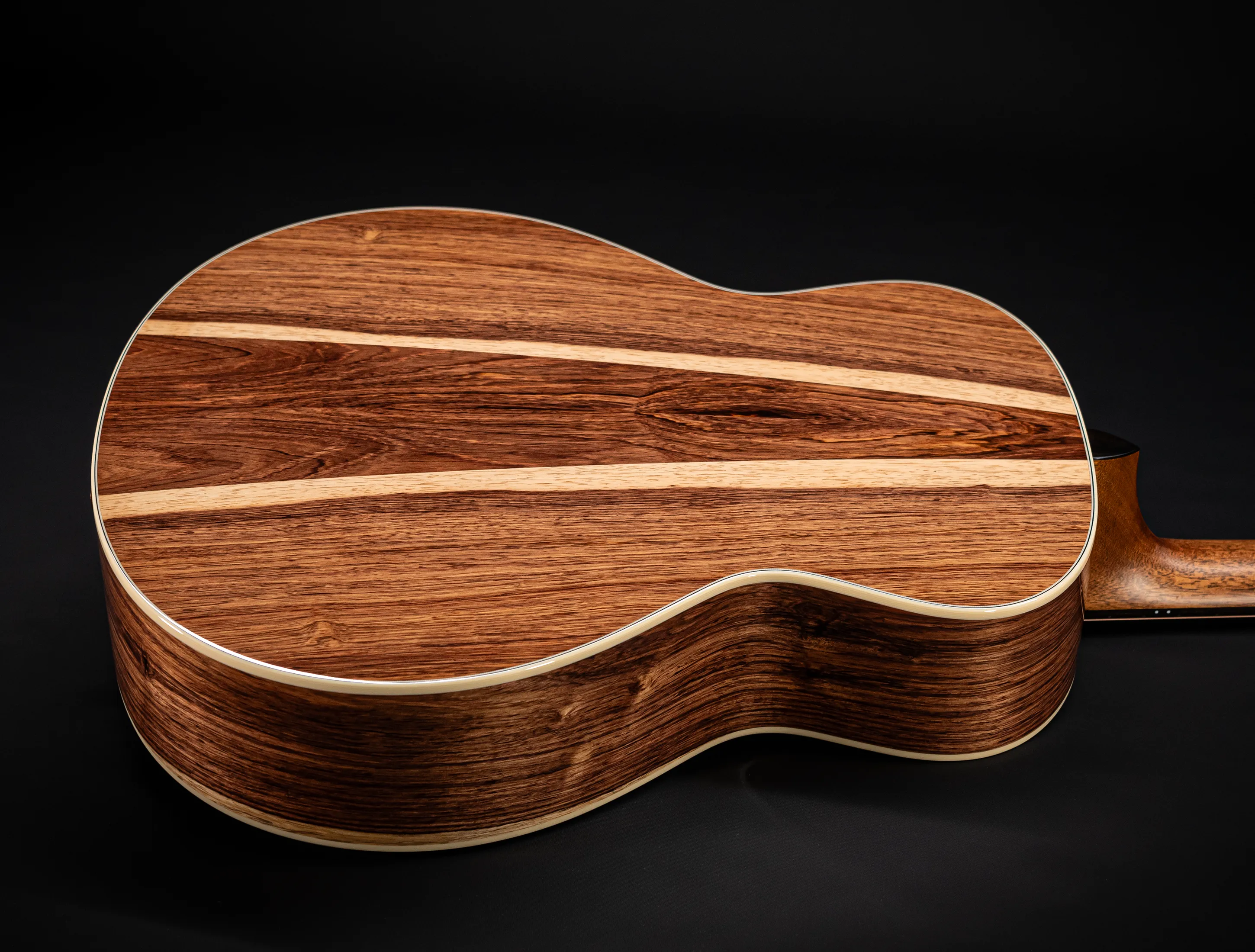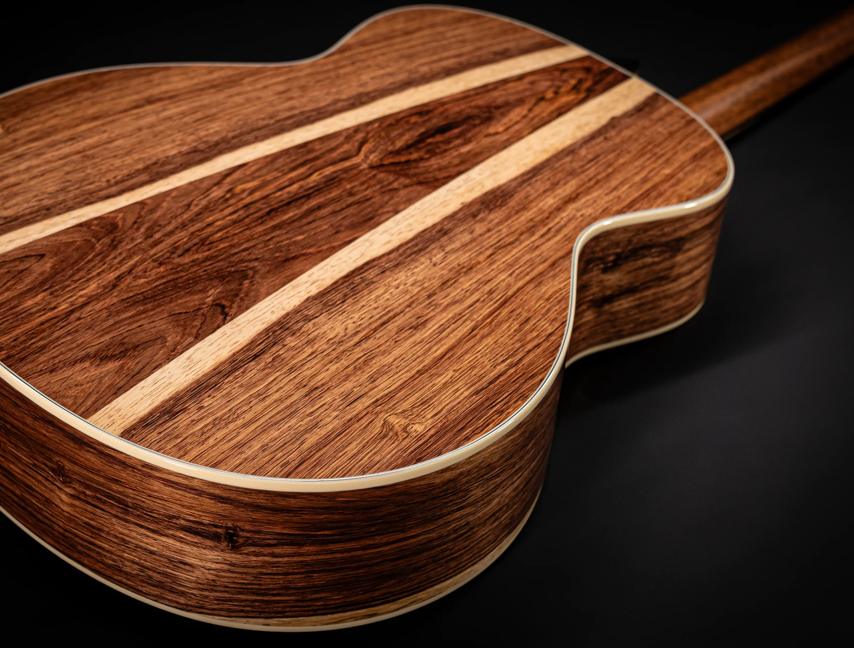 Höchste Aufmerksamkeit für das Detail ist hier natürlich gegeben. Dies beginnt beim erlesensten Honduras-Palisander für den Korpus, welcher eine wunderschöne, natürlich Maserung aufweist und sein - von Natur aus - niedriger Dämpfungsfaktor eine sehr strukturiertes, harmonische Klangbild mit üppigen schwingenden Obertönen verleiht. Mit seinen klaren Höhen und der Präsenz im Bassbereich passt die sanfte "Stimme" des honduranischen Palisanders perfekt zum Gesamtcharakter der Gold-Label.