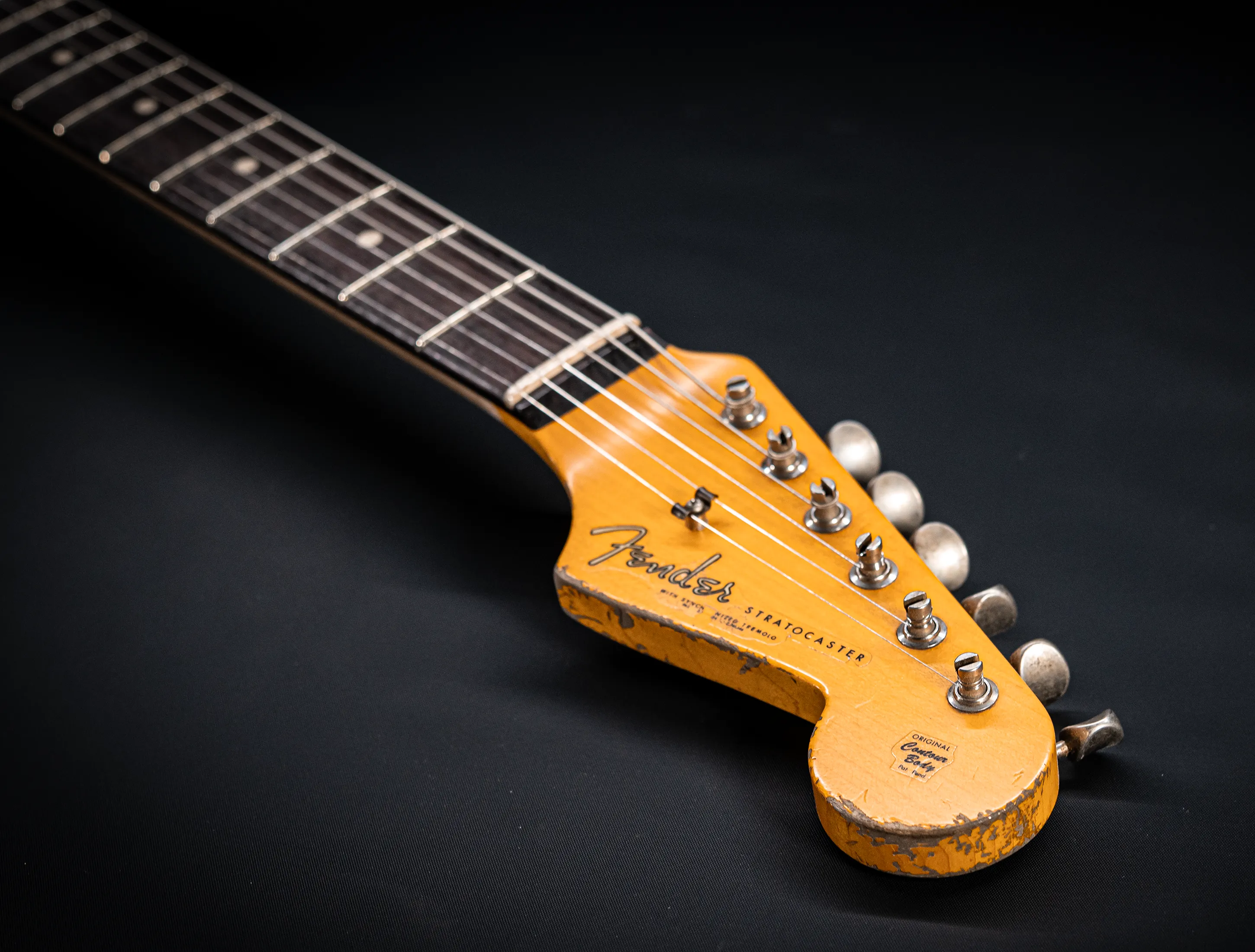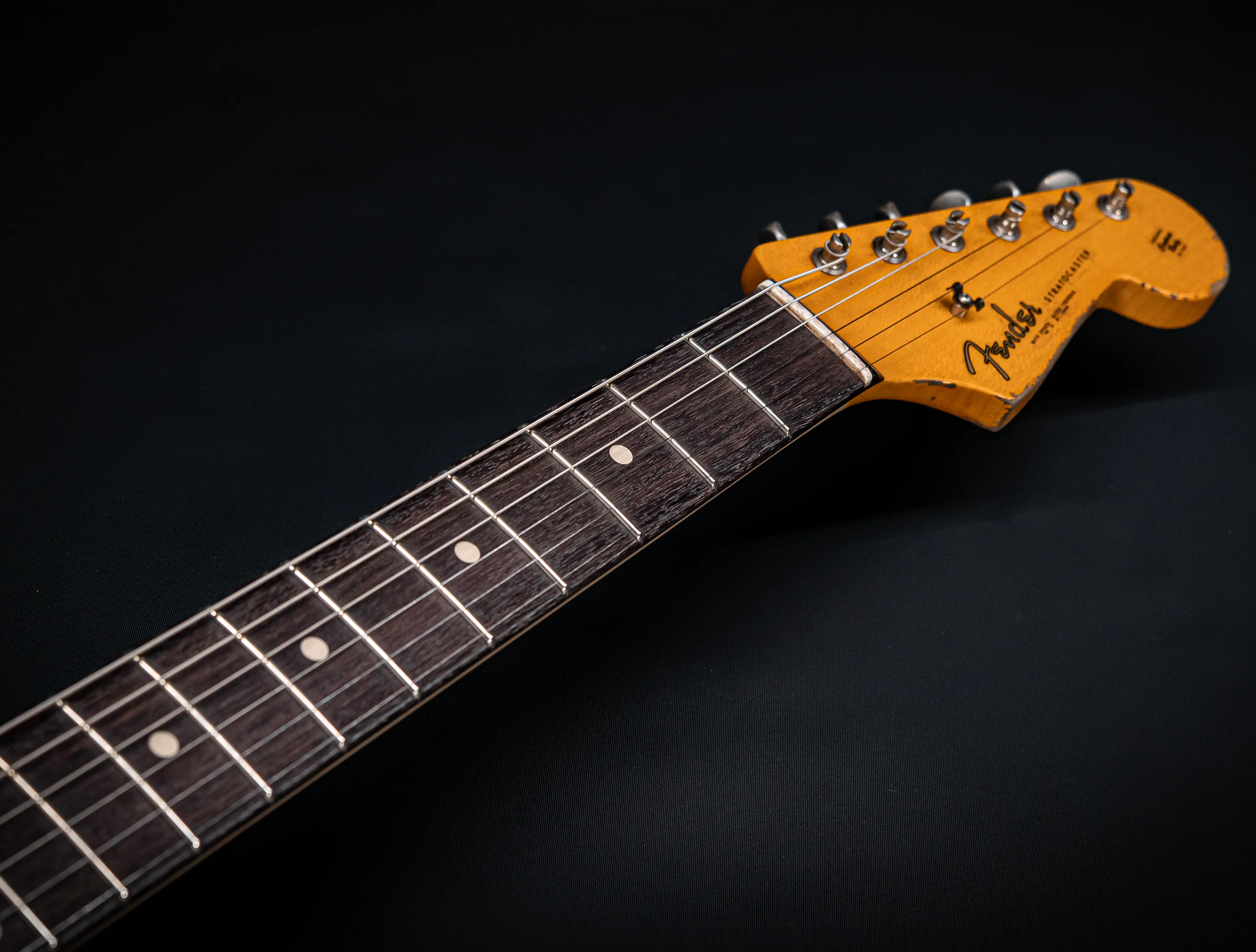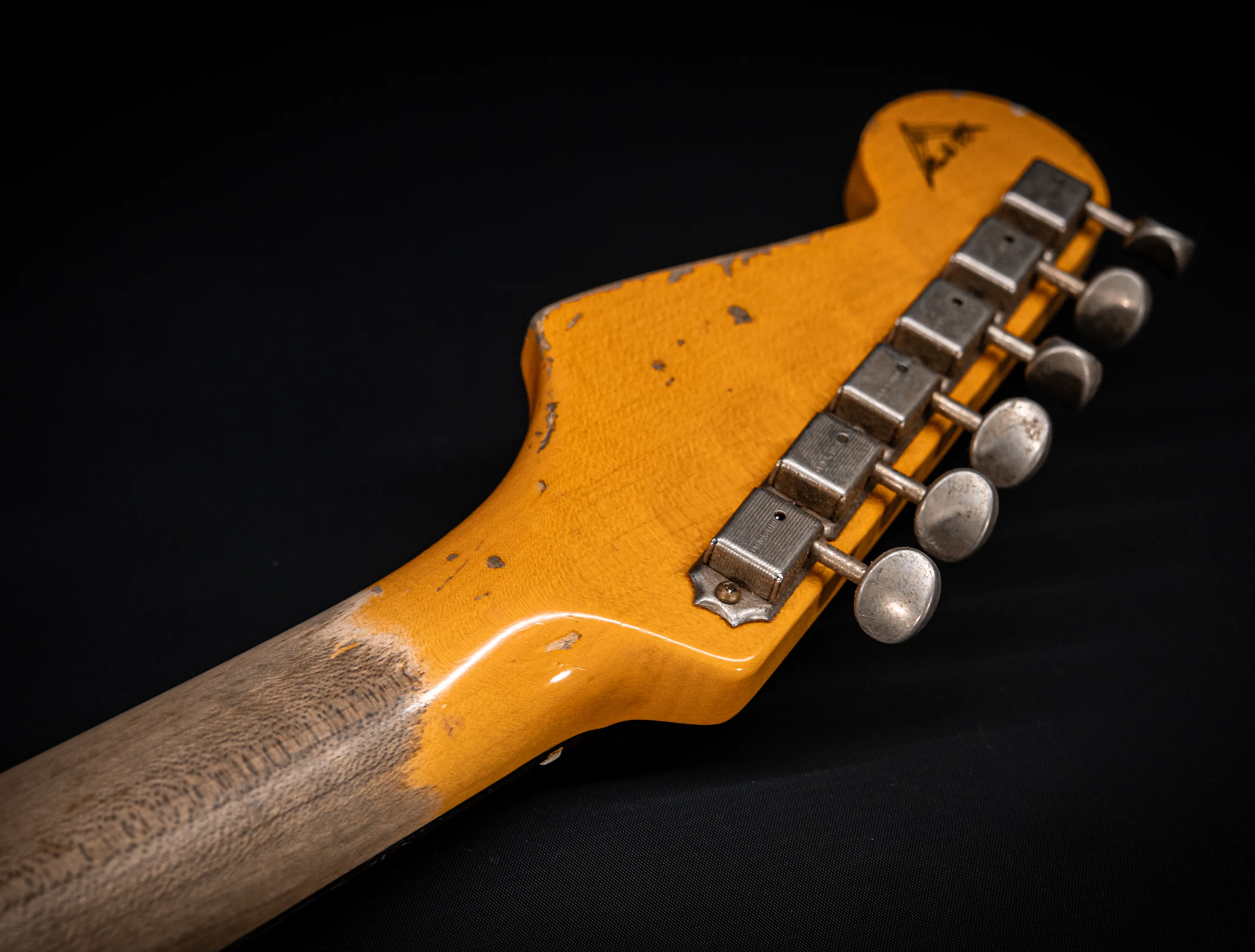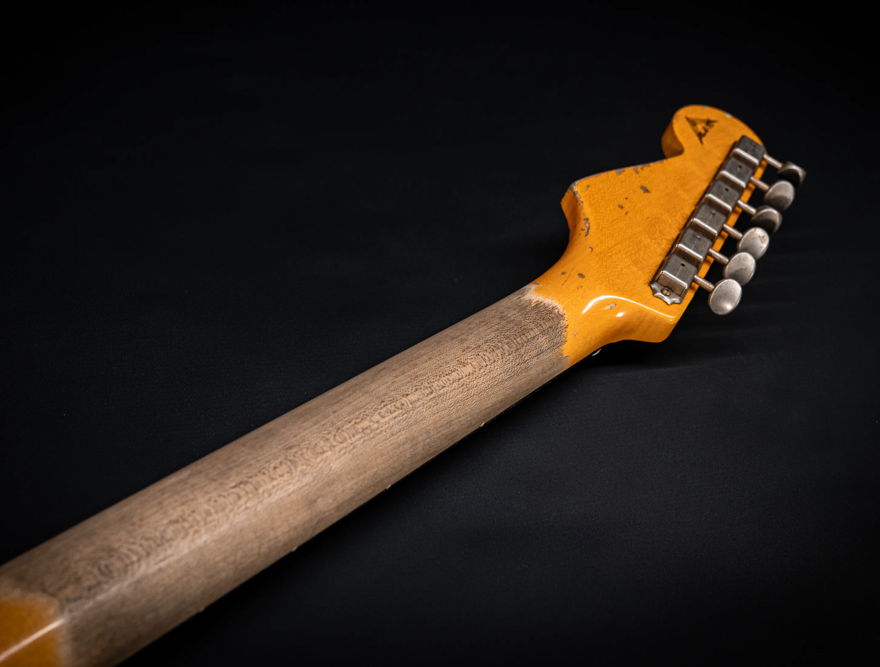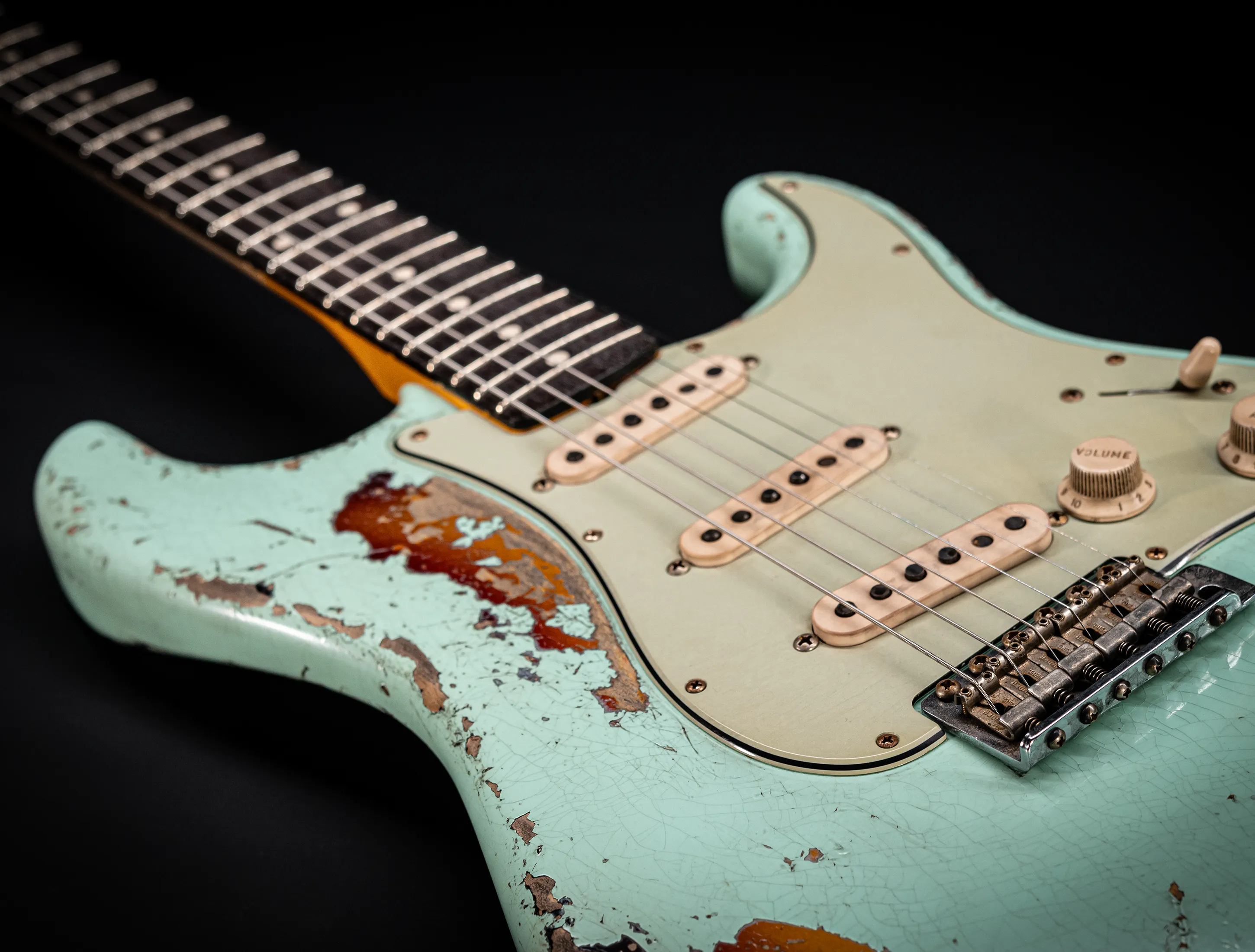 Ein von Austin MacNutt selektierter, leichter premium Erlekorpus, ein dunkles 9,5" Radius Palisandergriffbrett sowie ein 5/4 Quartersawn Ahornhals. 3 von Josefina handgewickelten Custom Singlecoils Set bestehend aus 65 Strat, FAT60S RWRP und einem Texas Special am der Bridge sind mit den wichtigsten Features. Aber achten Sie auch auf das von Austin verwendete heavy relic, ist das nicht alleine bereits eine Ansage!