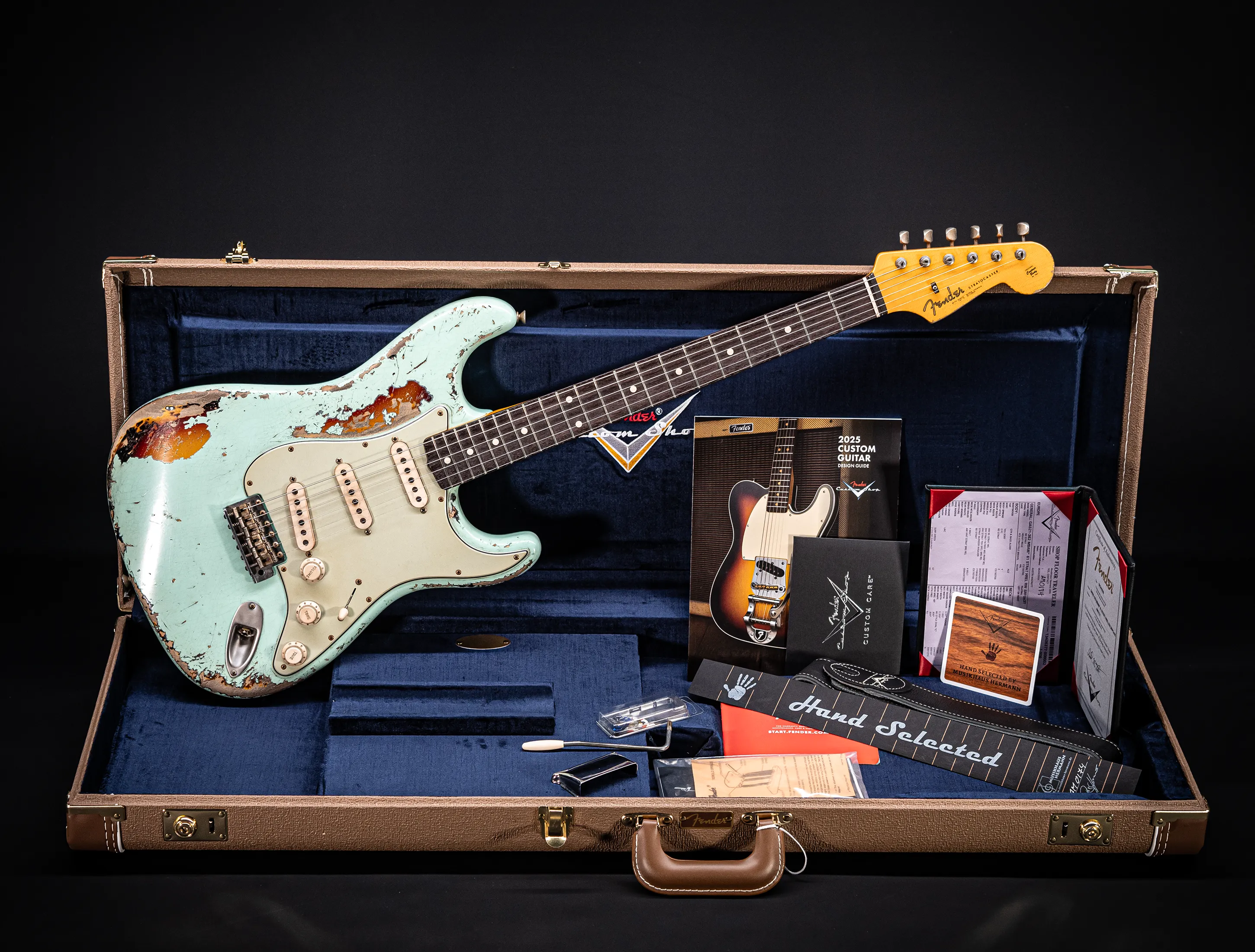 Durch die enge Zusammenarbeit und den persönlichen Kontakt von Jörg Hermann mit Austin MacNutt freuen wir uns Ihnen diese schöne Ex-Pin-Up-Strat 1961er Masterbuilt Strat aus unserem exklusiven Custom Shop Programm vorstellen zu dürfen: Im absoluten coolen F-branded Surf Green Over Sunburst Gewand und Austins einzigartigem Gespür für die Details einer guten Strat, bringt es die Gitarre auf den Punkt!