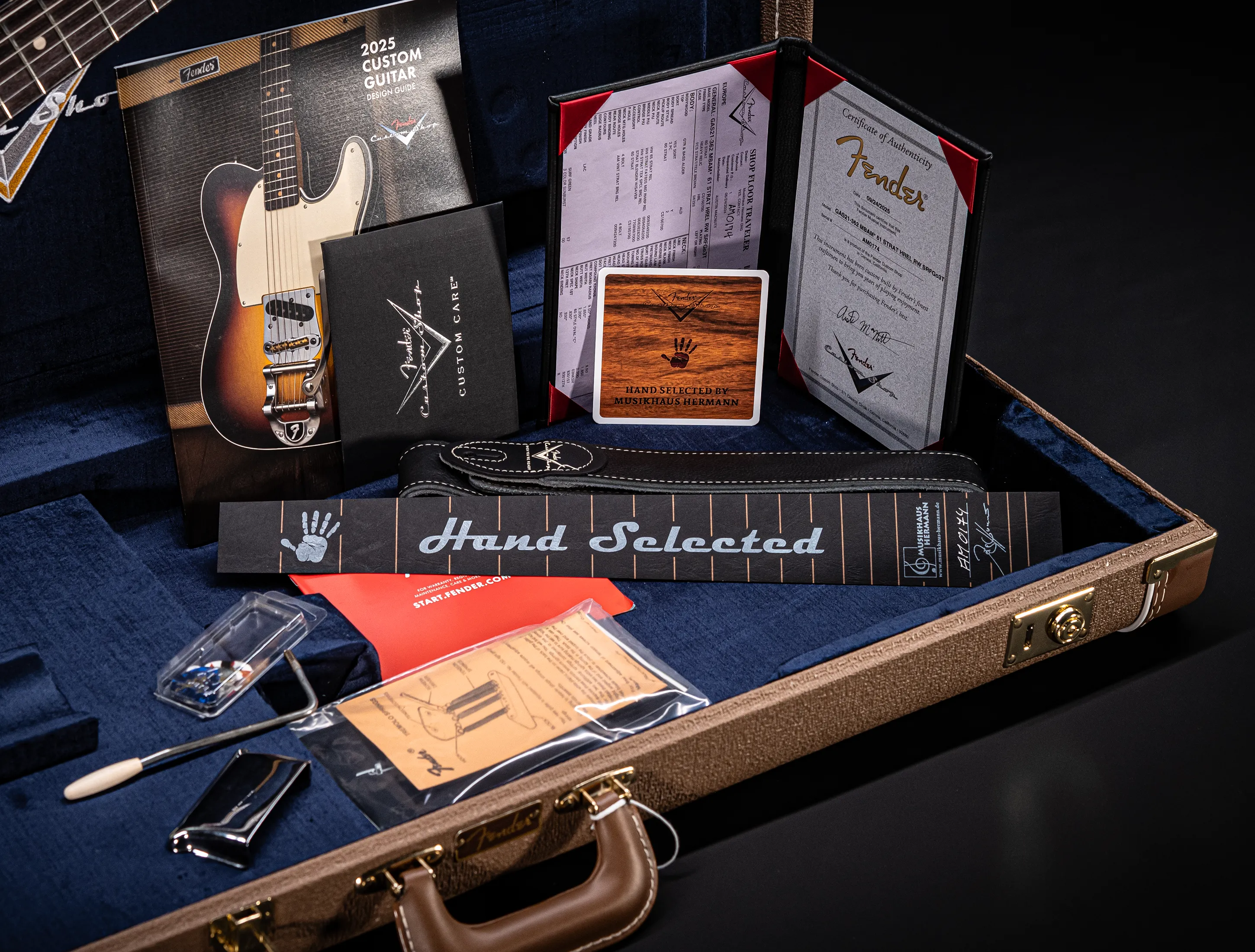 - Zubehör-Kit (Custom-Shop Gitarrengurt, Tremoloarm, Brückenabdeckung "Ashtray", Pflegehinweise & Plectren)