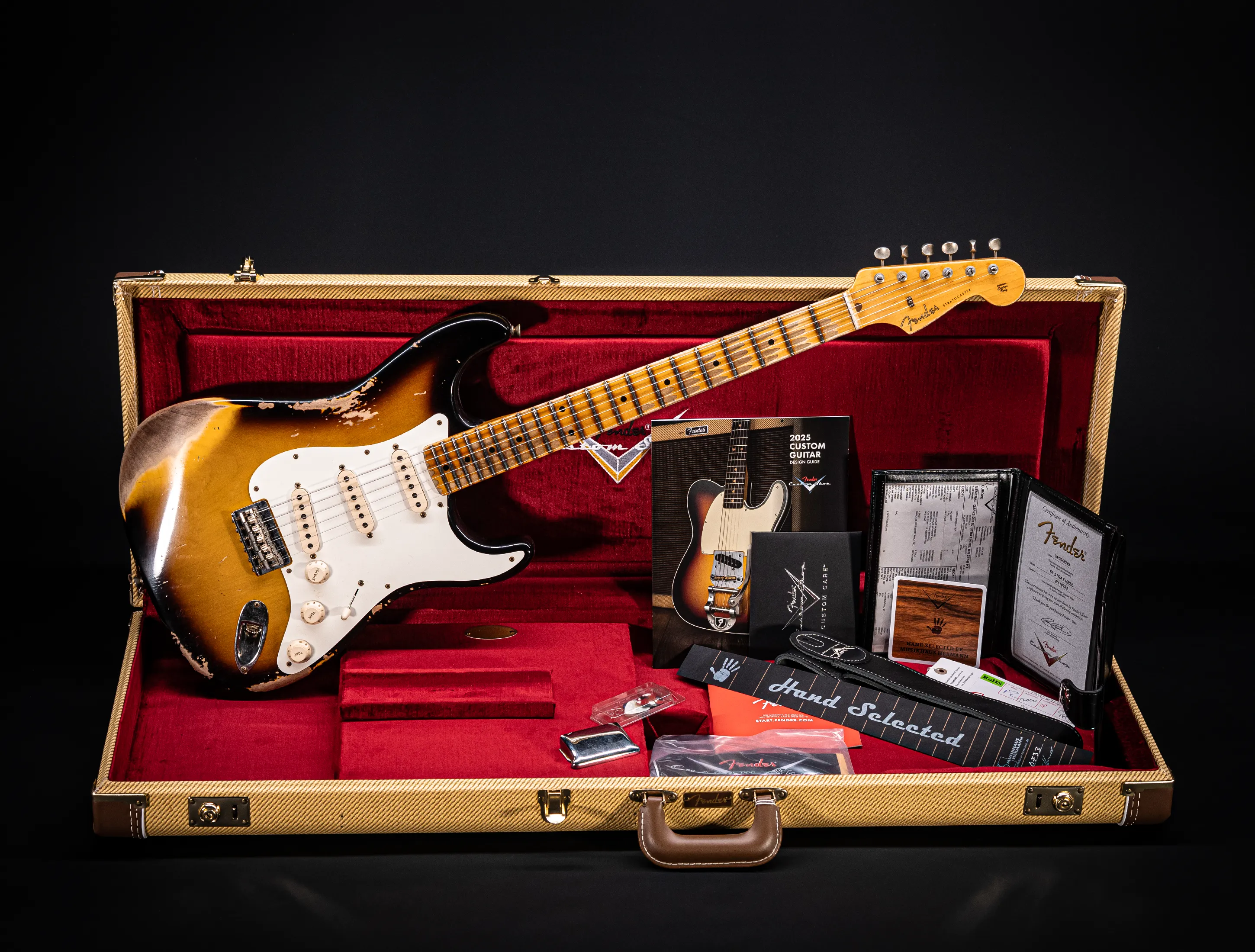- Zubehör-Kit (Custom-Shop Gitarrengurt, Brückenabdeckung "Ashtray", Pflegehinweise)