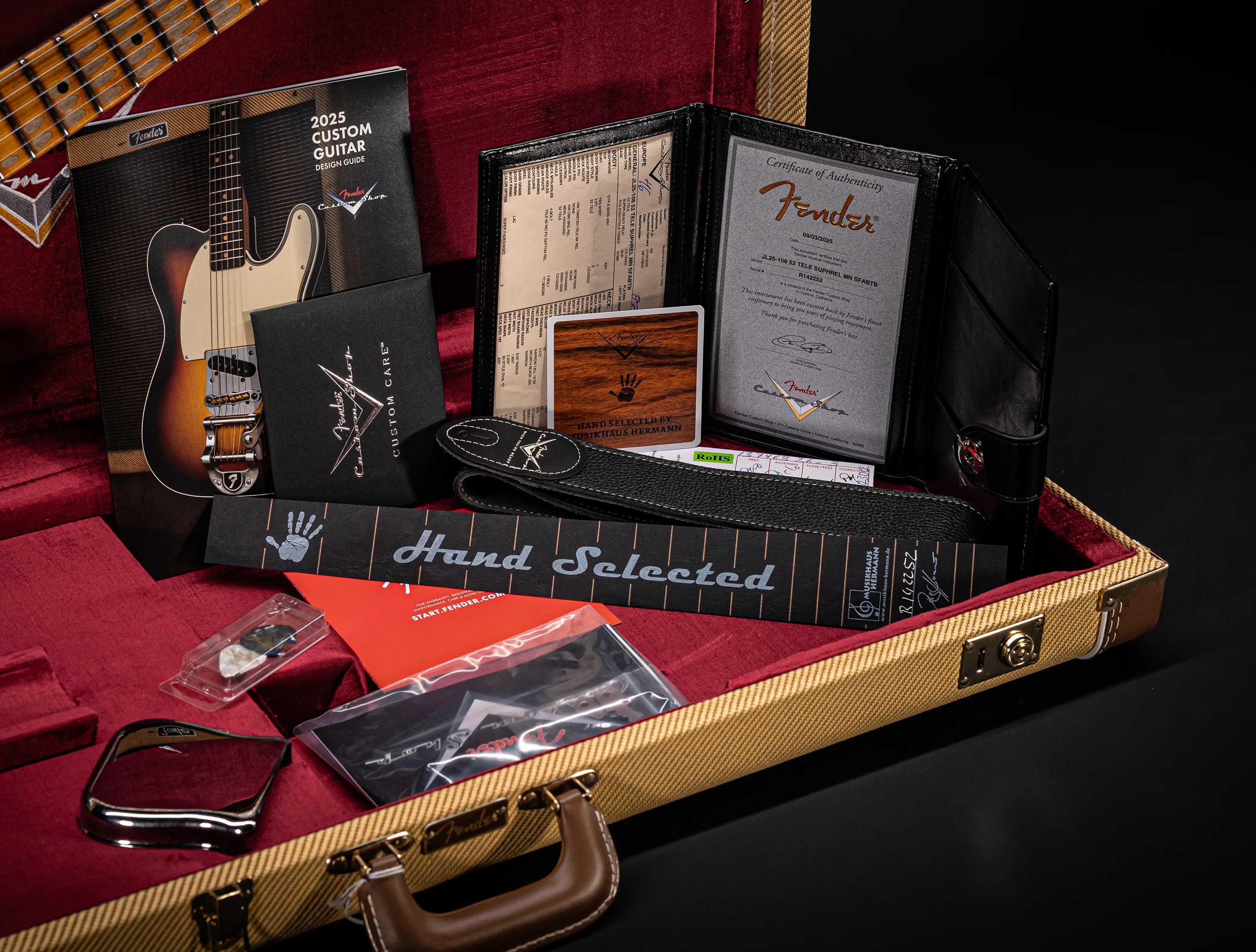 - Zubehör-Kit (Custom-Shop Gitarrengurt, Brückenabdeckung "Ashtray", Pflegehinweise & Plectren)