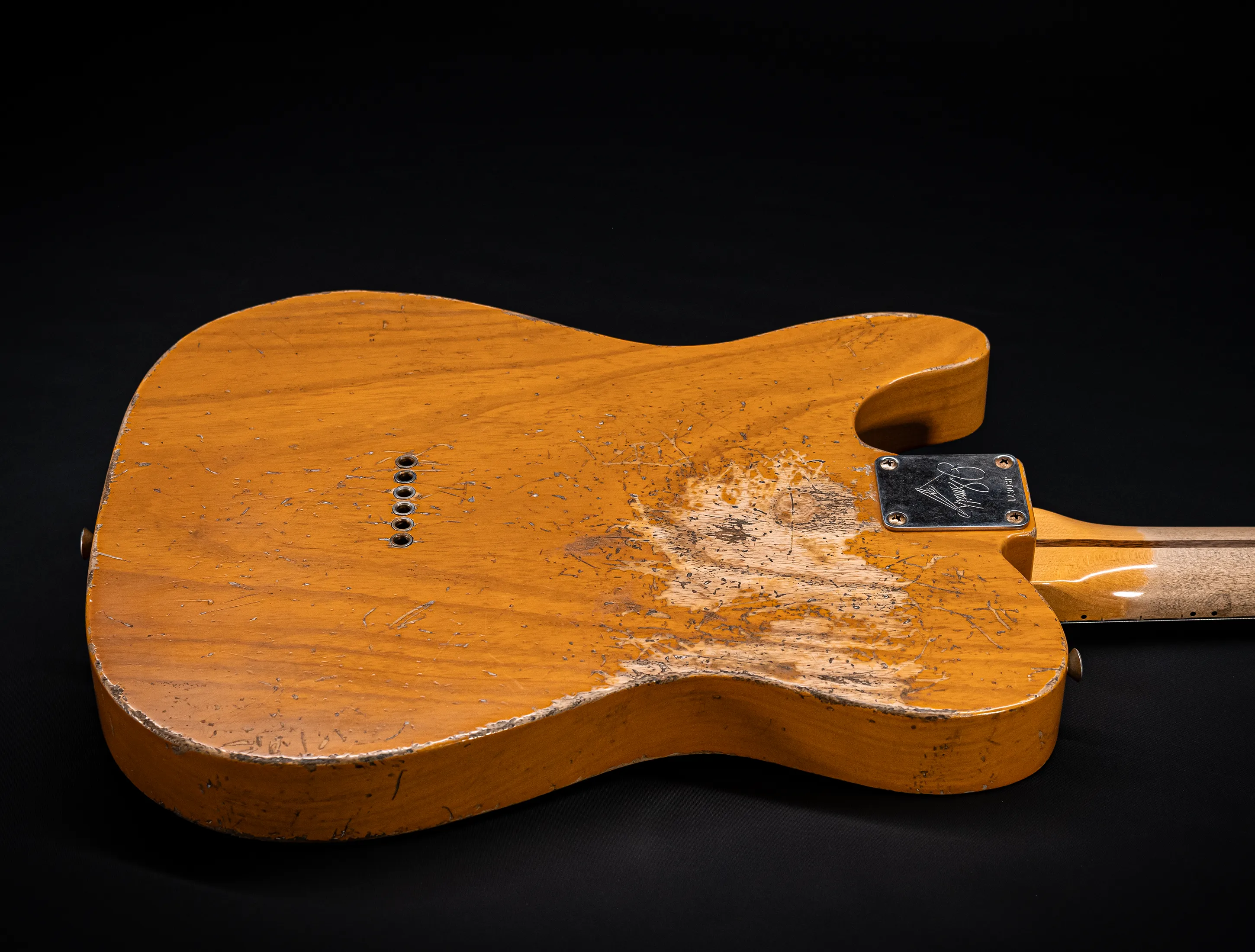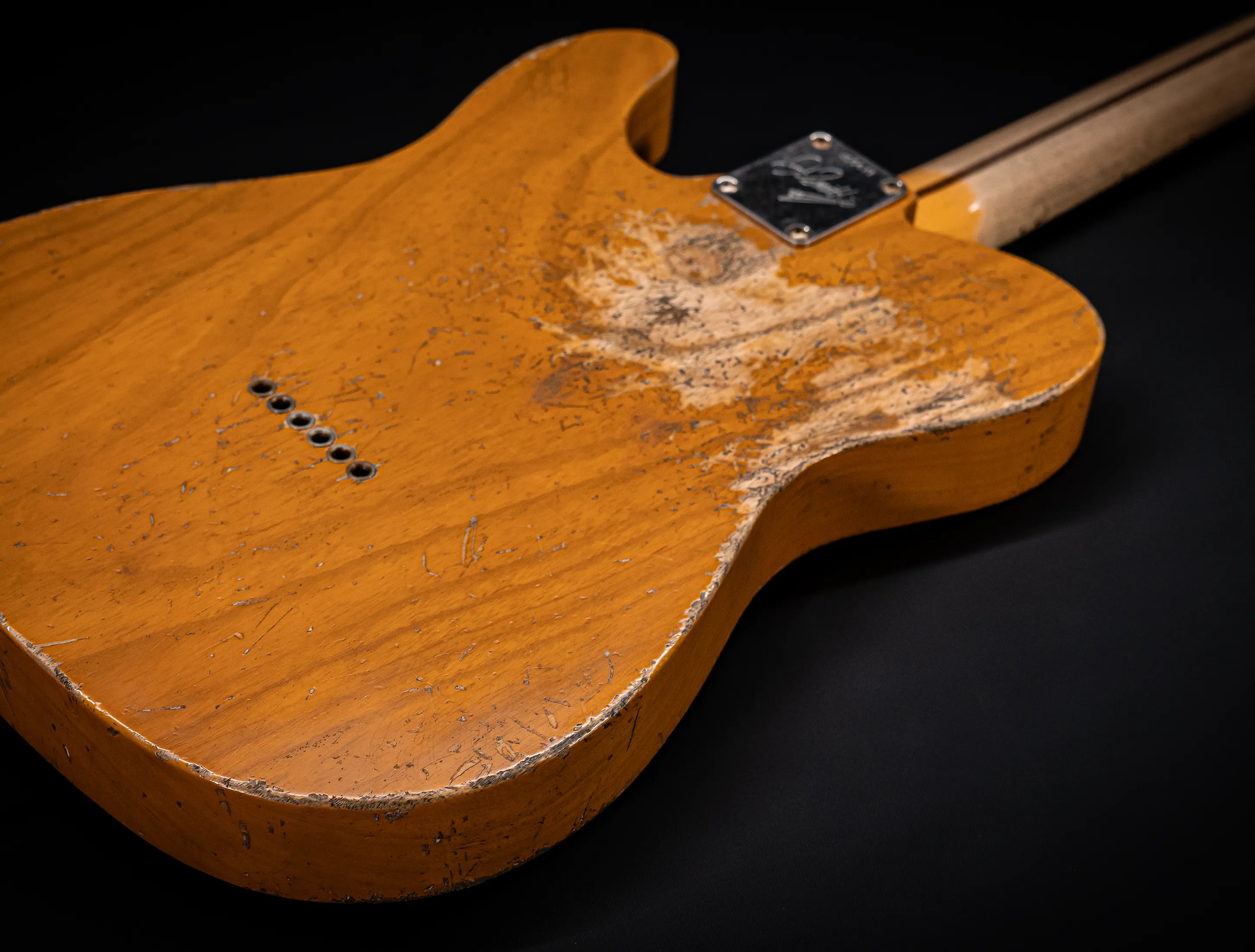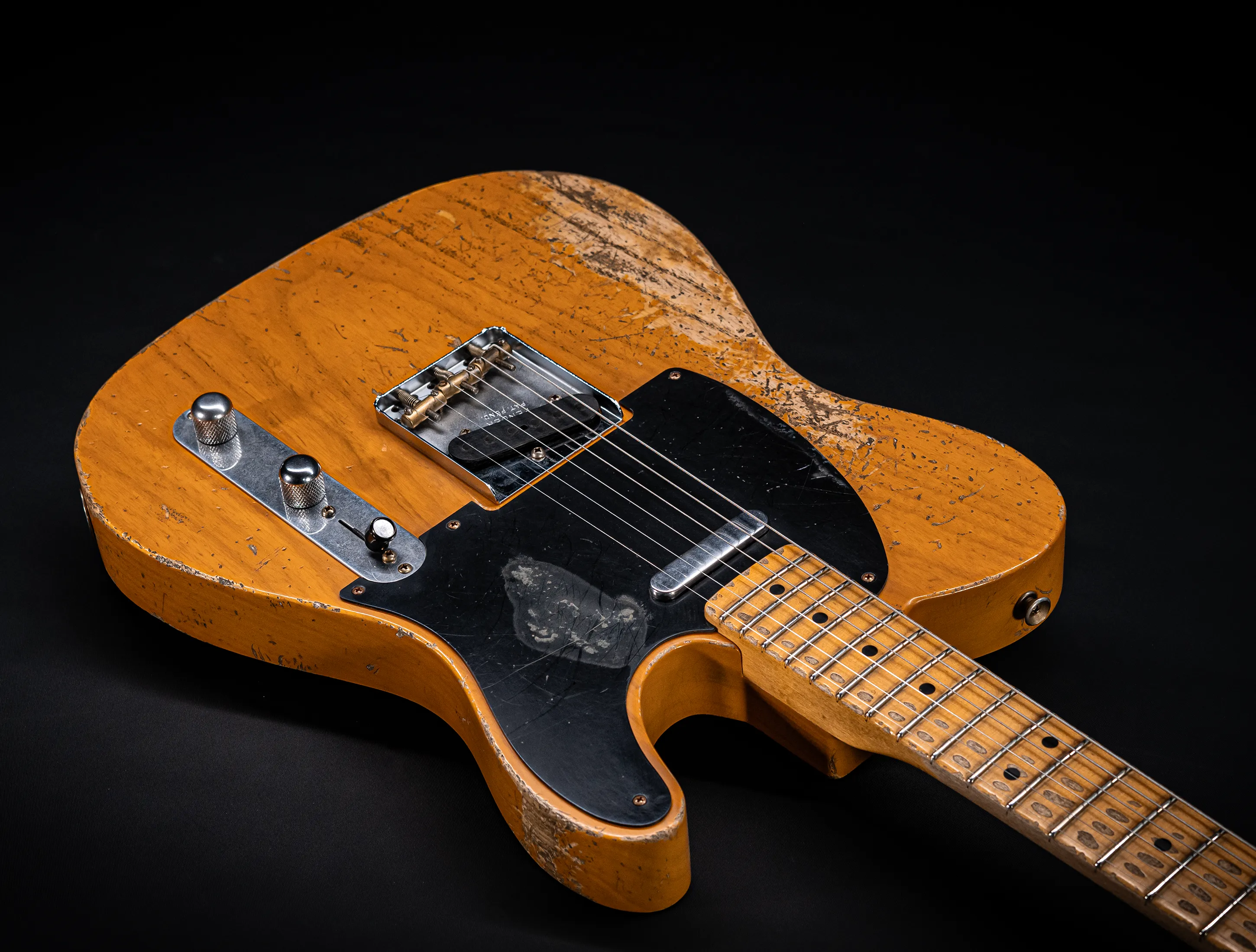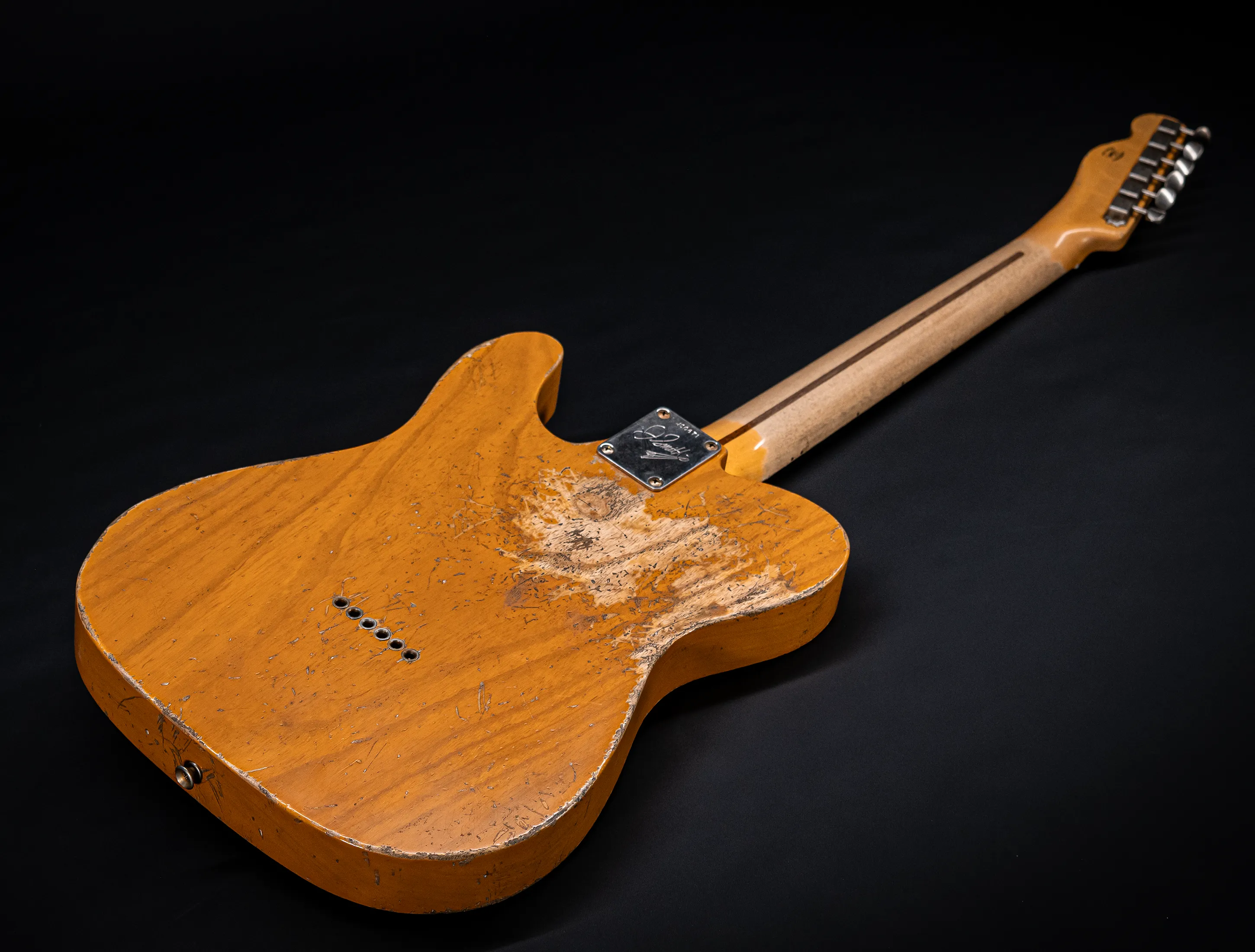 Schon der erste Blick verrät, wohin die Reise geht: pure, zeitlose Schönheit. Die hauchdünne Nitro-Lackierung wurde von Jason in einem kompromisslosen Super Heavy Relic Vintage Look umgesetzt – mit einer Authentizität, die sofort unter die Haut geht. Jede Spielspur, jede Abnutzung wirkt so echt, als hätte diese Telecaster bereits Jahrzehnte Musikgeschichte geschrieben. Das klassische Aged Butterscotch Blonde – untrennbar verbunden mit den legendären „Blackguard“-Teles – gehört zu den ikonischsten Finishes, die Fender je hervorgebracht hat. Und genau hier entfaltet es seine volle Magie: roh, ehrlich und absolut stilprägend.