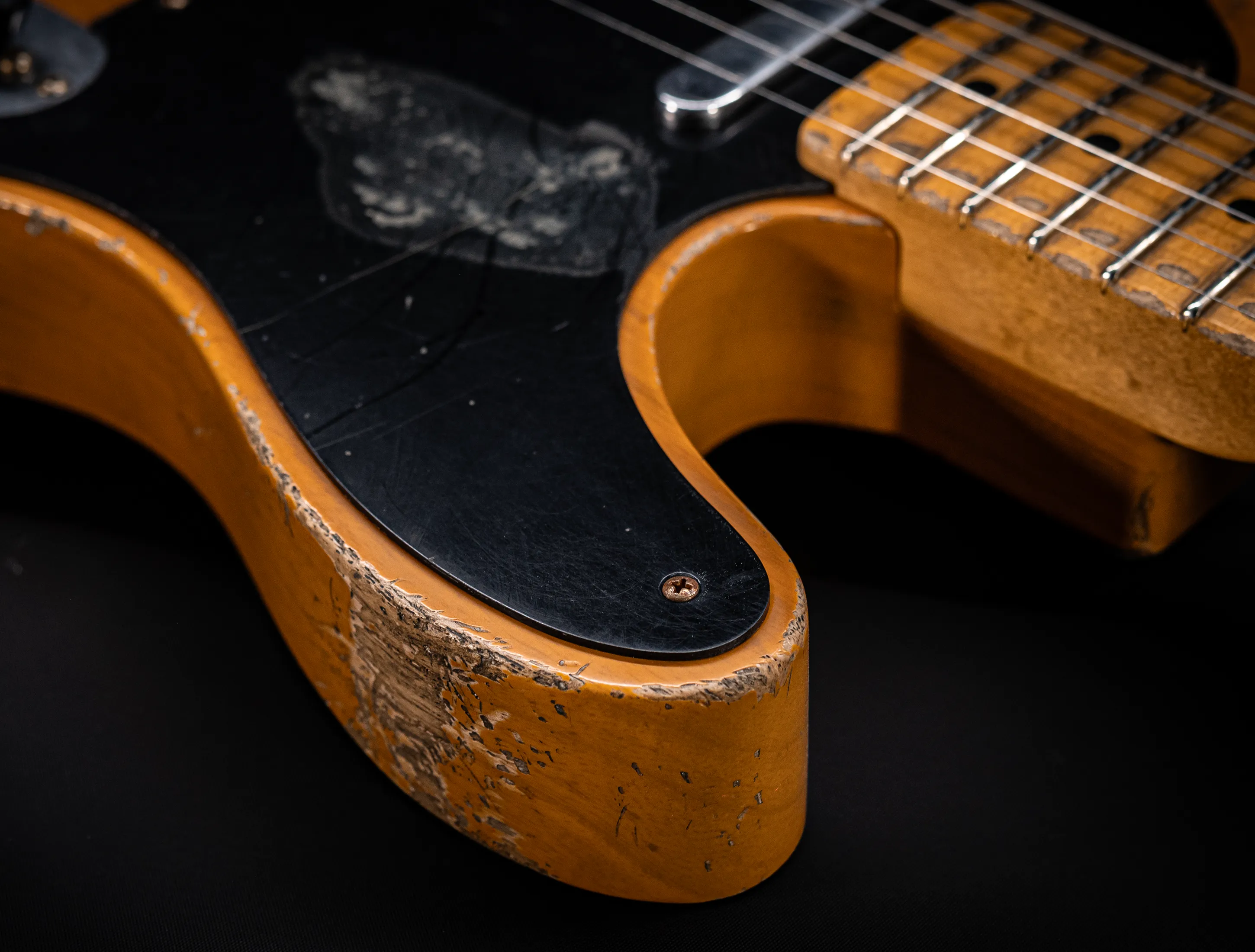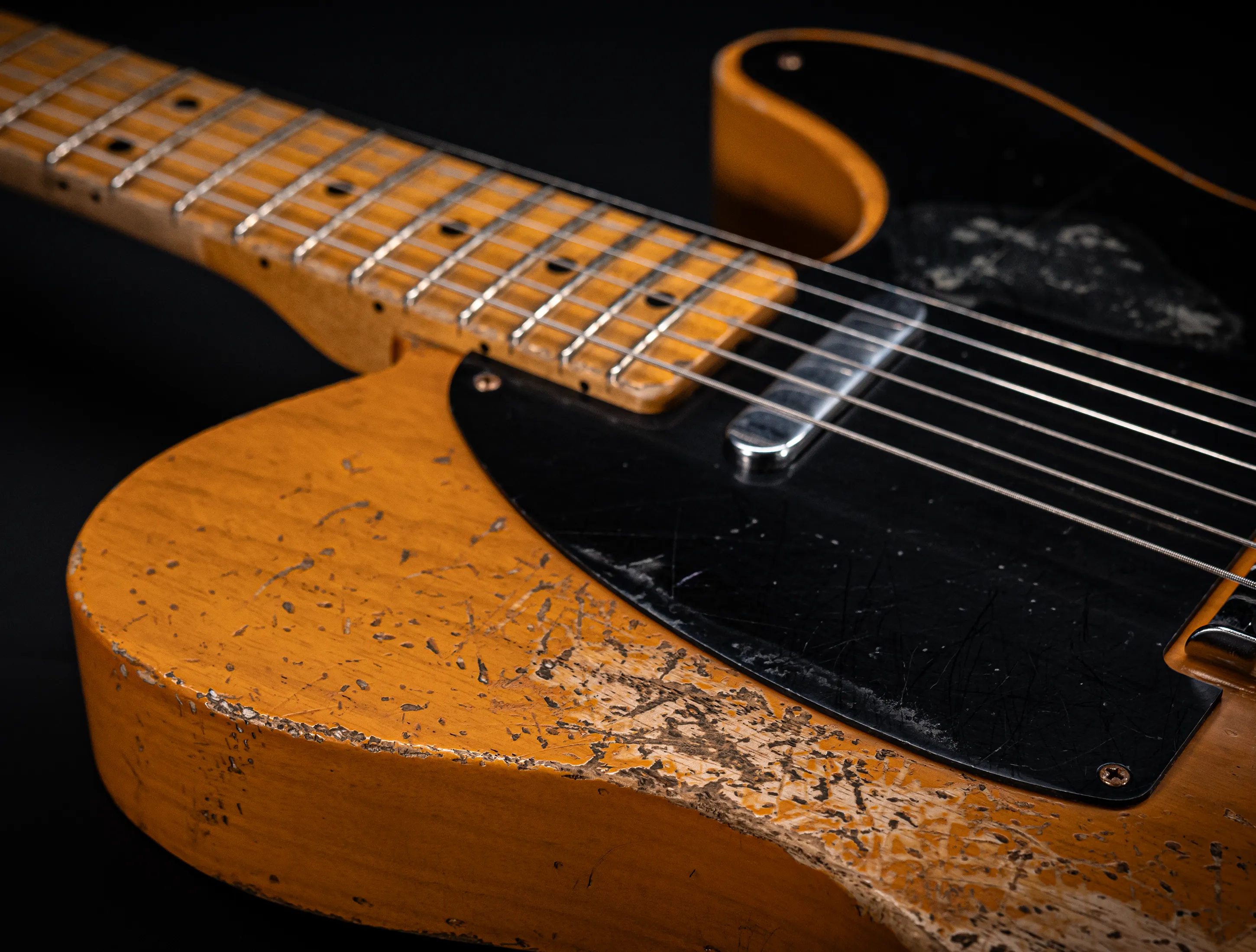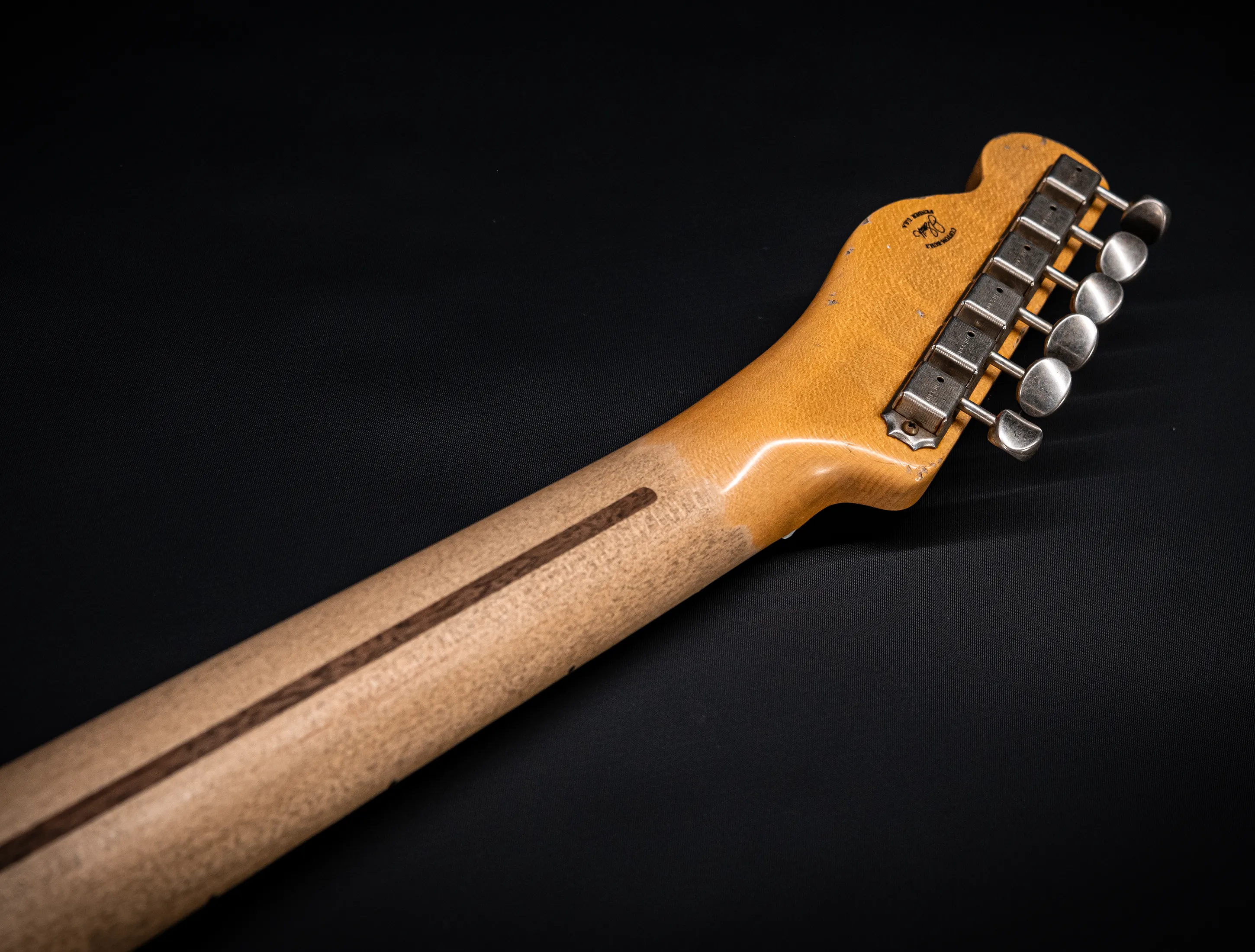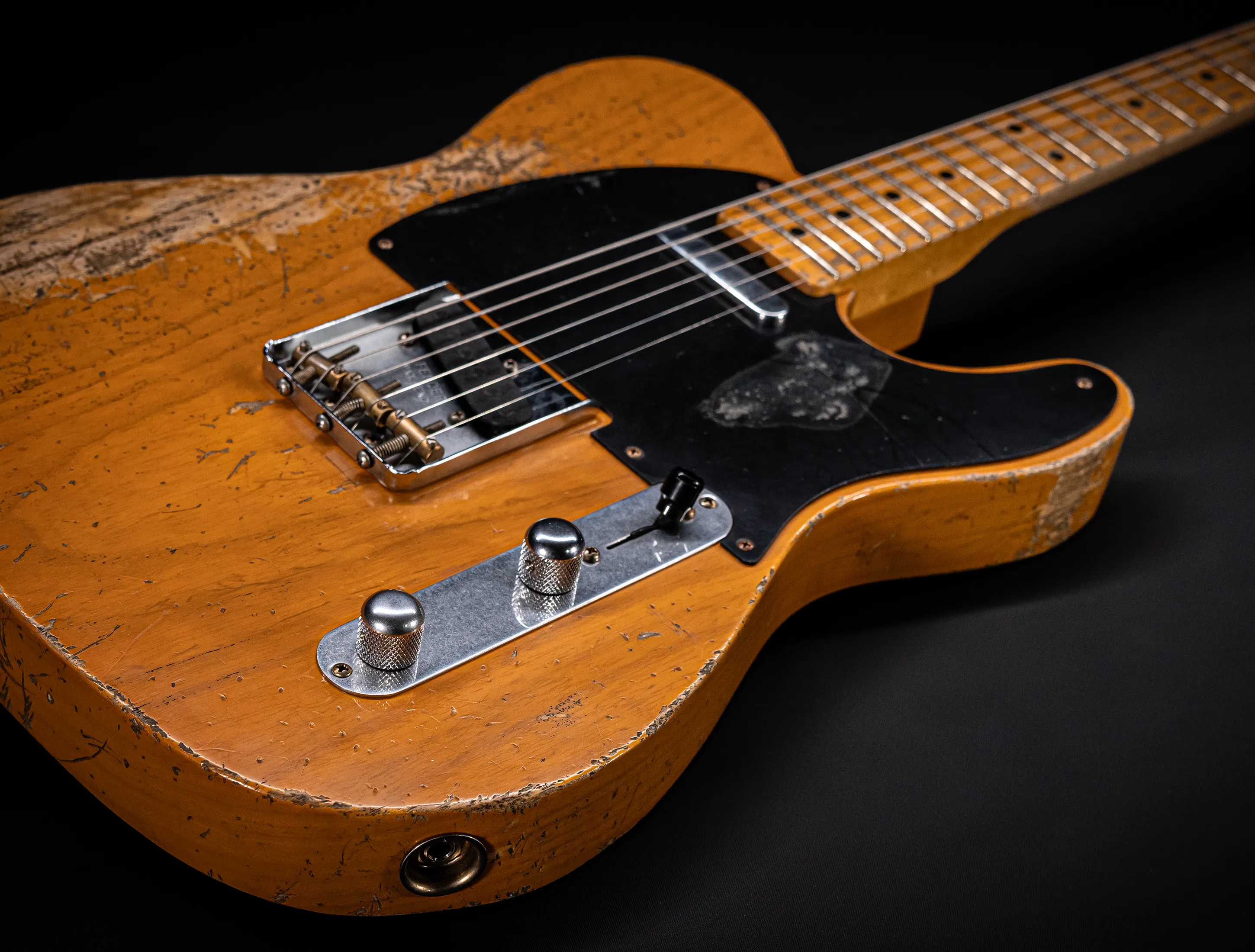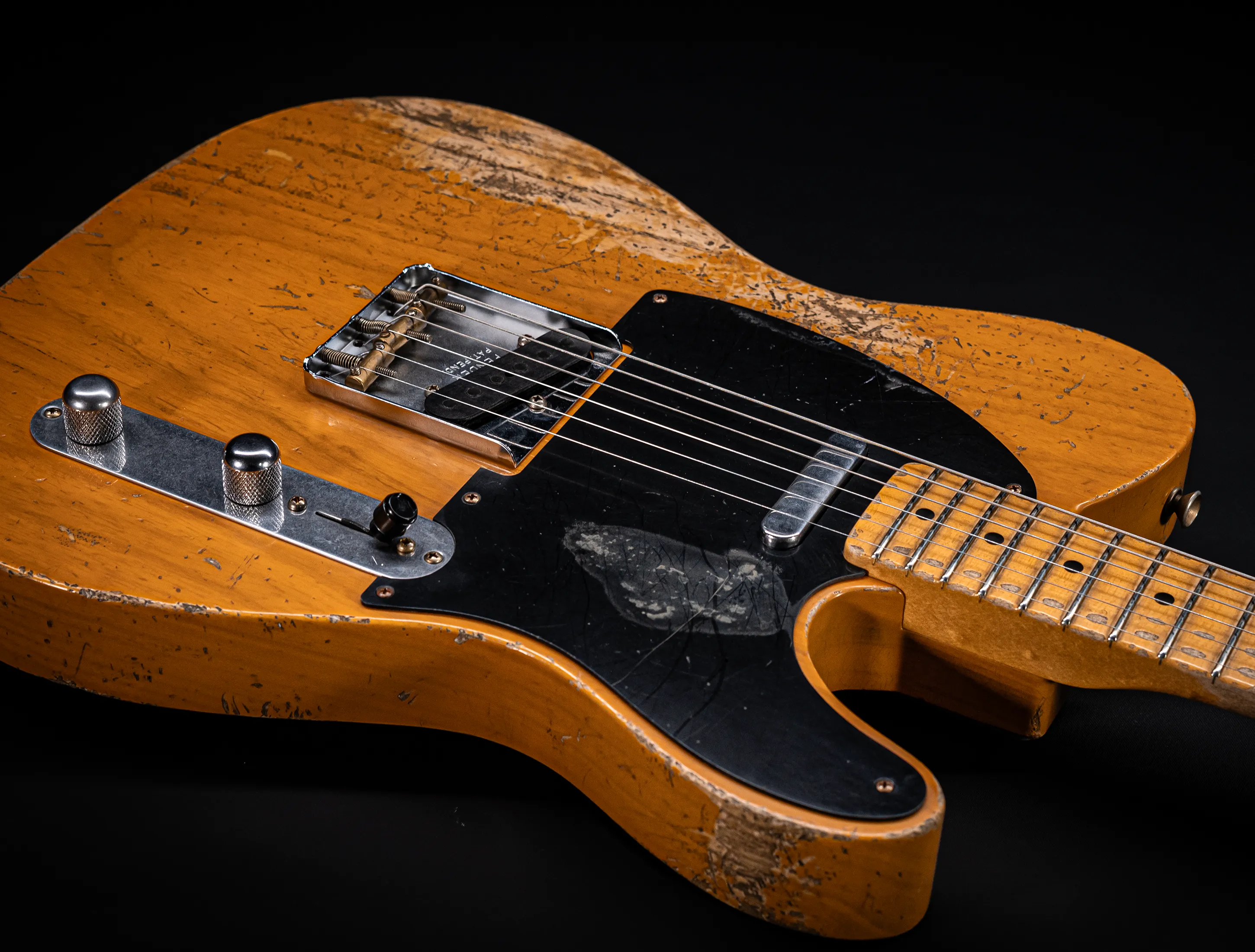 Schon der erste Blick verrät, wohin die Reise geht: pure, zeitlose Schönheit. Die hauchdünne Nitro-Lackierung wurde von Jason in einem kompromisslosen Super Heavy Relic Vintage Look umgesetzt – mit einer Authentizität, die sofort unter die Haut geht. Jede Spielspur, jede Abnutzung wirkt so echt, als hätte diese Telecaster bereits Jahrzehnte Musikgeschichte geschrieben. Das klassische Aged Butterscotch Blonde – untrennbar verbunden mit den legendären „Blackguard“-Teles – gehört zu den ikonischsten Finishes, die Fender je hervorgebracht hat. Und genau hier entfaltet es seine volle Magie: roh, ehrlich und absolut stilprägend.