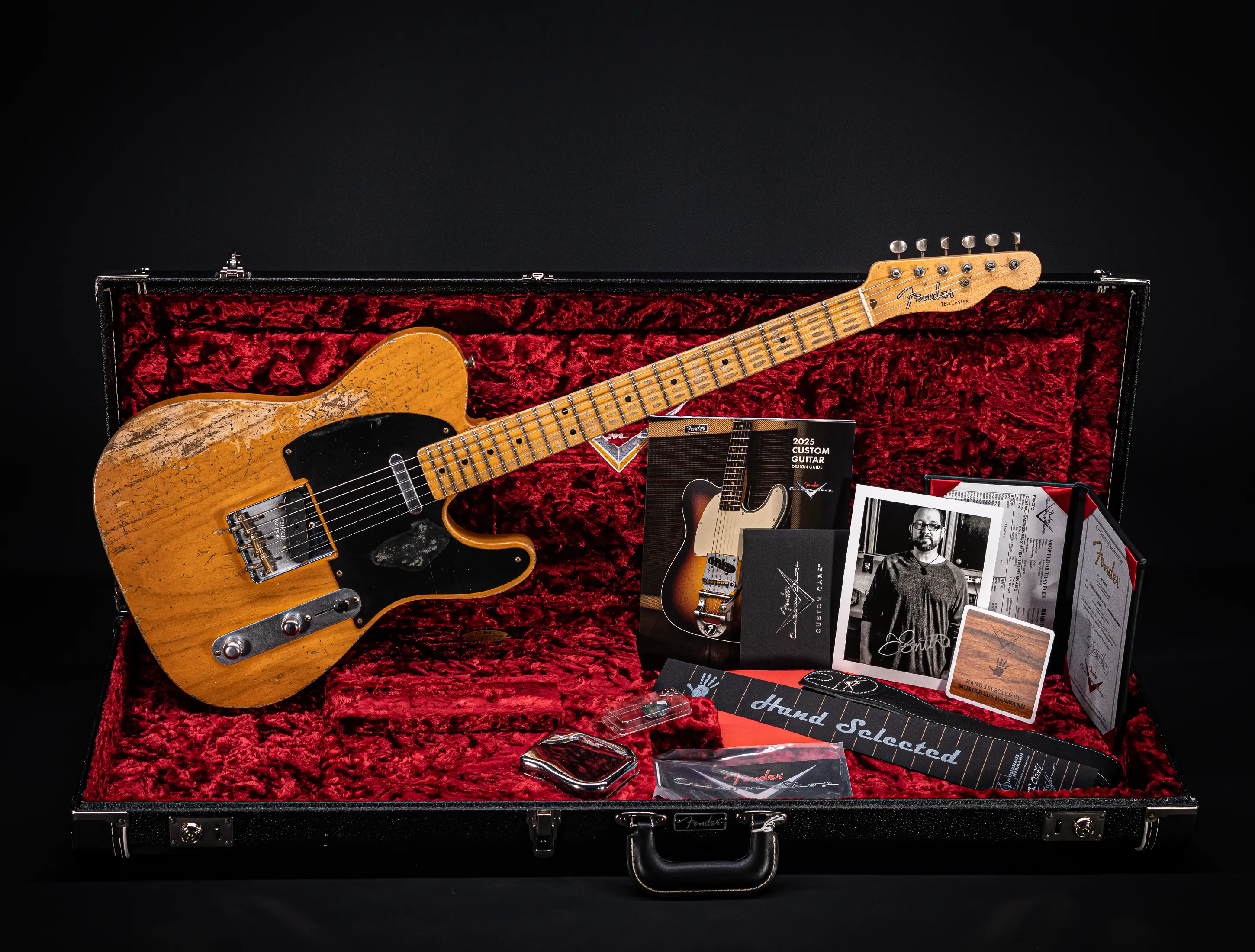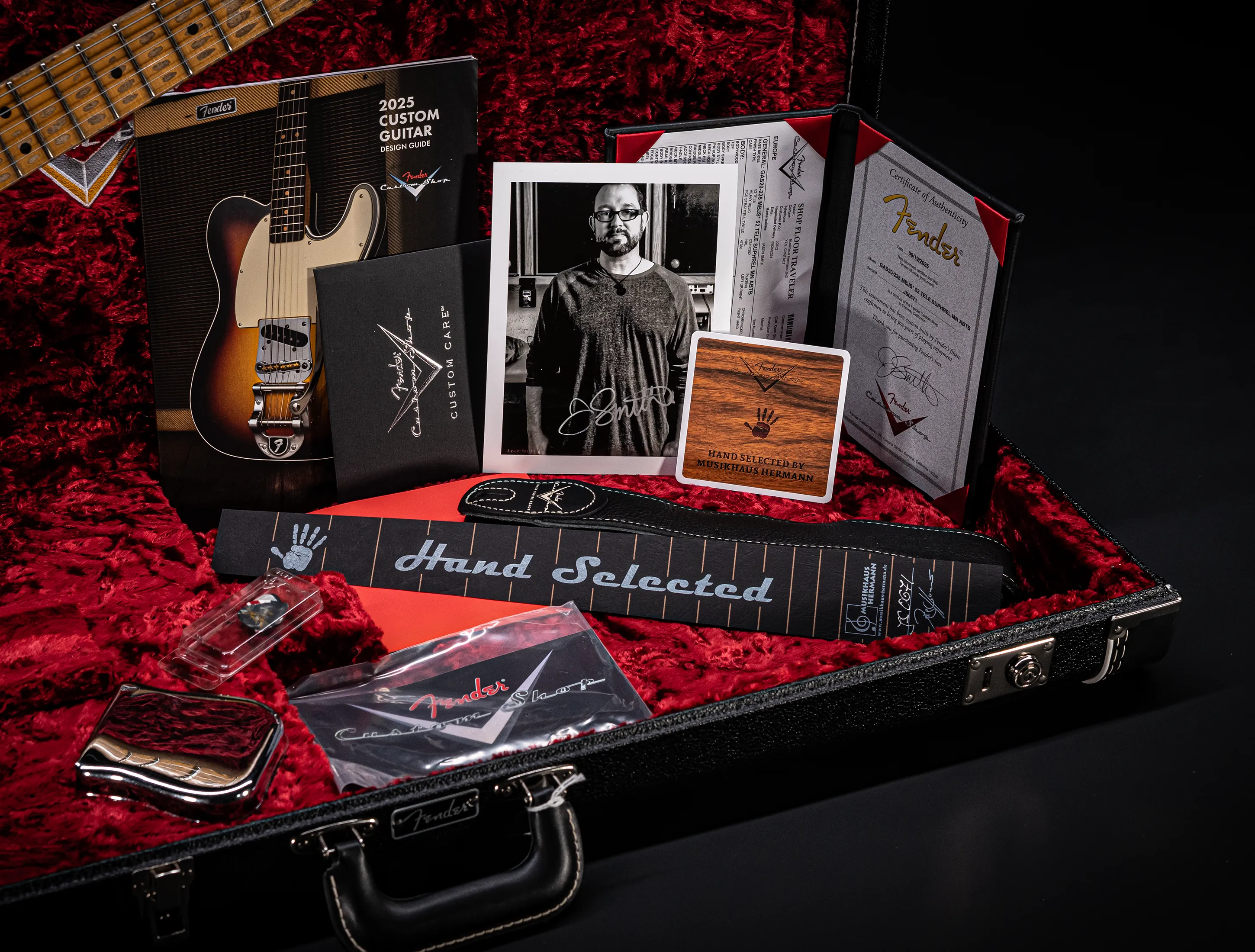 - Zubehör-Kit (Custom-Shop Gitarrengurt, Brückenabdeckung "Ashtray", Pflegehinweise & Plectren)