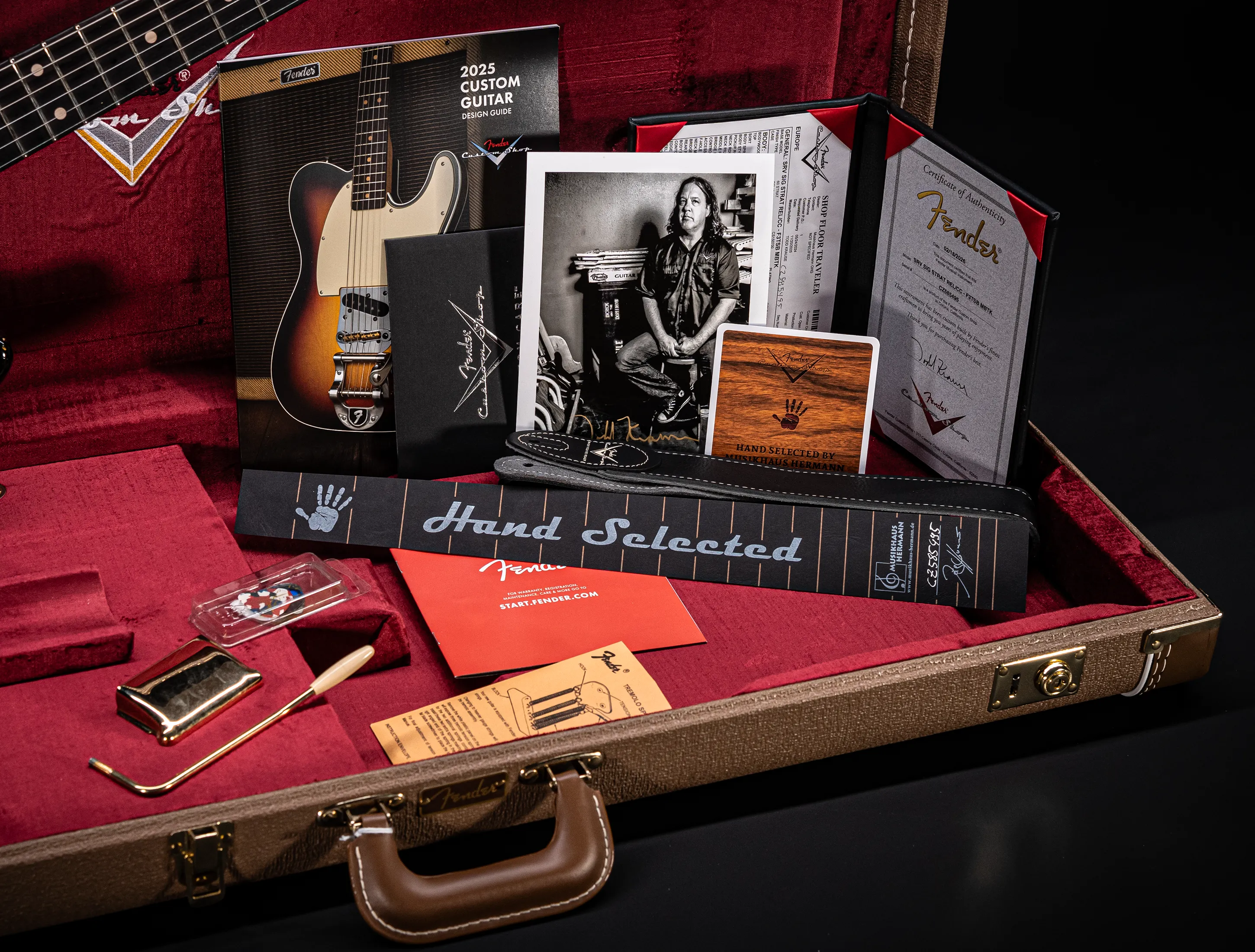 - Zubehör-Kit (Custom-Shop Gitarrengurt, Tremoloarm, Pflegehinweise & Plectren)