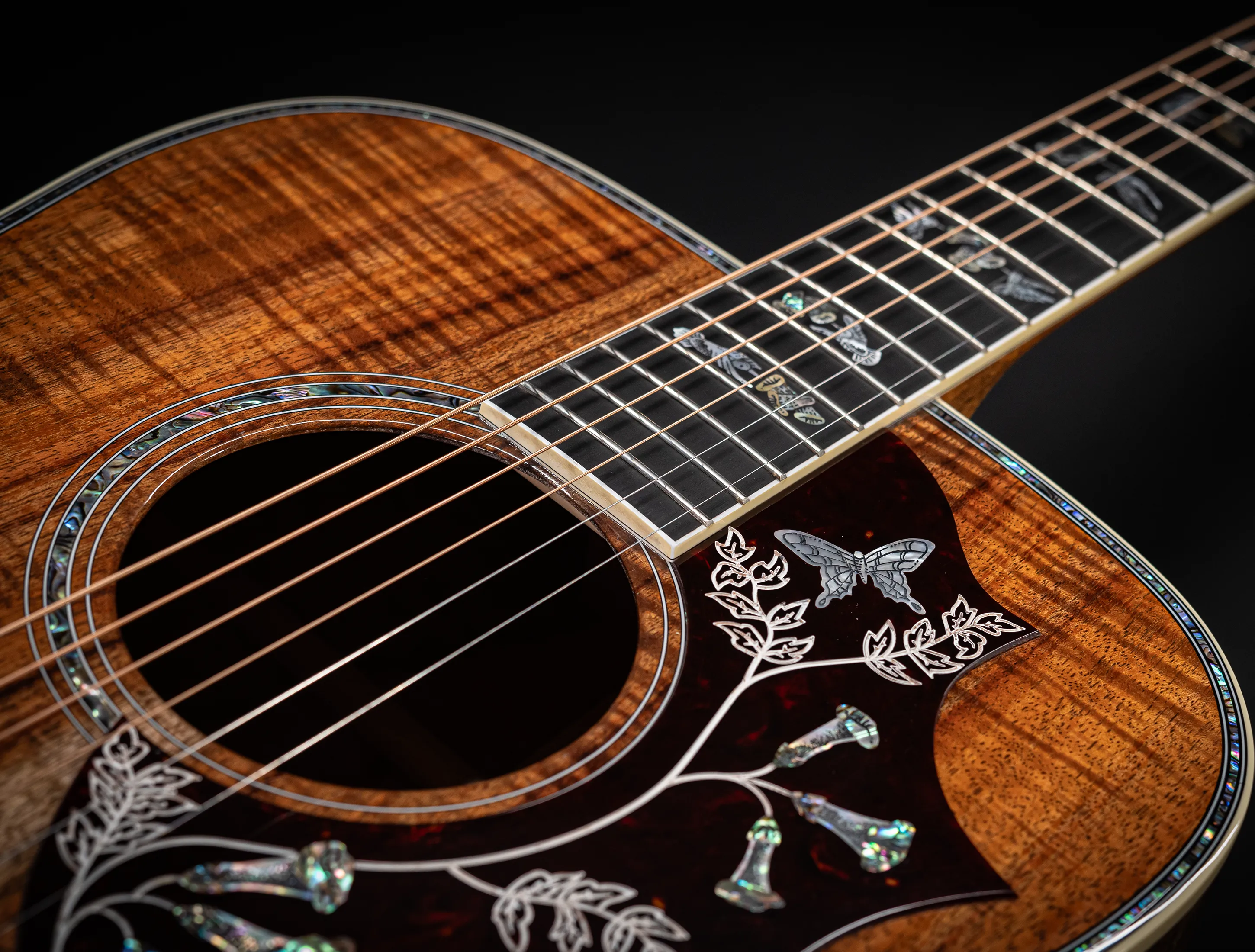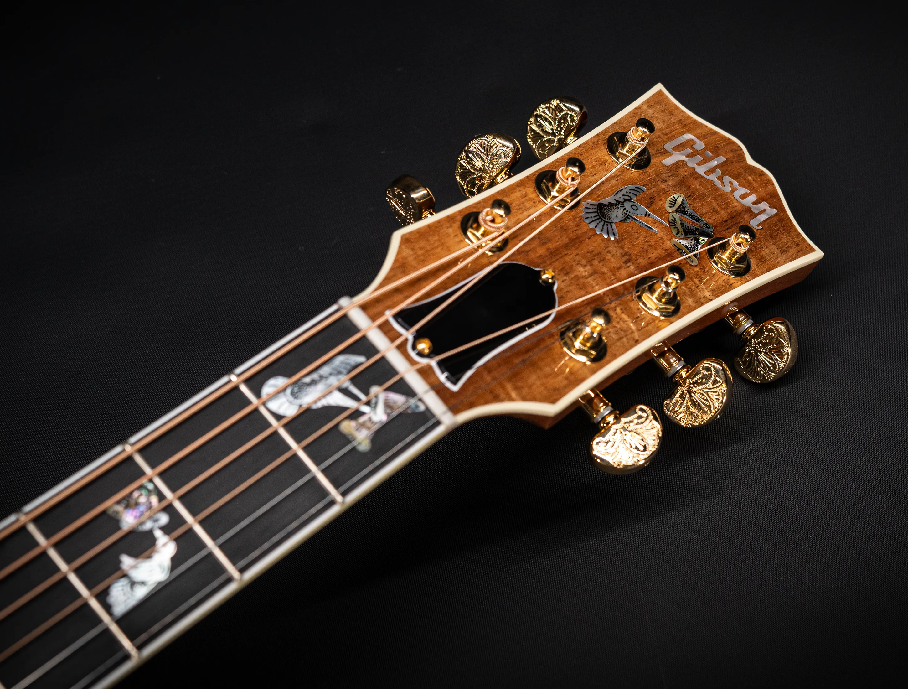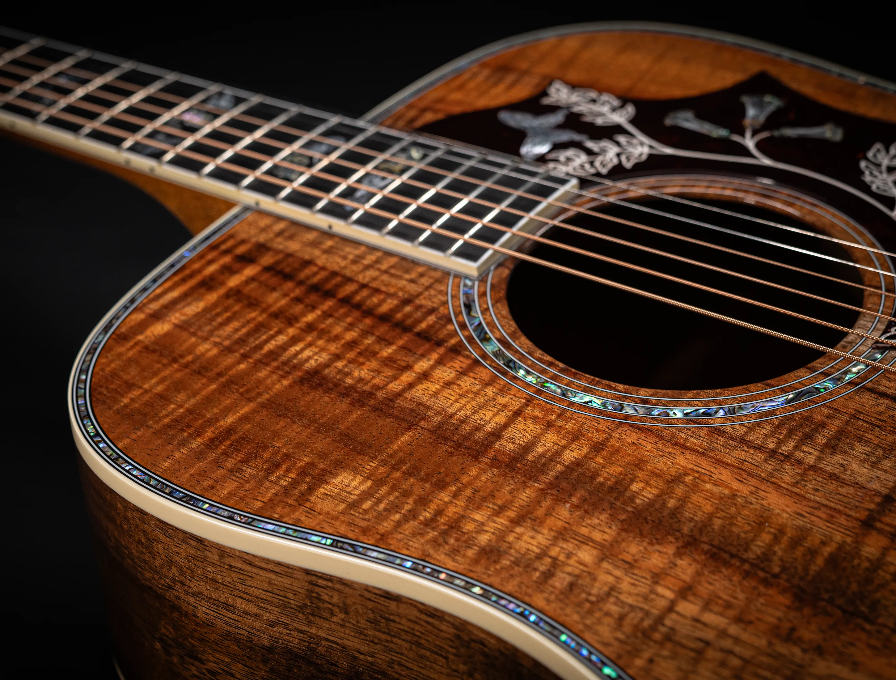 Zu den optischen Highlights zählen neben dem außergewöhnlichen Koa-Korpus die von Hand eingefassten Abalone-Einlagen sowie das kunstvoll verzierte Schlagbrett. Auch das Ebenholzgriffbrett ist mit den klassischen Hummingbird-Inlays aus Abalone versehen. Randeinlagen, Steg, Kopfplatte und Rosette greifen dieses edle Design konsequent auf. Die goldfarbenen Mechaniken mit gravierten Endknöpfen runden das Gesamtbild perfekt ab.