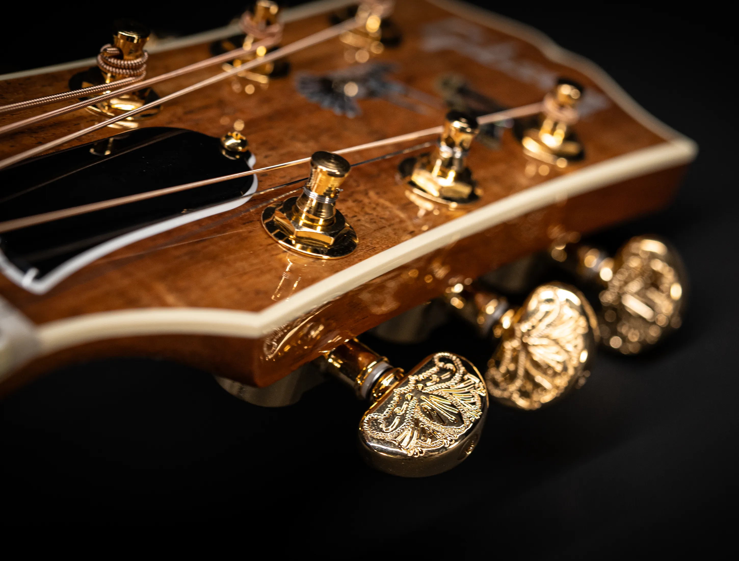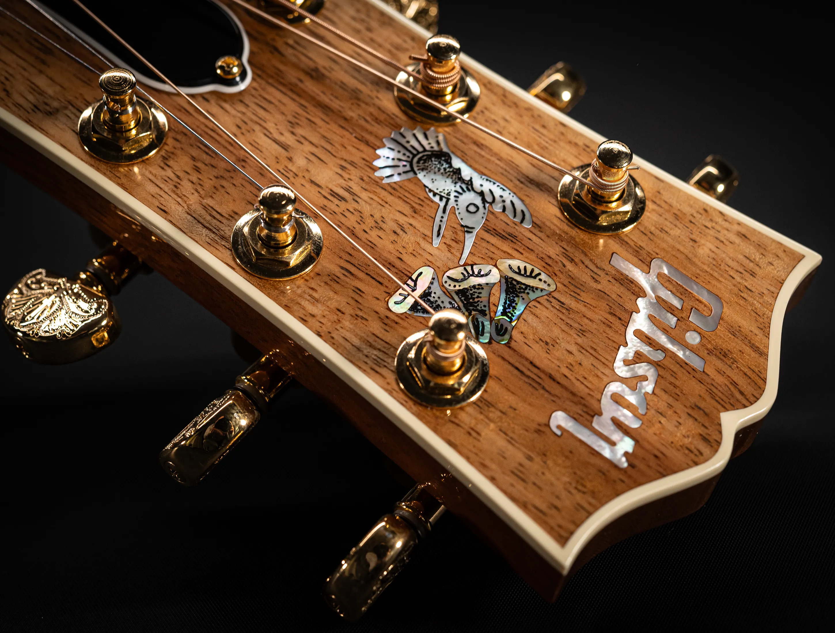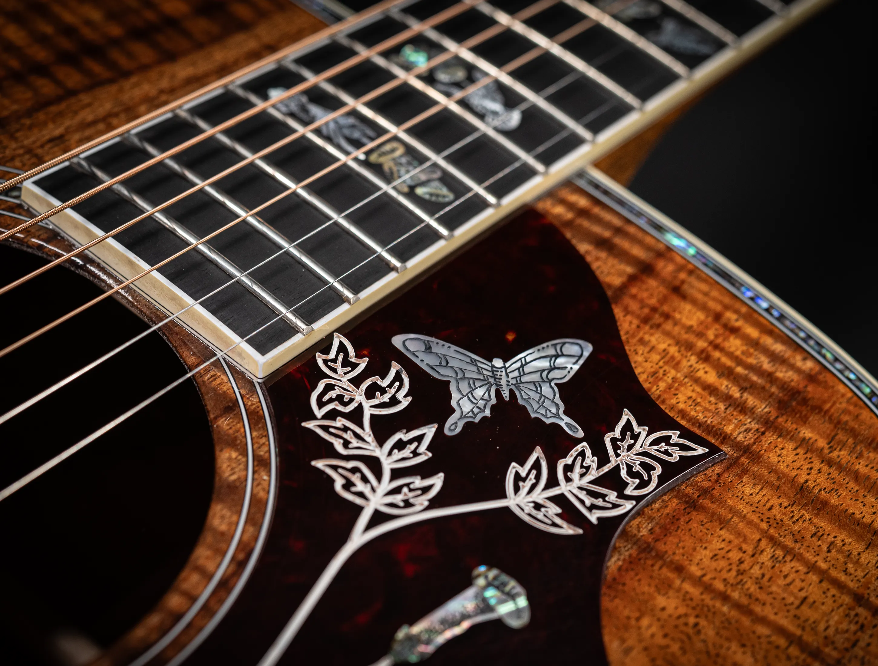 Zu den optischen Highlights zählen neben dem außergewöhnlichen Koa-Korpus die von Hand eingefassten Abalone-Einlagen sowie das kunstvoll verzierte Schlagbrett. Auch das Ebenholzgriffbrett ist mit den klassischen Hummingbird-Inlays aus Abalone versehen. Randeinlagen, Steg, Kopfplatte und Rosette greifen dieses edle Design konsequent auf. Die goldfarbenen Mechaniken mit gravierten Endknöpfen runden das Gesamtbild perfekt ab.