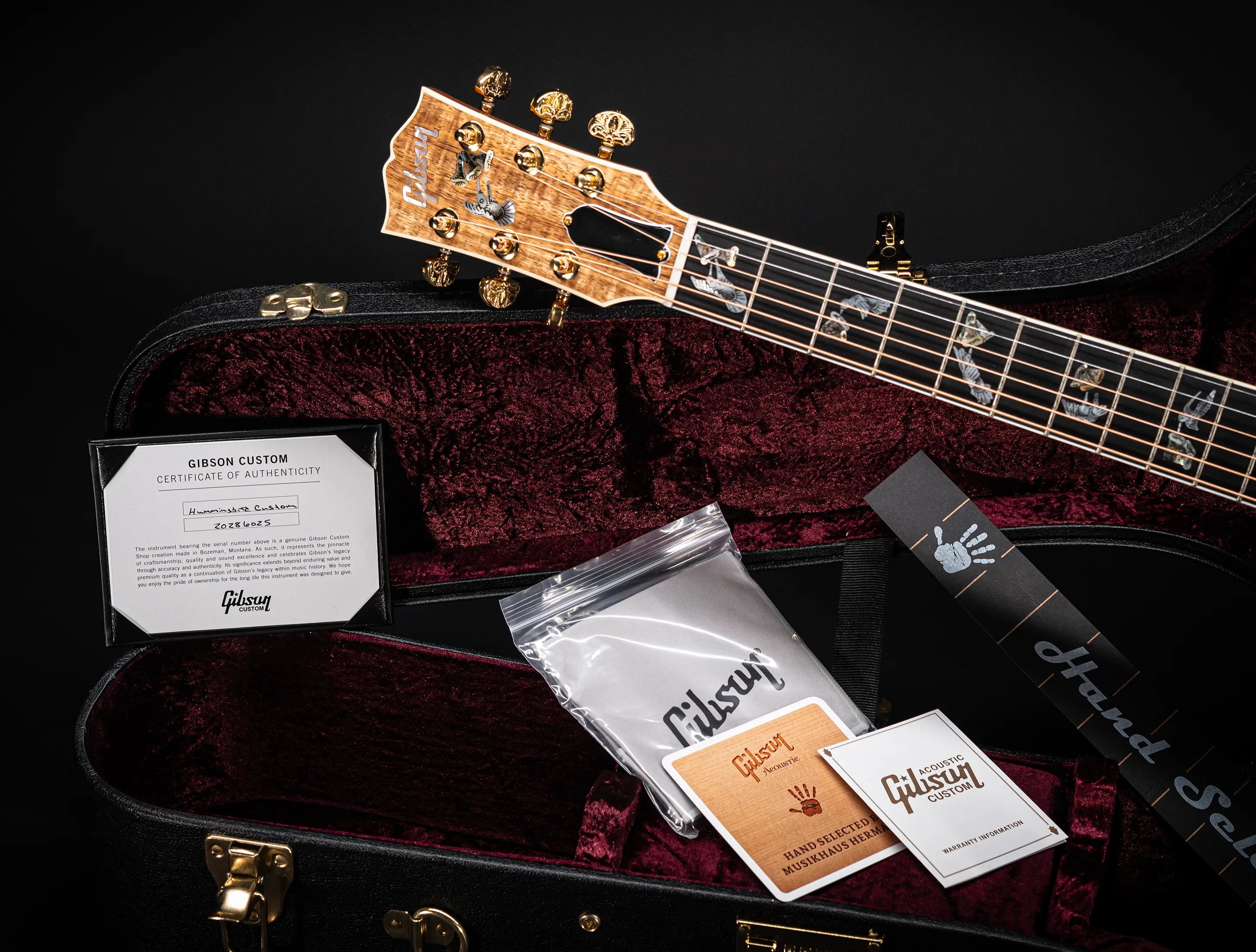 Jörg Hermann hat in enger Zusammenarbeit mit dem Gibson Custom Shop in Bozeman, Montana, diese außergewöhnlich edle Version der legendären Hummingbird entworfen. Auch bei diesem Modell aus unserer Exklusiv-Serie stand der Gedanke im Mittelpunkt, eine optisch herausragende Gitarre – was zweifellos gelungen ist – mit ebenso beeindruckenden "inneren Werten" zu vereinen.