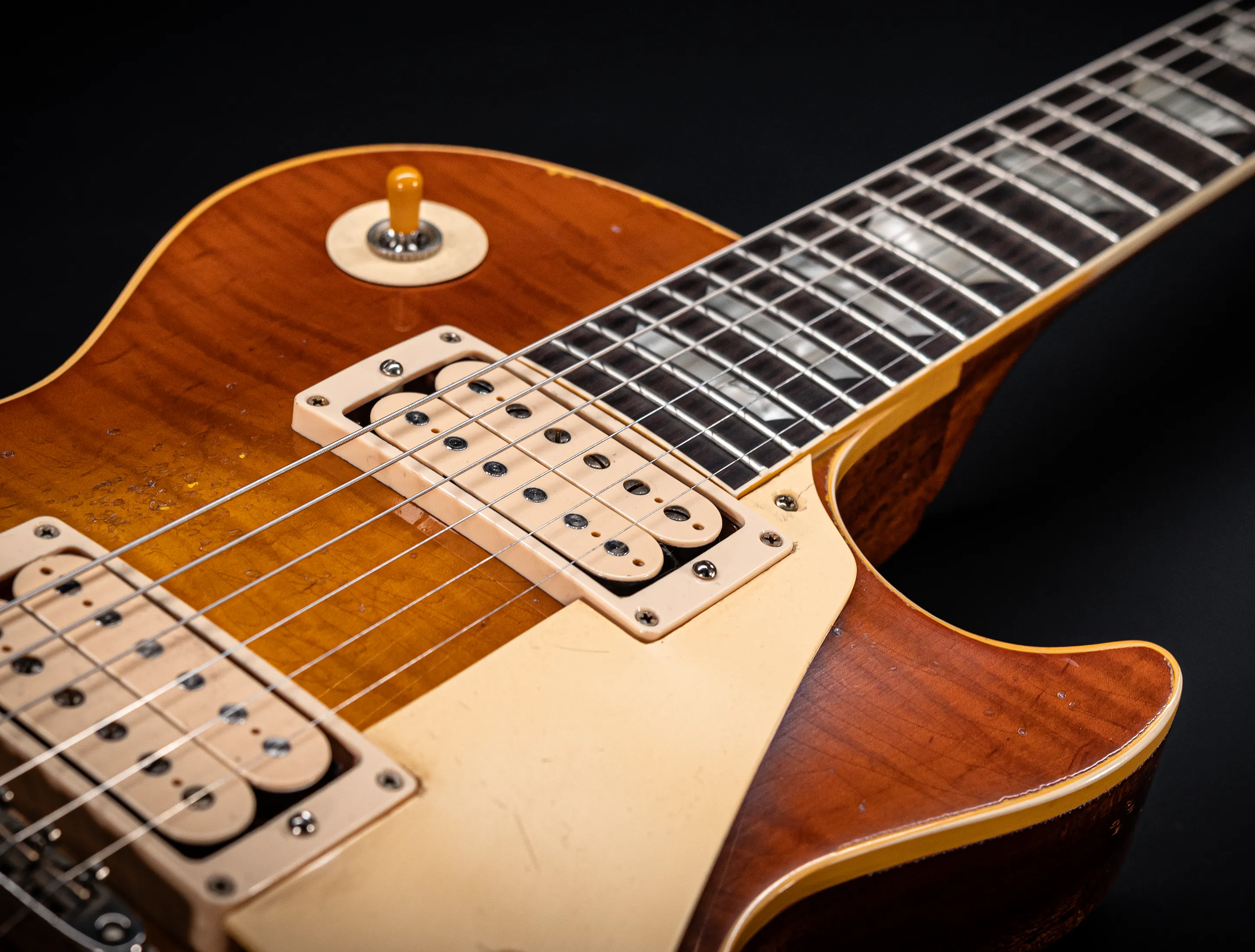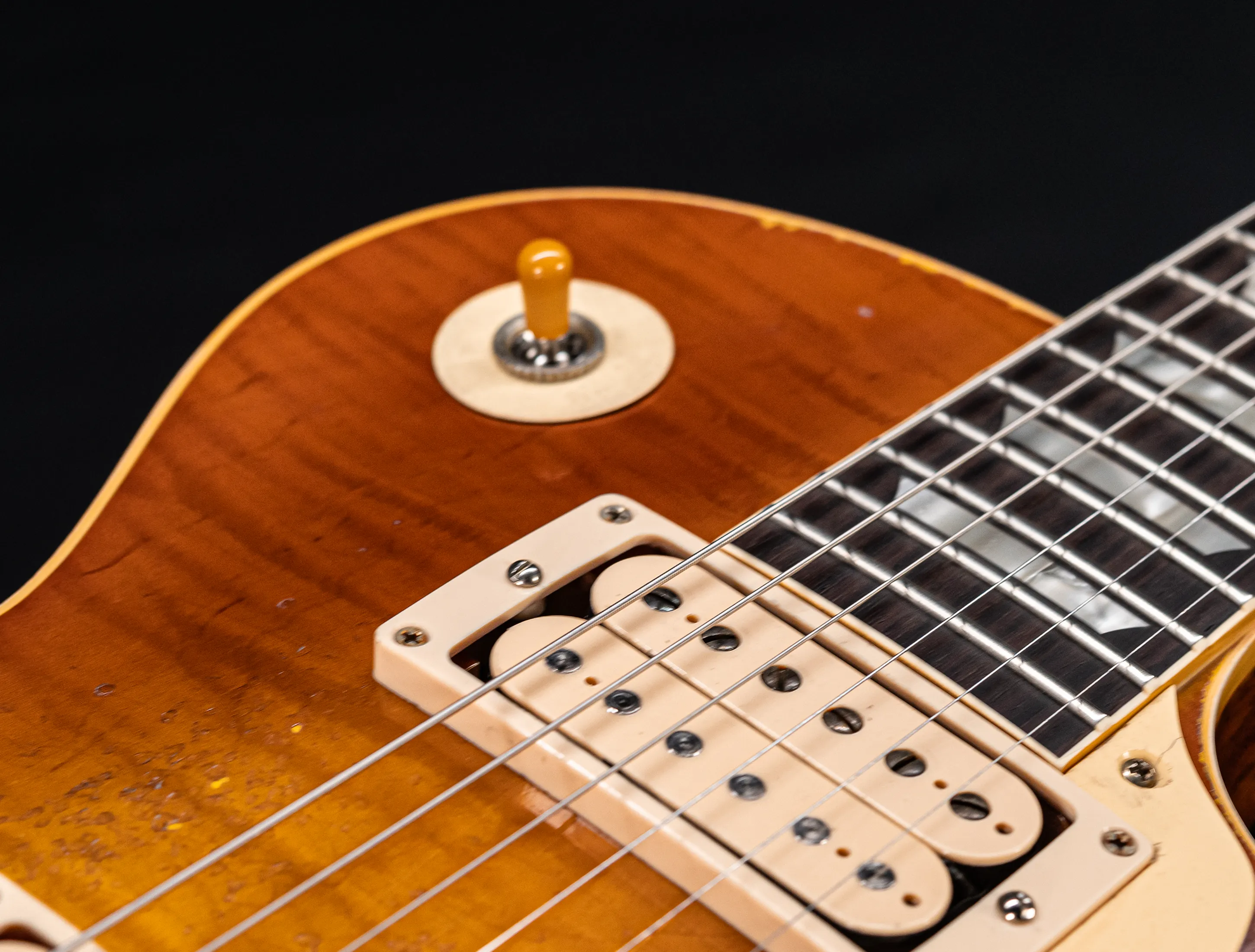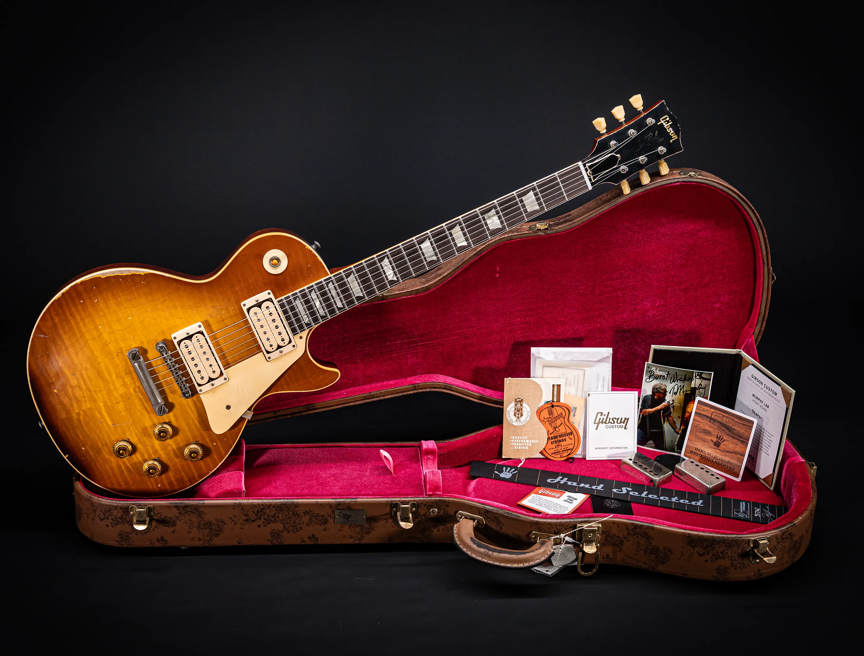Die Sonderfarbe "Antique Honey Burst with Dark Shadow, die dazu passende, handselektierte R9 Premium Flame Decke sowie die passende Murphy LAB Heavy Aged Behandlung lassen diese Les Paul zu einem ganz besonderen Highlight werden. Und natürlich dürfen hier die passenden Tonabnehmer nicht fehlen, darum wurden für diese Gitarre selbstverständlich die original Custom Shop - CustomBucker Aged AL3 15.5" UNPOTTED Alnico 3 Double White verbaut !!!