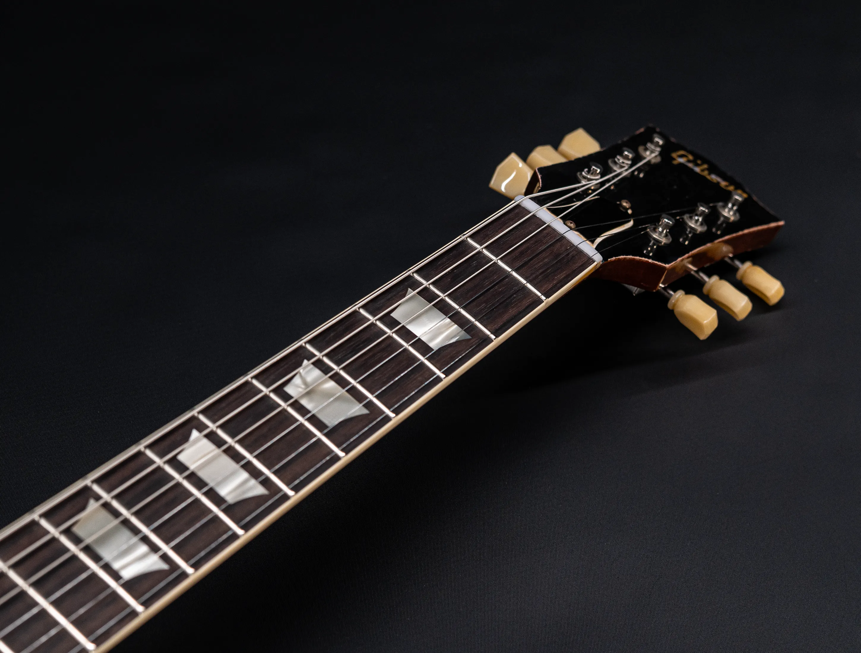 - Griffbrettmaterial: einteiliger, dunkler indischer Palisander (extra dunkel selektiert)