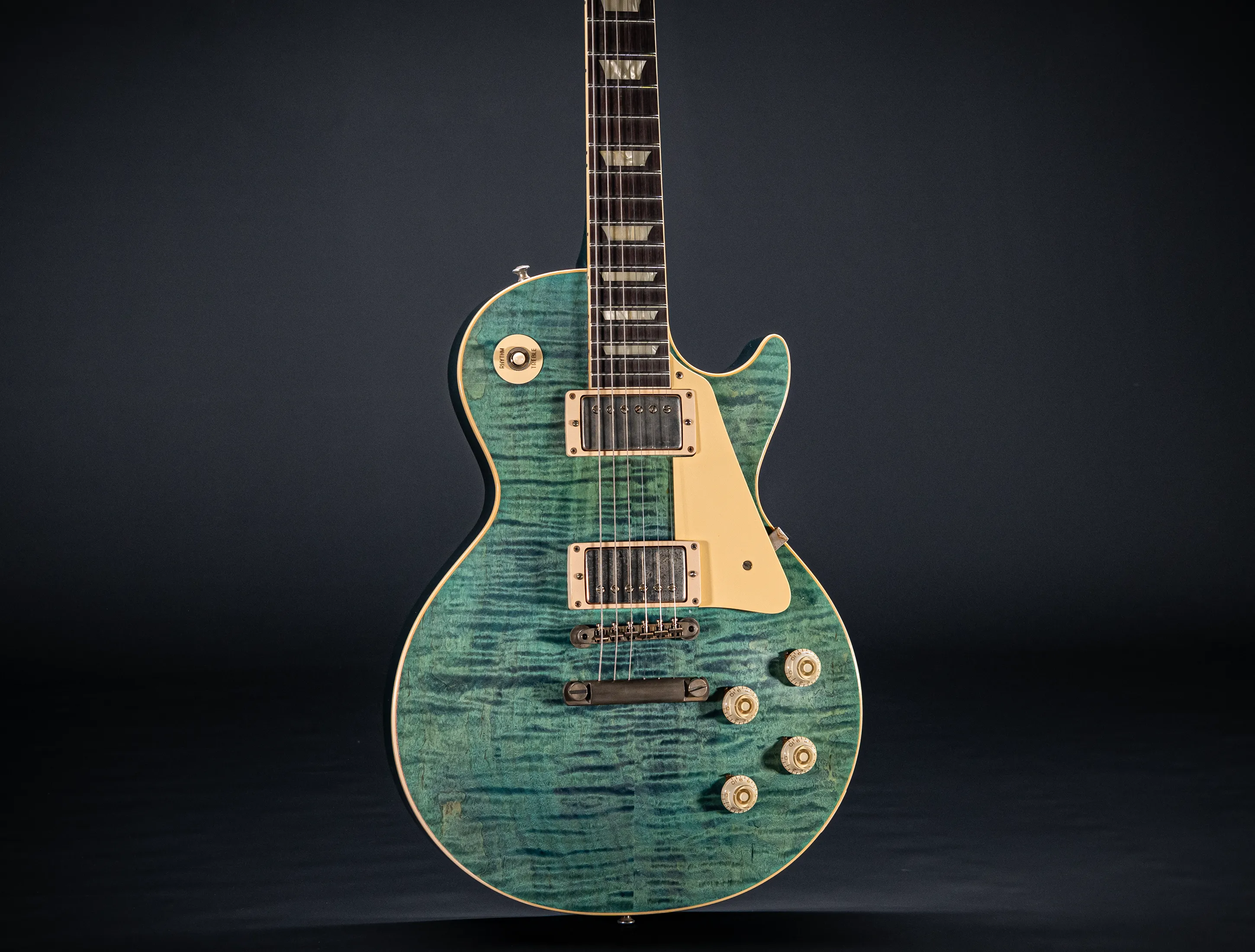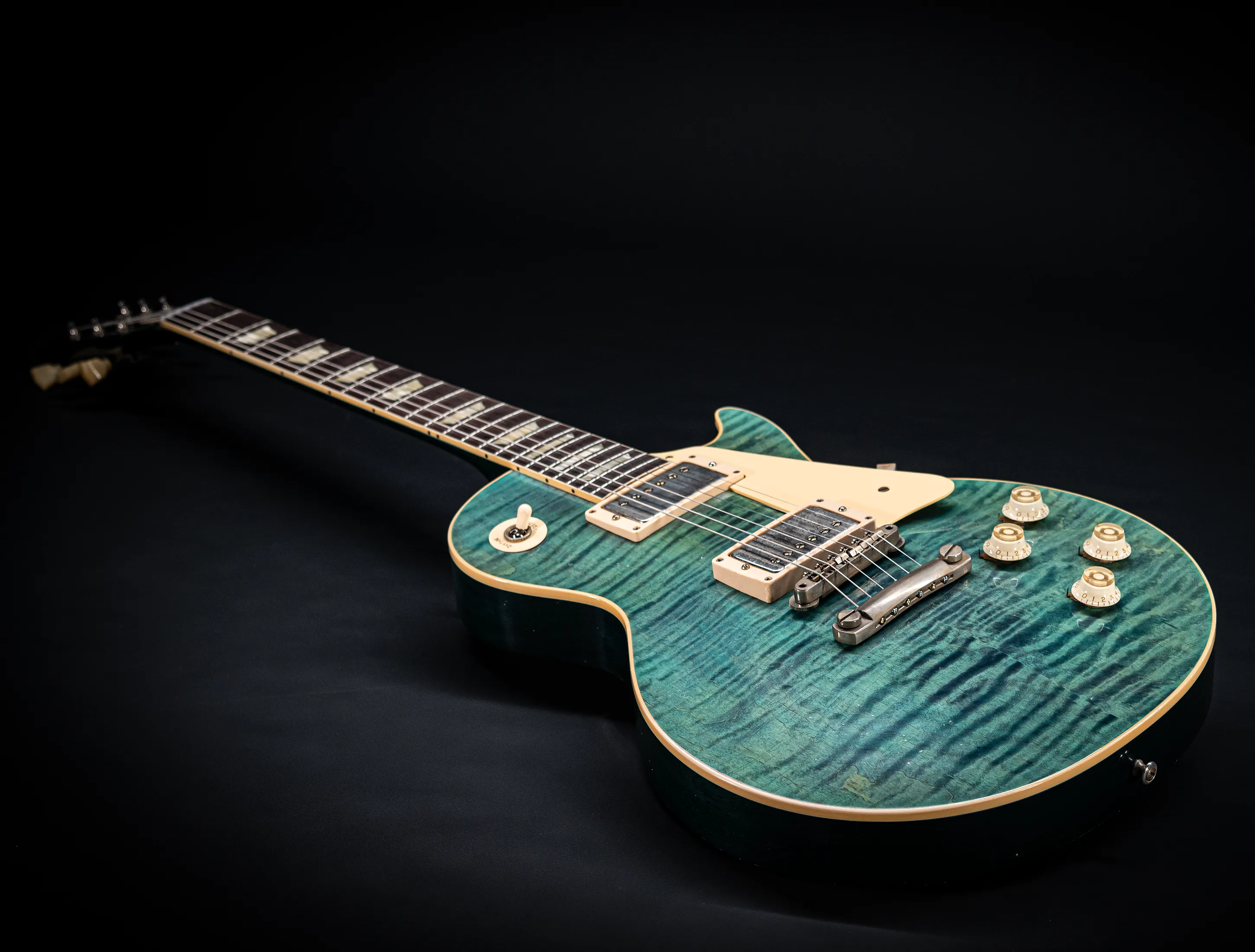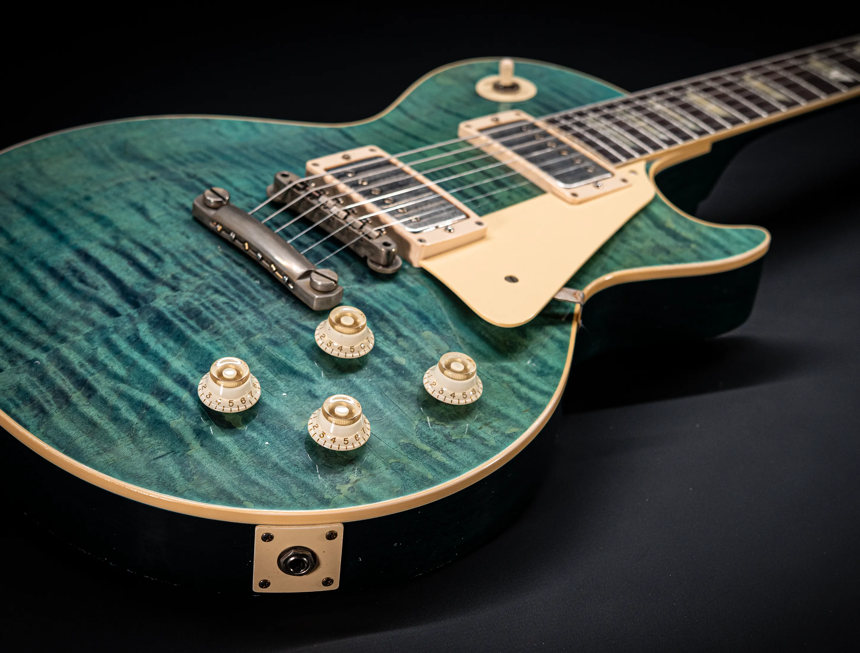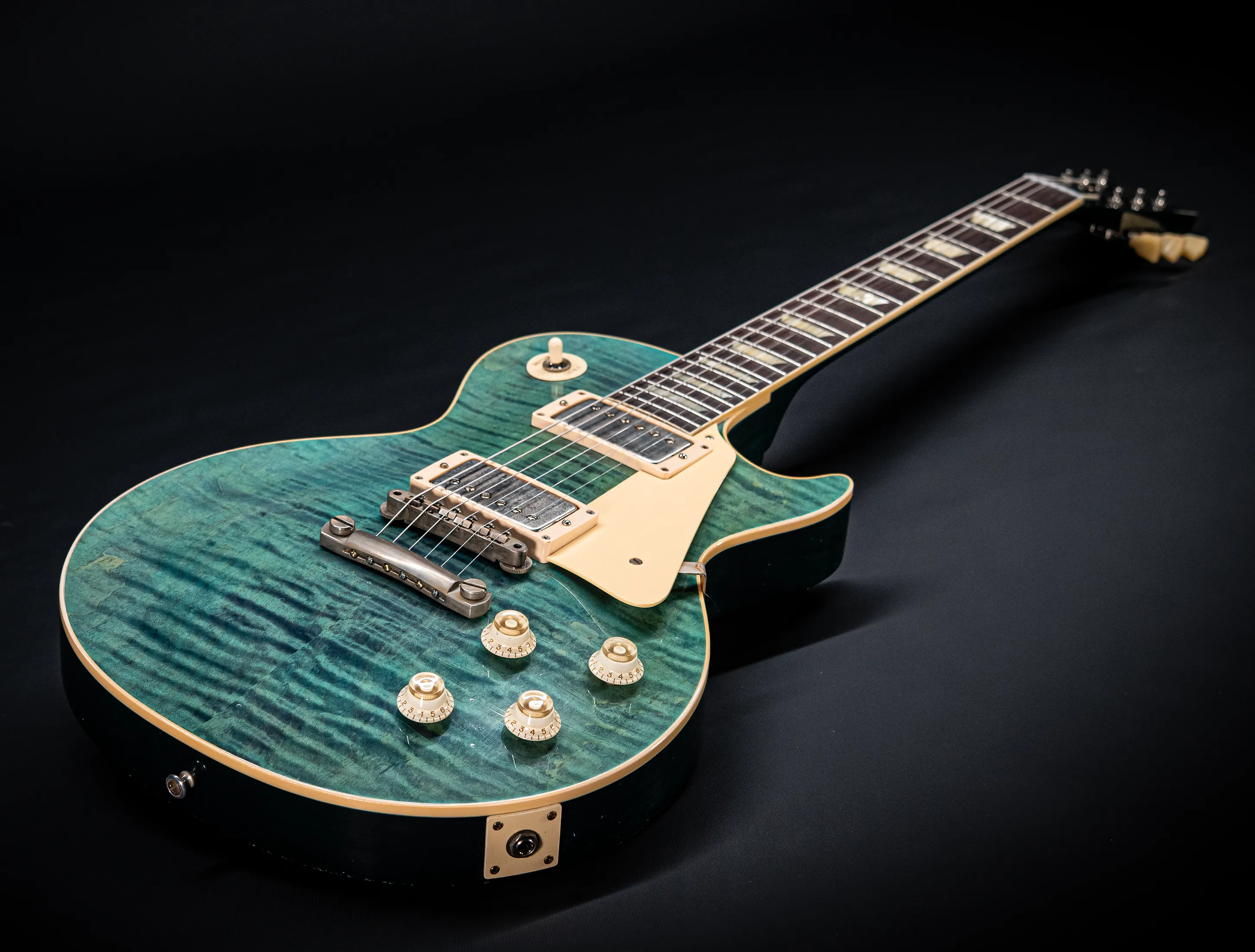 Die Sonderfarbe Transparent Laguna Blue "UNBUSRT", die dazu handselektierte premium Flame Decke sowie die passende Murphy LAB light aged Behandlung lassen diese Les Paul zu einem ganz besonderen Highlight werden. Und natürlich dürfen hier die passenden Tonabnehmer nicht fehlen, darum wurden für diese Gitarre selbstverständlich die original Custom Shop - CustomBucker Aged AL3 15.5" unpotted verbaut - was für eine Ansage !!!