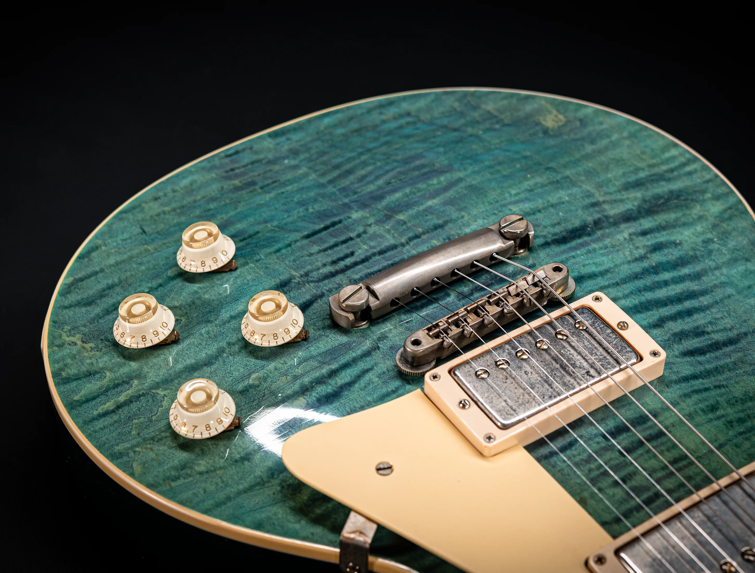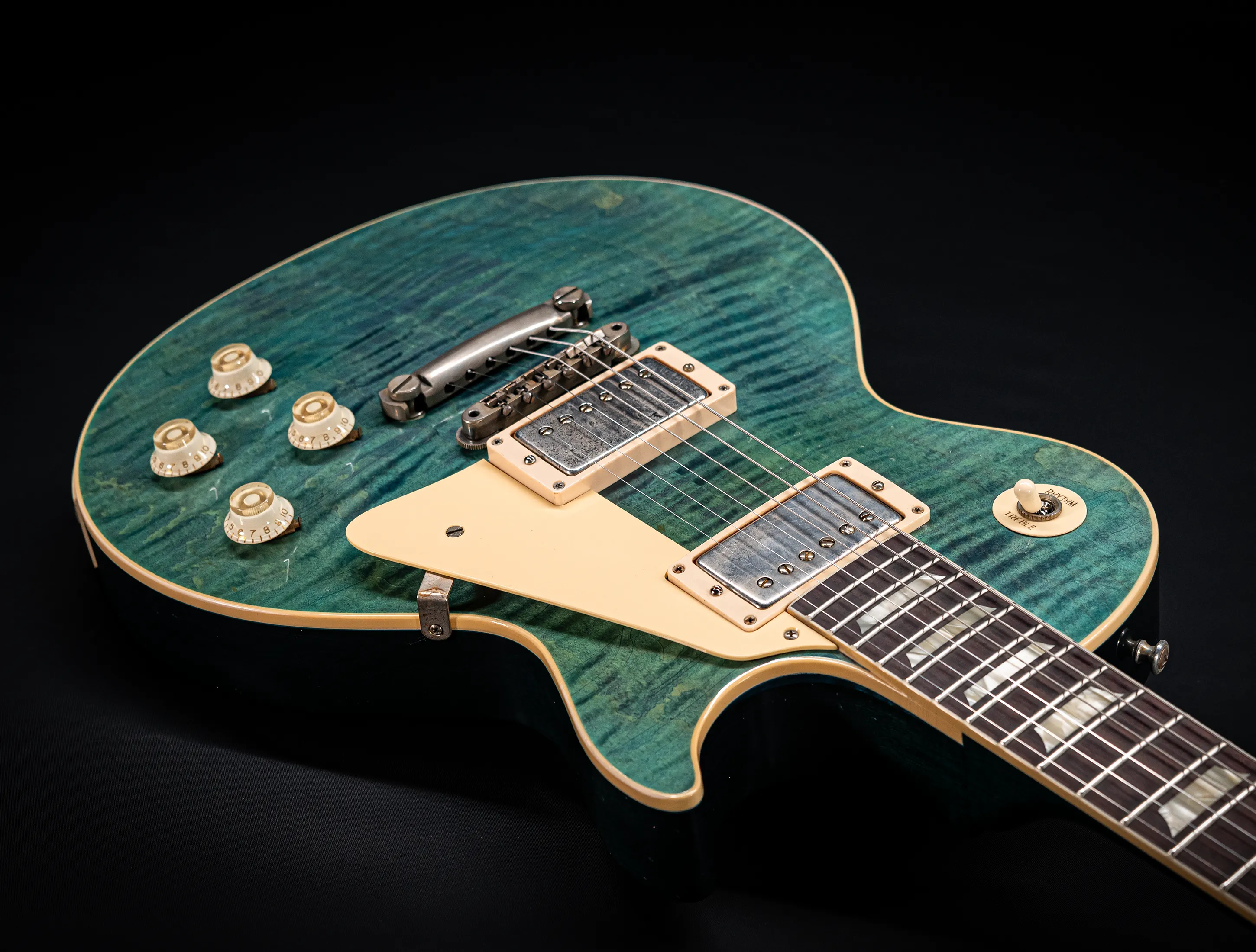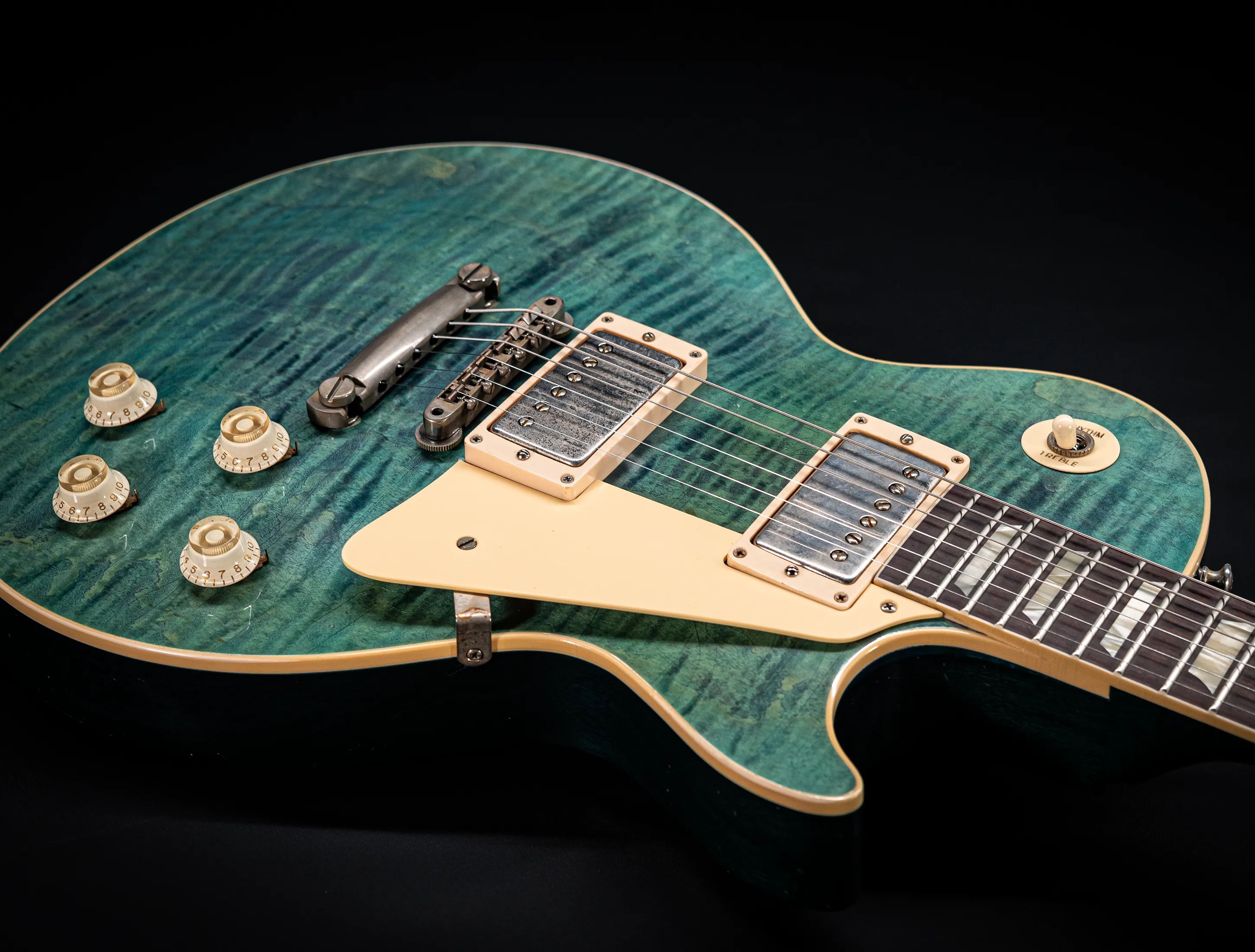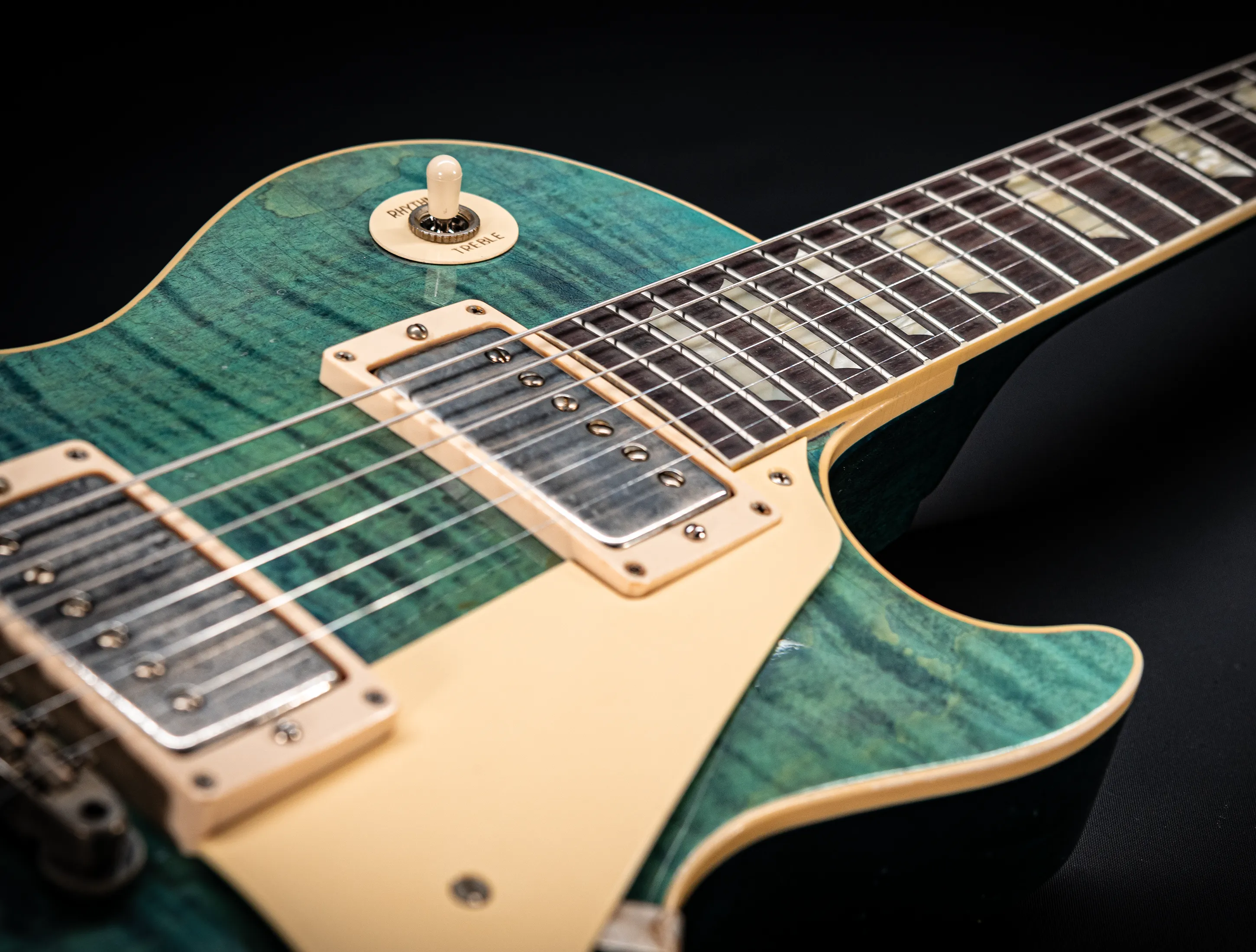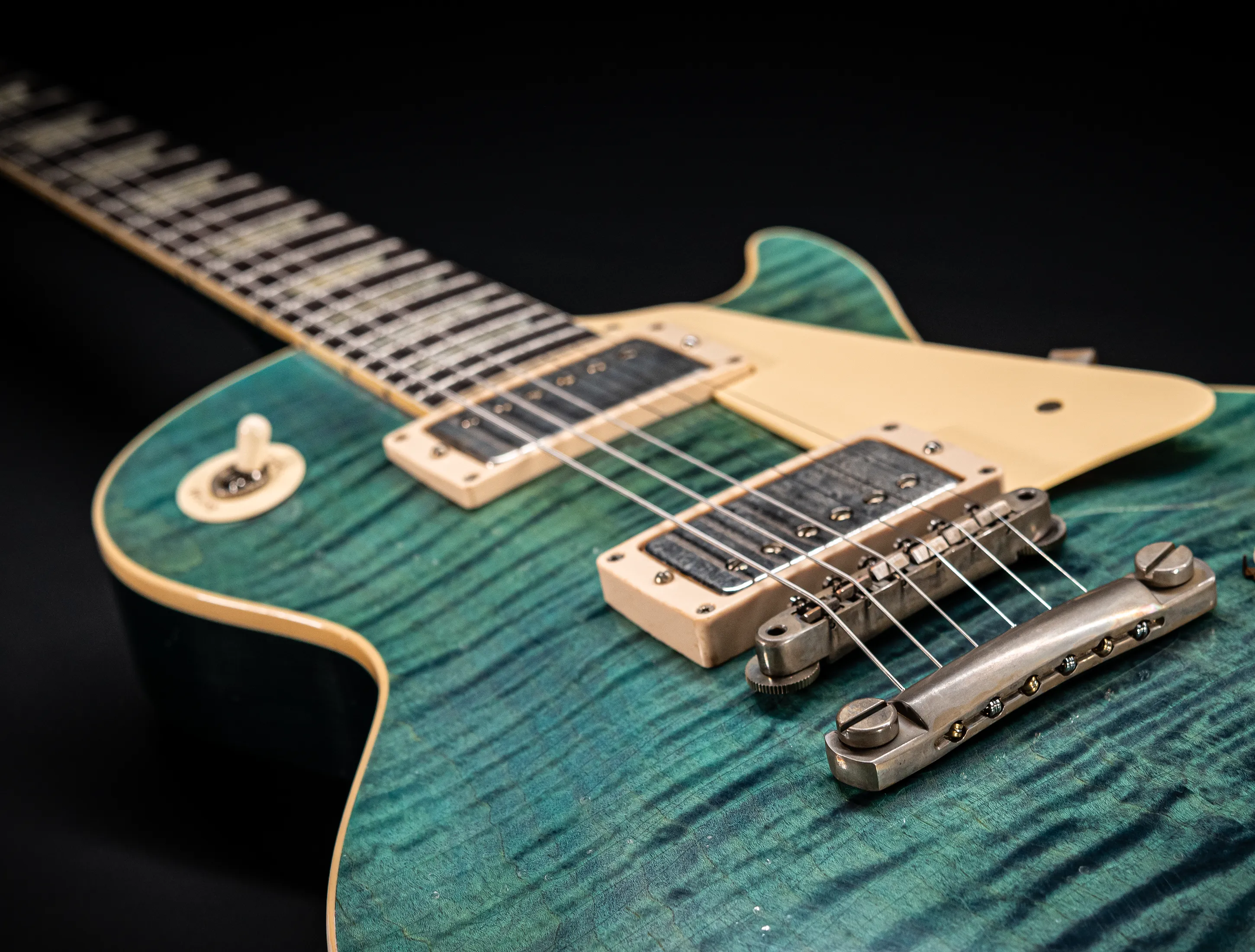 Die Sonderfarbe Transparent Laguna Blue "UNBUSRT", die dazu handselektierte premium Flame Decke sowie die passende Murphy LAB light aged Behandlung lassen diese Les Paul zu einem ganz besonderen Highlight werden. Und natürlich dürfen hier die passenden Tonabnehmer nicht fehlen, darum wurden für diese Gitarre selbstverständlich die original Custom Shop - CustomBucker Aged AL3 15.5" unpotted verbaut - was für eine Ansage !!!