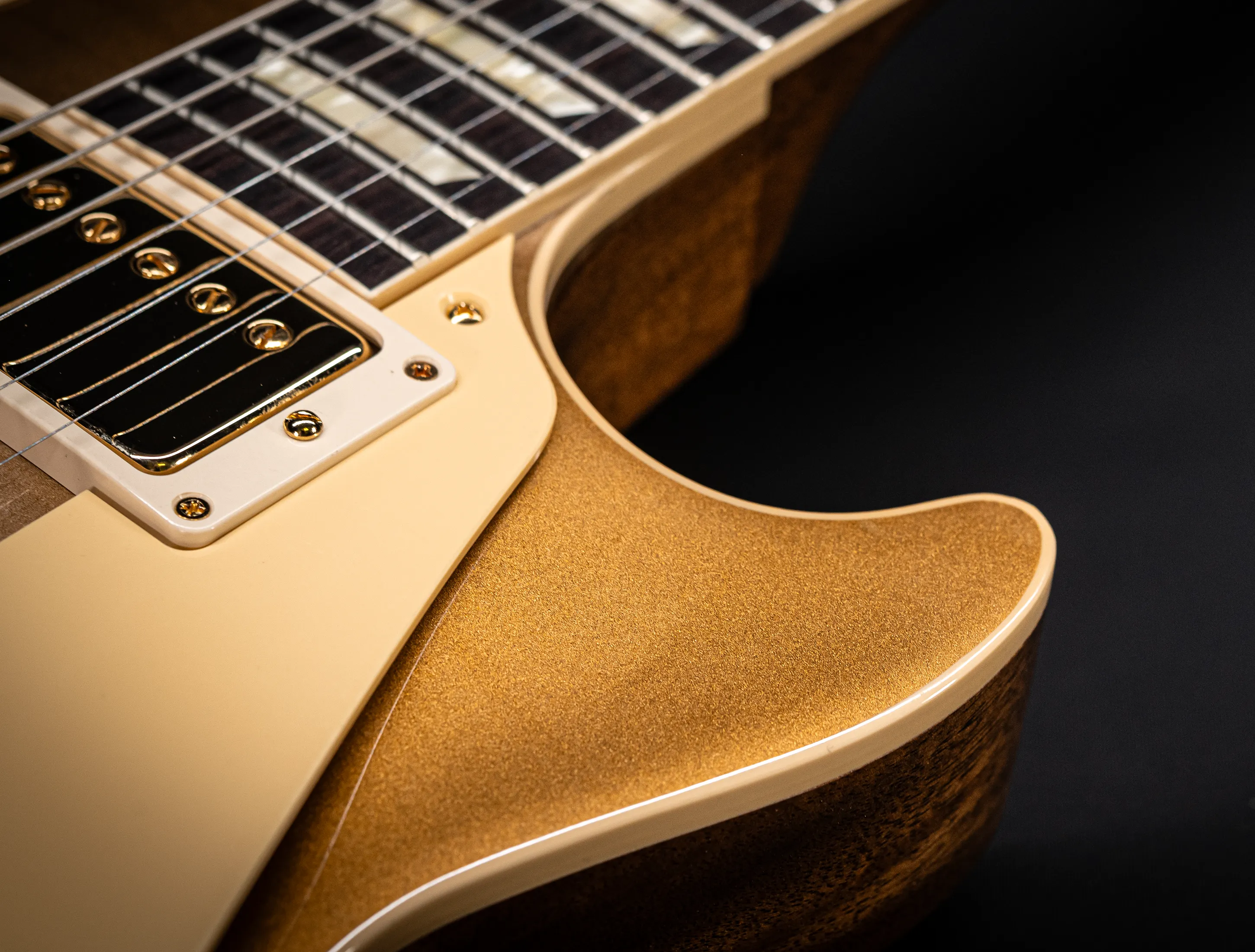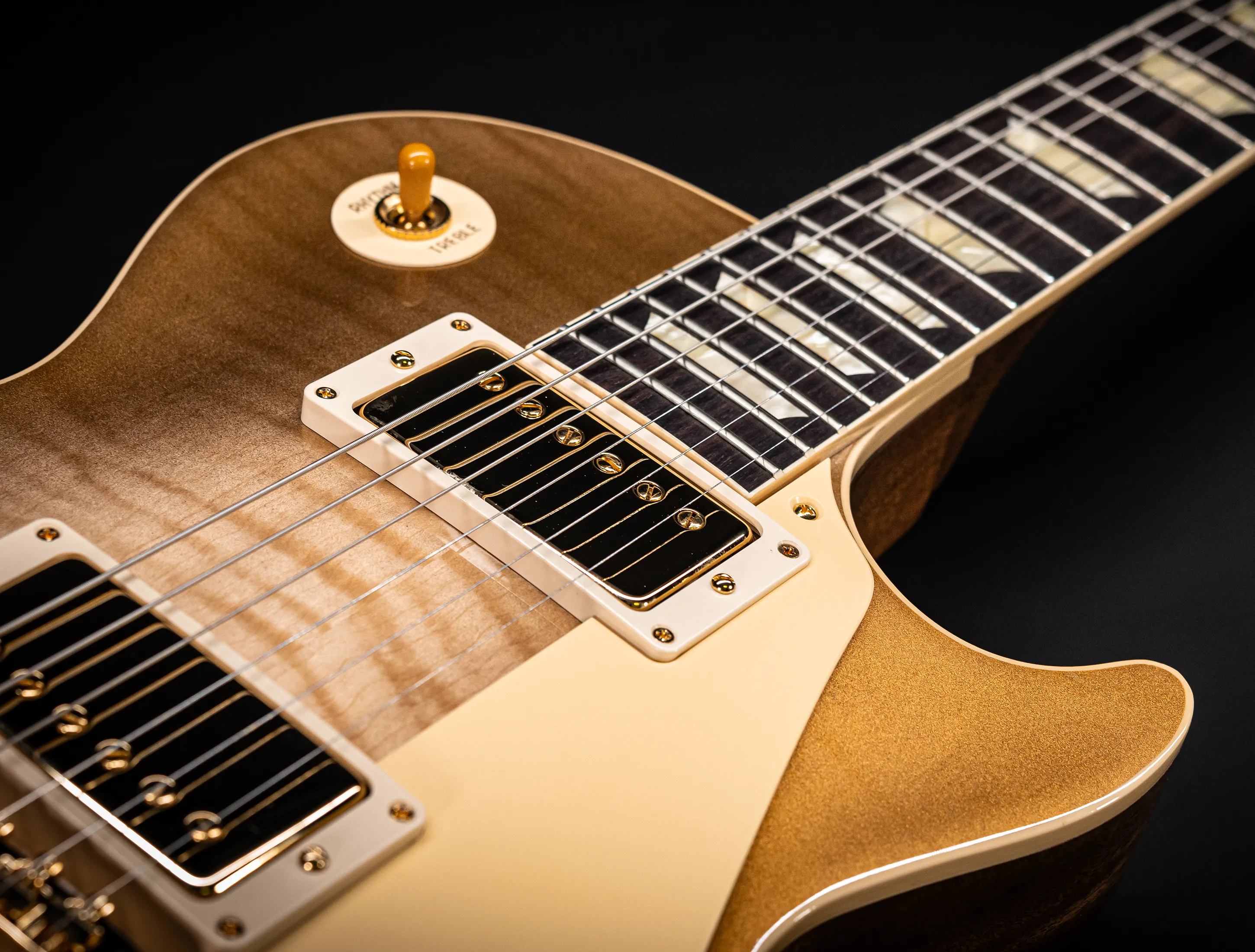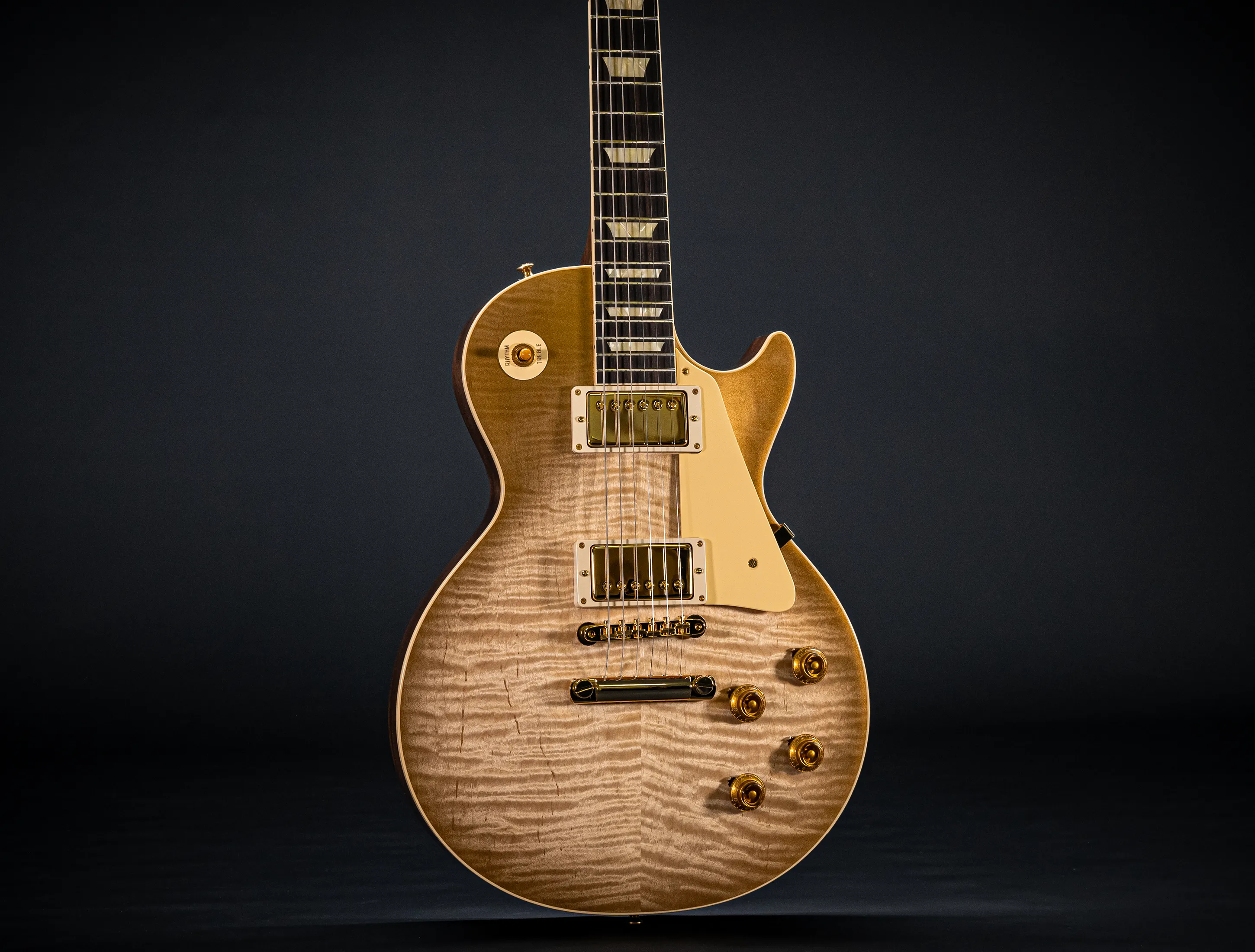 Die Gibson 1959 Les Paul Standard Reissue ist eine Legende unter den Gitarren - wenn nicht DIE Gitarre aus dem Hause Gibson und präsentiert sich hier in der Weißwein-Farbe "Bianco-Wine Burst" als optischen Gaumenkitzler. Bei genauem Hinschauen merkt man, dass es sich um ein ganz besonderes „Burst“ handelt, nämlich einem Transparent Gold-Burst, welches so perfekt, harmonisch und absolut unikatmäßig der Gitarre schmeichelt. Als würde man ein Glas Weißwein gehen die Sonne halten und die goldenen Sonnenstrahlen einfangen. Absolutes Alleinstellungsmerkmal!