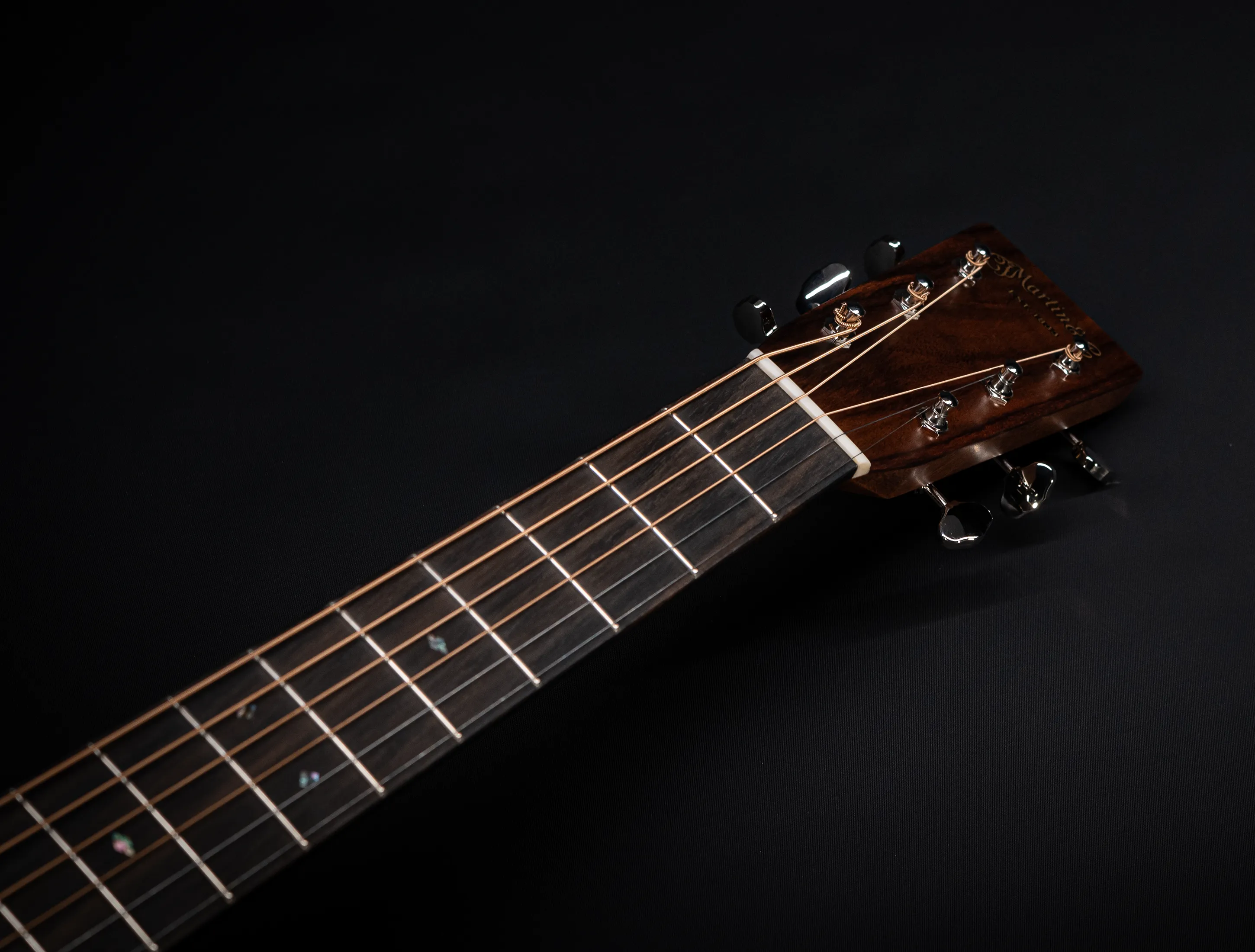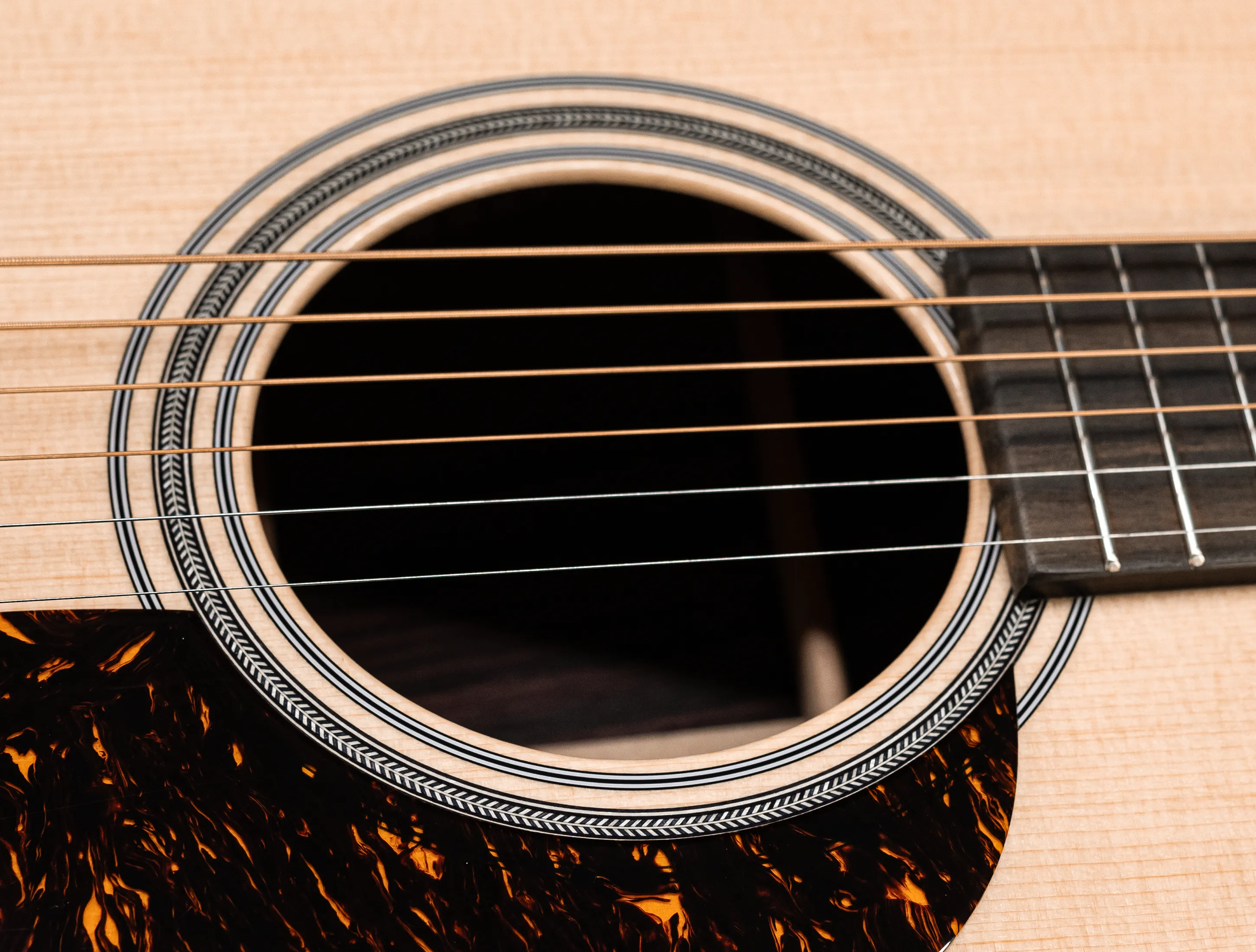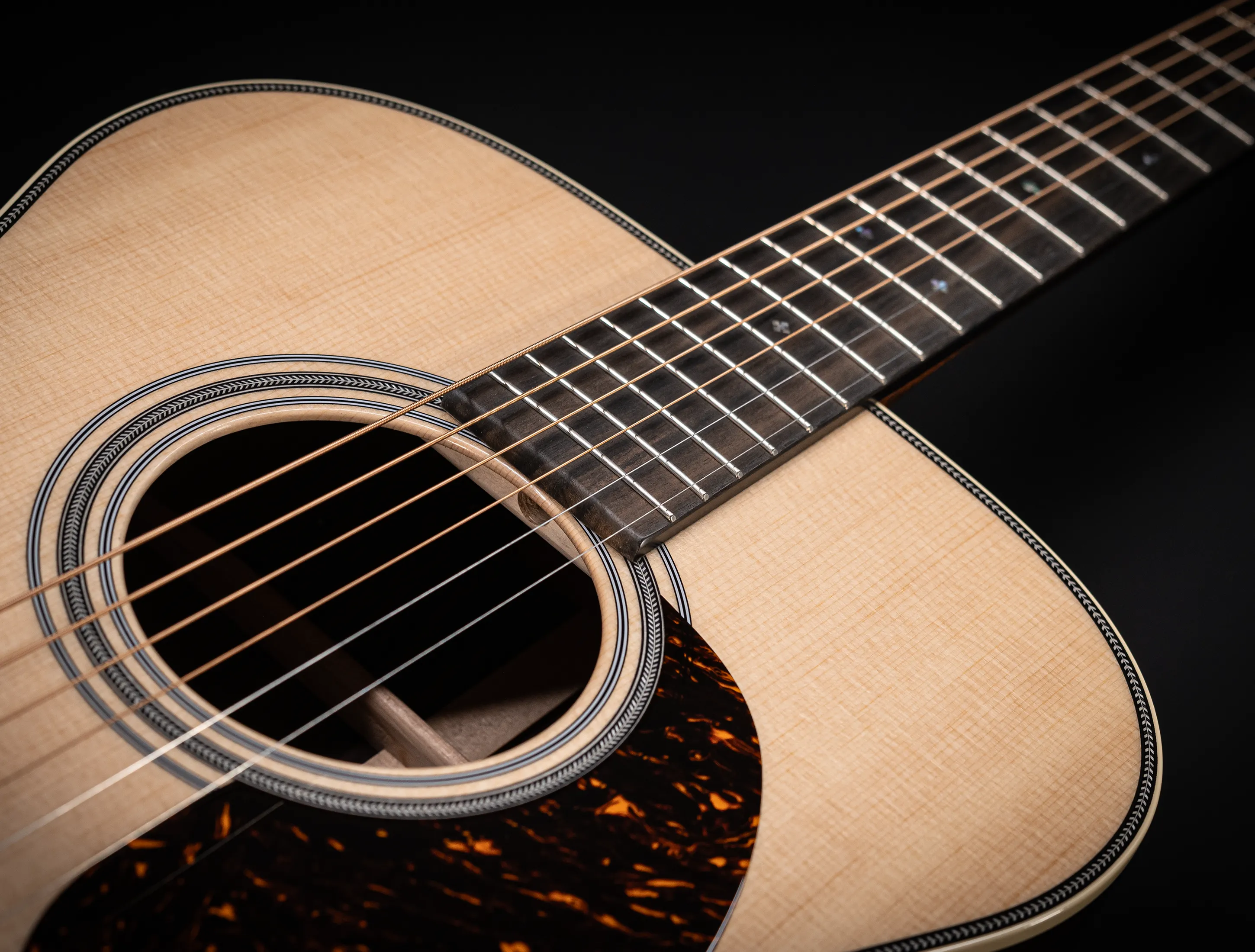 Optisch ist die 000-28 nahe an die klassischen Vintage-Modelle von Martin angelehnt. Dazu die hochwertigen, offenen Mechaniken für eine hervorragende Stimmstabilität, das Faux-Tortois-Schlagbrett und natürlich die typische Herringbone-Verzierung um den Korpus.