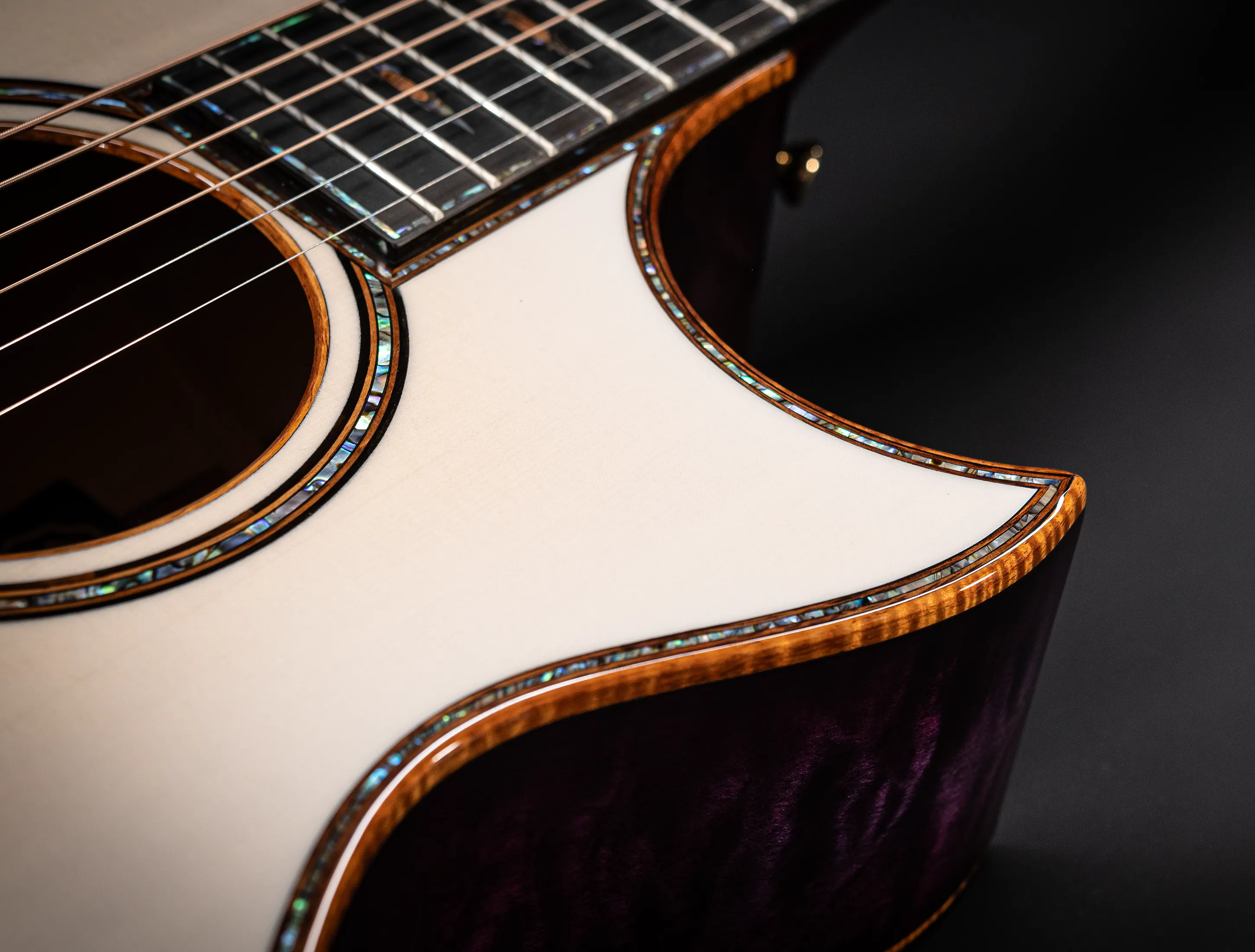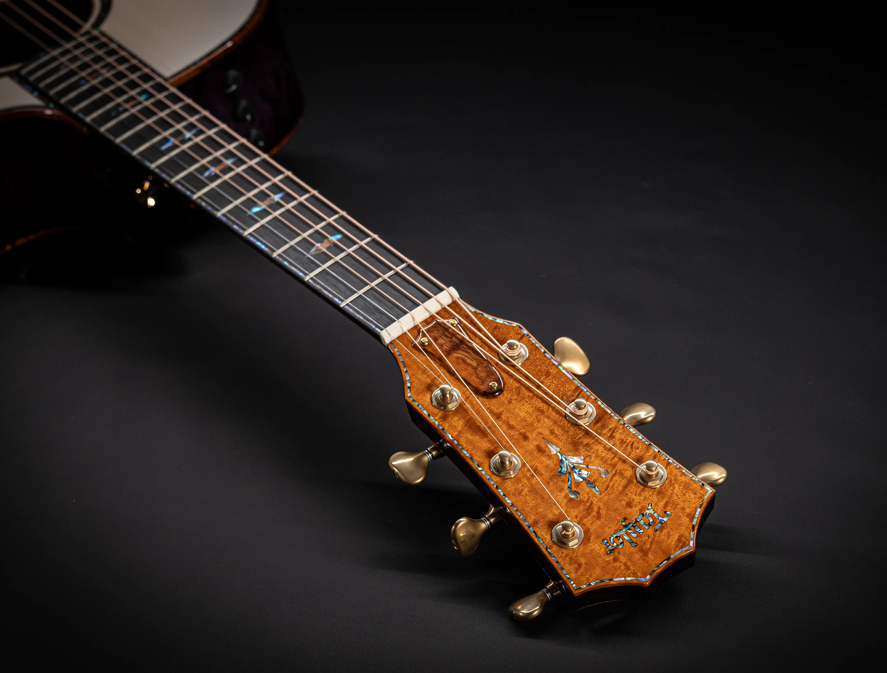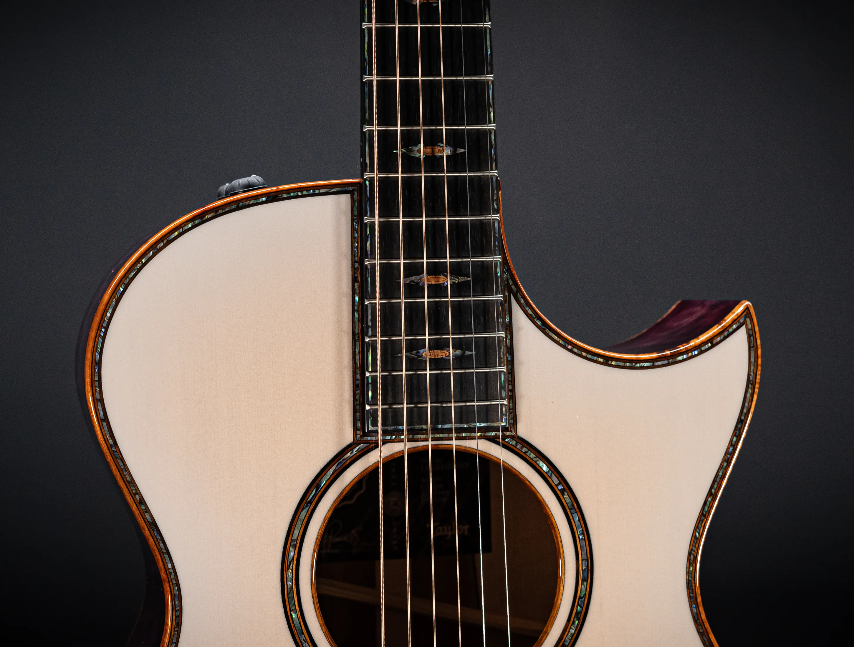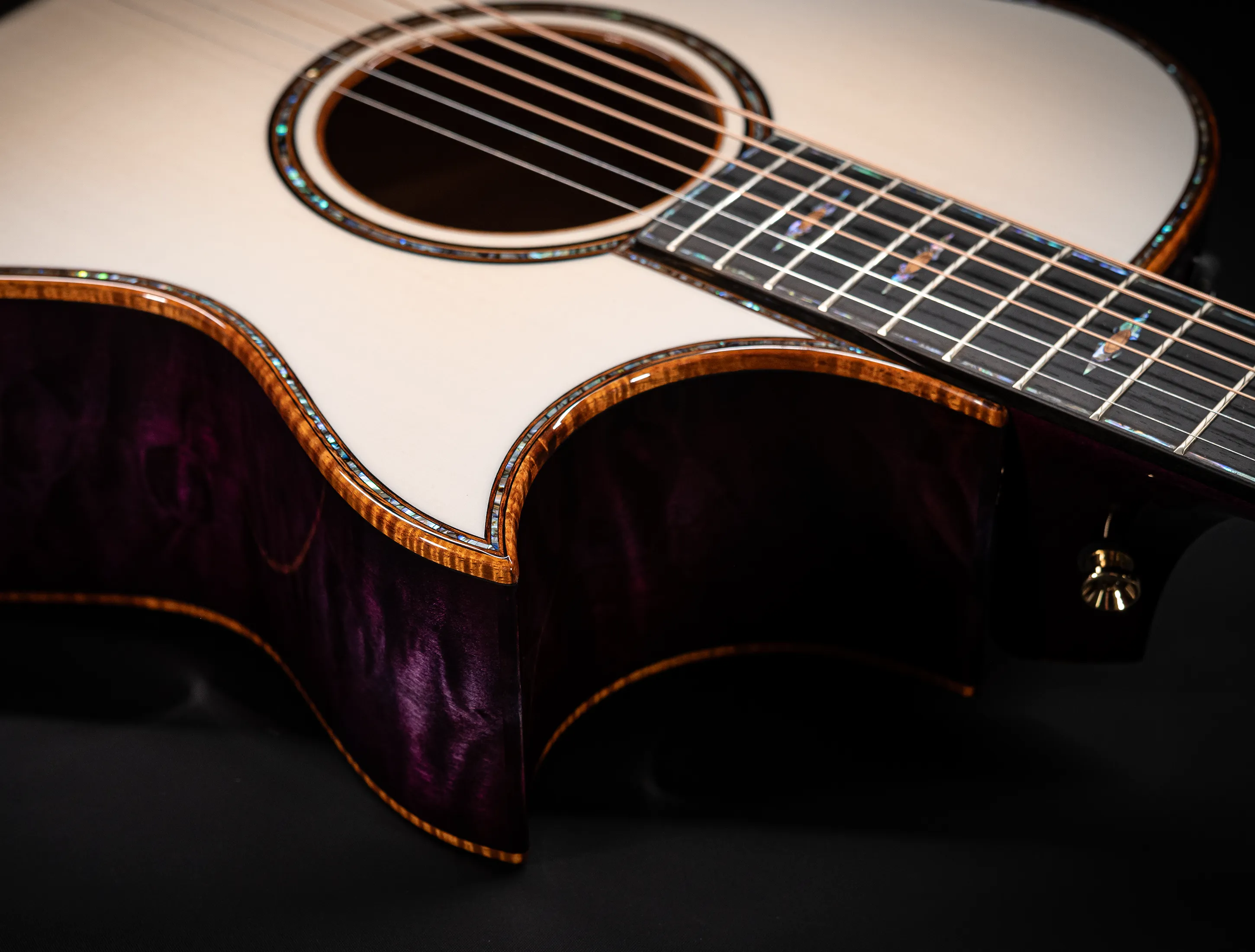Nur eine von 25 Modellen weltweit hergestellten Taylor Custom Dream dürfen wir Ihnen hier vorstellen. Sie ist nicht nur eine Gitarre, sondern ein Kunstwerk - Art meets Music. Denn sei vereint beste Handwerkskunst mit den musikalischen Höchstansprüchen von Taylor. Die mit traditionellem Heißleim verleimte Innenverstrebung verstärkt den warmen Klang und die Fülle der Mitten. Zahlreiche Details aus hawaiianischem Koa- und Paua-Holz sind zu finden, darunter das optisch raffiniert gestaltete hawaiianische Koa im vierteiligen Ahornboden. Weitere Highlights sind neben der transparten weissen Decke und dem lila schimmernden Korpus eine Einfassung aus gemasertem Koa, eine Century-Einlage auf der Kopfplatte aus Paua, Griffbretteinlagen in Form von ovalen Paua und Koa, eine mit Koa-Holz verzierte Paua-Rosette sowie Paua-Zierleisten für Decke, Griffbrett und Kopfplatte.