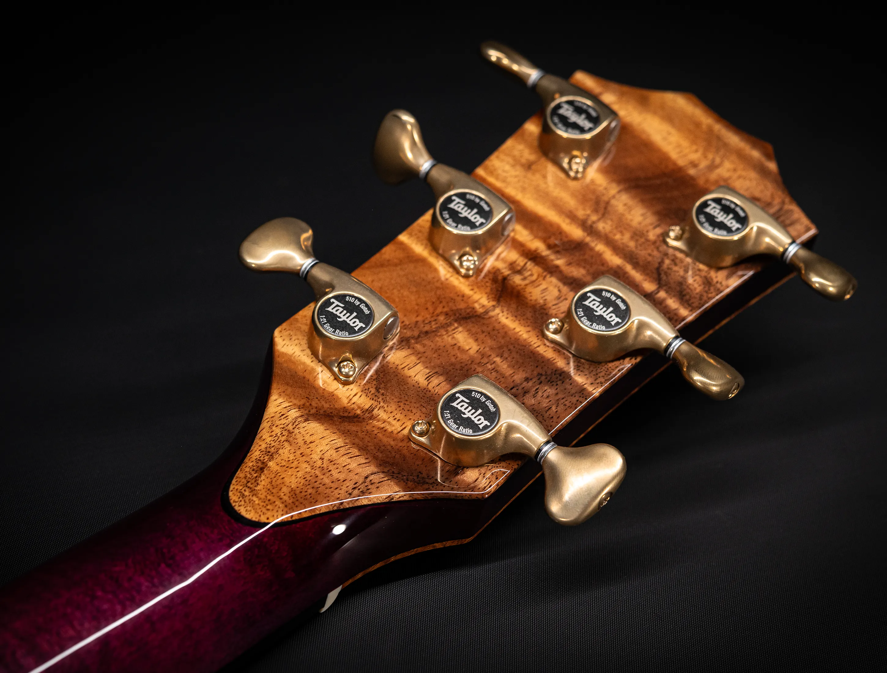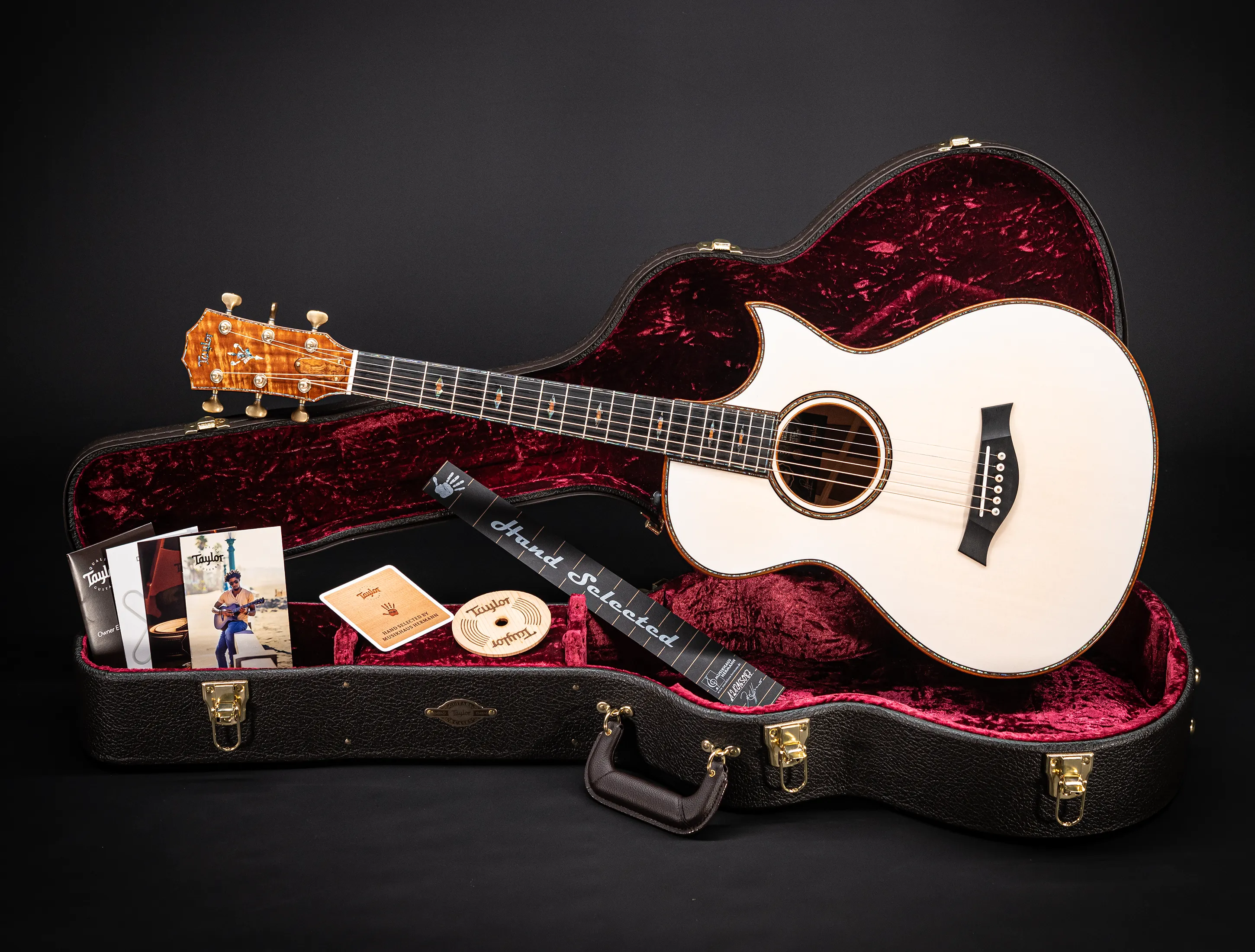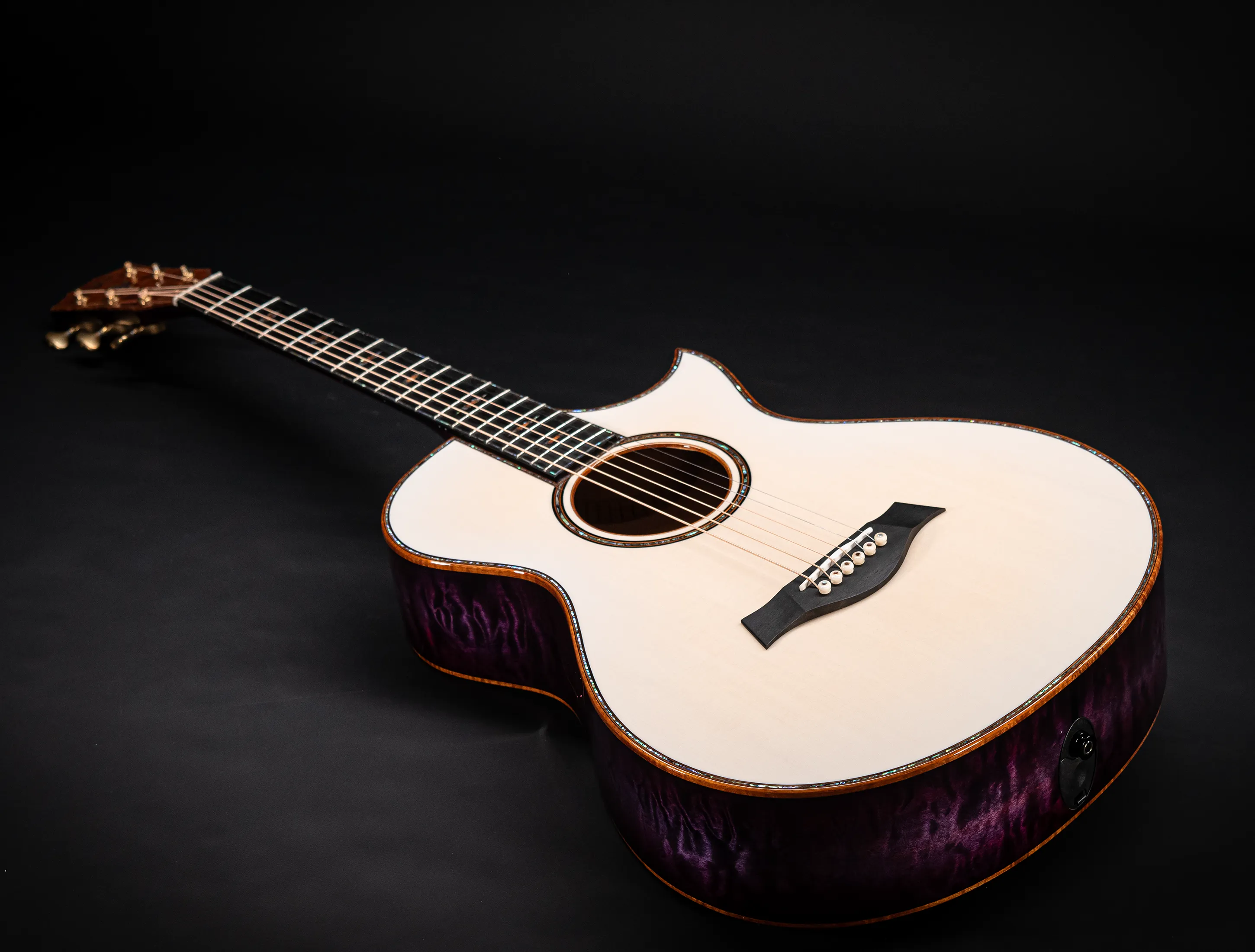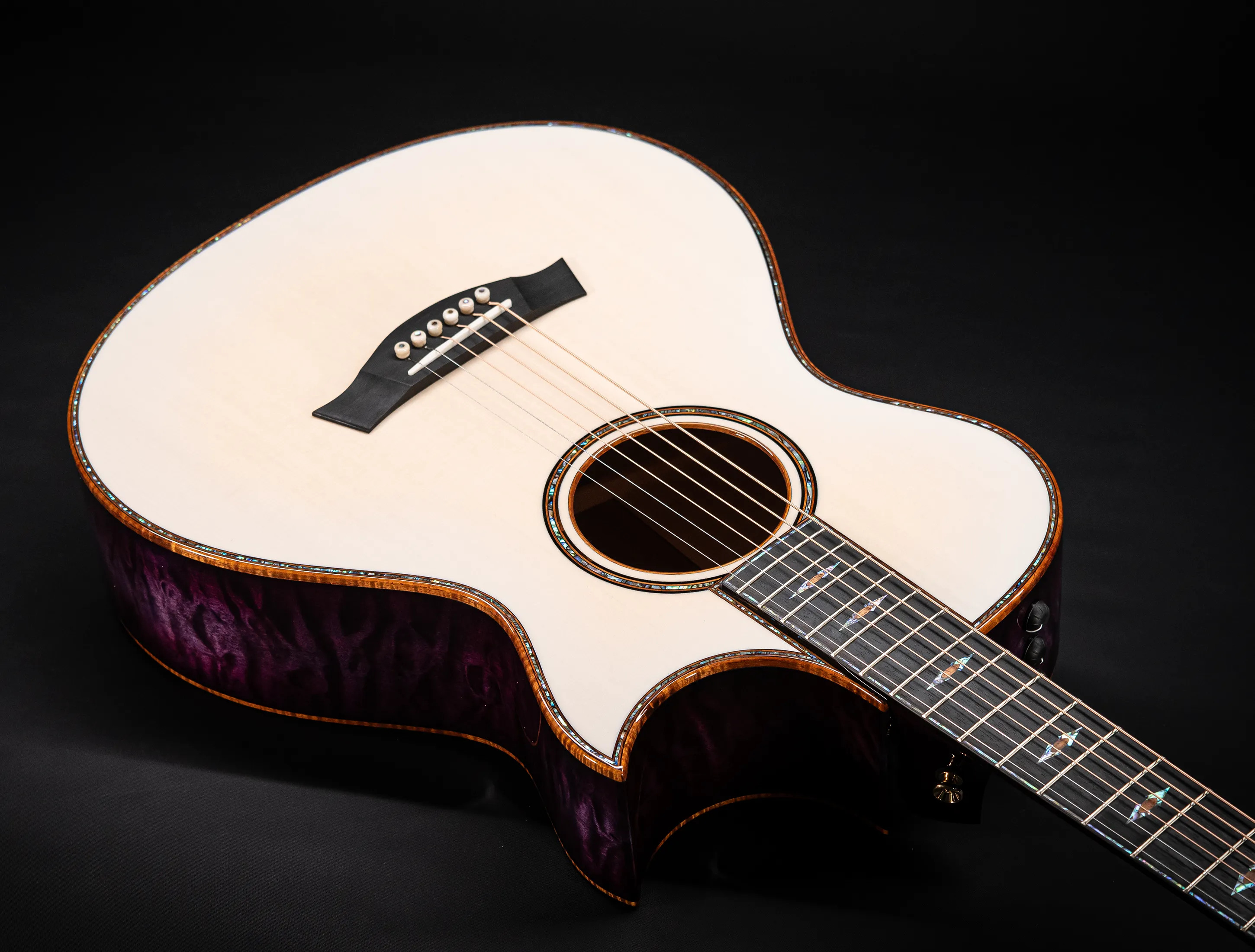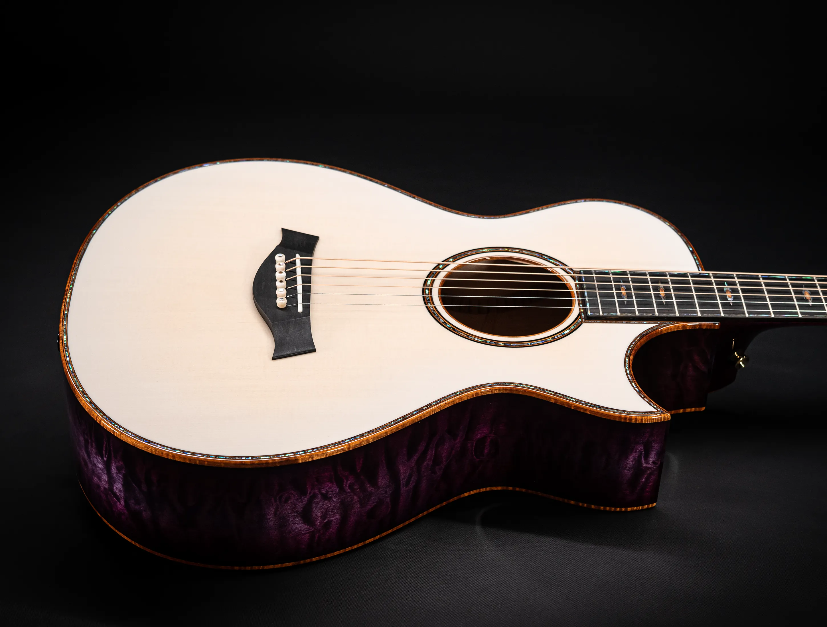 Nur eine von 25 Modellen weltweit hergestellten Taylor Custom Dream dürfen wir Ihnen hier vorstellen. Sie ist nicht nur eine Gitarre, sondern ein Kunstwerk - Art meets Music. Denn sei vereint beste Handwerkskunst mit den musikalischen Höchstansprüchen von Taylor. Die mit traditionellem Heißleim verleimte Innenverstrebung verstärkt den warmen Klang und die Fülle der Mitten. Zahlreiche Details aus hawaiianischem Koa- und Paua-Holz sind zu finden, darunter das optisch raffiniert gestaltete hawaiianische Koa im vierteiligen Ahornboden. Weitere Highlights sind neben der transparten weissen Decke und dem lila schimmernden Korpus eine Einfassung aus gemasertem Koa, eine Century-Einlage auf der Kopfplatte aus Paua, Griffbretteinlagen in Form von ovalen Paua und Koa, eine mit Koa-Holz verzierte Paua-Rosette sowie Paua-Zierleisten für Decke, Griffbrett und Kopfplatte.